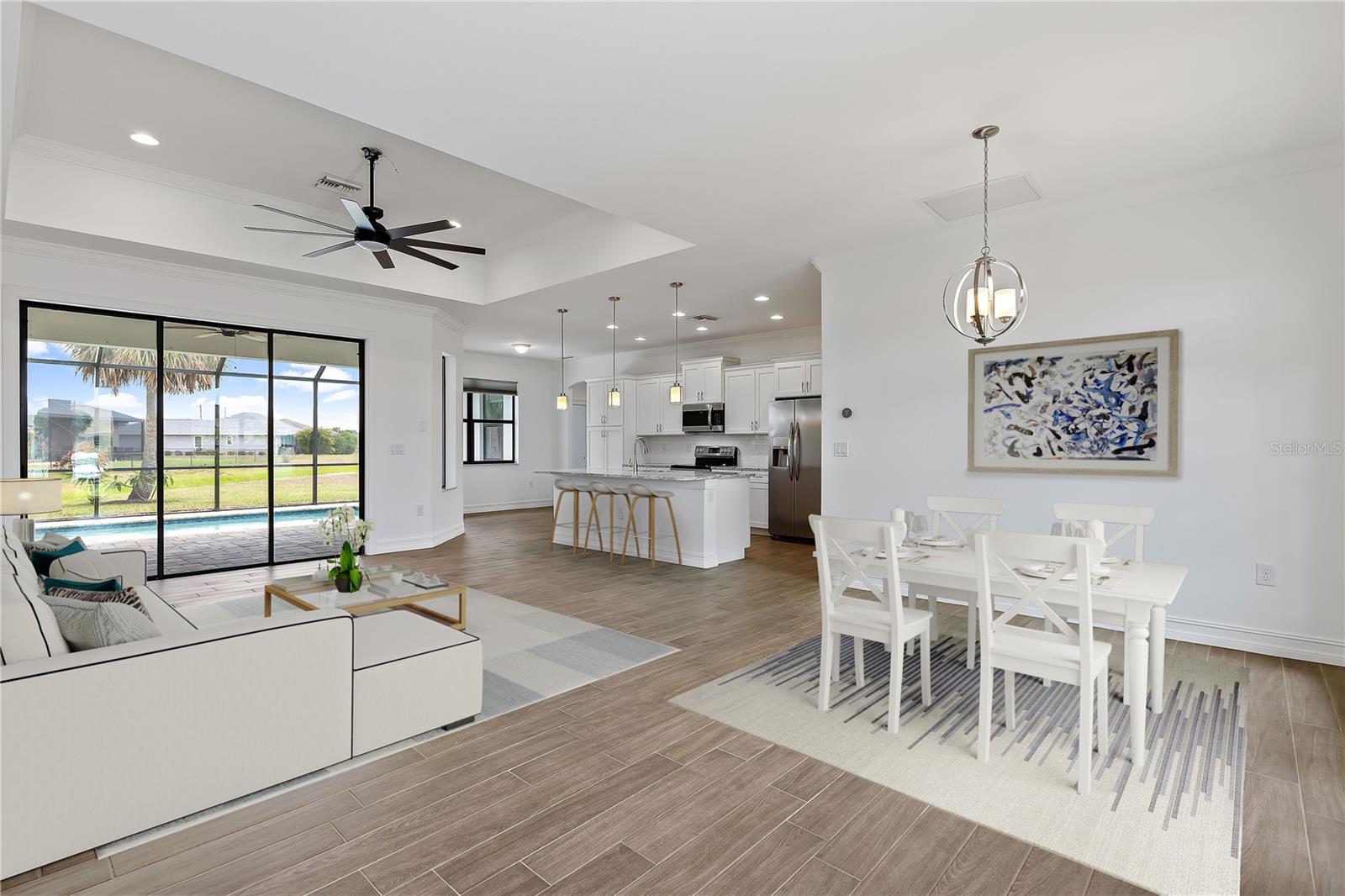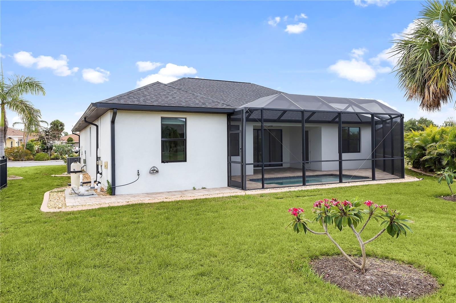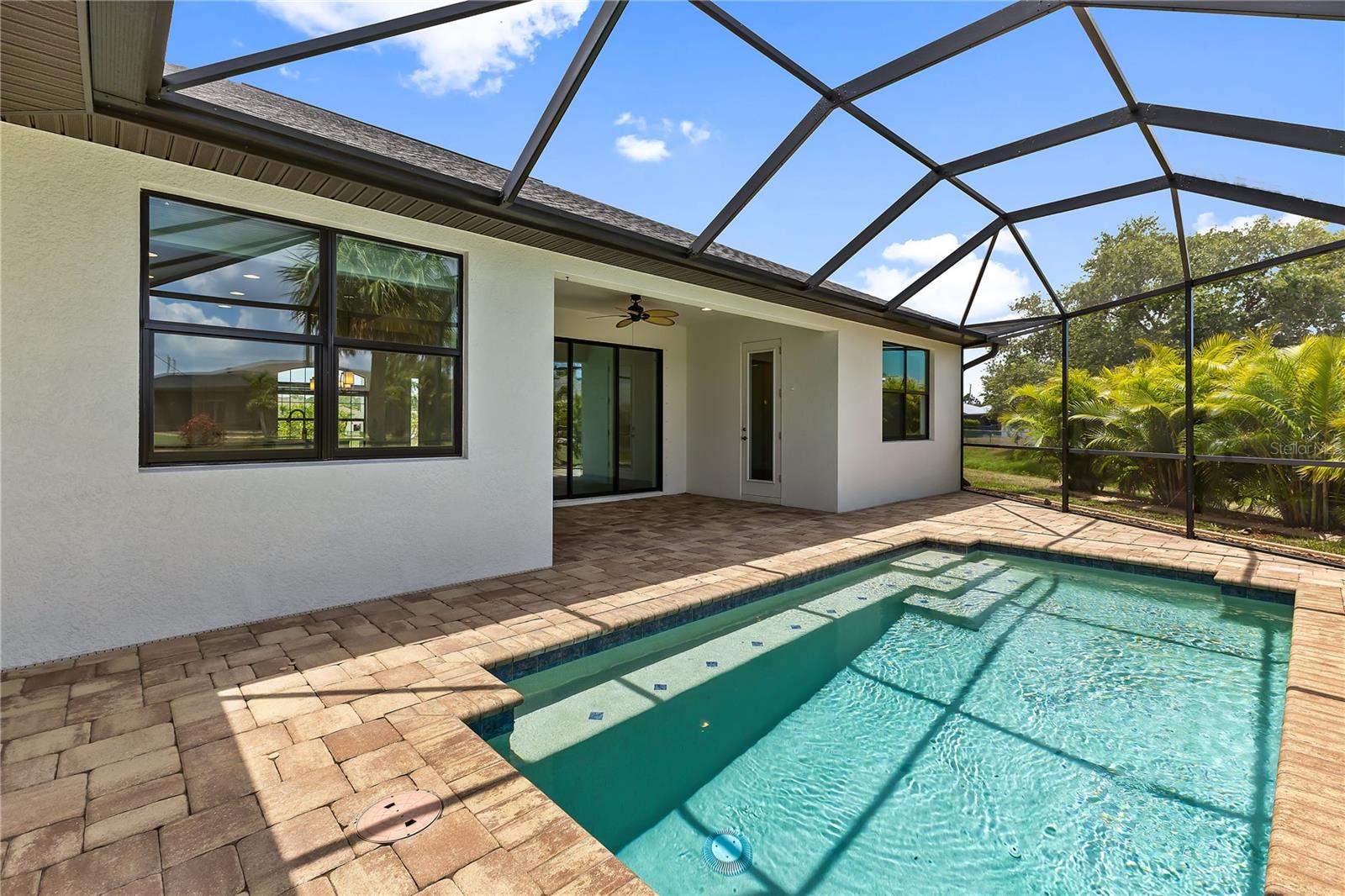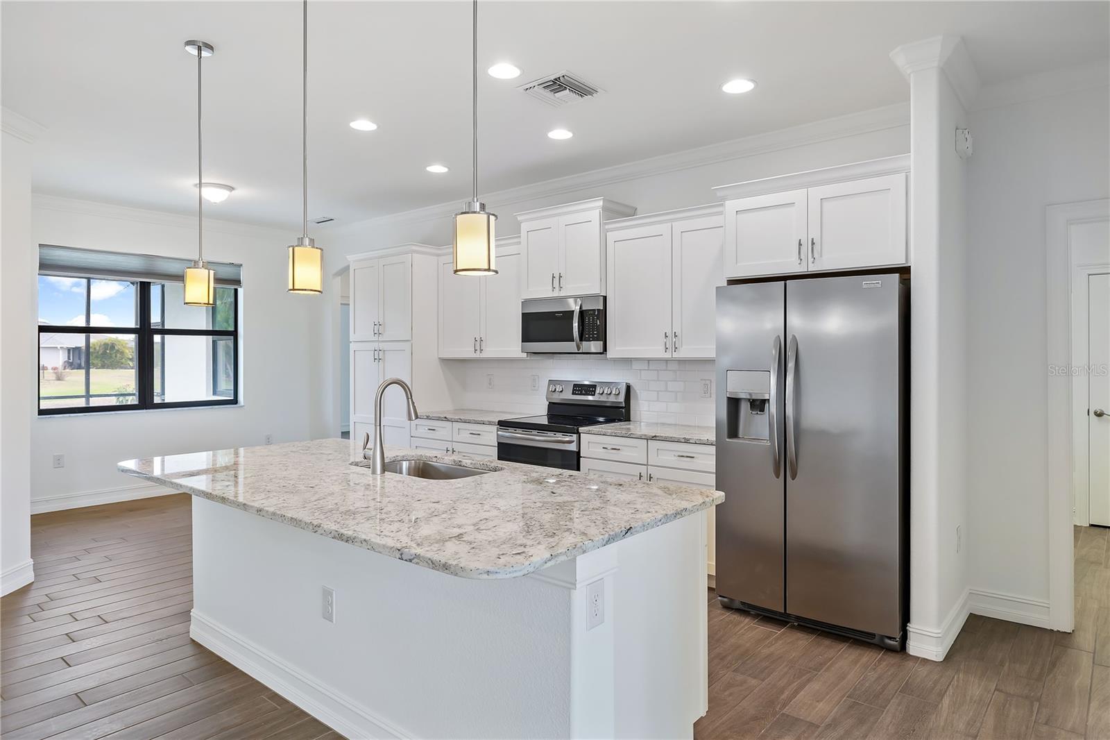 Welcome to this stunning 3-bedroom, 2-bathroom home located in the tranquil Burnt Store Meadows community of Punta Gorda, Florida. Nestled on a peaceful cul-de-sac, this residence boasts a two-car garage and a beautifully manicured lawn that sets the stage for the elegance within. Step inside to discover an open, split floor plan that perfectly balances privacy and space. The home features exquisite wood grain tile flooring throughout, bathing the interiors in a warm, inviting ambiance. Tray ceilings add a touch of sophistication, while ample natural light streams in, enhancing the airy atmosphere. The kitchen is a chef's dream, equipped with stainless steel appliances, granite countertops, pristine cabinets, and a central island that serves as the heart of the home. The primary suite is a luxurious retreat, offering private access to the pool, two spacious closets including a walk-in, and a sumptuous bathroom with a walk-in shower and dual sink granite vanity. Step outside to the covered lanai, complete with ceiling fans for those warm Florida days. The lanai overlooks a sparkling pool and a brick paver deck, sealed in 2023, providing an ideal space for relaxation and entertaining. The serene greenbelt views offer a sense of peace and privacy, making this outdoor space truly special. Additional features of this home include a laundry room with extra storage, an irrigation system to keep the lawn lush and green, generator wiring for added convenience, and impact windows for enhanced security. Located near I-75 and US41, this home offers easy access to Fishermen’s Village and the charming shops and restaurants of downtown Punta Gorda. Experience the perfect blend of luxury and comfort in this exceptional Burnt Store Meadows home.