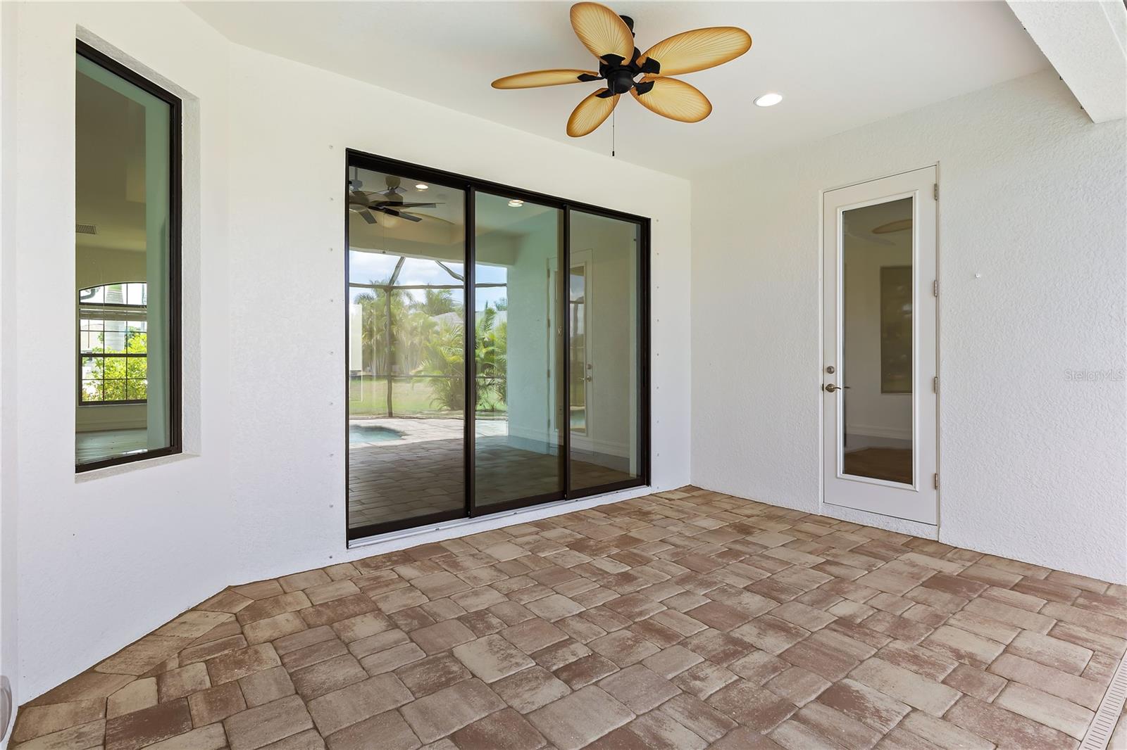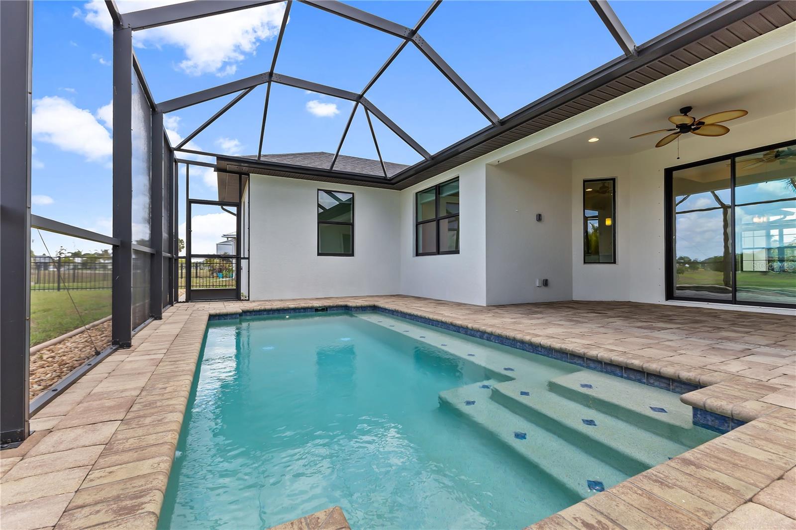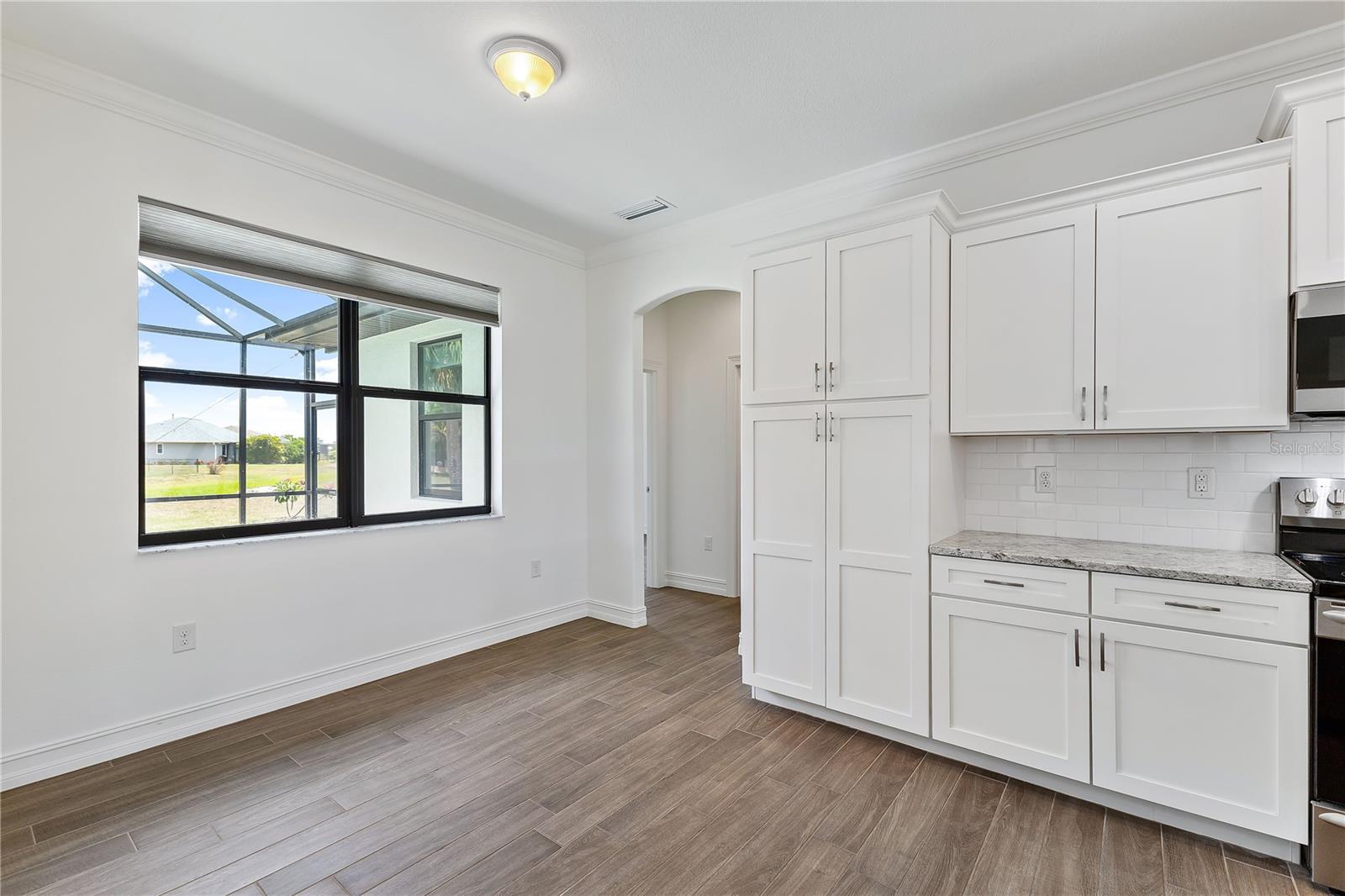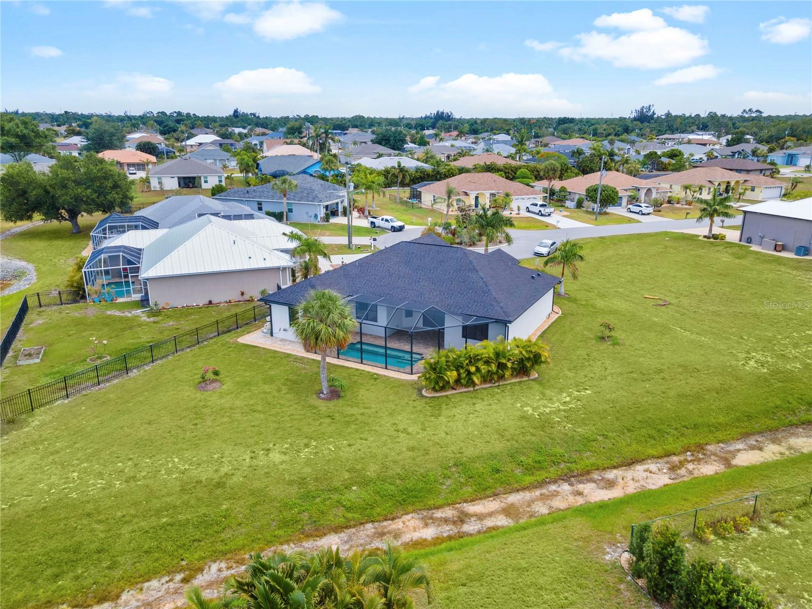 Welcome to this stunning 3-bedroom, 2-bathroom home located in the tranquil Burnt Store Meadows community of Punta Gorda, Florida. Nestled on a peaceful cul-de-sac, this residence boasts a two-car garage and a beautifully manicured lawn that sets the stage for the elegance within. Step inside to discover an open, split floor plan that perfectly balances privacy and space. The home features exquisite wood grain tile flooring throughout, bathing the interiors in a warm, inviting ambiance. Tray ceilings add a touch of sophistication, while ample natural light streams in, enhancing the airy atmosphere. The kitchen is a chef's dream, equipped with stainless steel appliances, granite countertops, pristine cabinets, and a central island that serves as the heart of the home. The primary suite is a luxurious retreat, offering private access to the pool, two spacious closets including a walk-in, and a sumptuous bathroom with a walk-in shower and dual sink granite vanity. Step outside to the covered lanai, complete with ceiling fans for those warm Florida days. The lanai overlooks a sparkling pool and a brick paver deck, sealed in 2023, providing an ideal space for relaxation and entertaining. The serene greenbelt views offer a sense of peace and privacy, making this outdoor space truly special. Additional features of this home include a laundry room with extra storage, an irrigation system to keep the lawn lush and green, generator wiring for added convenience, and impact windows for enhanced security. Located near I-75 and US41, this home offers easy access to Fishermen’s Village and the charming shops and restaurants of downtown Punta Gorda. Experience the perfect blend of luxury and comfort in this exceptional Burnt Store Meadows home.