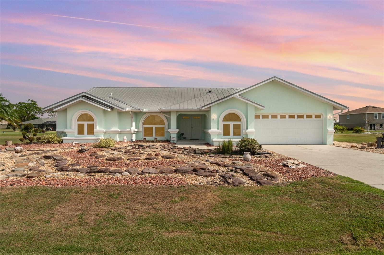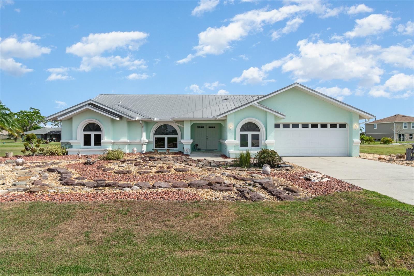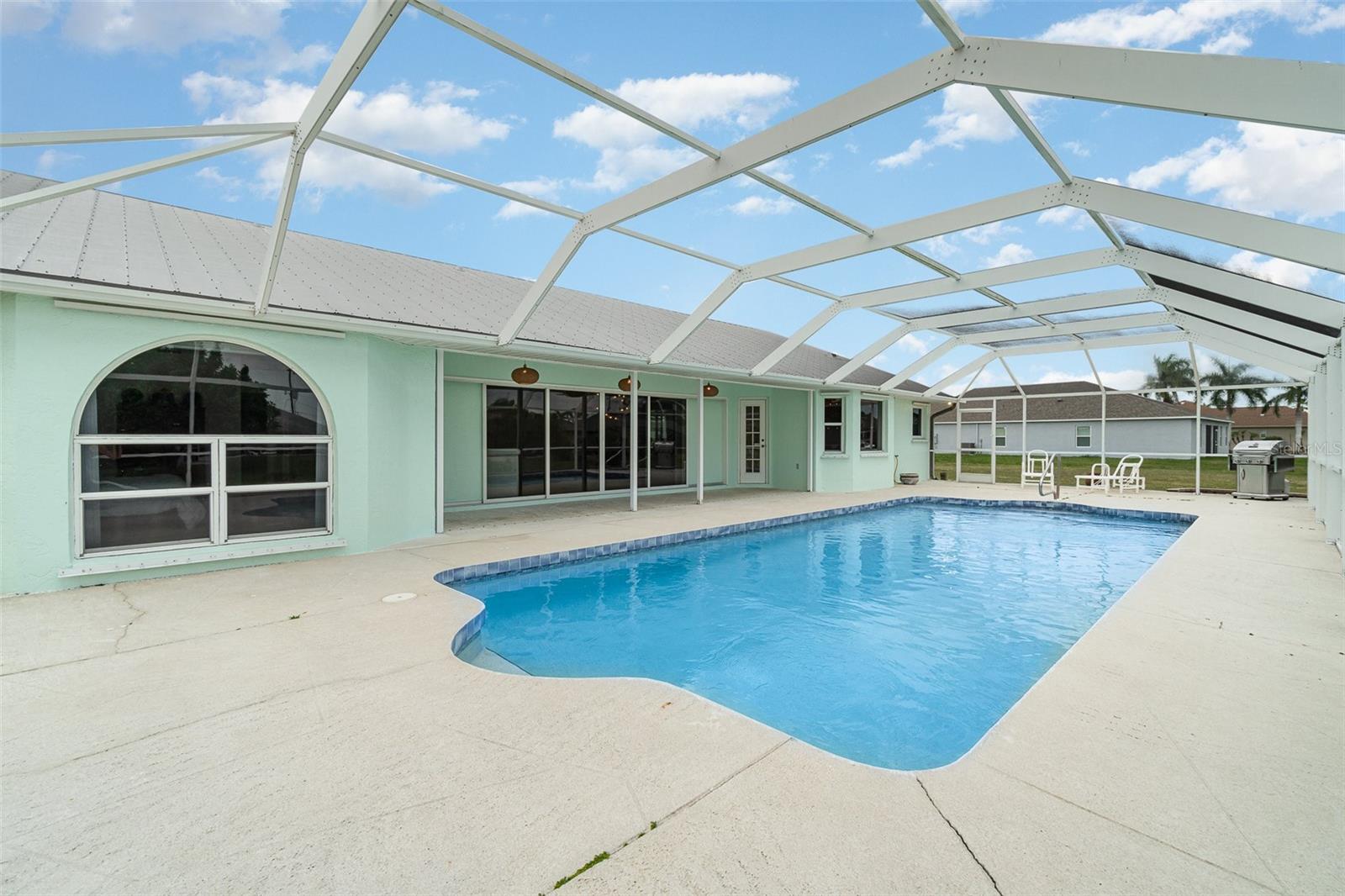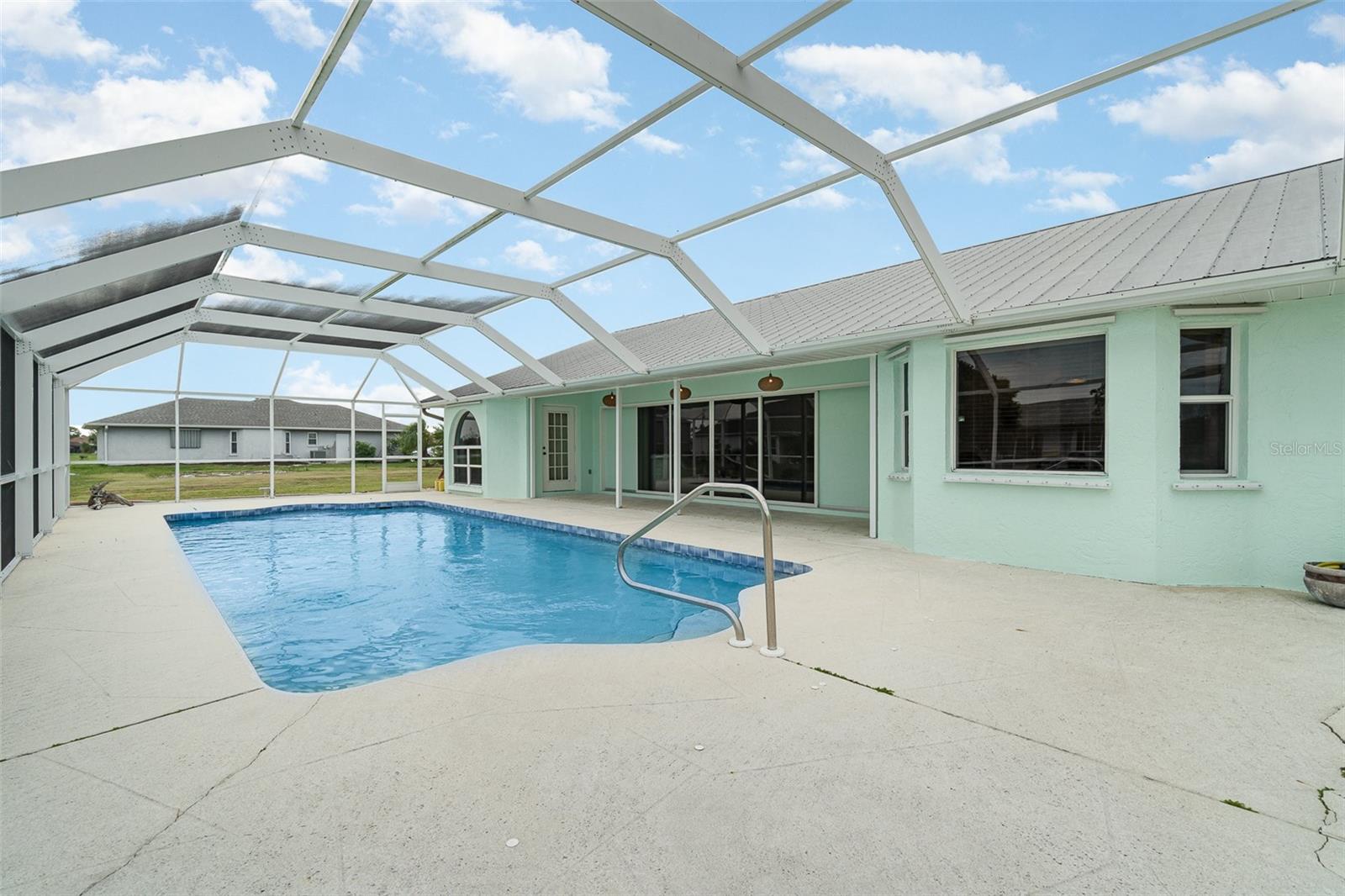 Welcome to your future oasis in the highly desirable Deep Creek community! This move-in ready three-bedroom home is a rare gem nestled between two empty lots. OPTION TO PURCHASE these additional lots, offering unparalleled privacy and expansion potential. The property boasts a low-maintenance exterior with new paint, updated windows and screens, rock landscaping, and a sturdy metal roof. As you step through the elegant French doors, you're greeted by a stunning foyer that seamlessly flows into the dining and living areas, featuring porcelain floors, high-quality carpeting, and a unique light fixture that adds a touch of sophistication. The heart of this home is undoubtedly its kitchen, which masterfully blends modern conveniences with an Italian flair. Enjoy the luxury of handcrafted granite countertops and backsplash, 24x24 porcelain tile flooring, custom cabinets on stainless steel leg bases, and a host of high-end appliances including a Fisher & Paykel double oven and a dishwasher drawer. The open layout allows for easy access to the pool area through sliding pocket patio doors, flooding the main living space with natural light. The family room serves as a lively hub, connecting the two additional bedrooms that can double as guest accommodations. The second bathroom exudes vintage charm with its ceramic tile floor, chandelier, and classic bathtub with a handheld shower wand. The master suite is a true retreat, featuring a spacious walk-in closet and a luxurious master bath complete with porcelain tile floors and walls, granite countertops, a soaking tub, a separate walk-in shower, a double vanity, and elegant lighting. For your entertainment, a mounted TV is included. The master bedroom, living room, and kitchen all provide direct access to the patio and pool area, which has been recently upgraded with a new marcite pool finish, new tiles, stamped concrete, and a cool decking finish. The lanai is robustly constructed with large beams, stainless screws, and new screens. Additional features include a 5-ton A/C unit replaced in 2020, new ducts, a 225-amp breaker box, a 4-year-old water heater, central vacuum, home security system, floodlights, and low-maintenance Koi ponds. The home is well-protected with storm-resistant bay windows, manual storm shutters, and a hurricane-rated garage door. Conveniently located less than a mile from Deep Creek Park, which offers a range of recreational activities, and close to schools, shopping, dining, and the Deep Creek Golf Club, this property provides easy access to all your favorite destinations. With I-75 just 1.6 miles away, commuting is a breeze. Don’t miss the opportunity to make this exquisite home yours—schedule your showing today and start living the Deep Creek dream!