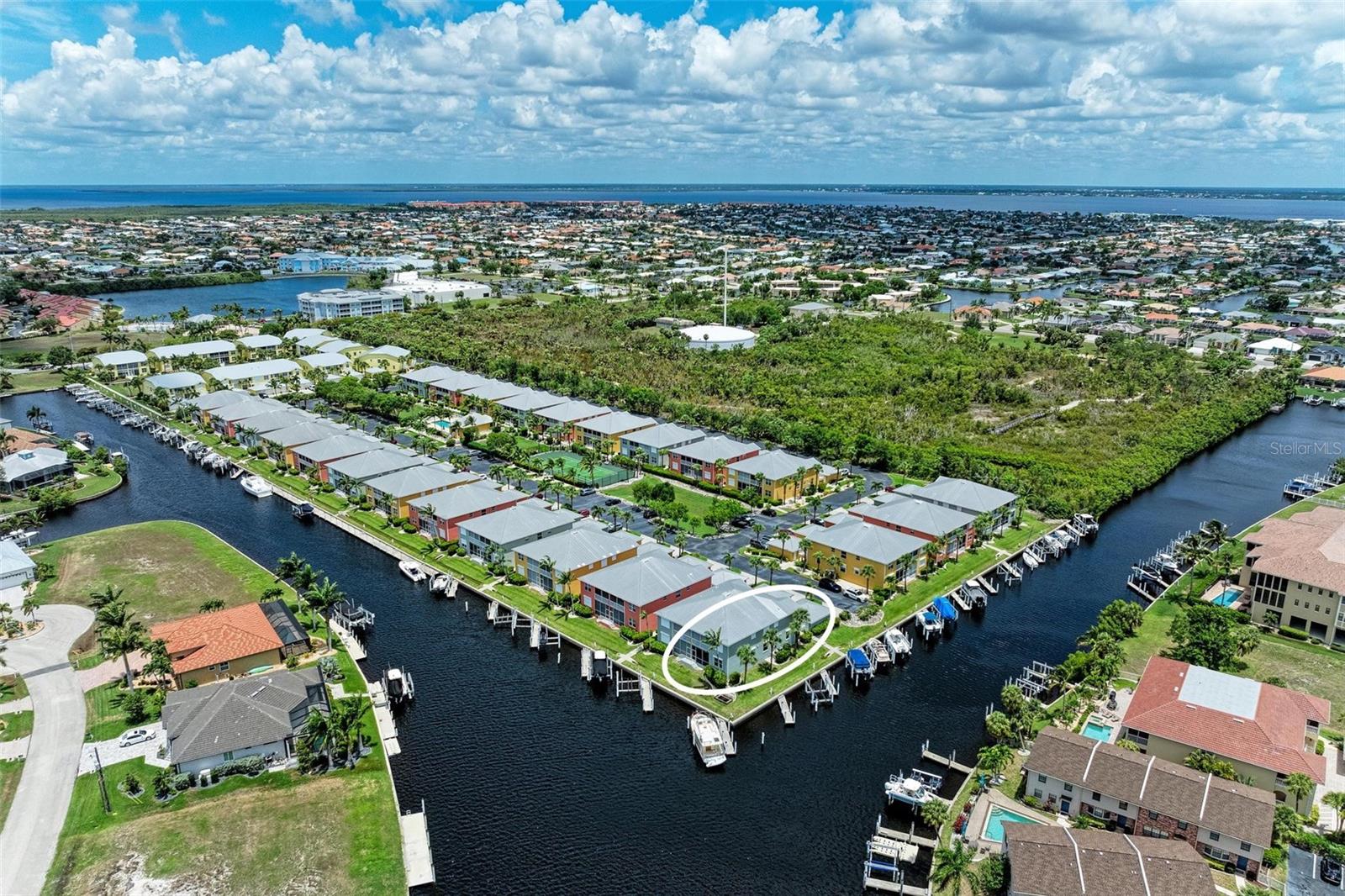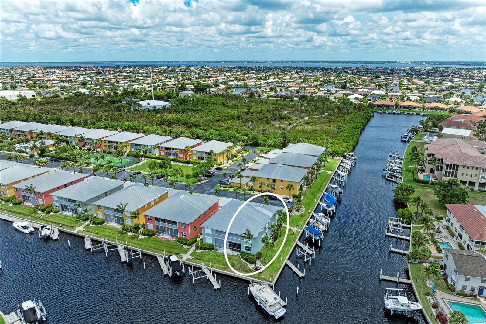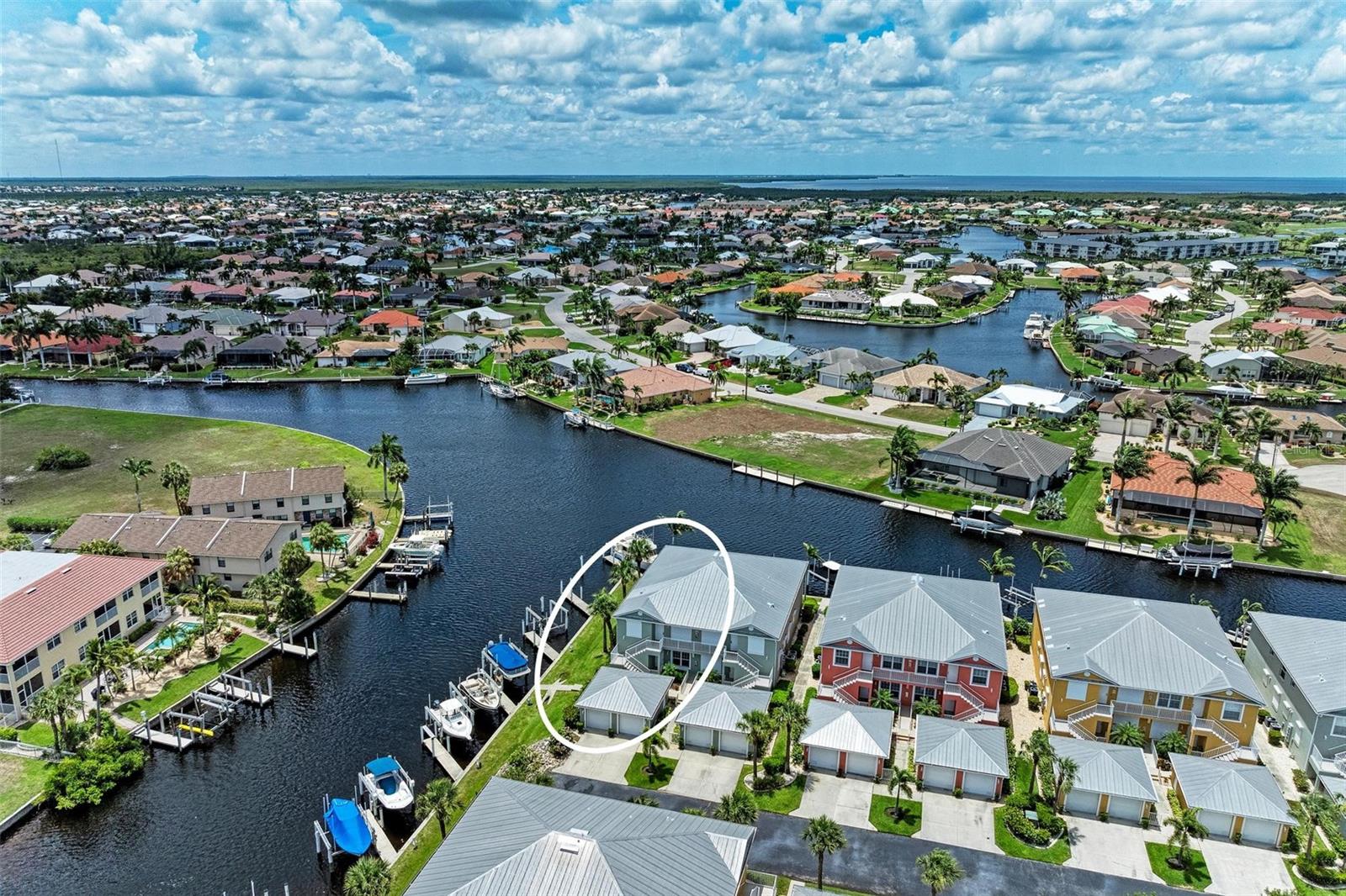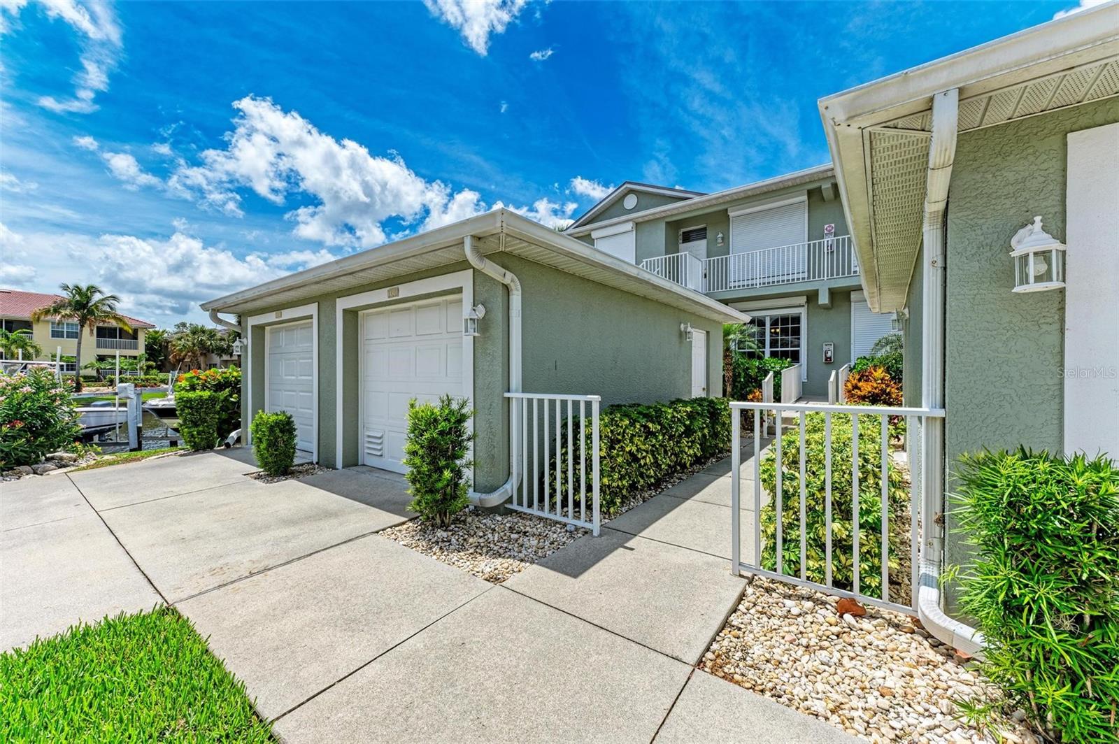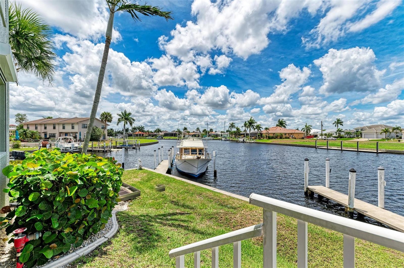 BREATHTAKING WATERFRONT LIVING IN CLIPPER COVE VILLAGE IN PUNTA GORDA. **BEST LOCATION in Clipper Cove with intersecting canals offering water views on 2 sides** Discover the epitome of waterfront luxury in this FULLY FURNISHED END UNIT condo, offering stunning CANAL VIEWS from almost every window and the rear lanai. Located in the GATED COMMUNITY of Clipper Cove Village with DIRECT BOAT ACCESS to Charlotte Harbor, this meticulously maintained 3-bedroom, 2-bathroom GROUND FLOOR condo promises a serene and MAINTENANCE-FREE lifestyle. No damage was sustained in previous hurricanes. As you enter, you're immediately captivated by panoramic water vistas that define the living experience of this home. The open split room floor plan ensures privacy, with the primary suite situated at one end and guest rooms at the other. The spacious kitchen features a large peninsula and bar area, perfect for dining and entertaining. The formal dining room, also versatile as a den or office, offers picturesque canal views, creating a serene ambiance. Awake to tranquil water views from the primary suite, which includes double walk-in closets and a sliding door to the lanai. The en-suite bath features dual sinks, a walk-in shower, and a linen closet, offering both comfort and convenience. Enjoy morning coffee on the screened lanai, soaking in the peaceful surroundings. High ceilings and crown molding throughout the main living areas add a touch of elegance. Recent updates include a NEWLY INSTALLED GARAGE DOOR (June 2024) for the single car detached garage, enhancing both security and convenience. FRESH PAINT in both bathrooms (June 2024) adds a modern touch. An extra bonus, this unit includes an automatic metal storm shutter over the screened lanai providing security and storm reassurance as well as pull down shutters for windows. Clipper Cove Village amenities include a heated community pool and spa, newly restored tennis courts, a covered cabana with BBQ grill, and eating areas. The HOA fee covers sewer, trash, and water, ensuring hassle-free living. While this unit does not include a boat slip, options for sale or rent within the complex are available. Located near the charming historic downtown Punta Gorda, residents can enjoy community events, dining, shopping, Fisherman’s Village, nature trails, bike paths, and easy access to Gulf beaches. This condo offers the ultimate waterfront living lifestyle, combining luxury, comfort, and convenience in a picturesque setting. Don't miss out on this rare opportunity to own a piece of paradise. Schedule your private showing today and experience waterfront living at its finest!