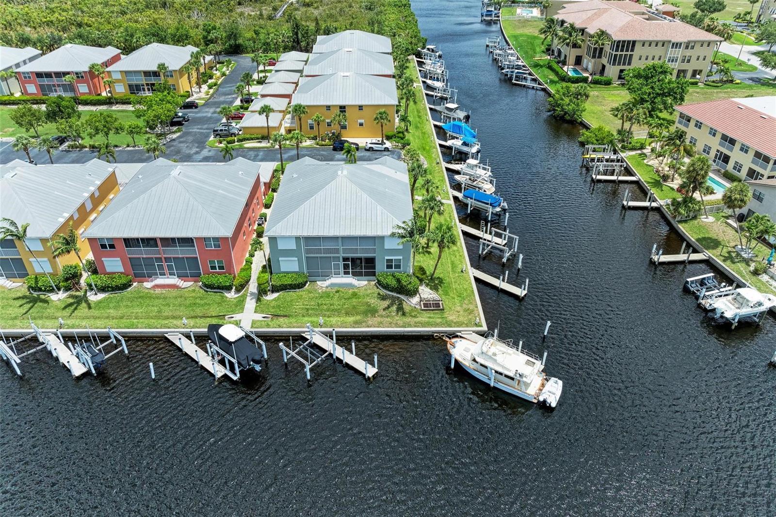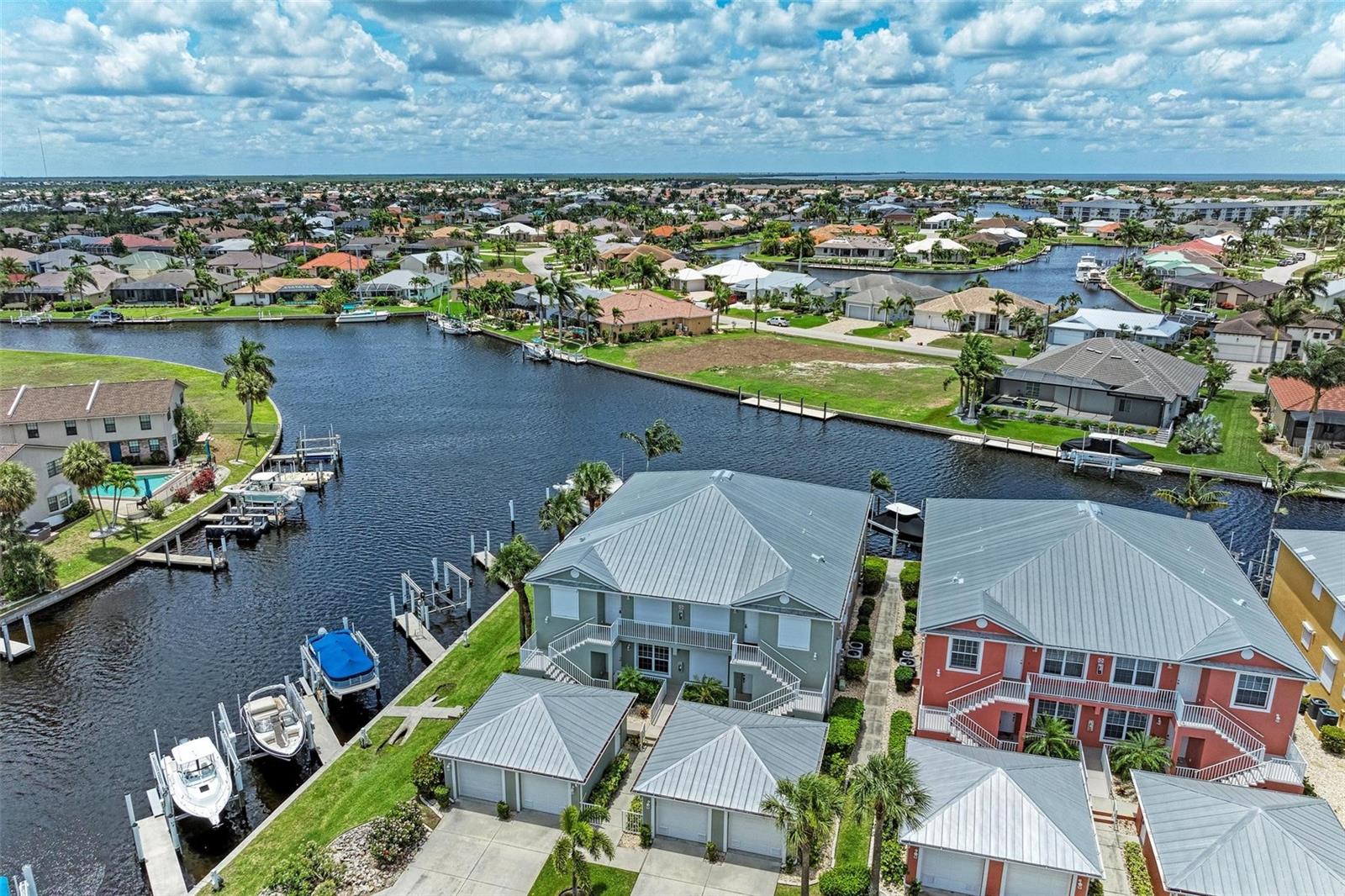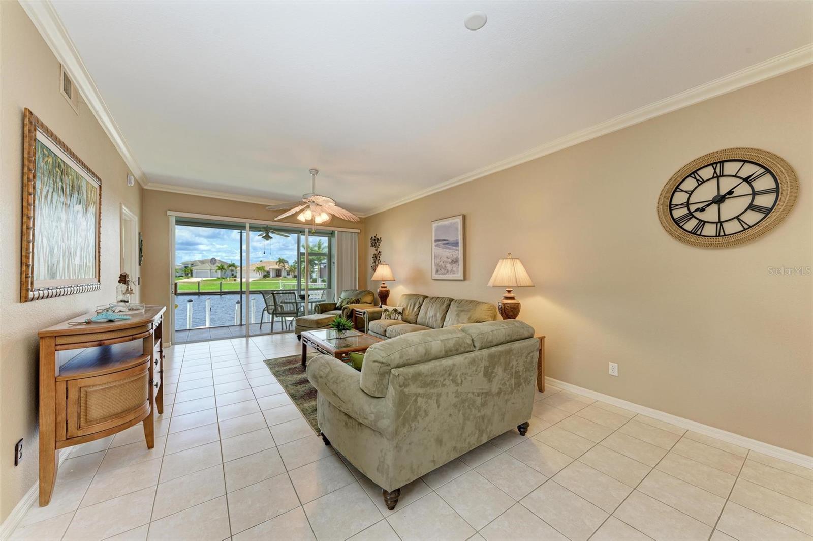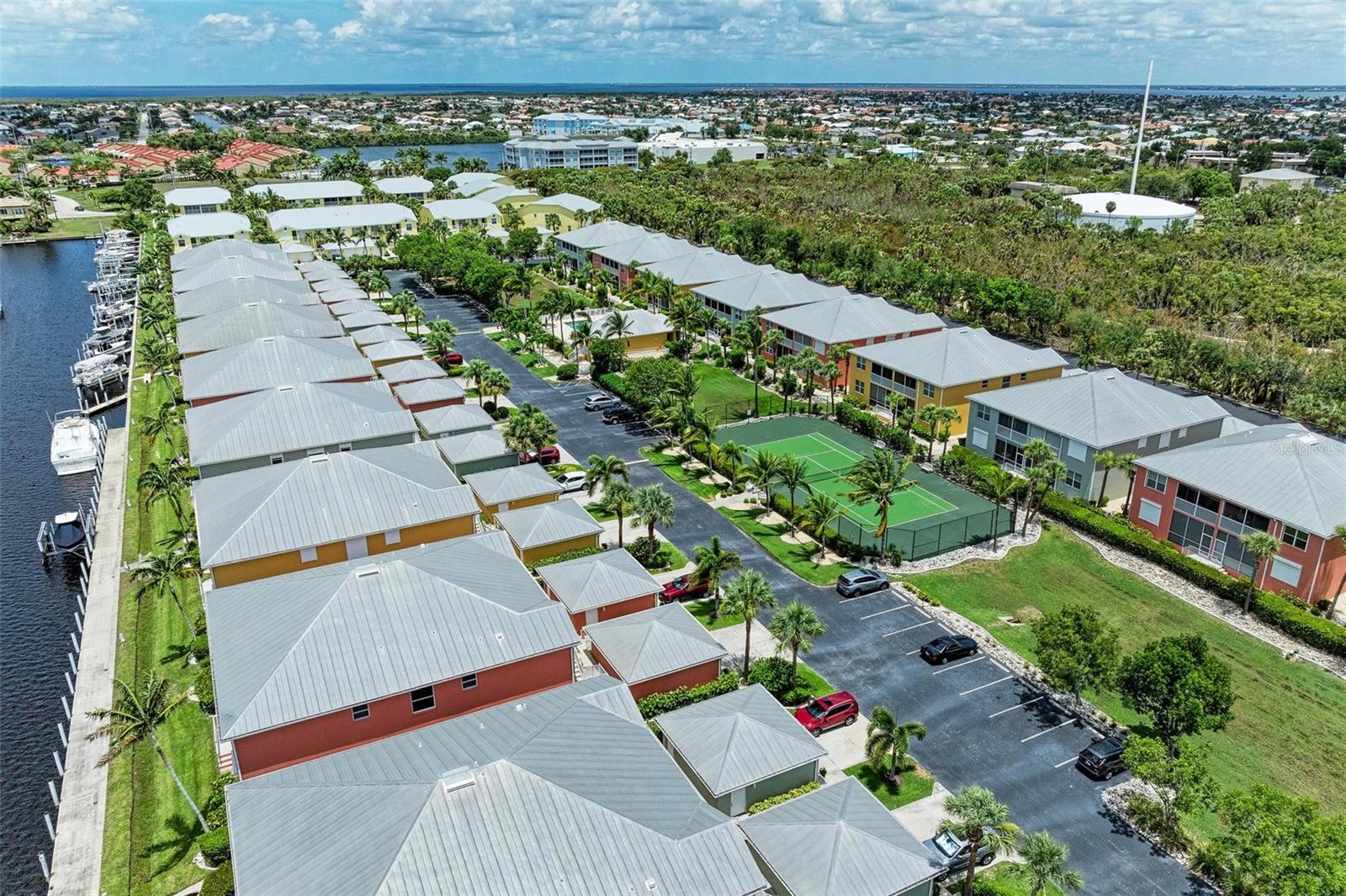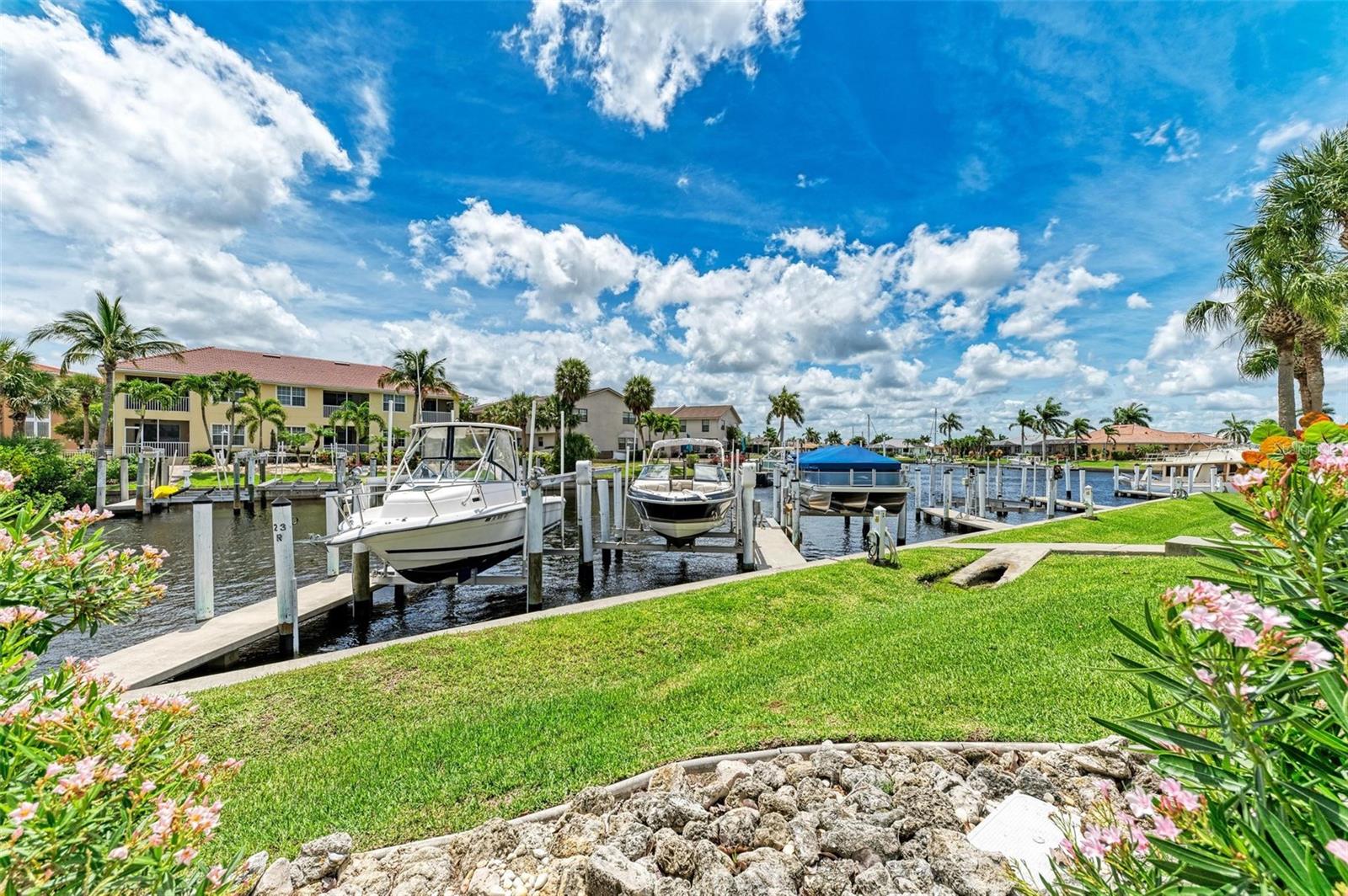 BREATHTAKING WATERFRONT LIVING IN CLIPPER COVE VILLAGE IN PUNTA GORDA. **BEST LOCATION in Clipper Cove with intersecting canals offering water views on 2 sides** Discover the epitome of waterfront luxury in this FULLY FURNISHED END UNIT condo, offering stunning CANAL VIEWS from almost every window and the rear lanai. Located in the GATED COMMUNITY of Clipper Cove Village with DIRECT BOAT ACCESS to Charlotte Harbor, this meticulously maintained 3-bedroom, 2-bathroom GROUND FLOOR condo promises a serene and MAINTENANCE-FREE lifestyle. No damage was sustained in previous hurricanes. As you enter, you're immediately captivated by panoramic water vistas that define the living experience of this home. The open split room floor plan ensures privacy, with the primary suite situated at one end and guest rooms at the other. The spacious kitchen features a large peninsula and bar area, perfect for dining and entertaining. The formal dining room, also versatile as a den or office, offers picturesque canal views, creating a serene ambiance. Awake to tranquil water views from the primary suite, which includes double walk-in closets and a sliding door to the lanai. The en-suite bath features dual sinks, a walk-in shower, and a linen closet, offering both comfort and convenience. Enjoy morning coffee on the screened lanai, soaking in the peaceful surroundings. High ceilings and crown molding throughout the main living areas add a touch of elegance. Recent updates include a NEWLY INSTALLED GARAGE DOOR (June 2024) for the single car detached garage, enhancing both security and convenience. FRESH PAINT in both bathrooms (June 2024) adds a modern touch. An extra bonus, this unit includes an automatic metal storm shutter over the screened lanai providing security and storm reassurance as well as pull down shutters for windows. Clipper Cove Village amenities include a heated community pool and spa, newly restored tennis courts, a covered cabana with BBQ grill, and eating areas. The HOA fee covers sewer, trash, and water, ensuring hassle-free living. While this unit does not include a boat slip, options for sale or rent within the complex are available. Located near the charming historic downtown Punta Gorda, residents can enjoy community events, dining, shopping, Fisherman’s Village, nature trails, bike paths, and easy access to Gulf beaches. This condo offers the ultimate waterfront living lifestyle, combining luxury, comfort, and convenience in a picturesque setting. Don't miss out on this rare opportunity to own a piece of paradise. Schedule your private showing today and experience waterfront living at its finest!