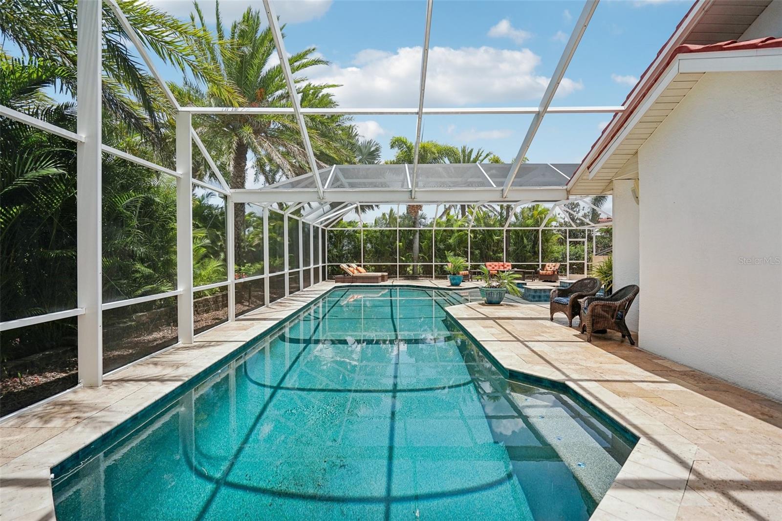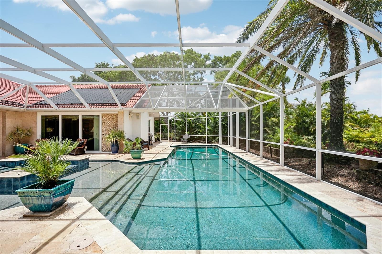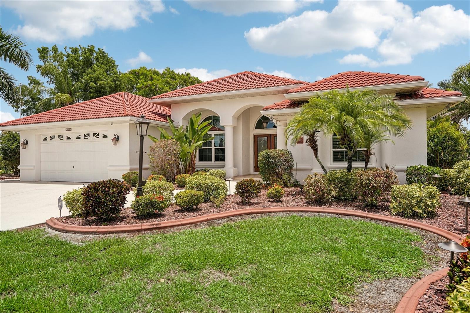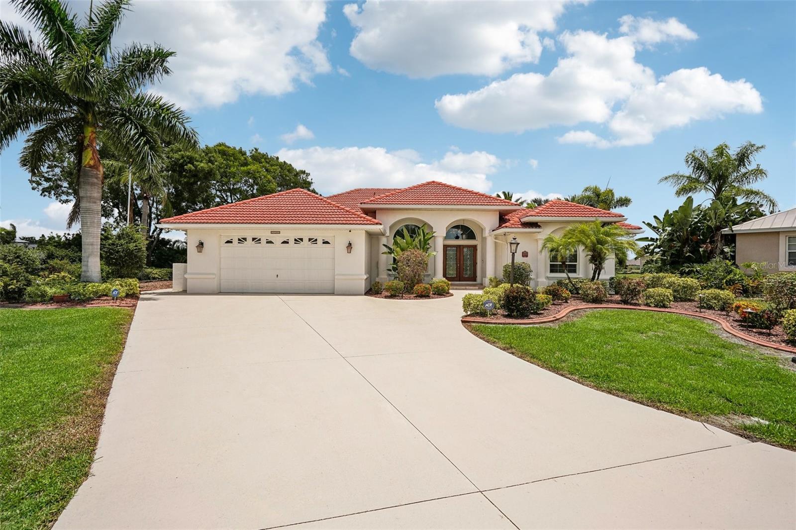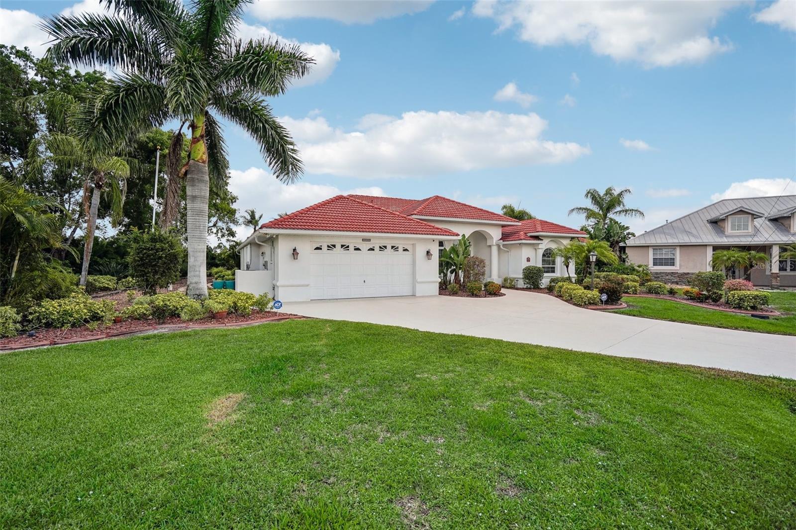 Discover this exquisite 4-bedroom home nestled on a tranquil, oversized lot at the end of a cul-de-sac in the heart of Deep Creek. The property boasts a backyard tropical oasis with a solar-heated pool featuring a spa, sun shelf, and extended lap area, all encircled by beautiful travertine decking. The home also features a professionally landscaped area, equipped with an irrigation system and private well, providing abundant space for family gatherings and outdoor activities. This property has even garnered a Landscape Award from the Deep Creek Garden Club! Inside, a spacious great room welcomes you with direct views of the lanai and pool area. The home flows effortlessly from the open kitchen—with its elegant living room, breakfast nook, and formal dining area—perfect for hosting and daily family life. The expansive primary bedroom offers pool access through a sliding door and includes a luxuriously renovated master bath with a soaking tub and dual walk-in closets. This bedroom suite ensures privacy, separated from the three additional guest bedrooms across the home. The true gem is the outdoor living space. The solar-heated pool and expansive lanai provide the ultimate relaxation zone, complete with a cozy gas fireplace and ample room for dining and entertainment, plus a convenient poolside bathroom and shower. Recent enhancements include new kitchen appliances—a fridge and stove installed in 2022, a dishwasher in 2023, and a washer and dryer in 2024—a new solar heat system for the pool installed in 2022, and impact-resistant PGT windows and sliders added in 2018. Located near schools, shopping, and the Peachland Promenade, this Florida Ranch-style property, with 2,582 square feet of luxurious living space on a 13,300 sq. ft. lot, offers an unparalleled luxury living experience with the perfect blend of privacy and convenience. Don't miss this exceptional chance to claim your slice of paradise in Deep Creek!