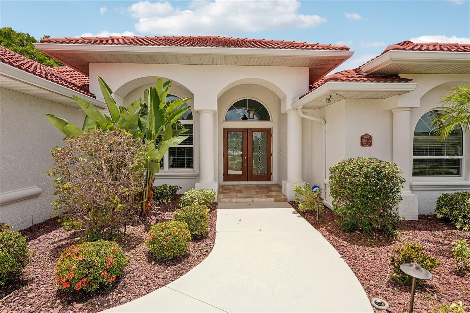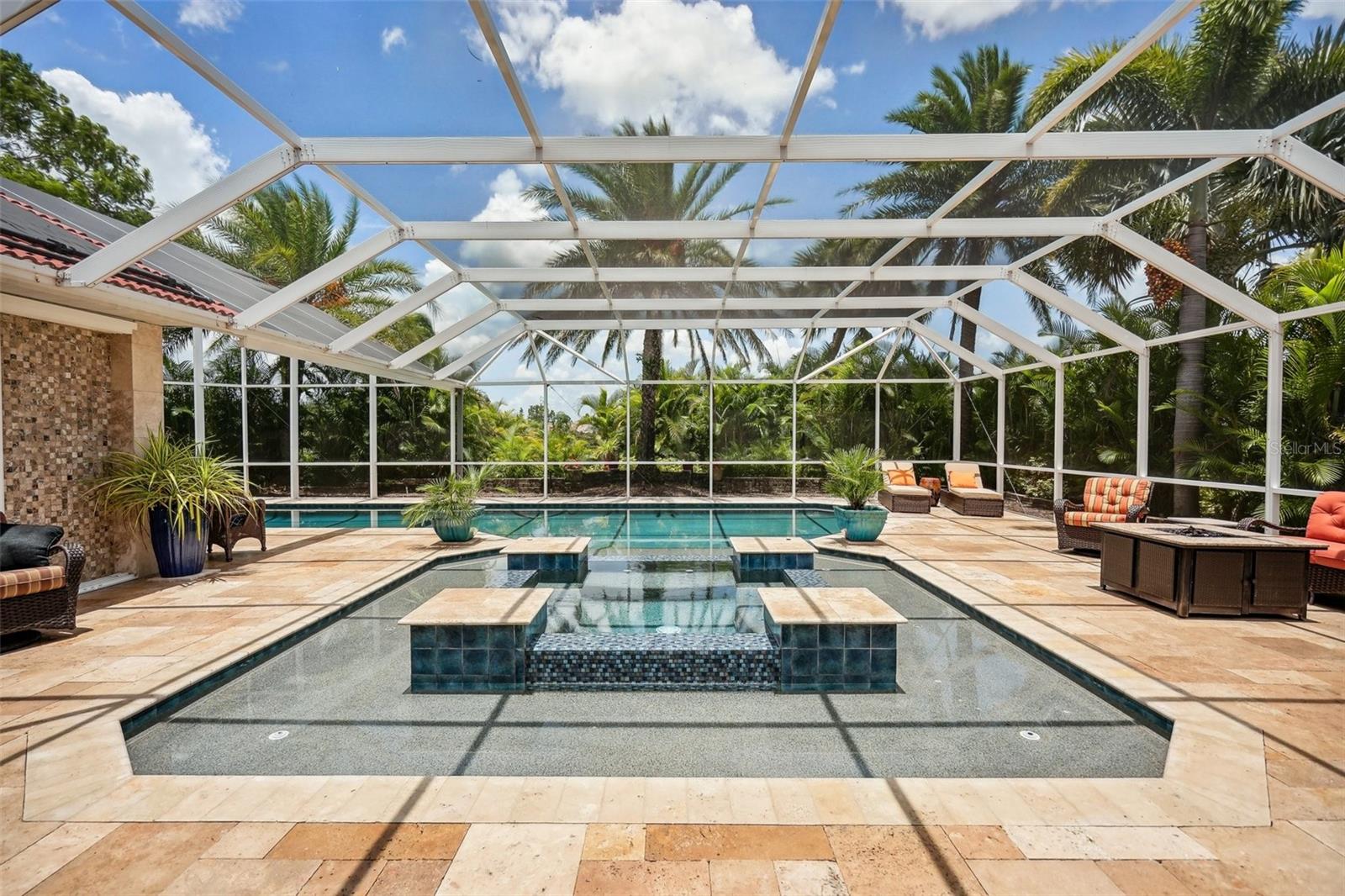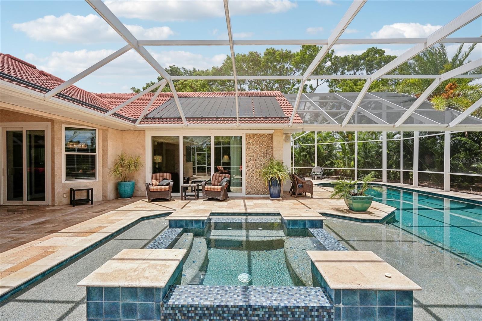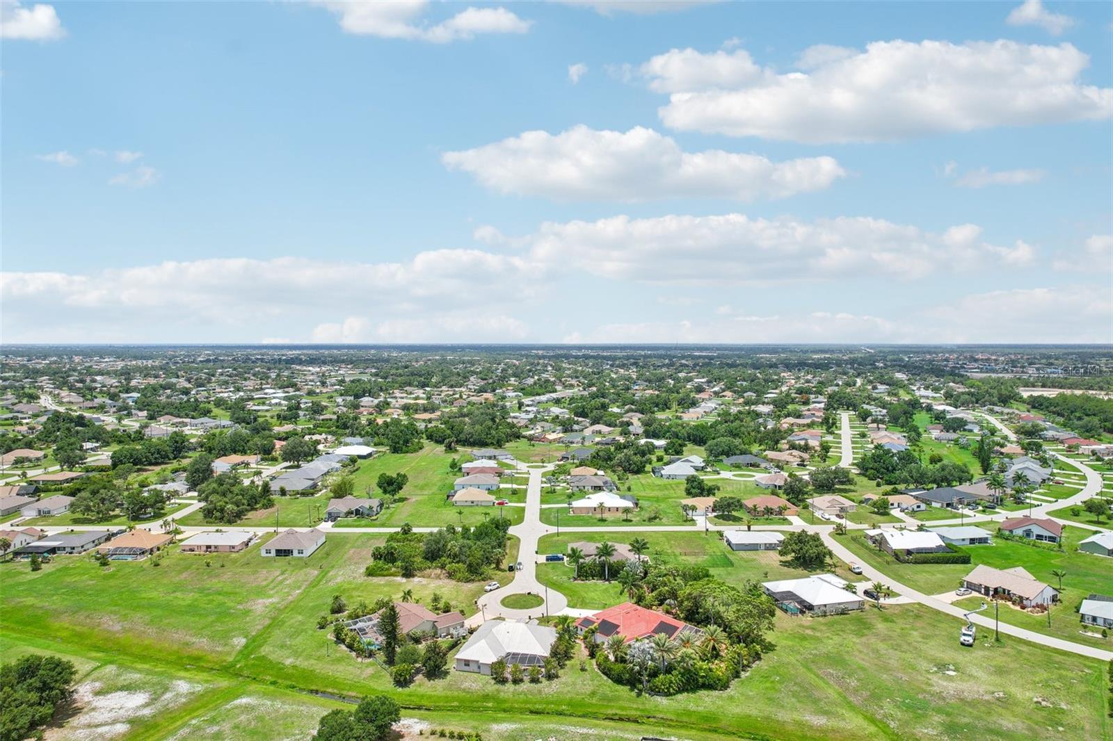 Discover this exquisite 4-bedroom home nestled on a tranquil, oversized lot at the end of a cul-de-sac in the heart of Deep Creek. The property boasts a backyard tropical oasis with a solar-heated pool featuring a spa, sun shelf, and extended lap area, all encircled by beautiful travertine decking. The home also features a professionally landscaped area, equipped with an irrigation system and private well, providing abundant space for family gatherings and outdoor activities. This property has even garnered a Landscape Award from the Deep Creek Garden Club! Inside, a spacious great room welcomes you with direct views of the lanai and pool area. The home flows effortlessly from the open kitchen—with its elegant living room, breakfast nook, and formal dining area—perfect for hosting and daily family life. The expansive primary bedroom offers pool access through a sliding door and includes a luxuriously renovated master bath with a soaking tub and dual walk-in closets. This bedroom suite ensures privacy, separated from the three additional guest bedrooms across the home. The true gem is the outdoor living space. The solar-heated pool and expansive lanai provide the ultimate relaxation zone, complete with a cozy gas fireplace and ample room for dining and entertainment, plus a convenient poolside bathroom and shower. Recent enhancements include new kitchen appliances—a fridge and stove installed in 2022, a dishwasher in 2023, and a washer and dryer in 2024—a new solar heat system for the pool installed in 2022, and impact-resistant PGT windows and sliders added in 2018. Located near schools, shopping, and the Peachland Promenade, this Florida Ranch-style property, with 2,582 square feet of luxurious living space on a 13,300 sq. ft. lot, offers an unparalleled luxury living experience with the perfect blend of privacy and convenience. Don't miss this exceptional chance to claim your slice of paradise in Deep Creek!