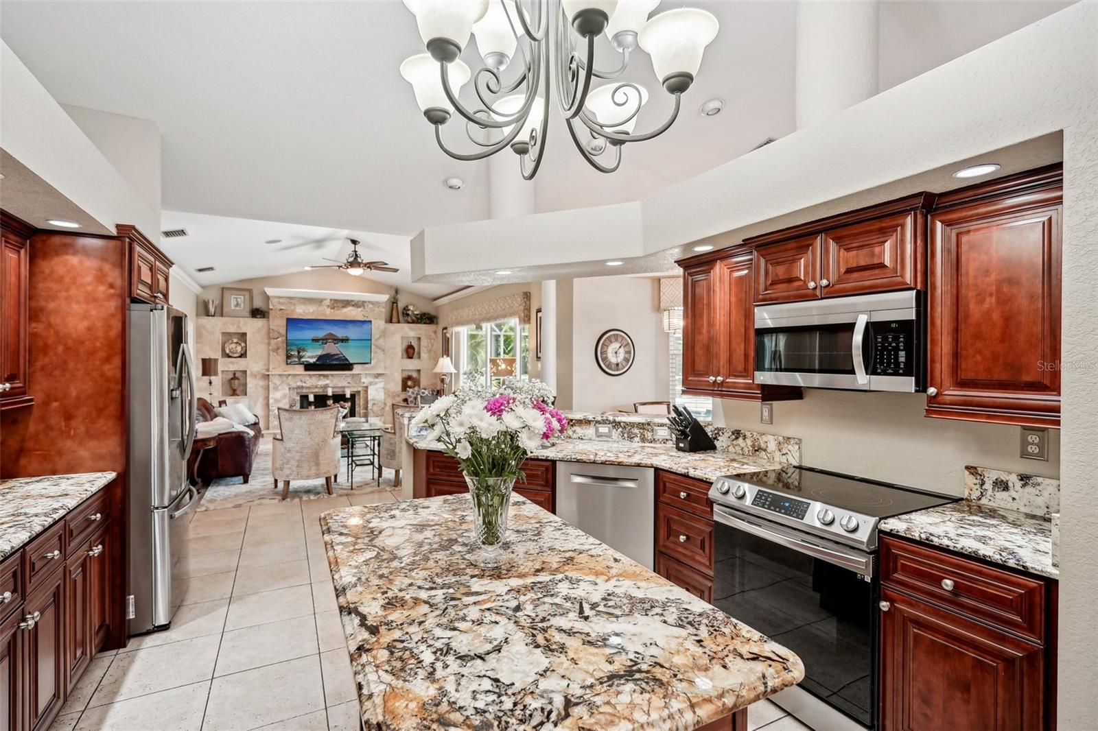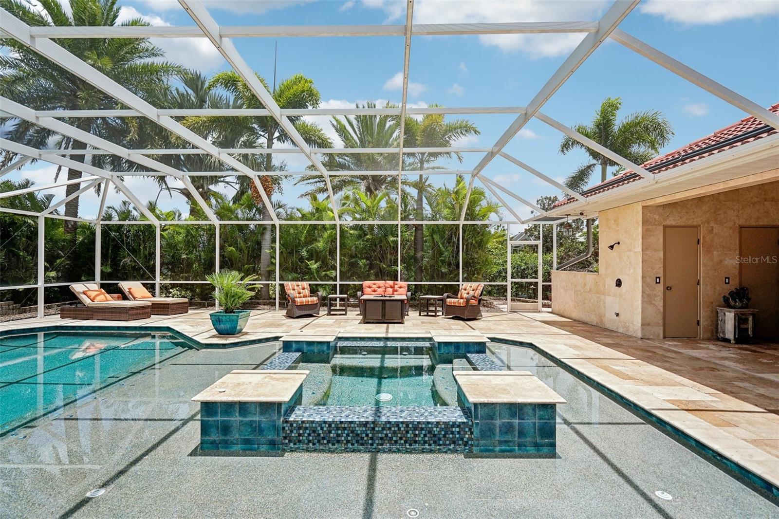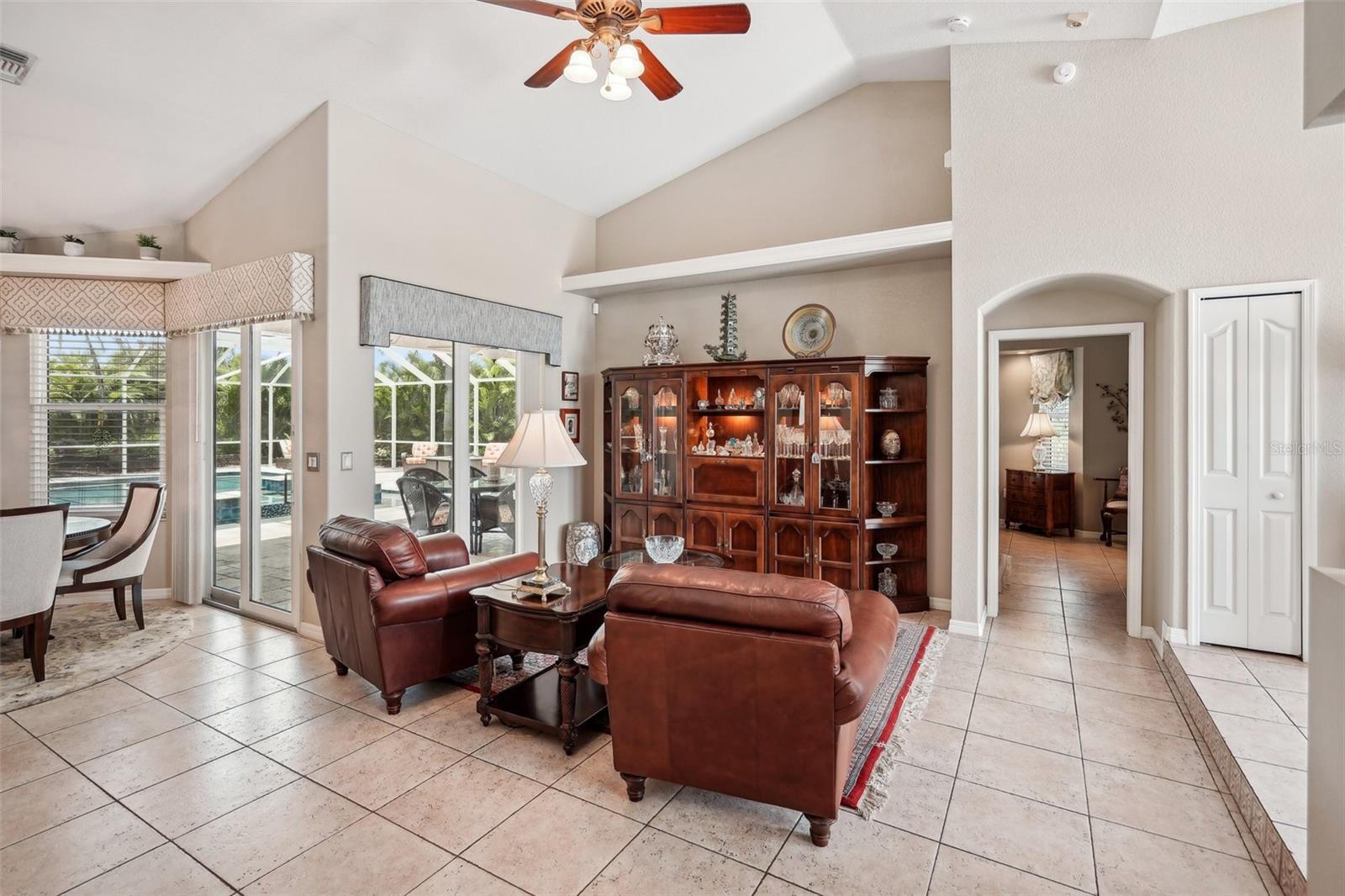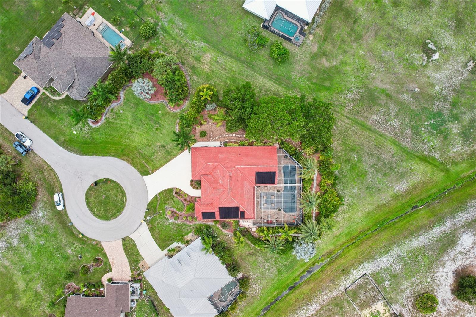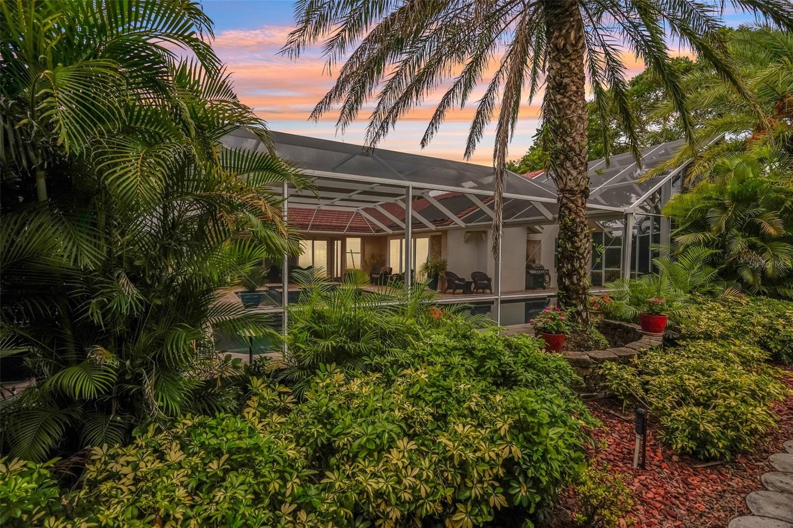 Discover this exquisite 4-bedroom home nestled on a tranquil, oversized lot at the end of a cul-de-sac in the heart of Deep Creek. The property boasts a backyard tropical oasis with a solar-heated pool featuring a spa, sun shelf, and extended lap area, all encircled by beautiful travertine decking. The home also features a professionally landscaped area, equipped with an irrigation system and private well, providing abundant space for family gatherings and outdoor activities. This property has even garnered a Landscape Award from the Deep Creek Garden Club! Inside, a spacious great room welcomes you with direct views of the lanai and pool area. The home flows effortlessly from the open kitchen—with its elegant living room, breakfast nook, and formal dining area—perfect for hosting and daily family life. The expansive primary bedroom offers pool access through a sliding door and includes a luxuriously renovated master bath with a soaking tub and dual walk-in closets. This bedroom suite ensures privacy, separated from the three additional guest bedrooms across the home. The true gem is the outdoor living space. The solar-heated pool and expansive lanai provide the ultimate relaxation zone, complete with a cozy gas fireplace and ample room for dining and entertainment, plus a convenient poolside bathroom and shower. Recent enhancements include new kitchen appliances—a fridge and stove installed in 2022, a dishwasher in 2023, and a washer and dryer in 2024—a new solar heat system for the pool installed in 2022, and impact-resistant PGT windows and sliders added in 2018. Located near schools, shopping, and the Peachland Promenade, this Florida Ranch-style property, with 2,582 square feet of luxurious living space on a 13,300 sq. ft. lot, offers an unparalleled luxury living experience with the perfect blend of privacy and convenience. Don't miss this exceptional chance to claim your slice of paradise in Deep Creek!