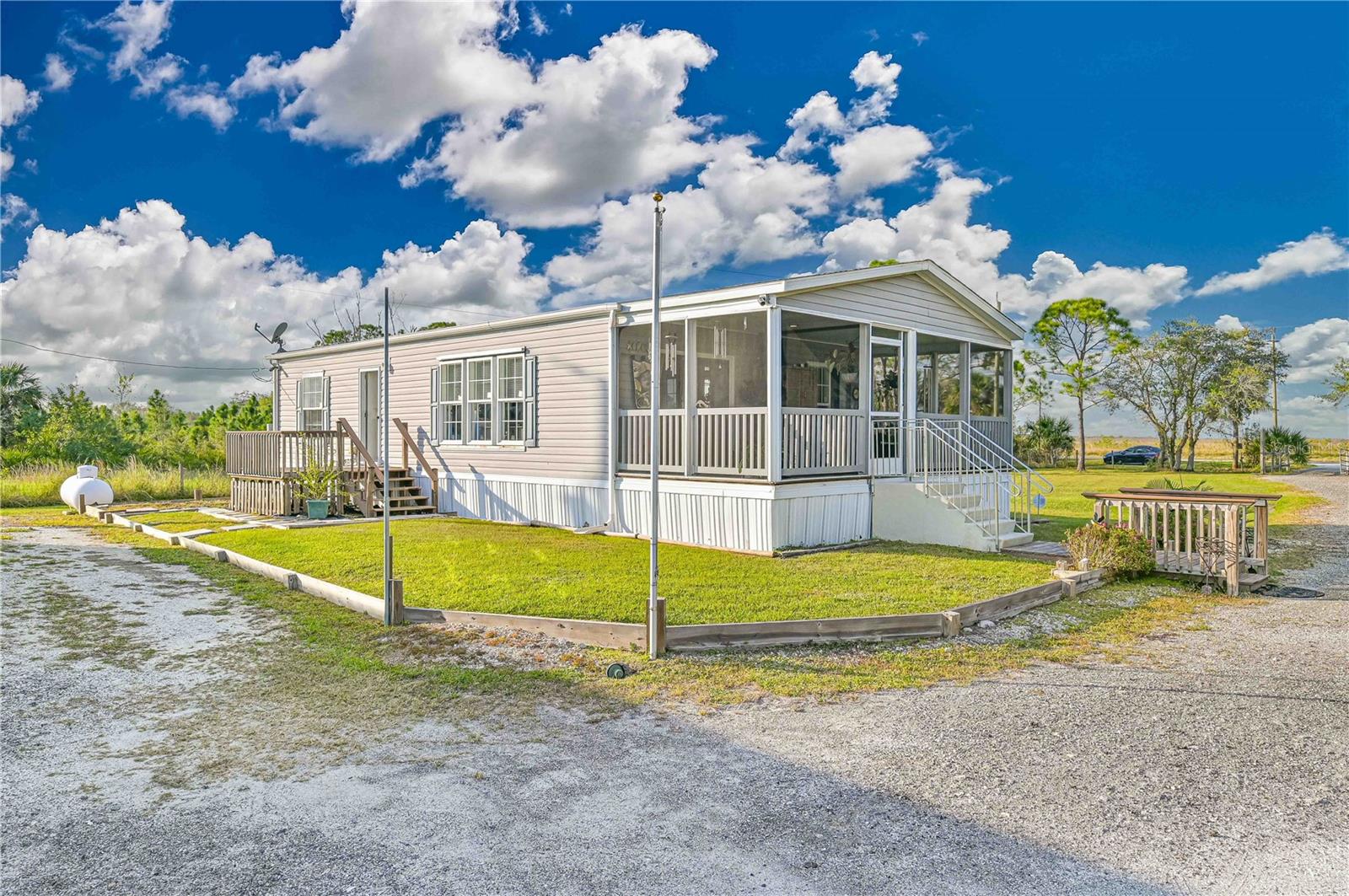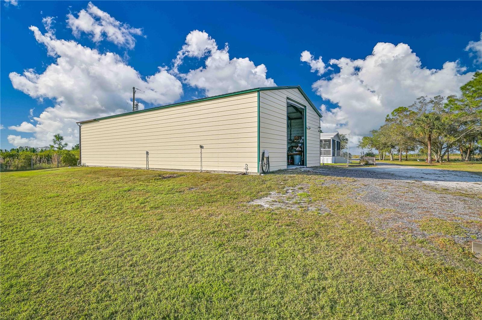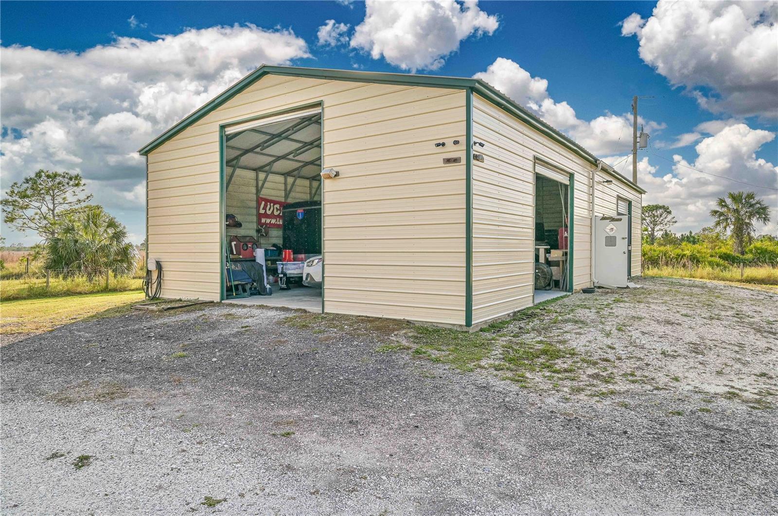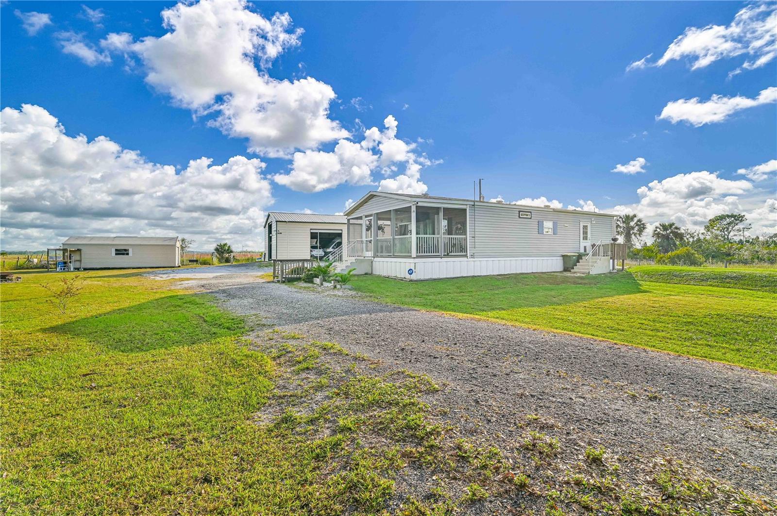 This 2-bedroom, 2-bathroom manufactured home, built in 2019, offers the perfect combination of privacy and country living on 1.25 acres. The property includes a spacious 30' x 60' workshop, complete with three overhead doors, a 6-inch concrete slab foundation, a bathroom, and ample space for storage or business needs. Inside, the home features an open floor plan with luxury vinyl flooring, a large screened porch, and hurricane shutters for added peace of mind. Designed with animal lovers in mind, the AG-rated property is fully fenced and equipped with a water system, making it ideal for small animals. The property is securely enclosed with a gated entry, offering privacy and peace of mind. Generac System including propane tank (powers - workshop, house & water) and camera security system included with sale (pending purchase price). AC (2019), roof (2019), and water heater (2019), Flood Insurance not required (Zone X). An option to purchase additional acreage may be available. Whether you're looking for a private retreat, a self-sufficient lifestyle, or a dream workshop, this property provides the perfect setting to embrace country living.