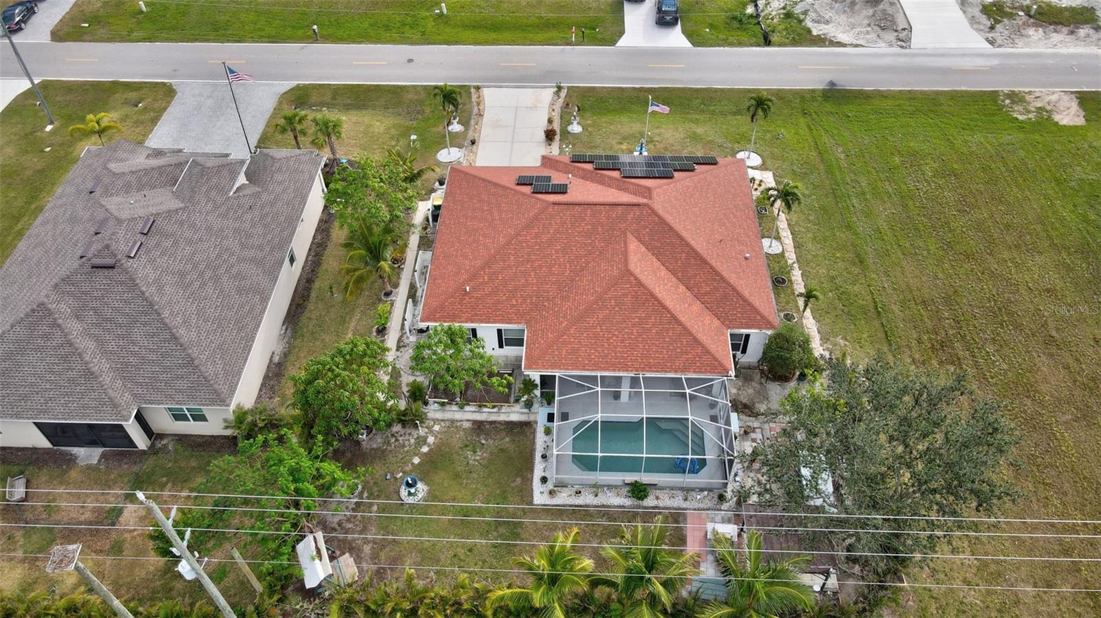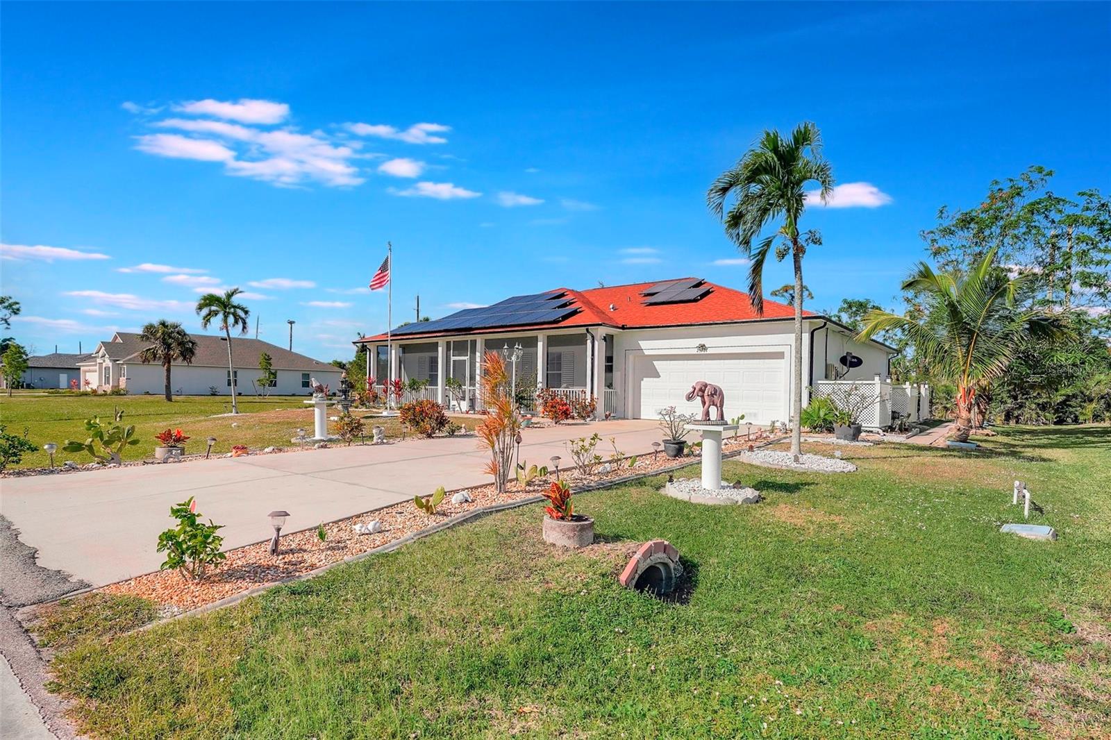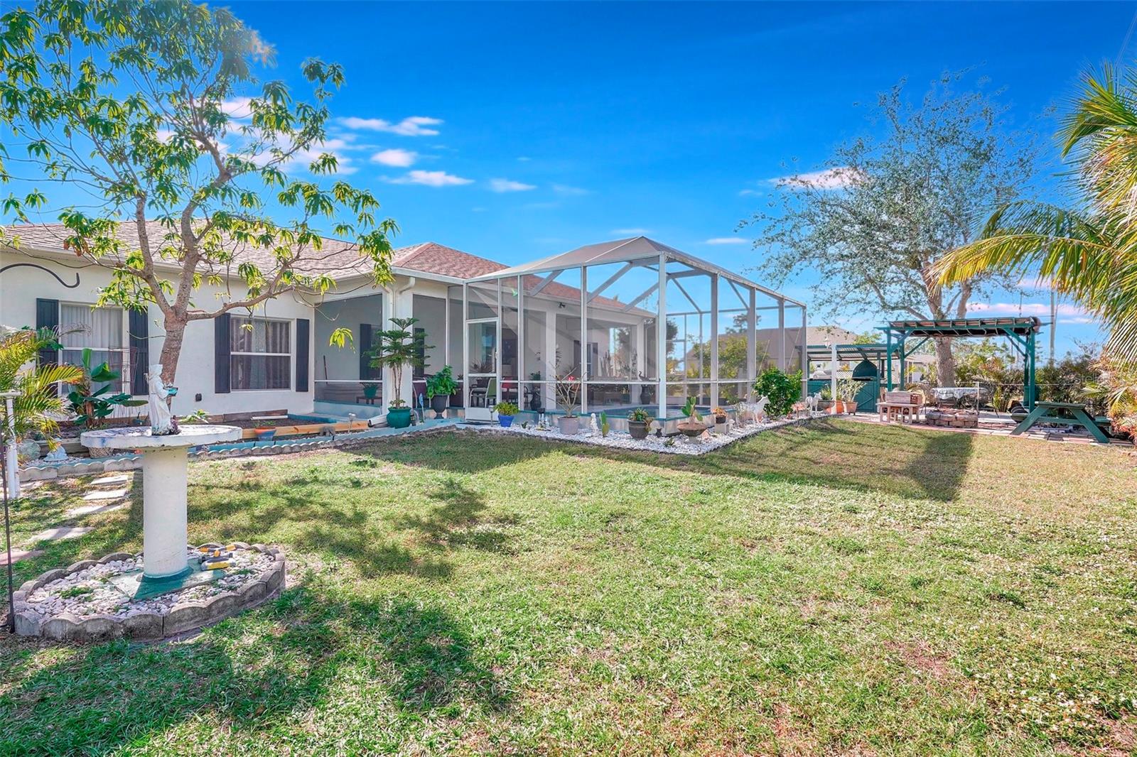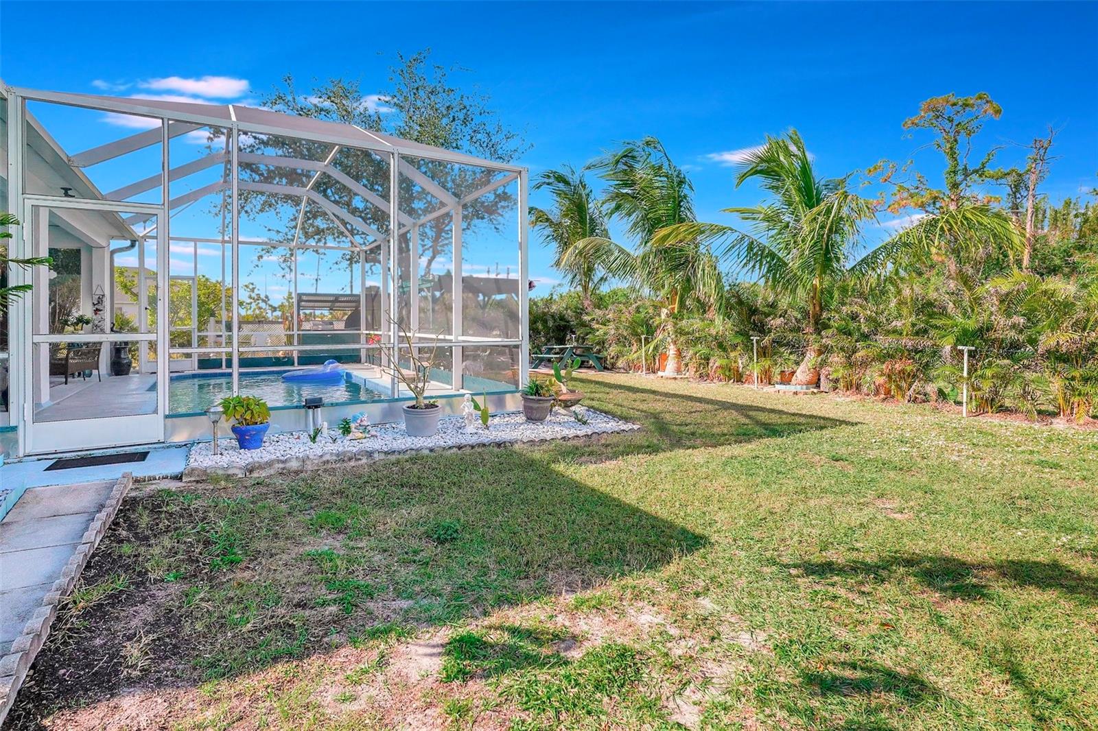 Stunning EXTENSIVE UPGRADES 3-Bedroom, 2 Bath, Pool Home in BURNT STORE VILLAGE – NO FLOOD ZONE! This 3-bedroom, DEN, 2-bathroom pool home offers a bright, open floor plan with a spacious kitchen perfect for entertaining, featuring granite countertops, wood cabinets, beautiful flooring and a large pantry. Highlights include: New roof (2023), French doors to a private office, PLUS French doors to added bonus room, 4th bedroom, or flex space. Luxurious Master Suite with walk-in closet, soaking tub, and walk-in shower. Lots of outdoor living area and lush landscaping. Enjoy your outdoor living space with Screened-in front porch area plus large rear lanai with sparkling pool, covered patio and plenty of seating area. Beyond the lanai is added entertaining area with grilling station, fire-pit and a small pavilion. Save on energy with leased solar panels ($155/month, no electric bill). Enjoy Burnt Store Village’s quiet streets, scenic park with a lake, and prime location just minutes from Burnt Store Marina and historic PUNTA GORDA'S waterfront attractions with plenty of shopping, dining, boat ramps, fishing piers, walking and biking paths, including Fisherman's Village. HOME COMES WITH ONE YEAR HOME WARRANTY FOR TOTAL BUYER COMFORT! Come see it today. PLEASE REMOVE SHOES IN THE HOME