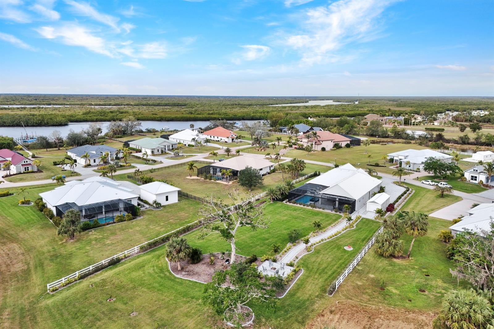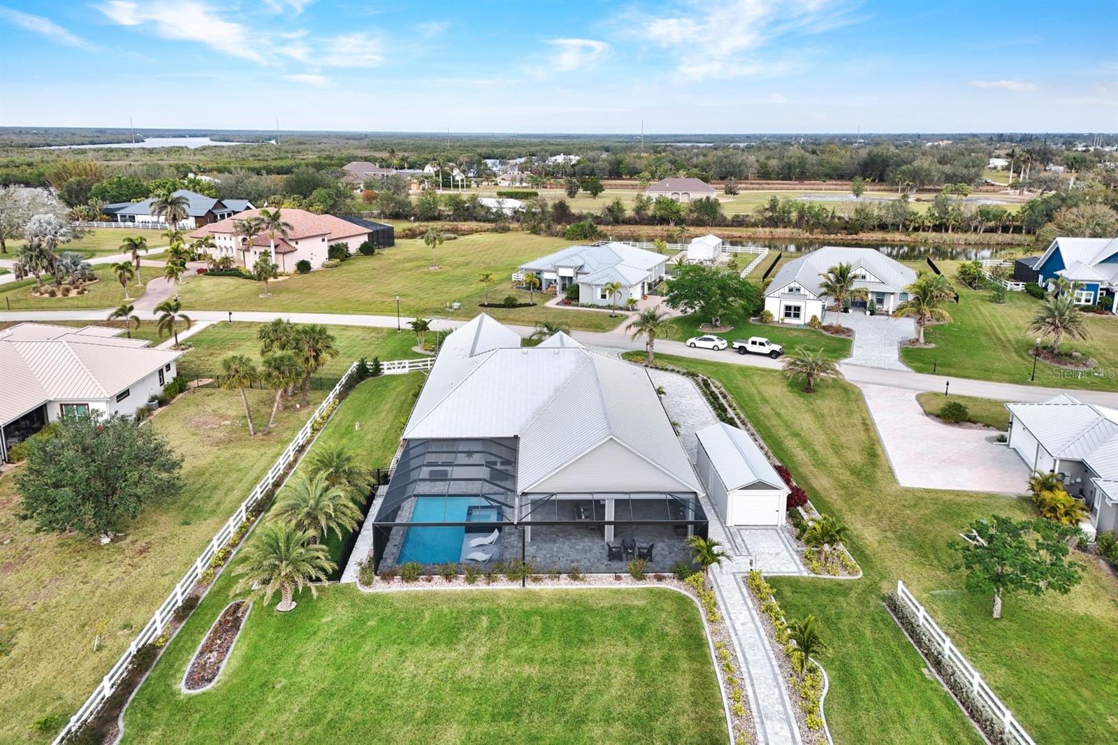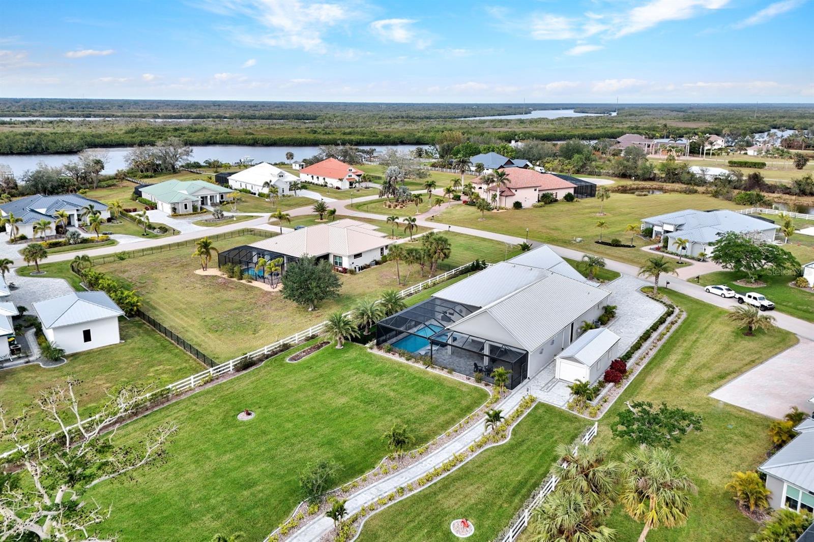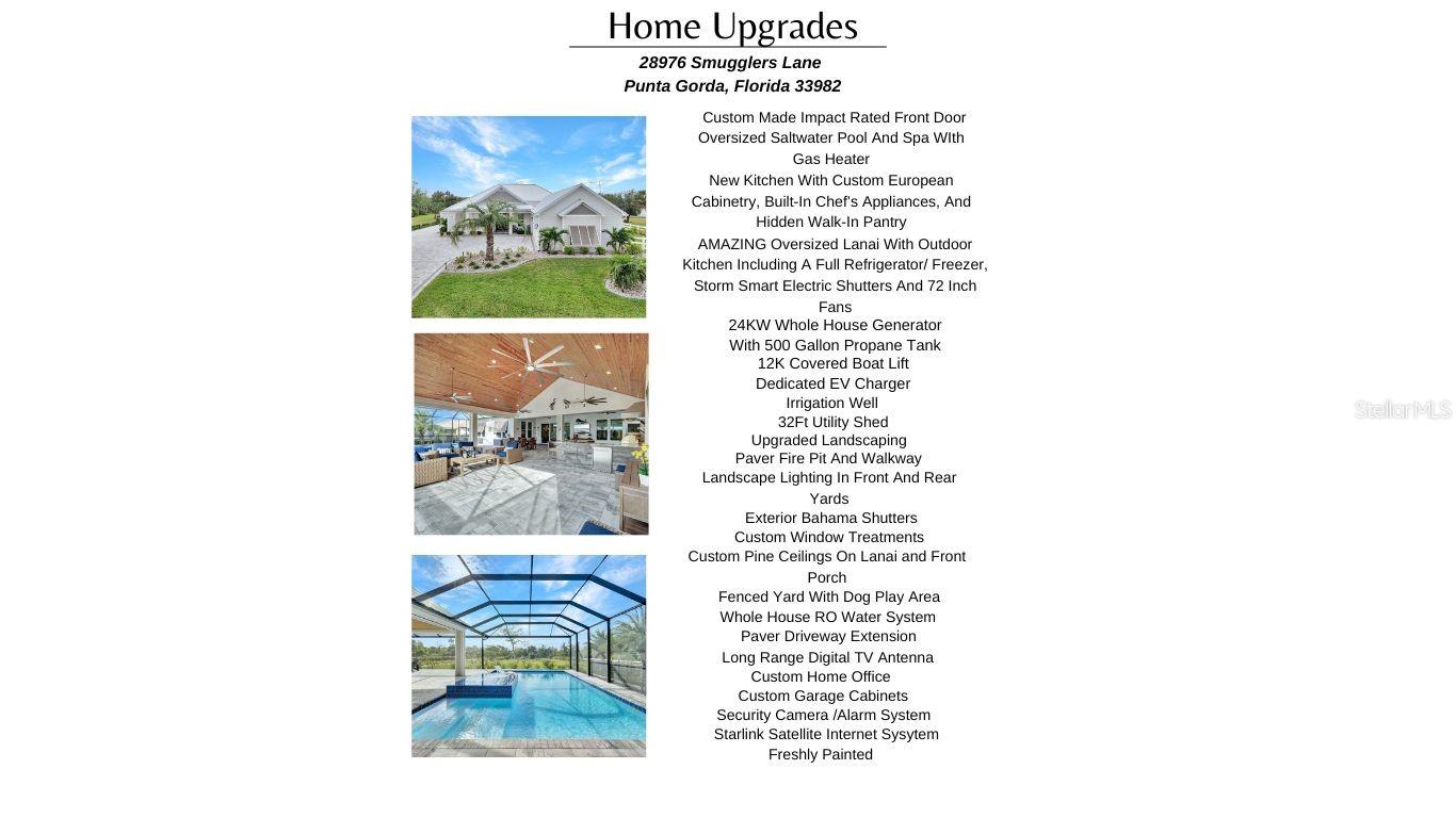 The rarest of opportunities awaits—where country charm, coastal elegance, and modern convenience converge into a dream home of unparalleled beauty. Located in the gated community of the Estates on Peace River, this immaculately maintained and extensively upgraded property is a true masterpiece of craftsmanship and thoughtful design. Step inside and be captivated by the inviting, open layout that seamlessly blends sophisticated elegance with luxurious comfort. The four spacious bedrooms and three beautifully appointed baths offer generous space for both family and guests. The private, well-sized primary suite is a serene retreat, boasting a spa-worthy bathroom with luxurious finishes that rival your favorite resort, and a large custom closet designed to keep you organized in style. At the heart of the home lies a chef’s dream kitchen—featuring exquisite, high-quality European cabinets that combine sleek design with superior functionality, along with top-of-the-line, built-in Miele appliances for the ultimate in culinary performance. A walk-in pantry completes the space, perfectly designed to meet your every storage need with flair and efficiency. Beyond the impeccable interior, the outdoor living area truly elevates this home to a class of its own. A sprawling lanai, adorned with stunning pine tongue-and-groove ceilings, offers multiple seating areas to relax and entertain. The large outdoor kitchen is fully equipped to handle gatherings of any size, while the saltwater pool and spa create an entertainer’s paradise. Imagine cozy evenings by the custom-built firepit, where you can unwind under a canopy of stars. Boating enthusiasts will revel in the dedicated 12,000-lb boat lift with direct access to Charlotte Harbor and beyond, promising endless waterfront adventures to Sanibel, Captiva, Useppa, and beyond. The expansive, fenced yard includes a puppy run, ensuring your four-legged friends feel just as pampered as you do. Custom touches abound throughout the property, including built-in office cabinetry, a spacious three-car garage equipped with custom storage solutions and an EV charging station, a Whole House RO water system, a comprehensive security and camera system, and a powerful 24kW whole-house generator for continuous peace of mind. Every corner of this extraordinary residence tells a story of luxury, meticulous attention to detail, and modern refinement. This is far more than a house—it’s a lifestyle, a haven, and the perfect canvas for creating lifelong memories.