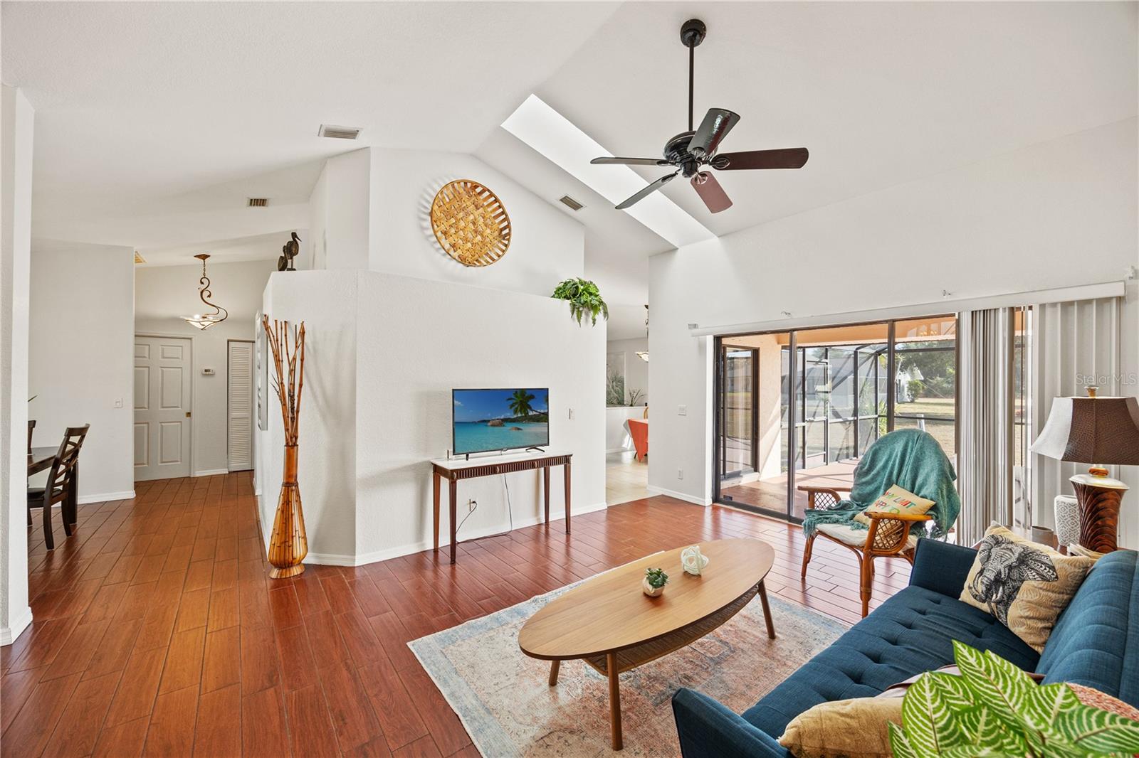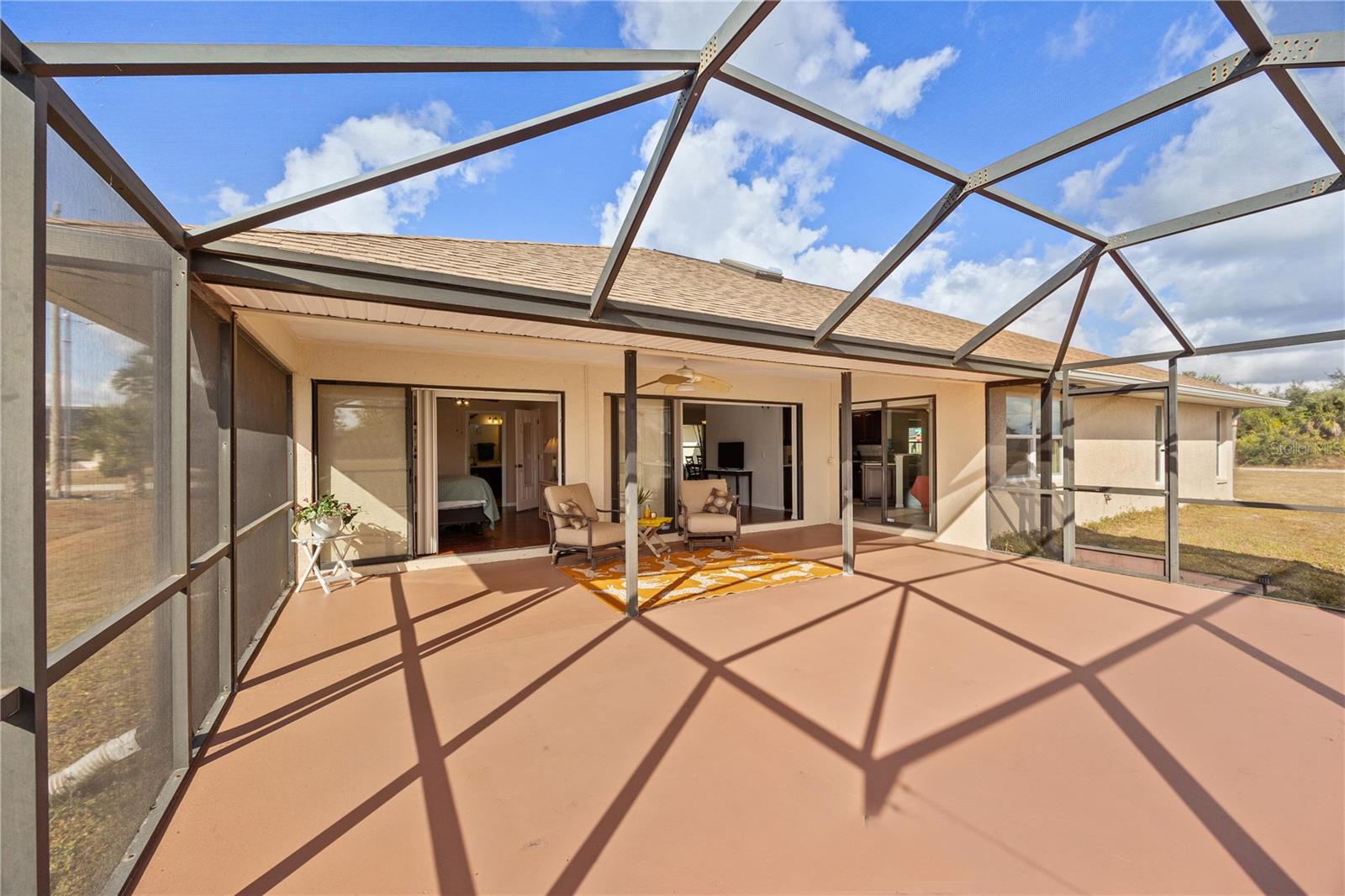 Welcome home to this beautifully maintained 3-bedroom, 2-bath residence, perfectly positioned on over 1/2 acre in the highly desirable Deep Creek community. Designed for comfort and easy living, this home offers a split floor plan with vaulted ceilings, creating an open, airy feel throughout. Natural light fills the formal living room through a skylight, enhancing the bright and inviting atmosphere. The kitchen is both functional and welcoming, featuring rich cherry cabinetry, a convenient breakfast bar, and a built-in desk—ideal for everyday living or entertaining. All bedrooms are accented with crown molding, while the spacious primary suite serves as a true retreat with a large walk-in closet and an ensuite bath featuring dual sinks and a walk-in shower. Wake up and enjoy your morning coffee on the extra-large screened lanai, accessible directly from the primary bedroom, while taking in peaceful greenbelt views. The living room also opens through full-wall triple sliding doors that seemlessly glide completely out of sight, creating seamless indoor-outdoor living perfect for relaxing or hosting guests.