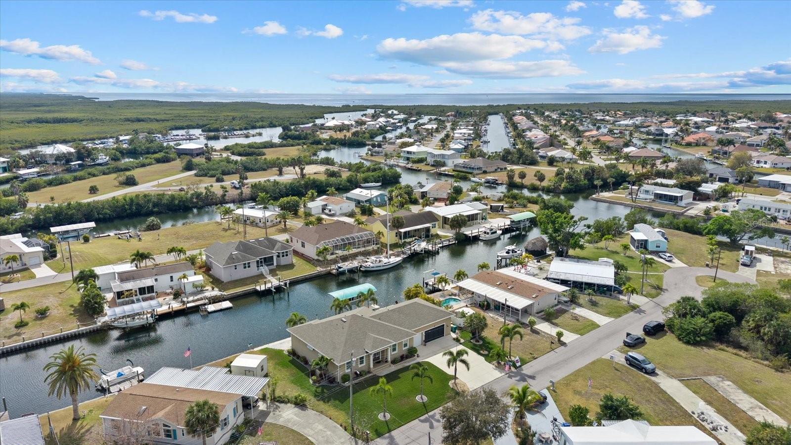 WATERFRONT LIVING WITH 100 FEET OF SALTWATER CANAL FRONTAGE AND DIRECT ACCESS TO CHARLOTTE HARBOR. Located in the Riviera Lagoons community with NO HOA, this 2016 elevated Florida style residence offers approximately 1,971 square feet of living space and quick boating access, approximately 12 minutes to open waters. The property features a 3-year-old roof and a 3-year-old concrete dock with covered boat lift, providing a turnkey setup for boating enthusiasts. Positioned on the Eldorado Waterway, this home offers 100 feet of waterfront and a north-facing water view. Inside, the open floor plan includes porcelain tile flooring throughout, high ceilings, tray and coffered ceiling details, crown molding, and abundant natural light. The kitchen is designed with solid wood cabinetry, stone countertops, eating space in kitchen, and a seamless kitchen/family room combination ideal for entertaining. The split-bedroom layout offers privacy, and the primary suite includes a walk-in closet. Additional features include inside utility room, central air and heat, ceiling fans, hurricane shutters, rain gutters, screened rear porch, and sliding glass doors that connect indoor and outdoor living. The oversized 35x30 attached garage accommodates up to 4 vehicles and includes tandem space and workshop area, ideal for storage, hobbies, or watercraft equipment. Situated on an oversized 100x95 lot with mature landscaping, paved streets, and proximity to area marinas, this property offers convenient access to Charlotte Harbor, downtown Punta Gorda, dining, shopping, and area schools. No minimum lease restrictions. A well-maintained waterfront residence designed for boating, entertaining, and Florida coastal living