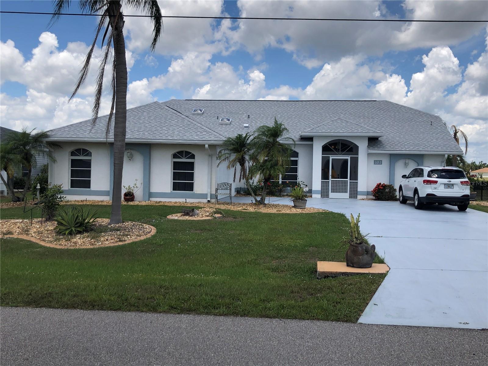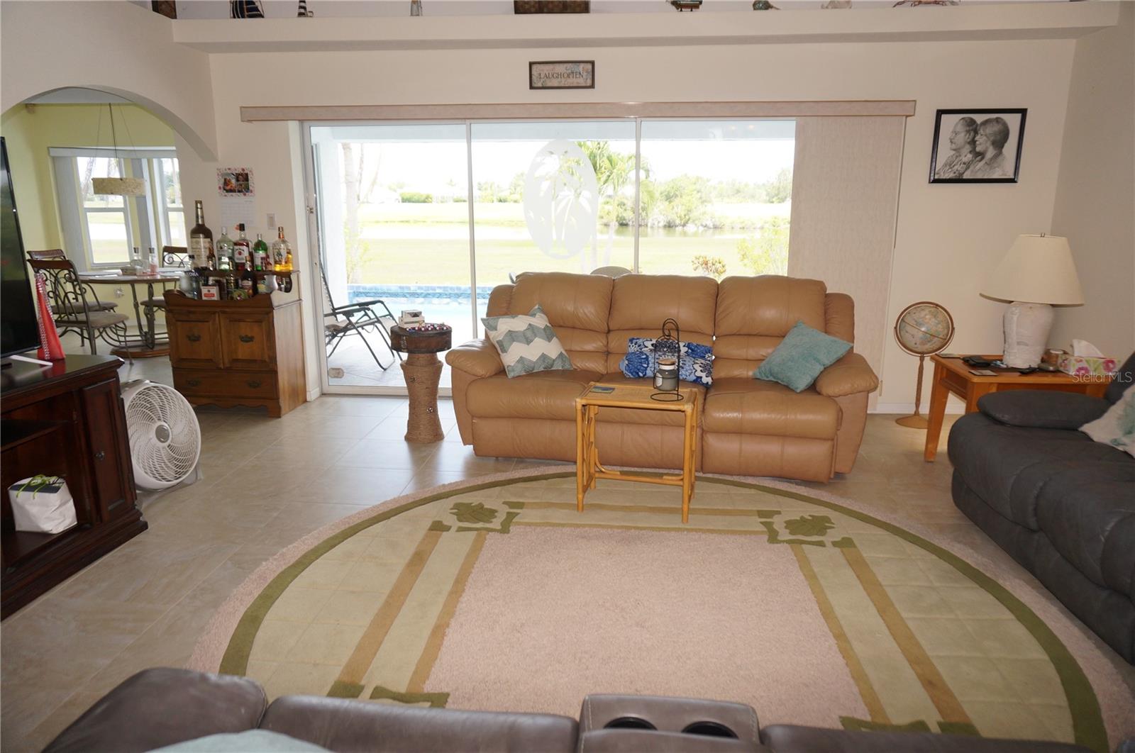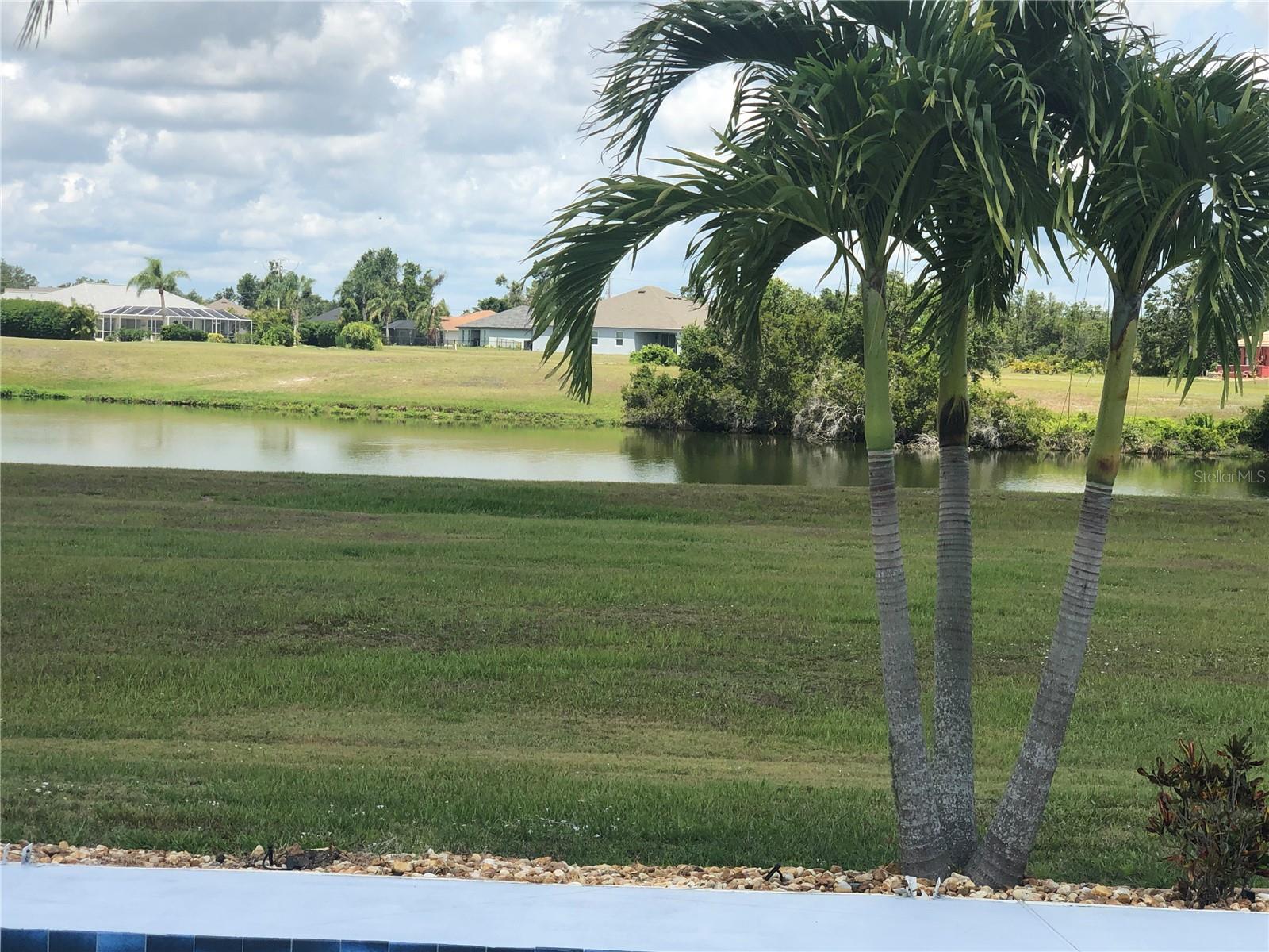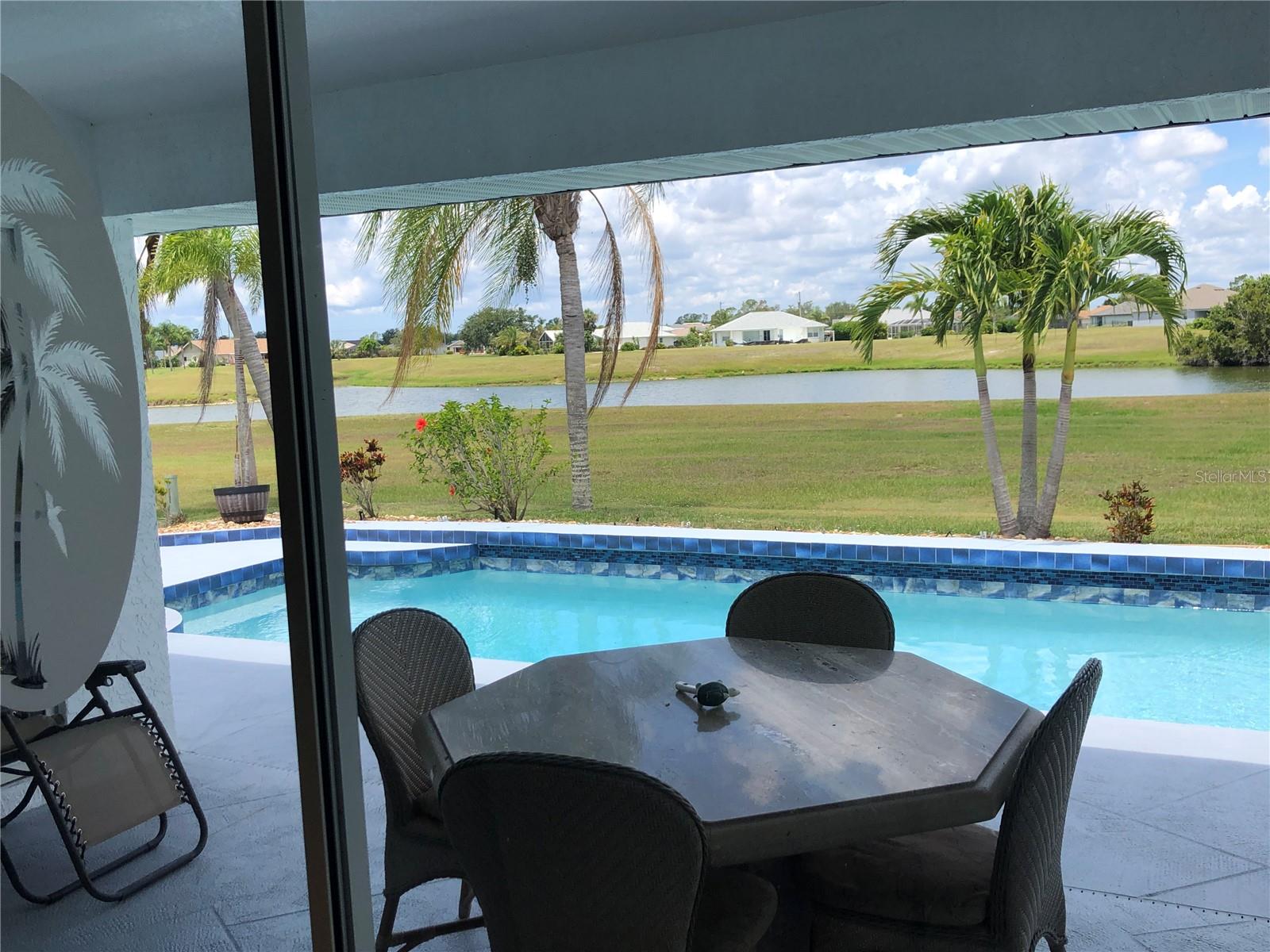 Impressive LAKE FRONT 3 Bedroom, 2.5 Bathroom home with attached 2 Car Garage located in the desirable deed restricted community of DEEP CREEK. LAKE VIEW and ACCESS. This light and bright home offers an open and split bedroom floor plan with Great Room, Dining Room, well equipped Kitchen, Dining Area and Inside Laundry. The Great Room features a cathedral ceiling, plant shelves, tile flooring and lanai access. The Kitchen has stainless appliances, built in desk, white cabinetry, tray ceiling and a Dining Area overlooking the pool and lake. The Inside Laundry offers a washer and dryer and skylight. The spacious Master Bedroom suite has two walk in closets, Lanai access via French doors and a private bathroom with dual sinks and a walk in shower. There are two additional good sized bedrooms, one is being used as a den. The guest bathroom has a tub/shower combo. Your living space extends through pocket sliding glass doors to the lanai and pool area with heated inground gunite pool, 1/2 bath access, outdoor shower, large covered lanai area, plenty of open deck for sunbathing and LAKE VIEW. Other features include double door entry with transom window, NEW skylights in laundry room and guest bathroom, arched doorway, kitchen reverse osmosis system, rain gutters, tile flooring in living areas and carpet in bedrooms, solar vent on roof pulls heat OUT. The garage has an opener, pull down attic, side door. **SOLD FURNISHED** except for personal items. ** NEW ROOF and Skylights 2023** NEW A/C 2018. Pool resurfaced and new pool tile 4 years ago. This home is perfect for a family or those expecting lots of winter visitors. Minutes from Golf at Deep Creek Golf Club, shopping, dining, I-75, entertainment and short distance to medical care, waterfront parks, boat ramps, fishing piers. This house is perfect for a family or those expecting lots of winter visitors!