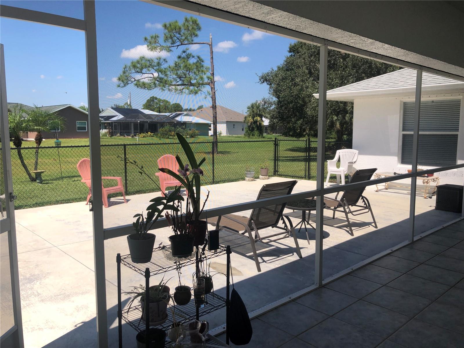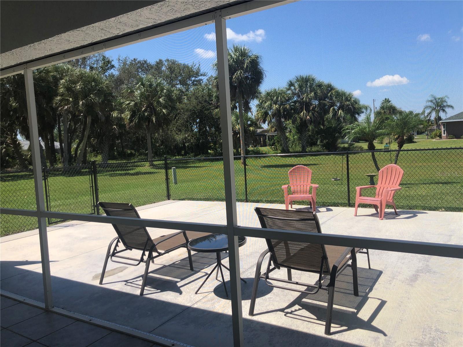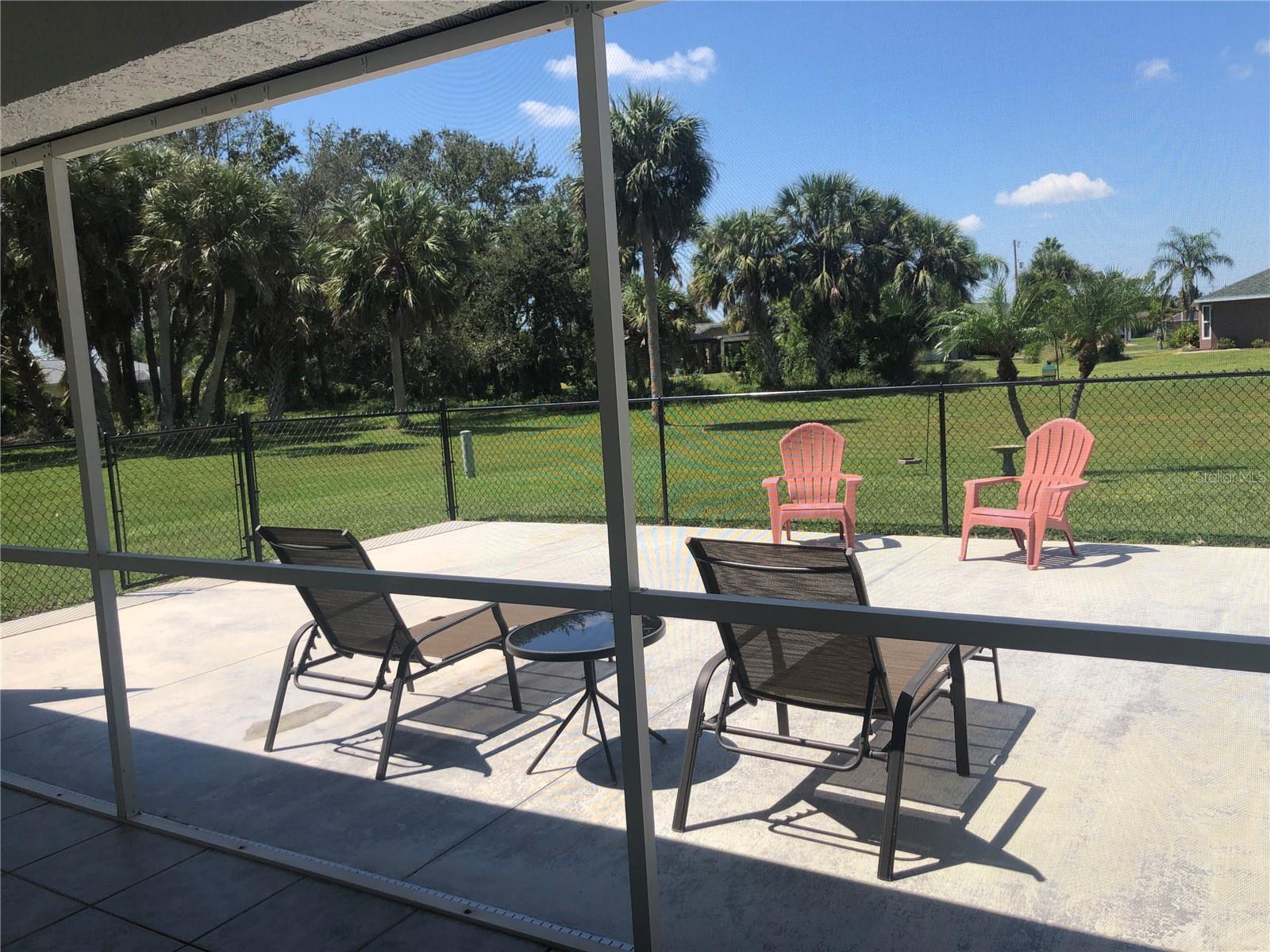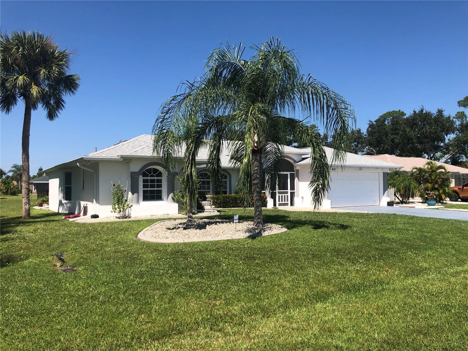 Impressive 3 Bedroom, 2 Bathroom home with attached oversized 2 Car Garage. Located on a quiet dead end street with cul-de-sac in the desirable deed restricted community of DEEP CREEK. Not in a flood zone. This light and bright home offers an open and split bedroom floor plan with Living Room, Family Room, well equipped Kitchen, Inside Laundry. The Living Room and Family Room have plant shelves and the Family Room has a cathedral ceiling. The Kitchen features nice cabinets, stainless refrigerator, stainless microwave, oven/range, dishwasher, nice cabinets, breakfast bar, closet pantry and dining area. The Inside Laundry has a washer, dryer, sink and cabinets.The Master Bedroom suite offers lanai access via French doors, two walk in closets and private bathroom with his and hers sinks, garden tub and walk in shower. There are two additional generous sized bedrooms with walk in closet and the guest bathroom has a tub/shower combo and lanai access. Your living space extends via sliding glass doors to the large 34x10 screened covered lanai and on to the fenced 34x20 patio. Other features include screened front entry, double door entry with transom window, storage in the garage, rain gutters, arched doorways, manabloc plumbing, hurricane shutters and Greenbelt View. Utilities are county water and sewer. This home is minutes from Golf, shopping, dining, I-75, entertainment and a short drive to medical care, waterfront parks, boat ramps and fishing piers. This is a beautiful spacious home in a great community.