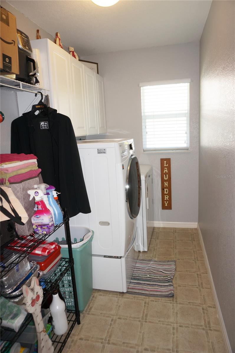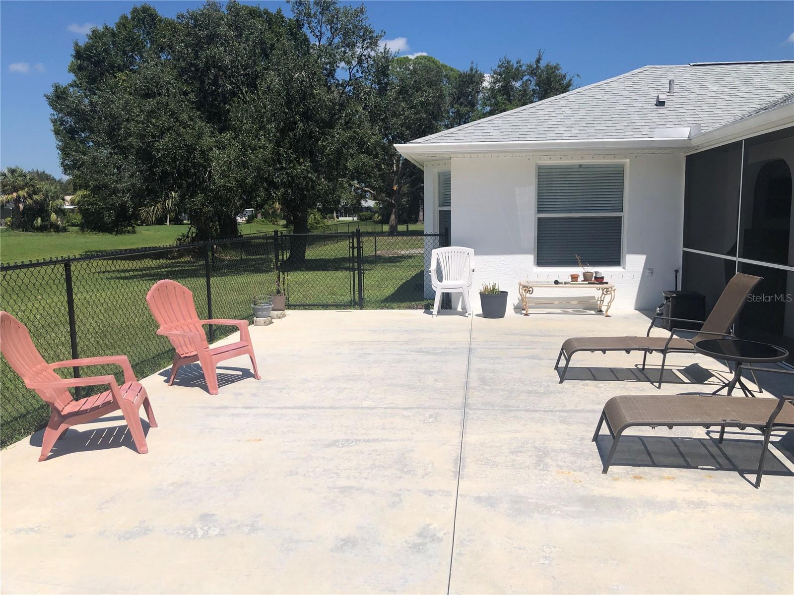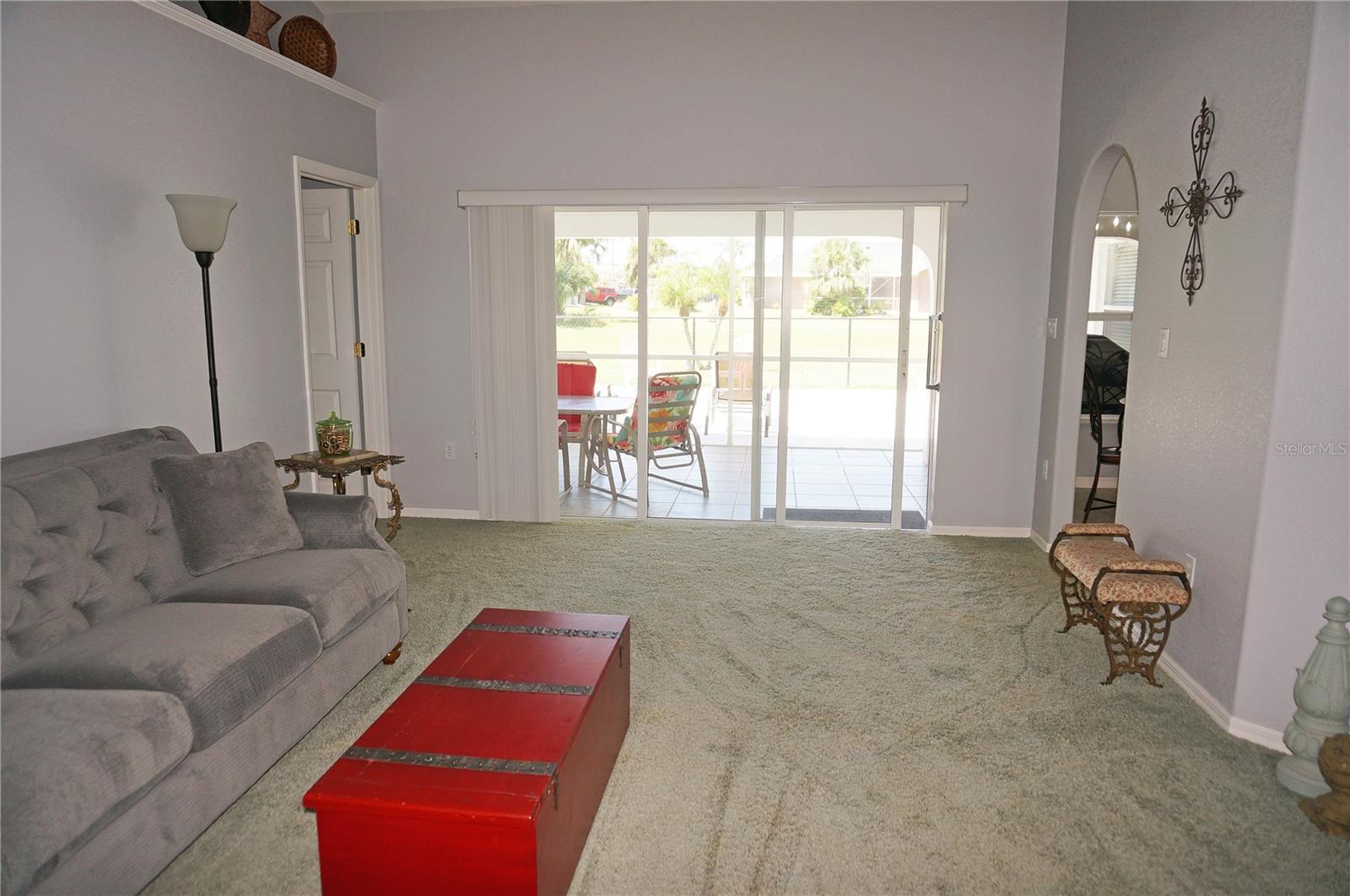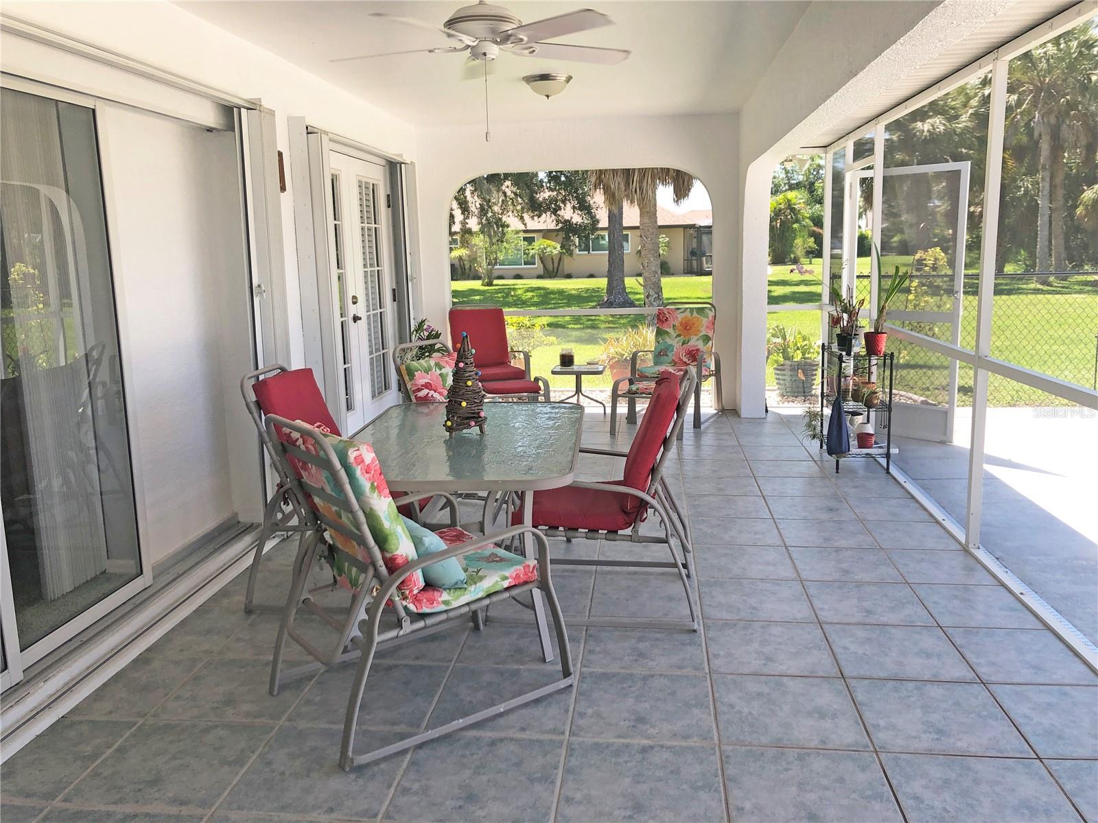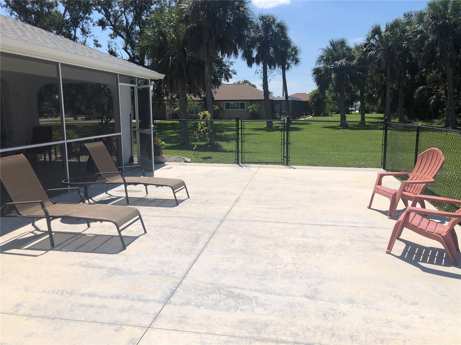 Impressive 3 Bedroom, 2 Bathroom home with attached oversized 2 Car Garage. Located on a quiet dead end street with cul-de-sac in the desirable deed restricted community of DEEP CREEK. Not in a flood zone. This light and bright home offers an open and split bedroom floor plan with Living Room, Family Room, well equipped Kitchen, Inside Laundry. The Living Room and Family Room have plant shelves and the Family Room has a cathedral ceiling. The Kitchen features nice cabinets, stainless refrigerator, stainless microwave, oven/range, dishwasher, nice cabinets, breakfast bar, closet pantry and dining area. The Inside Laundry has a washer, dryer, sink and cabinets.The Master Bedroom suite offers lanai access via French doors, two walk in closets and private bathroom with his and hers sinks, garden tub and walk in shower. There are two additional generous sized bedrooms with walk in closet and the guest bathroom has a tub/shower combo and lanai access. Your living space extends via sliding glass doors to the large 34x10 screened covered lanai and on to the fenced 34x20 patio. Other features include screened front entry, double door entry with transom window, storage in the garage, rain gutters, arched doorways, manabloc plumbing, hurricane shutters and Greenbelt View. Utilities are county water and sewer. This home is minutes from Golf, shopping, dining, I-75, entertainment and a short drive to medical care, waterfront parks, boat ramps and fishing piers. This is a beautiful spacious home in a great community.