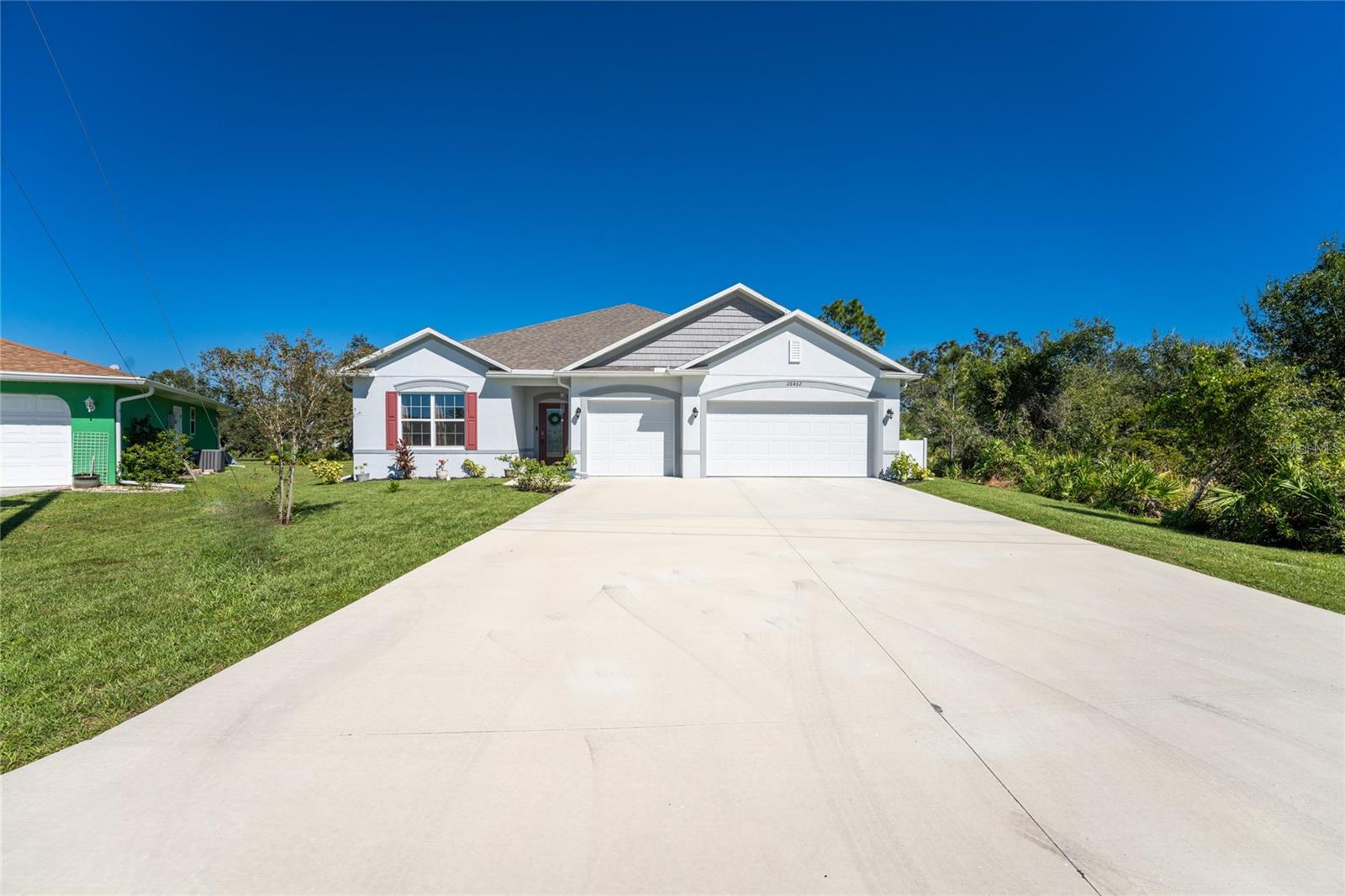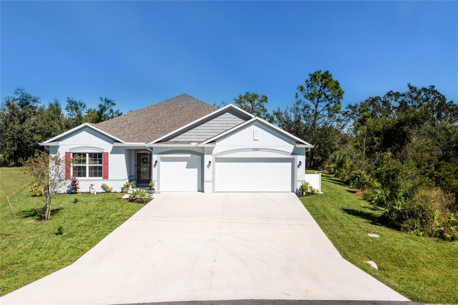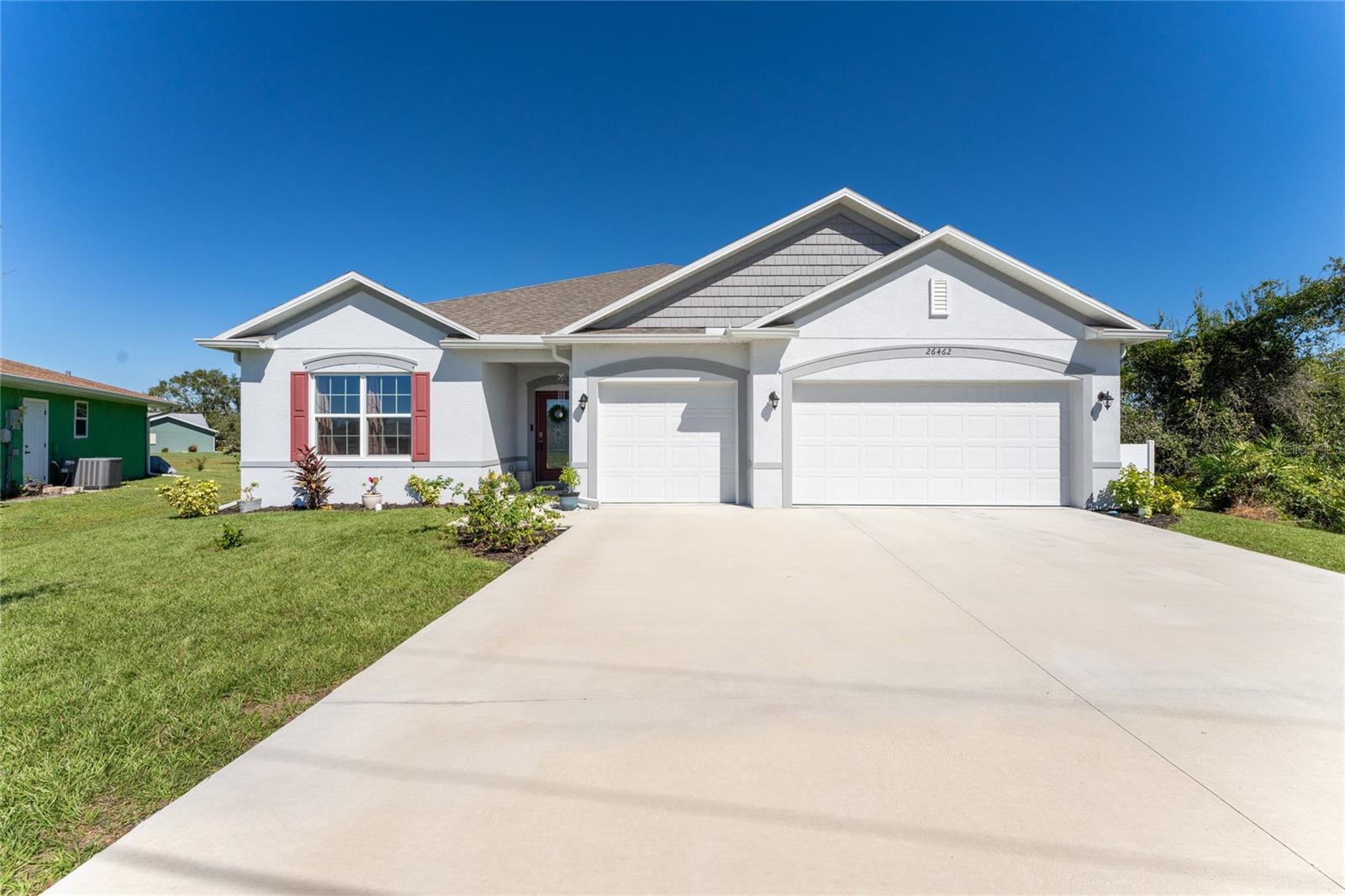 Nestled in the heart of Deep Creek, Punta Gorda, Florida, 26462 Asuncion Drive is a modern, vibrant, and exceptionally designed 2022-built gem that seamlessly combines style, comfort, and convenience. This masterpiece of contemporary architecture offers a harmonious fusion of luxury and functionality. As you arrive, you're greeted by an expansive three-car garage, ideal for your vehicles and storage needs. Inside, you'll be captivated by the sense of space and light, with tile flooring in the main living areas providing durability and a sleek, modern aesthetic. Plush carpeting in the bedrooms offers a cozy touch. The kitchen is the heart of this home, featuring stone countertops and a large kitchen island with dual sinks. It seamlessly flows into the open-concept living and dining areas, perfect for entertaining or family gatherings. A standout feature is the generous den/office space, ideal for remote work, a quiet reading nook, or pursuing hobbies. Imagine sipping morning coffee on the screened back porch, enjoying the warm Florida breeze - your private oasis for relaxation and outdoor dining. Safety is a top priority with hurricane shutters, providing peace of mind during storm seasons. This home offers three spacious bedrooms, with the owner's suite featuring an en-suite bathroom with double sinks, a walk-in shower, and a walk-in closet. The two additional bedrooms share a well-appointed second bathroom. Living in Deep Creek subdivision in Charlotte County, Florida, means easy access to local amenities, golf courses, parks, and recreational facilities. Moreover, the vibrant downtown Punta Gorda, Florida, is just a short drive away and a hub of exciting activities. From its charming shops and boutiques to its delicious dining options and lively events, downtown Punta Gorda has something for everyone. Stroll along the picturesque waterfront, savor the flavors of local cuisine, or immerse yourself in the vibrant arts and culture scene. Whether you're a young family, a professional couple, or a retiree seeking the ideal Florida lifestyle, this home caters to all. Pristine beaches, shopping, dining, and cultural attractions are just a short drive away. This property is a lifestyle upgrade waiting to happen, where dreams come true and the Florida sun smiles upon you daily. Take the chance to call this stunning property your own. Contact us today to schedule a viewing and start living the life you deserve in Deep Creek, Punta Gorda, Florida. This is more than a home; it's your ticket to the Florida dream!