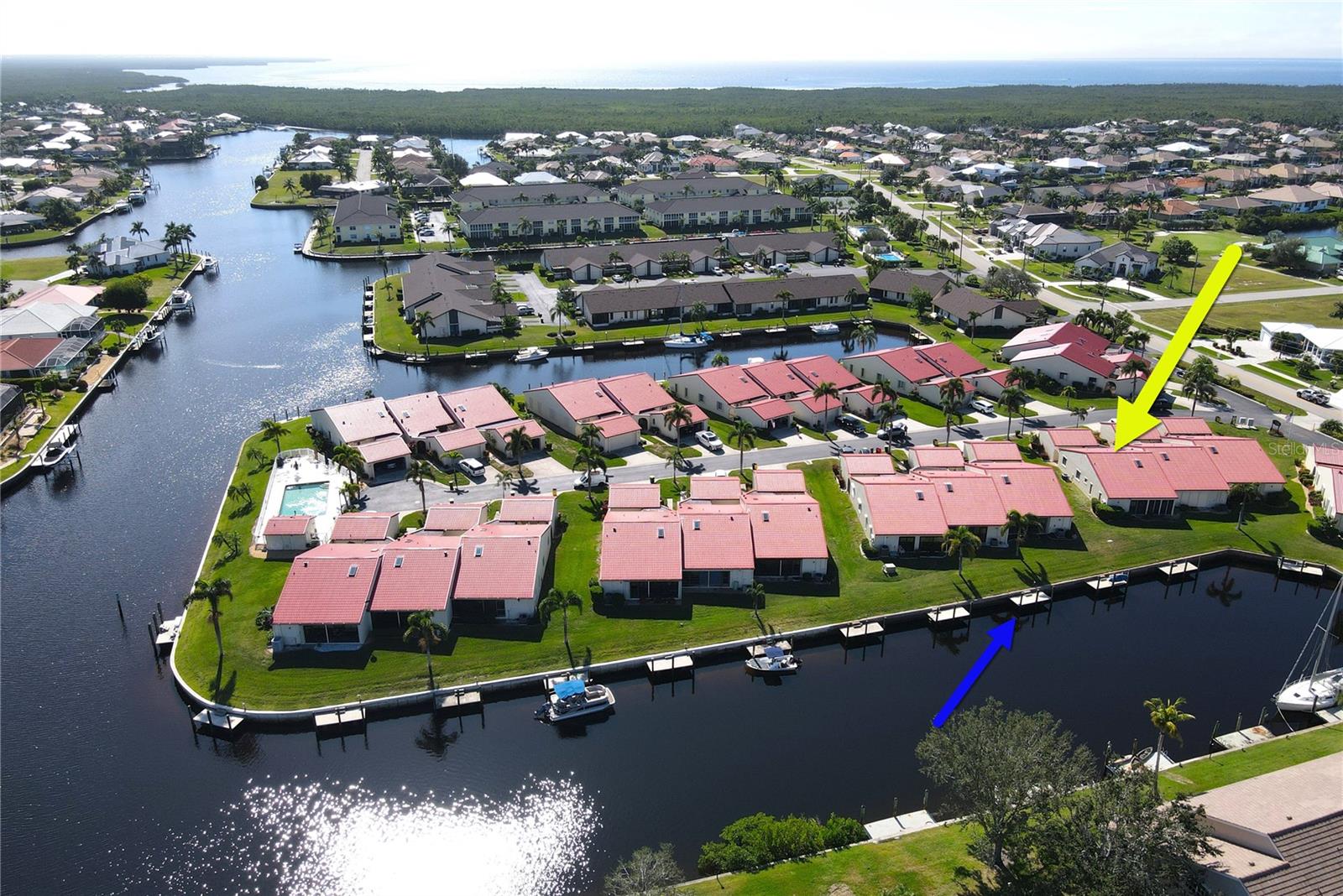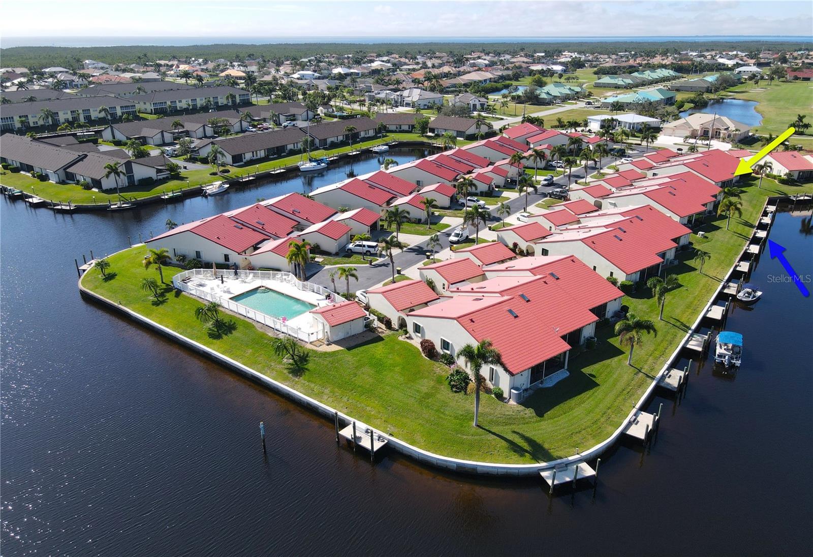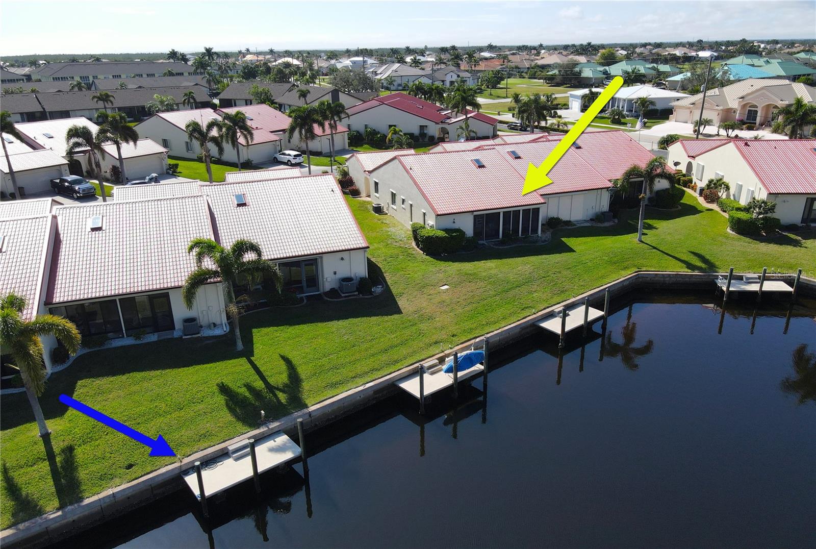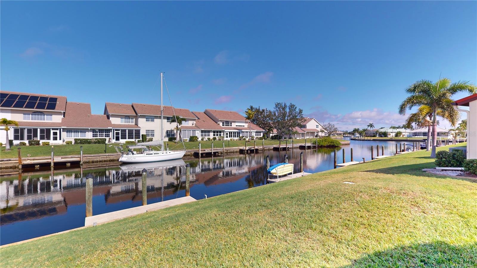 HUGE PRICE REDUCTION: WATERFRONT VILLA w/ASSIGNED PRIVATE DOCK provides direct access to Charlotte Harbor via Buckley's Pass....NO Bridges! PARK your BOAT in the backyard of this 2 Bed/2 Bath PLUS Den/Office/Bedroom is meticulously designed to offer a lifestyle of comfort and the best of Florida Living. The Paver and Tiled Courtyard Entry sets the tone and provides a great place for relaxing w/plenty of space for additional outdoor living, grilling and tropical plants. This End Unit with Vaulted Ceilings and Skylights only adds to the grandeur. Tile throughout w/carpet in two bedrooms. The living area seamlessly flows into the custom cabinets and quartz kitchen, providing a perfect blend of functionality and aesthetic appeal. The villa boasts a built-in coffee/wine bar, adding a touch of sophistication to your entertaining experience. Whether you're starting your day with a cup of coffee or winding down with a glass of wine, this space is designed for both relaxation and socializing. Breakfast Bar opens to Dining Area with Natural Light from the two skylights. This is truly a beautiful villa. Primary Suite on Waterside w/slider access to Lanai hosts two closets, walk-in shower and granite vanity. One of the standout features of this villa is direct access to Charlotte Harbor and the Gulf beyond. The waterfront location allows you to indulge in a boater's paradise right from your backyard. Imagine stepping out onto your private dock, boarding your boat, and setting sail into beautiful waters. The attention to detail extends to the tiled Florida room/Lanai offering a seamless transition between indoor and outdoor living spaces w/canal views. Full Shutter protection. Condo Fee includes Water, Sewer, Trash, Exterior including Roof, Insurance, Reserve, Property Mgr, Pool and Ground Maintenance. All you pay is Electric, Internet, Interior Insurance and Property Taxes. Annual costs are less than a waterfront, pool single family home! The photos and virtual tour speak louder than words..**PLEASE ENJOY THE 3D INTERACTIVE VIRTUAL TOUR ** This waterfront villa is not just a residence; it's move-in-ready combining luxurious living with the allure of Southwest Florida's natural beauty, making it the perfect place to call home.