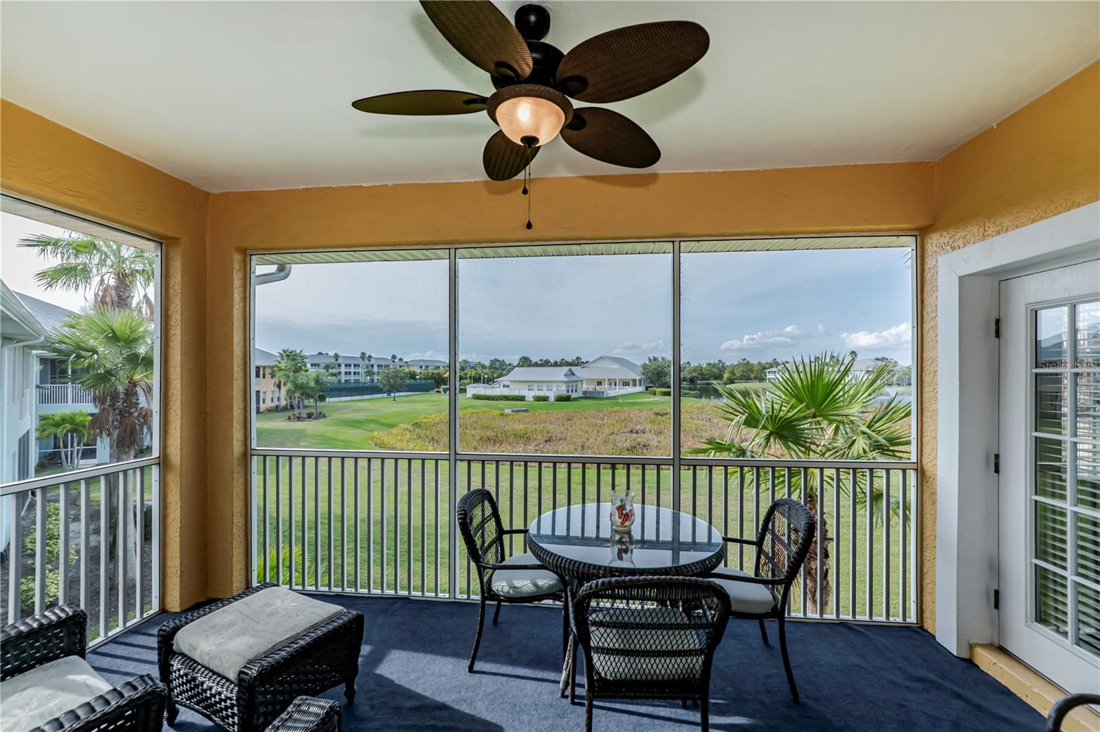 Bask in the sunlight reflecting off the waterfall lake from the seclusion of your second-floor balcony lanai in this splendid home with an open floor plan and two ensuite bedrooms. The expansive garage leads to a private elevator or an elegant spiral staircase, offering additional storage on the first floor and access to a luxurious second-floor living space. This home boasts three bedrooms, three full bathrooms, a den/office/library, and a magnificent, spacious, eat-in galley kitchen with a breakfast bar and a separate pantry. Granite countertops and ceiling fans enhance the beauty of this residence. Situated in a gated community that doubles as a nesting bird sanctuary, the property includes a well-equipped clubhouse, fitness center, heated pool, and courts for pickleball and tennis. The local wildlife contributes to the serene atmosphere. Nearby, the Deep Creek Golf Club offers a public golf course with a pub/restaurant, pro-shop, and excellent golfing opportunities. Its location near major highways makes it easy to enjoy evenings in downtown Punta Gorda, Charlotte Harbor, or venture north to Venice and Sarasota. The Community Development District fee is conveniently included in the annual tax bill. Schedule your visit to discover the allure of this carriage-style condo home today!