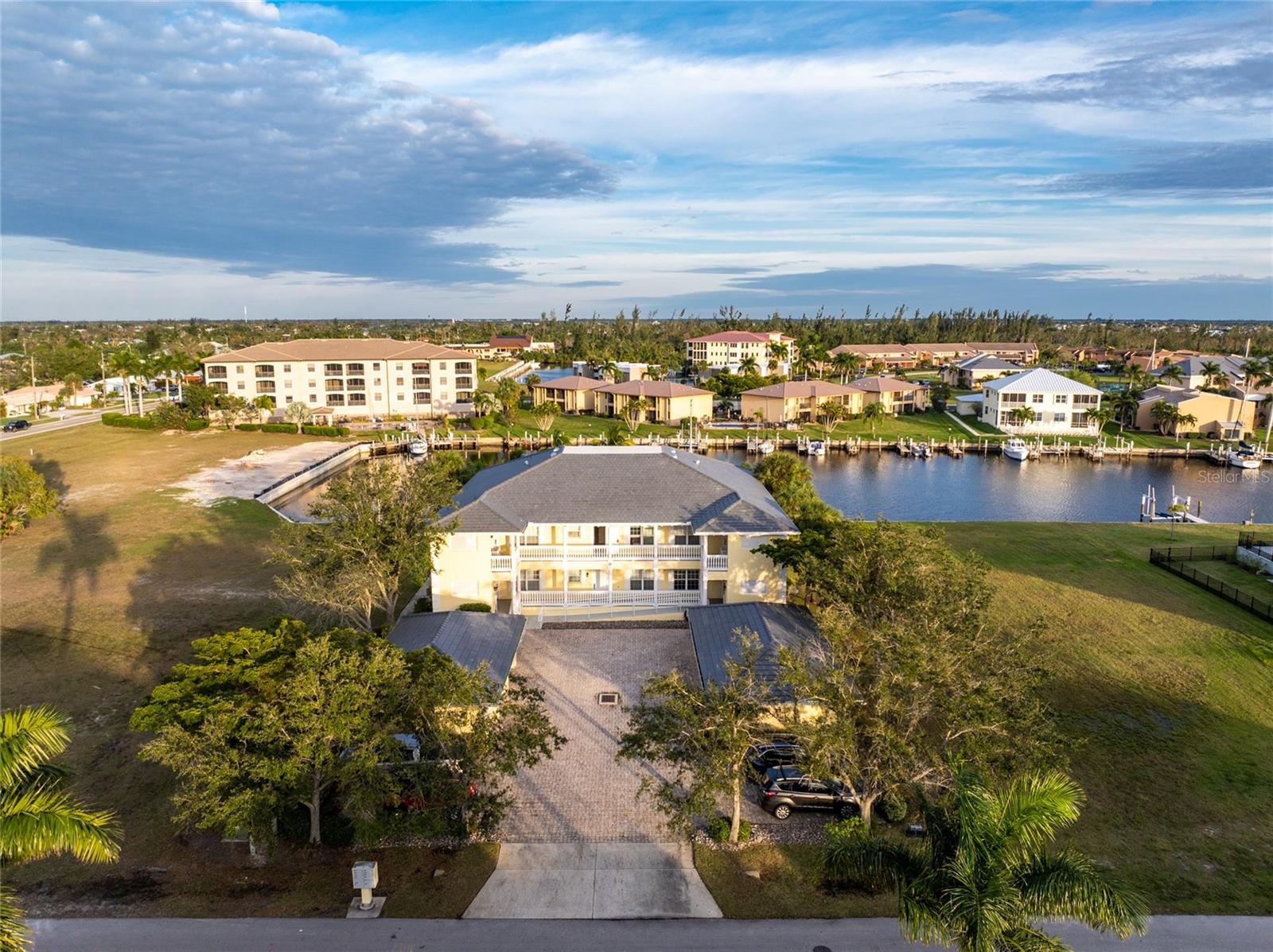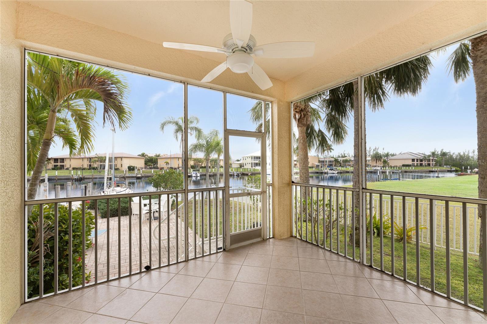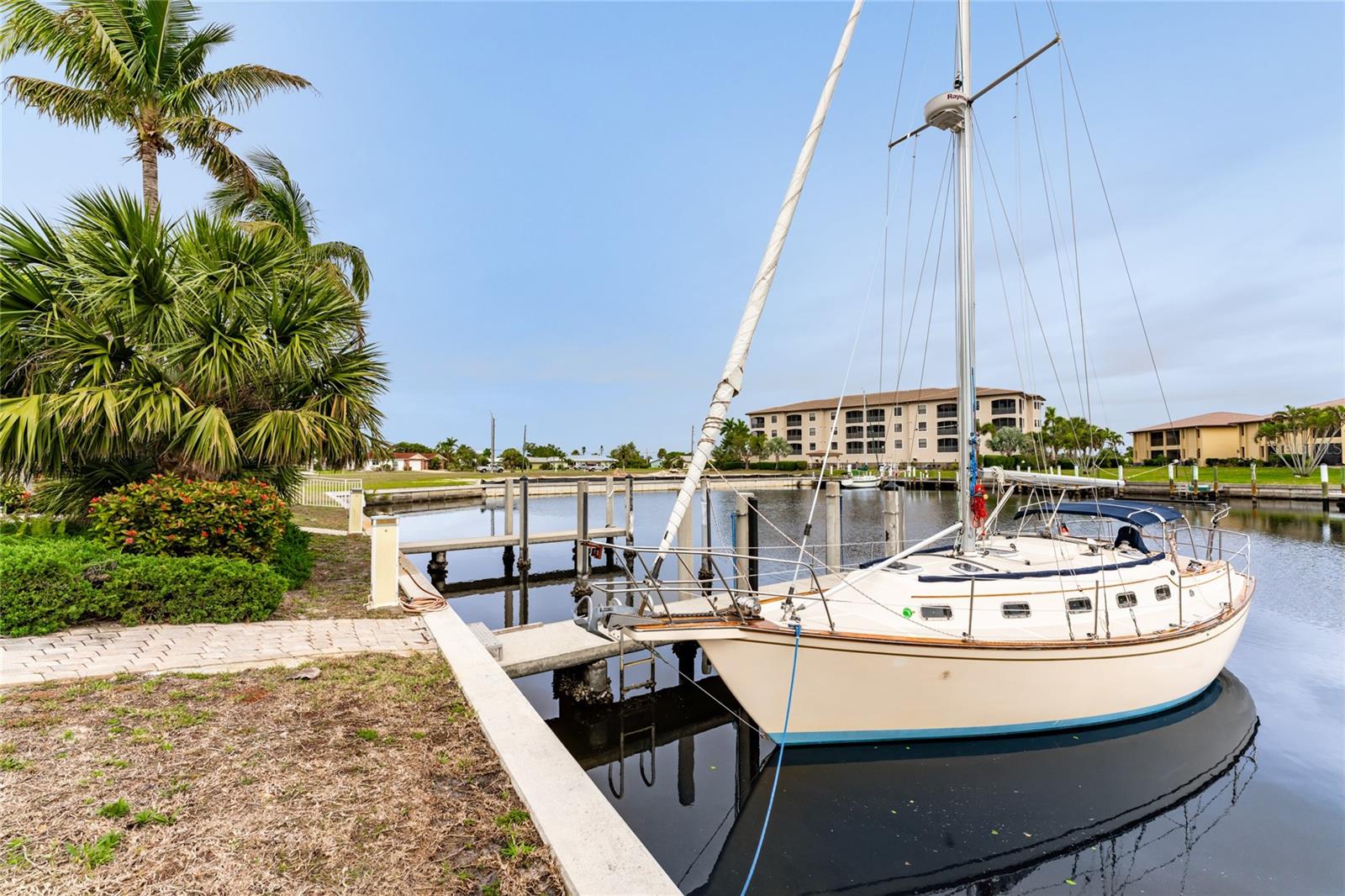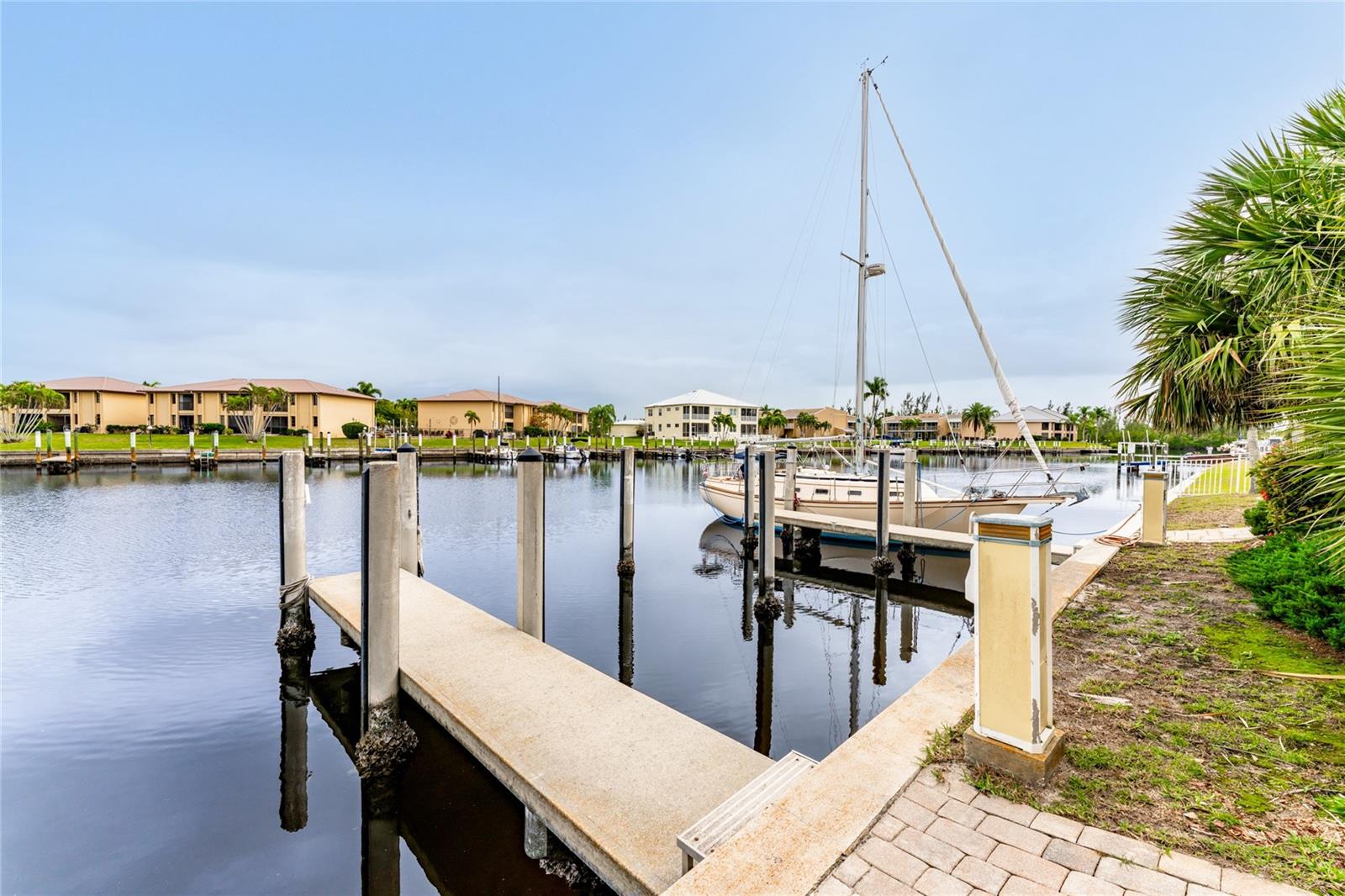 PGI Gorgeous 1,448 sq. ft. 3 bedroom, 2 bath condo on the water with deeded dock (water & electric dockside) and detached single car garage. Sailboat access out Buckley Pass to Charlotte Harbor leading to the Gulf of Mexico! Inviting Savanna Bay Condo has the open floor plan with soaring tray ceilings, crown molding, Rosette door trim and diagonally laid tile floor throughout living space. The well-appointed kitchen features raised panel wood cabinetry, granite countertops, stainless steel appliances, a breakfast bar and is open to the spacious living room and dining room. Sliders open the home up the 10 x 13 screened in lanai with tiled floor. The primary suite features hexagon double tray ceiling, two closets, wood laminate flooring and attached private bath with solid wood cabinetry, double sinks and a walk-in tiled shower with frameless glass shower door. The guest bedroom is spacious with built-in closet and a separate full guest bath that family or friends will appreciate. There is a second bonus room that could be used as a third bedroom or office/den space. The laundry area is located inside the unit and includes a stack washer and dryer, countertop with sink, closet and cabinet space. The tiled floor lanai has a desirable Eastern exposure which gives morning sun and afternoon shade for your maximum comfort along with fantastic water views and overlooks the pool/spa area. The deeded boat slip is waiting for your boat and is located outside your lanai. The complex has hurricane impact windows, covered front balcony entranceway, a new roof and no assessments. This is one not to miss! Savanna Bay Condo is located on a dead end street. Punta Gorda Isles is centrally located for easy access to the historic downtown featuring restaurants, shopping and community events; the Yacht Club; Fishermen’s Village and more; yet it is also convenient to I-75 and a short drive to gulf beaches.