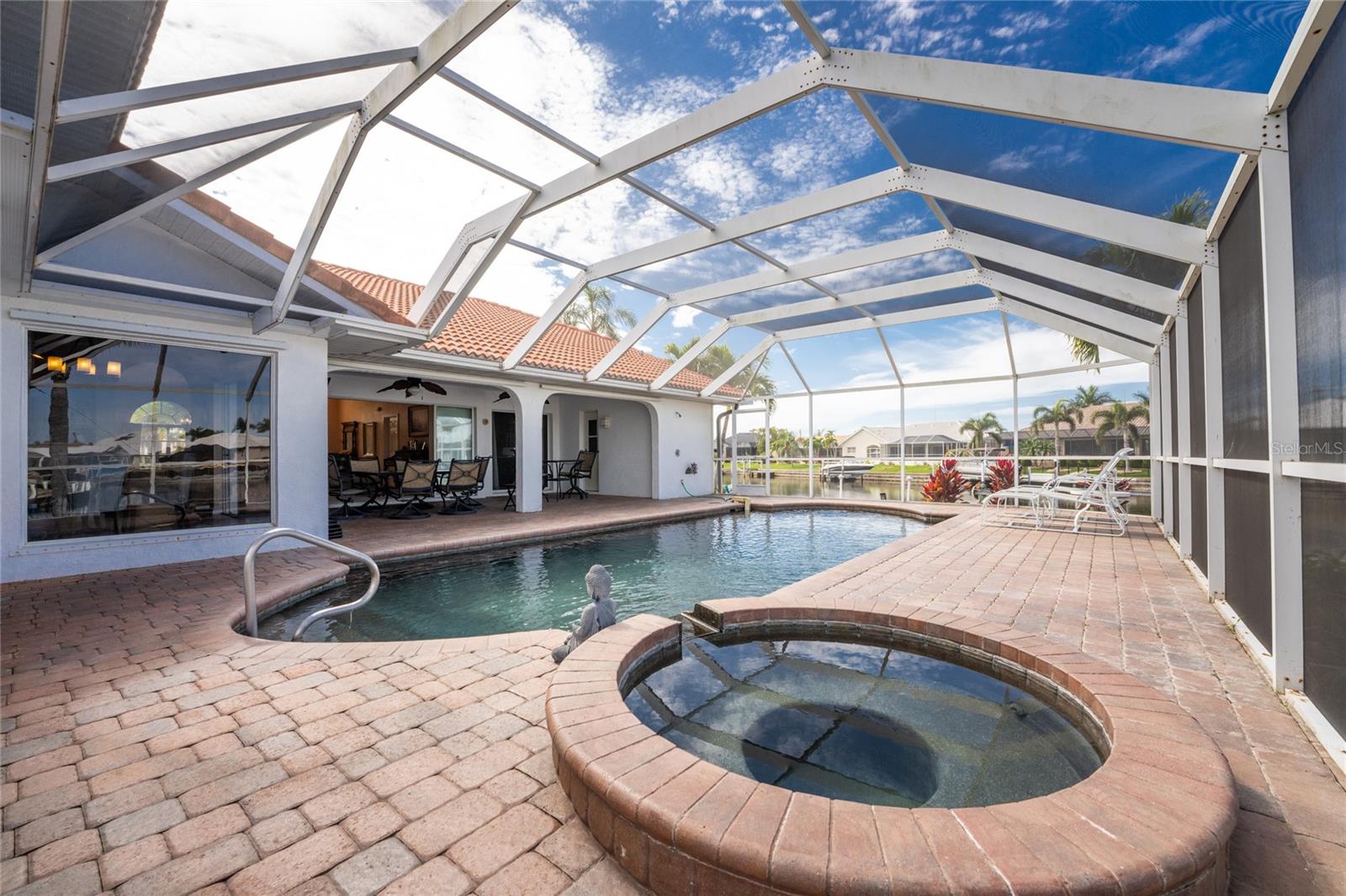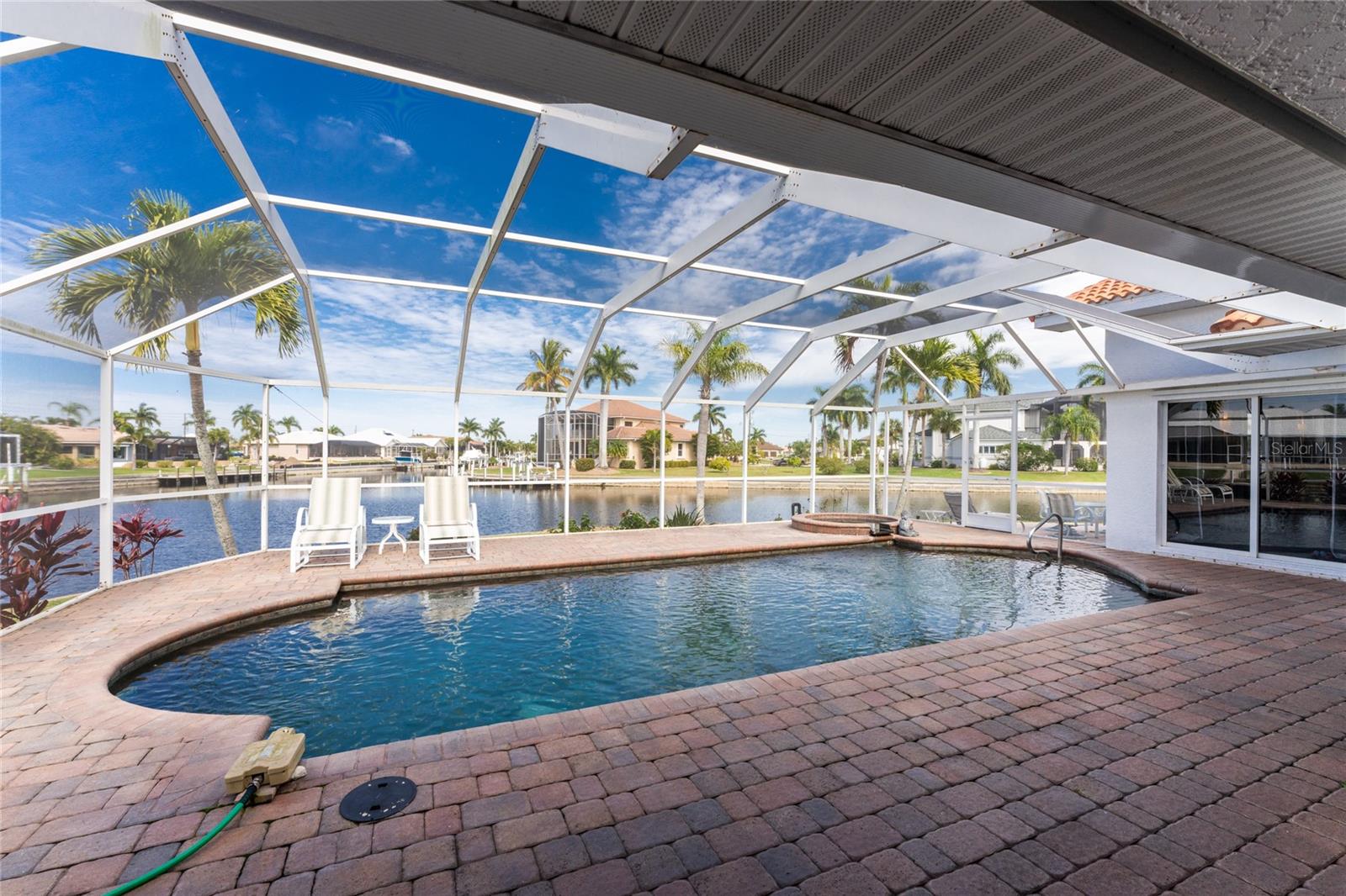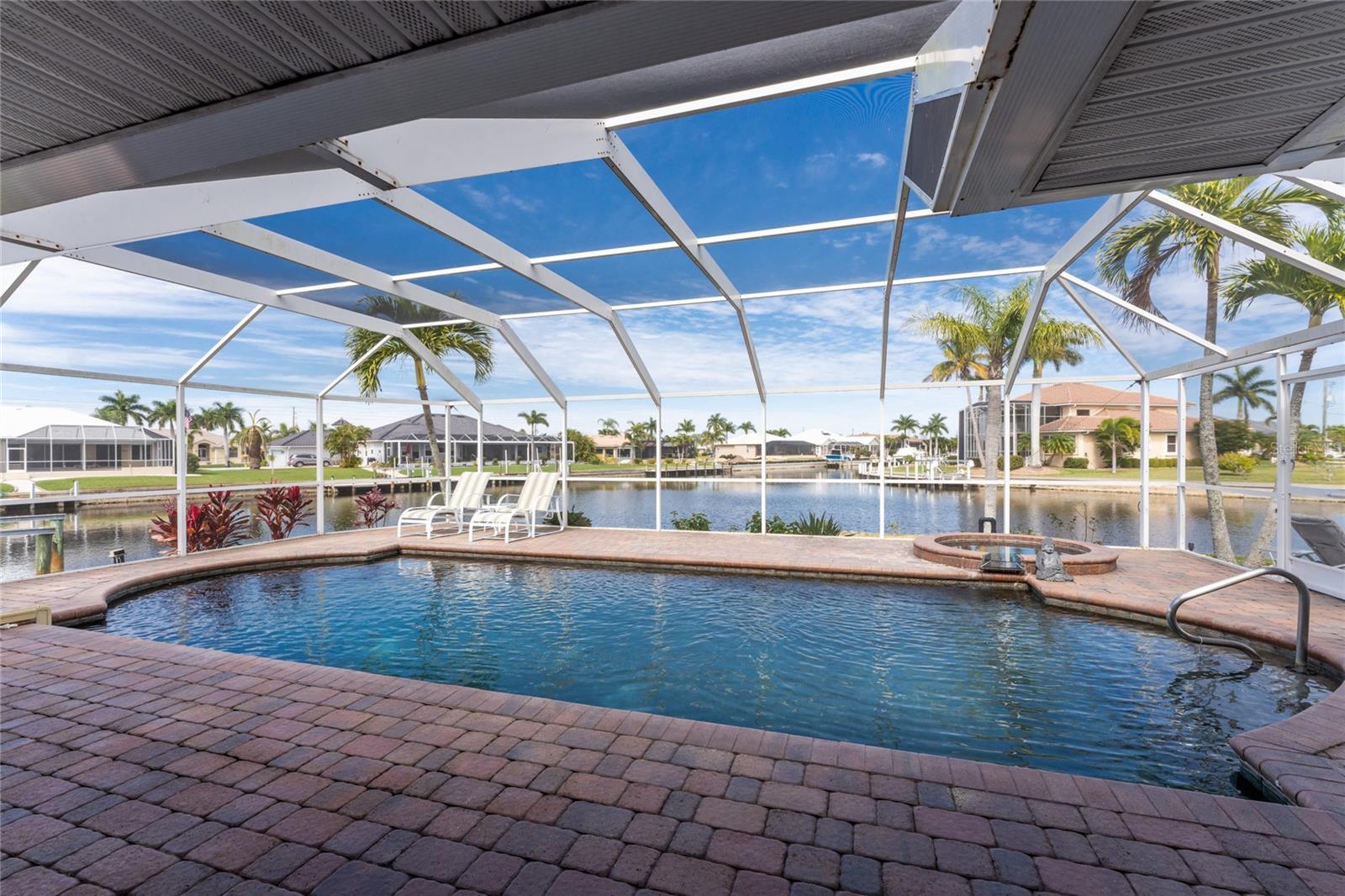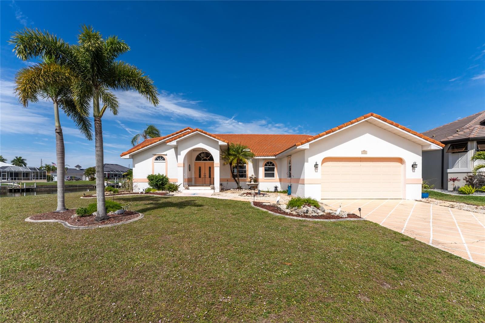 Welcome to your piece of Florida paradise! Located in the highly sought-after Burnt Store Isles community in Punta Gorda. This waterfront property is a boater's and golfer’s dream! Open water access in a matter of minutes along with the Twin Isles Country Club for the golfer. This beautifully maintained waterfront pool home is situated in a cul-de-sac on a sprawling tip lot and boasts 2,904 square feet of living space. It features the open/split floor plan providing perfect spaces for all, including living room, dining room, family room, 3 bathrooms, and 3 spacious bedrooms all connected to the beautiful outdoor area that makes this perfect for living out your Florida dream lifestyle. The moment you arrive at this home you will begin to appreciate the upgrades from the tile roof, front portico with double door entry, nicely landscaped yard with water fountain, lighting and soaring palms. The front entryway opens into the formal living/dining room that features a mix of plush carpeting and tile flooring, soaring ceilings, a wall of disappearing glass sliders with water views, and and lots of space that flows effortlessly into the kitchen. The kitchen showcases Corian countertops, an abundance of cabinet and draw space, a built-in microwave and convection oven, an electric cooktop, and trash compactor. Enjoy casual meals in the dinette space overlooking the pool or entertain family and friends in the spacious great room. Your primary suite with private pool access features two walk-in closets, carpet flooring and a fabulous en-suite' showcasing a walk-in shower, jetted soaking tub, and granite countertop vanity with dual sinks. Family and friends alike will appreciate the guest area with two guest bedrooms each with its own walk-in closets, a full bathroom and is tucked away from the living area ensuring privacy for all. The versatile office/den offers flexibility and could easily serve as a third bedroom to accommodate guests or family members. Outside is an entertaining delight with an oversized pool/lanai area showcasing a sparkling heated pool with attached hot tub, pool bath with walk-in shower, brick paver deck, covered lanai with ceiling fans, pool cage with new screens and fabulous intersecting canal water views. Take in the view and Florida breeze on the added outdoor patio area. This stunning home is situated on a corner with wide water views and has 185’ of cement seawall, water/electric, and 14x8 concrete boat dock offering endless opportunities for boating and water activities. The home also features an oversized 2-car garage, an inside laundry room with storage space and utility sink, hurricane shutters, central vac, irrigation, 2 A/C units (one just replaced with transferable warranty) and 2 water heaters. Close to I-75/US41 and nearby to Fishermen's Village, downtown Punta Gorda shops & restaurants, great boating, fishing, sailing, and more. Home is completely spotless and waiting for you. Come enjoy the Florida lifestyle in this impressive home.