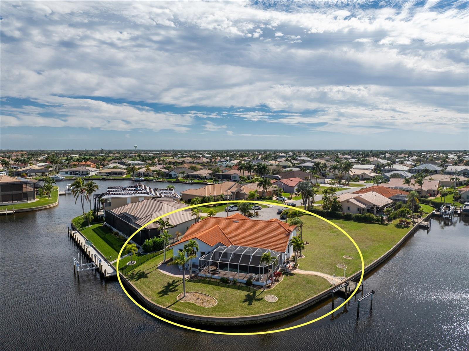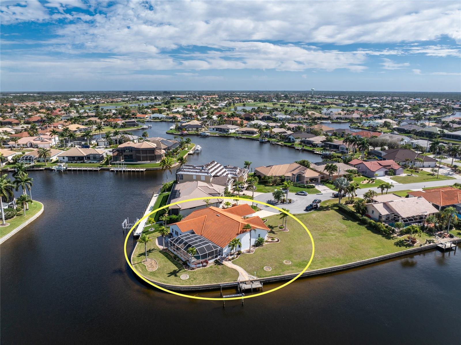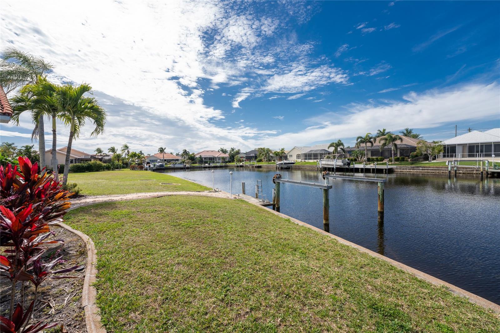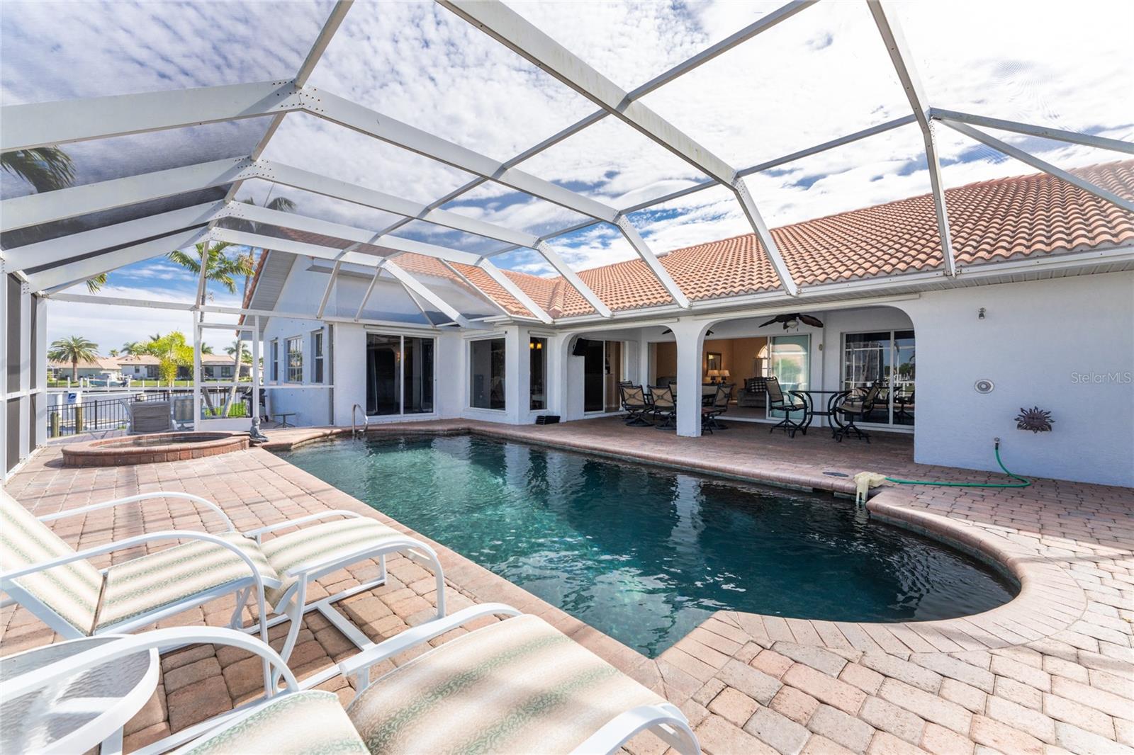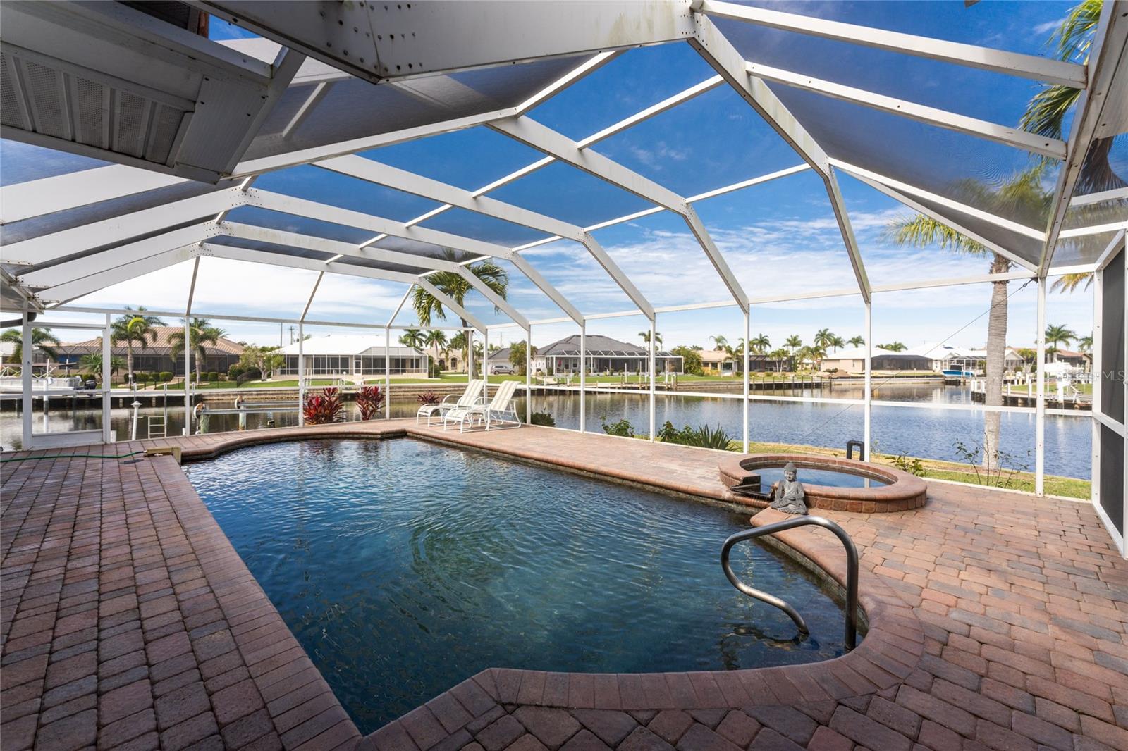 Welcome to your piece of Florida paradise! Located in the highly sought-after Burnt Store Isles community in Punta Gorda. This waterfront property is a boater's and golfer’s dream! Open water access in a matter of minutes along with the Twin Isles Country Club for the golfer. This beautifully maintained waterfront pool home is situated in a cul-de-sac on a sprawling tip lot and boasts 2,904 square feet of living space. It features the open/split floor plan providing perfect spaces for all, including living room, dining room, family room, 3 bathrooms, and 3 spacious bedrooms all connected to the beautiful outdoor area that makes this perfect for living out your Florida dream lifestyle. The moment you arrive at this home you will begin to appreciate the upgrades from the tile roof, front portico with double door entry, nicely landscaped yard with water fountain, lighting and soaring palms. The front entryway opens into the formal living/dining room that features a mix of plush carpeting and tile flooring, soaring ceilings, a wall of disappearing glass sliders with water views, and and lots of space that flows effortlessly into the kitchen. The kitchen showcases Corian countertops, an abundance of cabinet and draw space, a built-in microwave and convection oven, an electric cooktop, and trash compactor. Enjoy casual meals in the dinette space overlooking the pool or entertain family and friends in the spacious great room. Your primary suite with private pool access features two walk-in closets, carpet flooring and a fabulous en-suite' showcasing a walk-in shower, jetted soaking tub, and granite countertop vanity with dual sinks. Family and friends alike will appreciate the guest area with two guest bedrooms each with its own walk-in closets, a full bathroom and is tucked away from the living area ensuring privacy for all. The versatile office/den offers flexibility and could easily serve as a third bedroom to accommodate guests or family members. Outside is an entertaining delight with an oversized pool/lanai area showcasing a sparkling heated pool with attached hot tub, pool bath with walk-in shower, brick paver deck, covered lanai with ceiling fans, pool cage with new screens and fabulous intersecting canal water views. Take in the view and Florida breeze on the added outdoor patio area. This stunning home is situated on a corner with wide water views and has 185’ of cement seawall, water/electric, and 14x8 concrete boat dock offering endless opportunities for boating and water activities. The home also features an oversized 2-car garage, an inside laundry room with storage space and utility sink, hurricane shutters, central vac, irrigation, 2 A/C units (one just replaced with transferable warranty) and 2 water heaters. Close to I-75/US41 and nearby to Fishermen's Village, downtown Punta Gorda shops & restaurants, great boating, fishing, sailing, and more. Home is completely spotless and waiting for you. Come enjoy the Florida lifestyle in this impressive home.