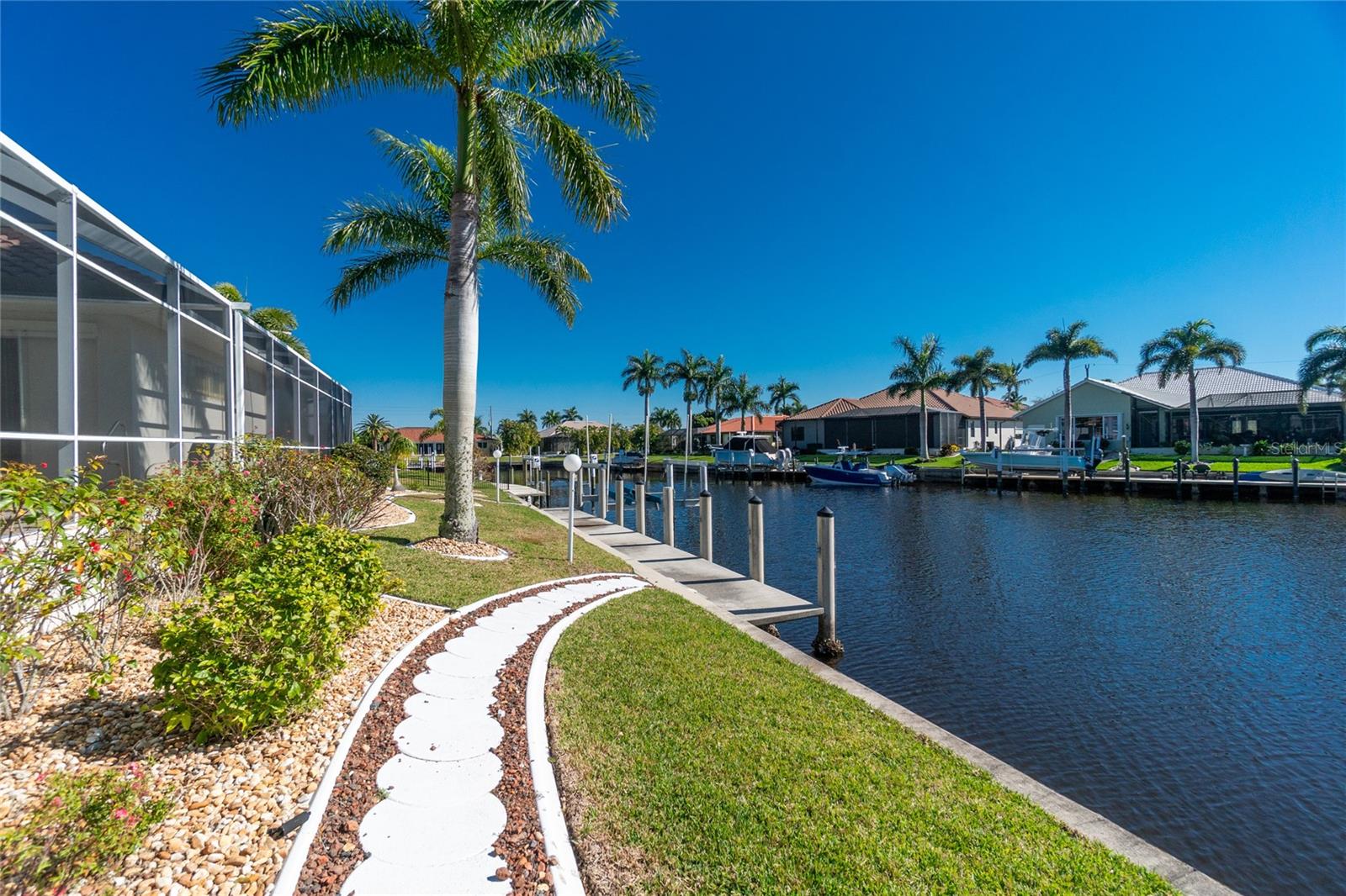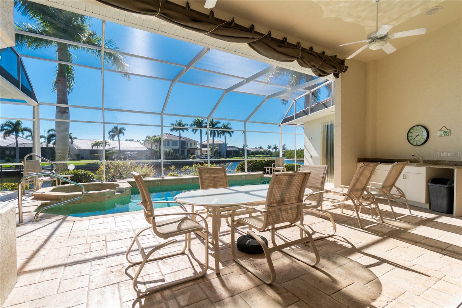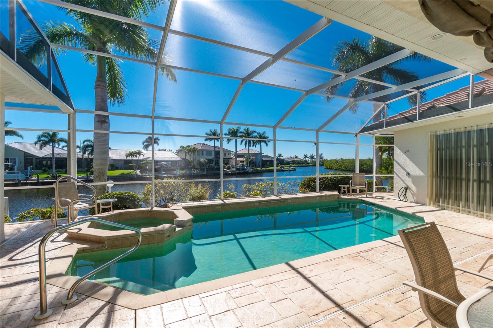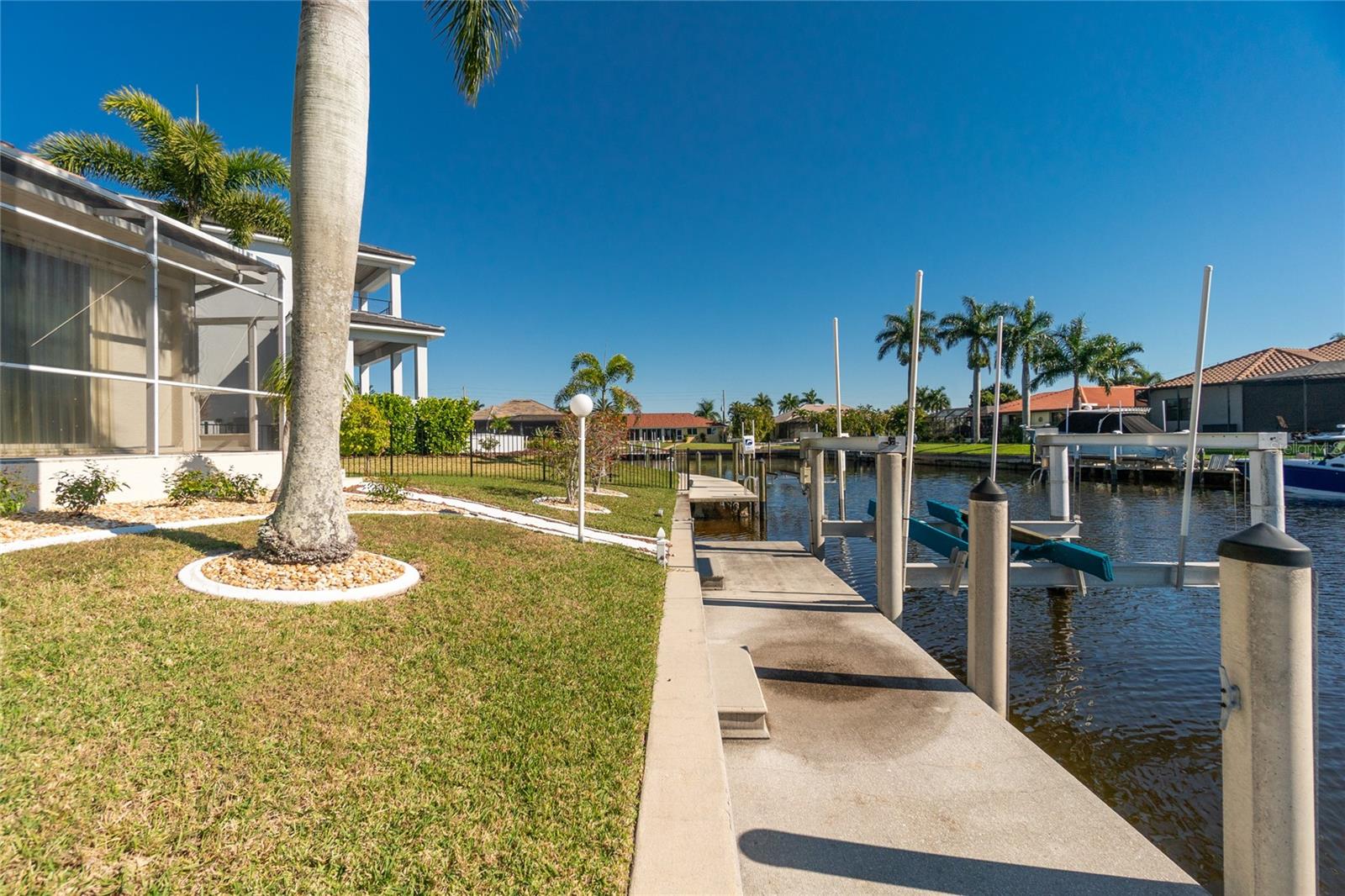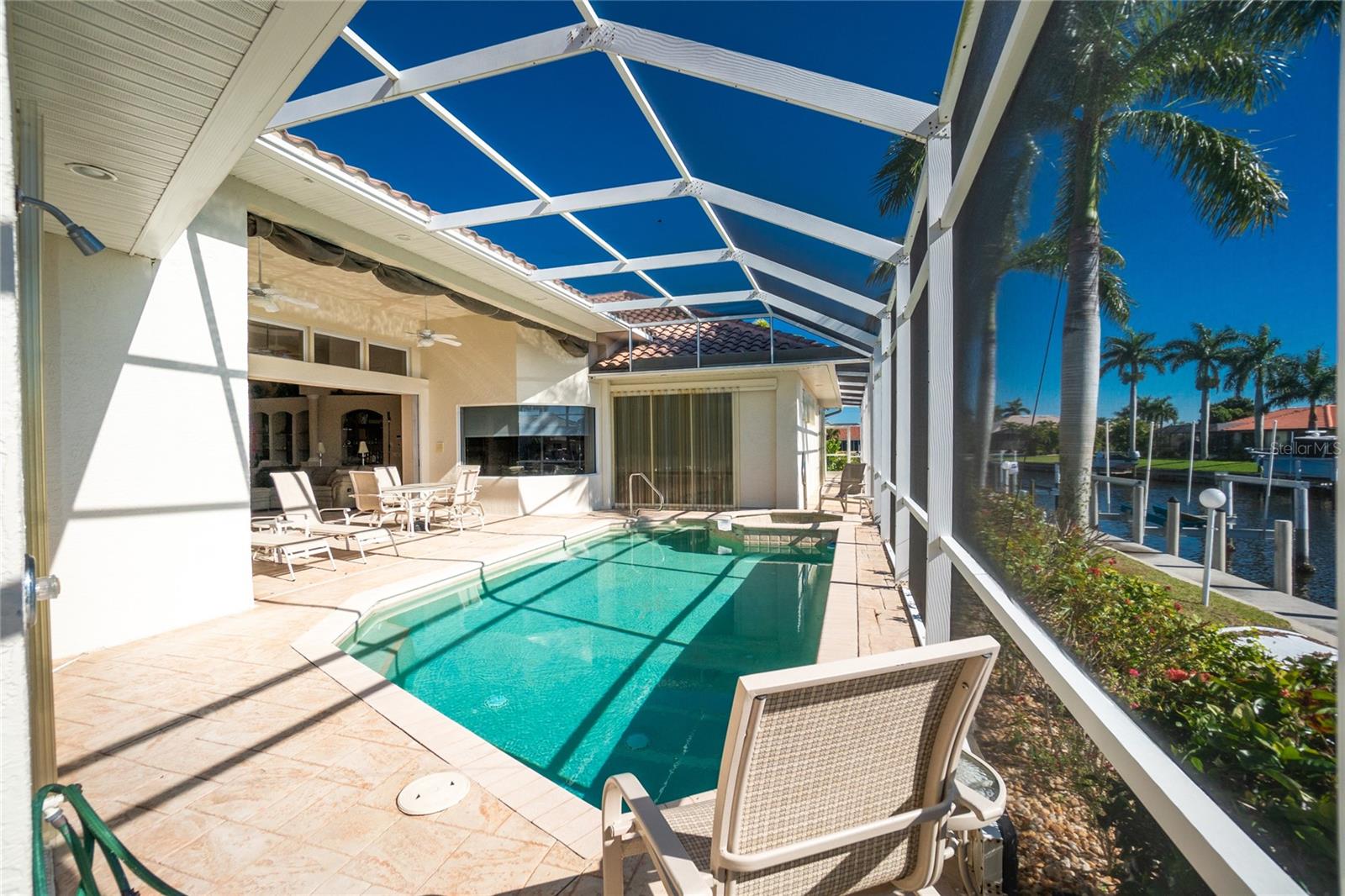Stunning WATERFRONT home on a KEY LOT in desirable deed restricted BURNT STORE ISLES. JUST MINUTES TO THE HARBOR! This light and bright home features beautiful design features throughout and offers an open and split bedroom floor plan. There are 3 Bedrooms, 2.5 Bathrooms, attached 2 Car Garage, Great Room, Family Room, separate formal Dining Room, Office, well appointed Kitchen and Inside Laundry Room. The Dining Room has built ins, additional space above the built -ins for your decorative items, large window with transom window, plantation shutters and wet bar. The spacious Great Room has built ins for your books or collectibles, lanai access and electric fireplace. The Family Room also has built ins and lanai access. Glass french doors lead to a large Office. The Kitchen features wood cabinets, granite counters, breakfast bar, closet pantry and island with additional storage and wine rack. There is also a dining area in the Kitchen with a great pool and water view through aquarium glass. The Inside Laundry has a washer, dryer, sink and great storage space with numerous cabinets. The Master Bedroom suite is your private oasis with lanai access, TWO walk in closets and private bathroom with jetted garden tub, walk in shower and dual sinks. There are two additional generous sized bedrooms with good closet space and the guest bathroom has a walk in shower. Your living space extends via pocket sliders to the screened lanai and pool area with large covered area, storage closet, summer kitchen with sink, Jenn Air grill and cabinets, heated inground pool, inground spa connected to the pool, outdoor shower and half bath. Fabulous water views! Continue to the waterfront with 140 FOOT concrete seawall (maintained by the city of Punta Gorda), 60 FOOT concrete dock and 18,000 lb boat lift. QUICK SAILBOAT ACCESS - just minutes to Charlotte Harbor and on to the Gulf of Mexico. Other features include: hurricane shutters, manabloc plumbing, double door entry with transom windows, plantation shutters and tile flooring throughout the home, tray ceilings with lighting, neutral colors throughout, rain gutters, paver driveway and walkway, NEW barrel tile ROOF 2023. This home is only 5 minutes from Golf and ten minutes from historic downtown Punta Gorda shopping, dining, medical care, waterfront parks, walking and biking paths, art galleries, boat ramps, fishing piers, weekend farmers markets, Fishermen's Village, events and more! This home is perfect for entertaining and enjoying the Florida lifestyle!