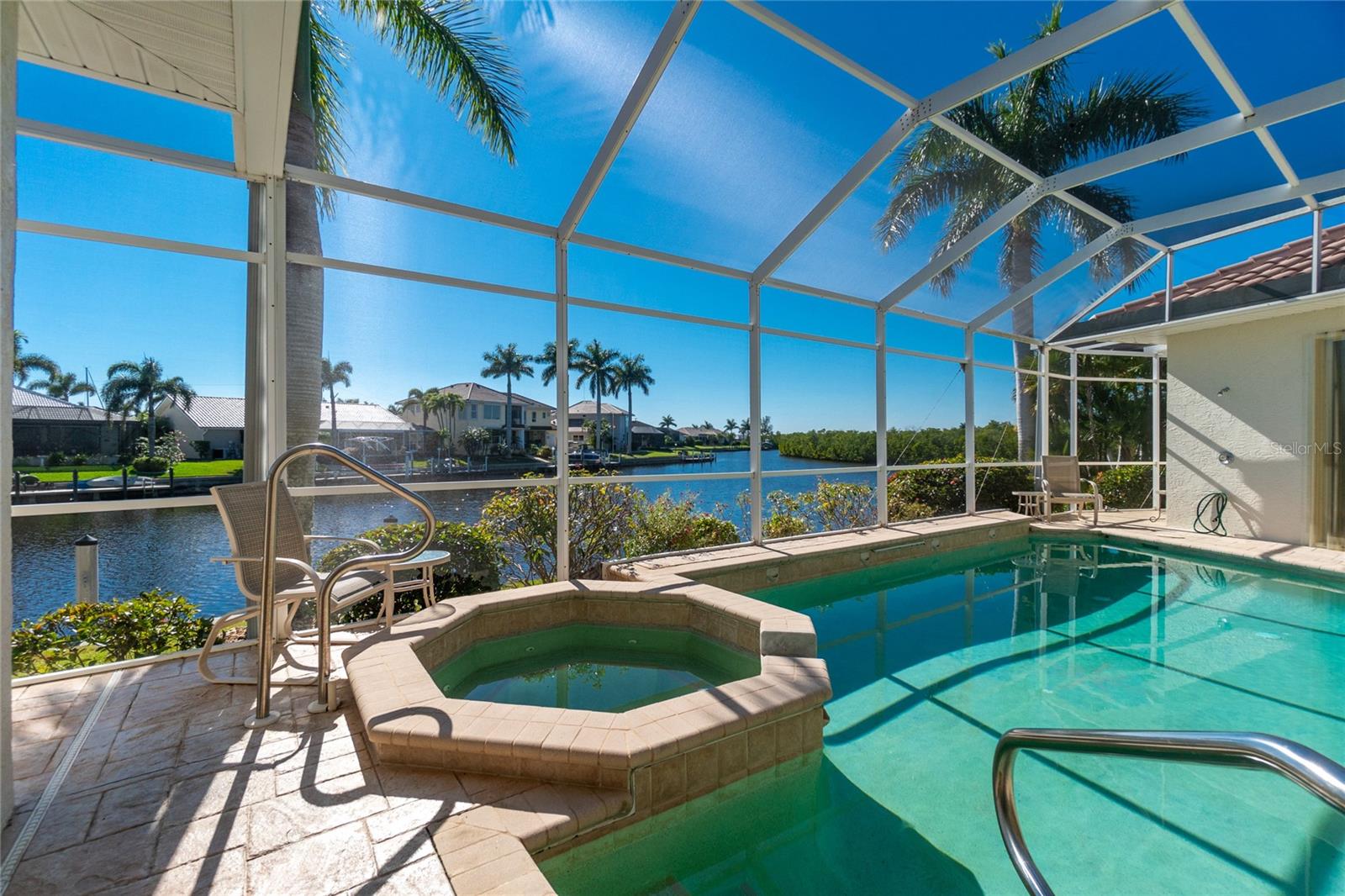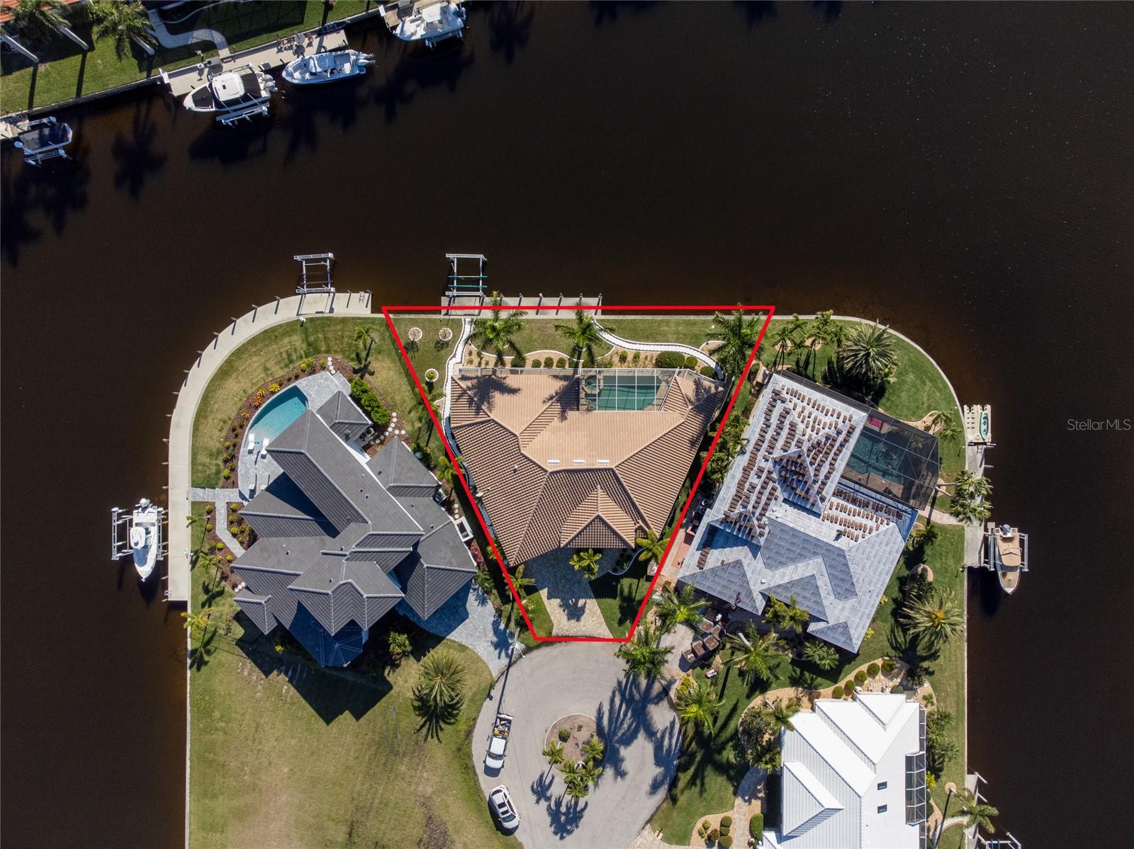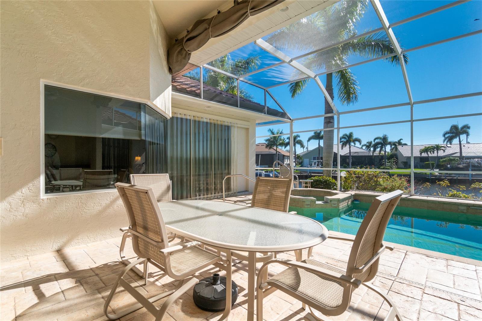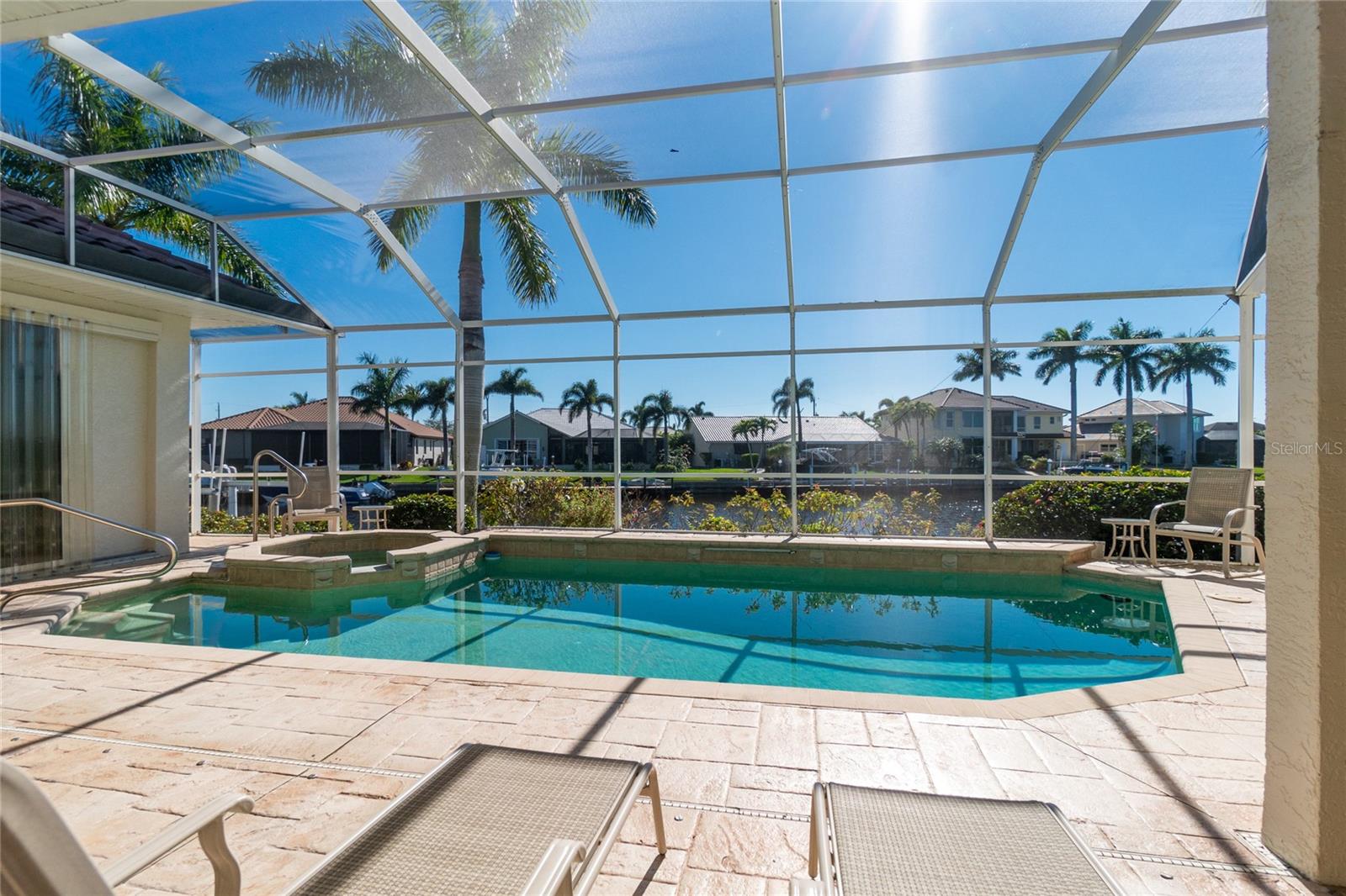 Stunning WATERFRONT home on a KEY LOT in desirable deed restricted BURNT STORE ISLES. JUST MINUTES TO THE HARBOR! This light and bright home features beautiful design features throughout and offers an open and split bedroom floor plan. There are 3 Bedrooms, 2.5 Bathrooms, attached 2 Car Garage, Great Room, Family Room, separate formal Dining Room, Office, well appointed Kitchen and Inside Laundry Room. The Dining Room has built ins, additional space above the built -ins for your decorative items, large window with transom window, plantation shutters and wet bar. The spacious Great Room has built ins for your books or collectibles, lanai access and electric fireplace. The Family Room also has built ins and lanai access. Glass french doors lead to a large Office. The Kitchen features wood cabinets, granite counters, breakfast bar, closet pantry and island with additional storage and wine rack. There is also a dining area in the Kitchen with a great pool and water view through aquarium glass. The Inside Laundry has a washer, dryer, sink and great storage space with numerous cabinets. The Master Bedroom suite is your private oasis with lanai access, TWO walk in closets and private bathroom with jetted garden tub, walk in shower and dual sinks. There are two additional generous sized bedrooms with good closet space and the guest bathroom has a walk in shower. Your living space extends via pocket sliders to the screened lanai and pool area with large covered area, storage closet, summer kitchen with sink, Jenn Air grill and cabinets, heated inground pool, inground spa connected to the pool, outdoor shower and half bath. Fabulous water views! Continue to the waterfront with 140 FOOT concrete seawall (maintained by the city of Punta Gorda), 60 FOOT concrete dock and 18,000 lb boat lift. QUICK SAILBOAT ACCESS - just minutes to Charlotte Harbor and on to the Gulf of Mexico. Other features include: hurricane shutters, manabloc plumbing, double door entry with transom windows, plantation shutters and tile flooring throughout the home, tray ceilings with lighting, neutral colors throughout, rain gutters, paver driveway and walkway, NEW barrel tile ROOF 2023. This home is only 5 minutes from Golf and ten minutes from historic downtown Punta Gorda shopping, dining, medical care, waterfront parks, walking and biking paths, art galleries, boat ramps, fishing piers, weekend farmers markets, Fishermen's Village, events and more! This home is perfect for entertaining and enjoying the Florida lifestyle!