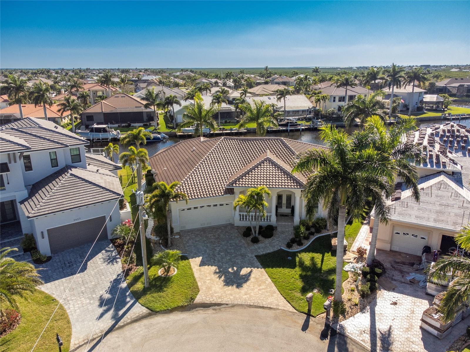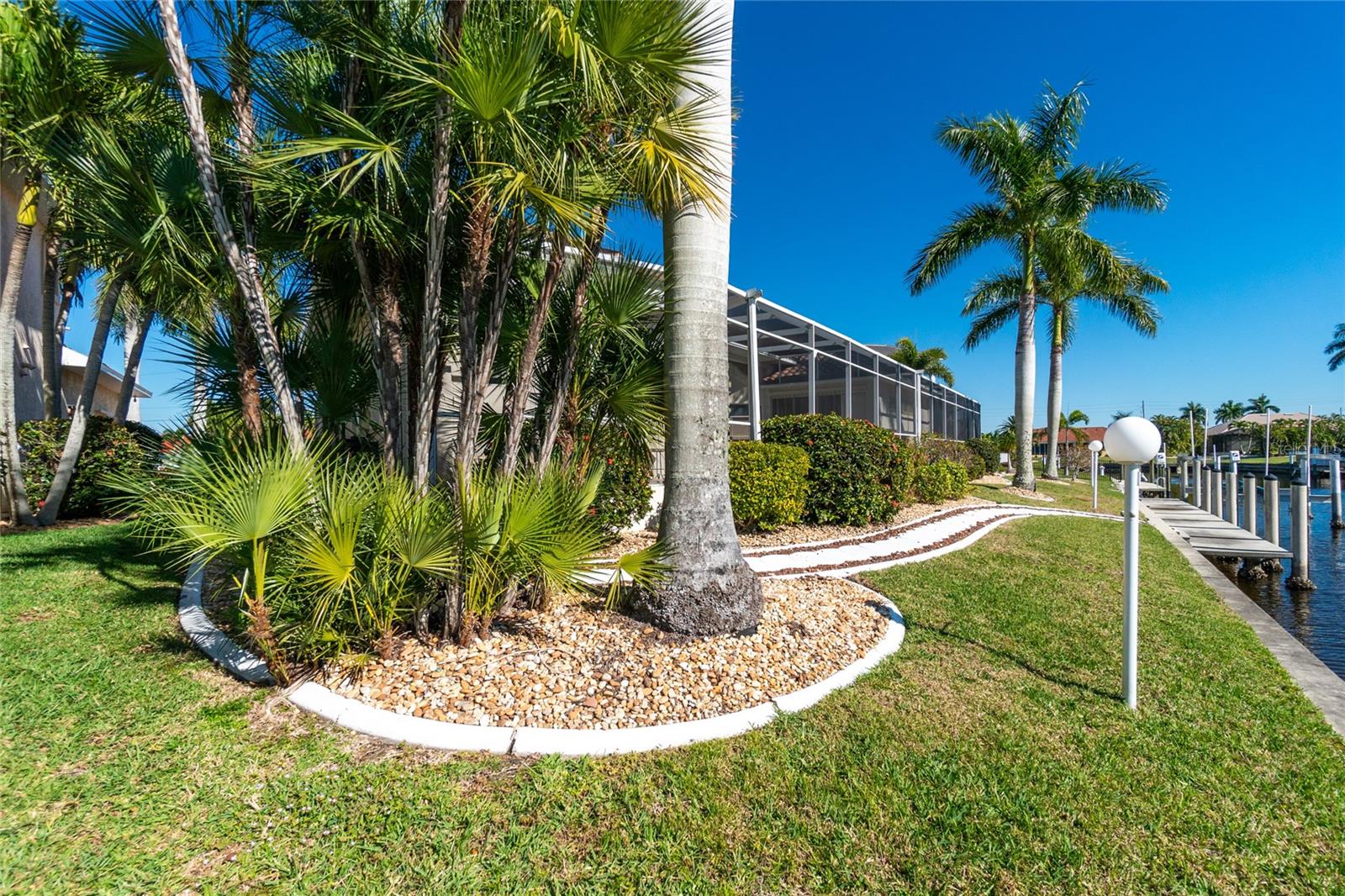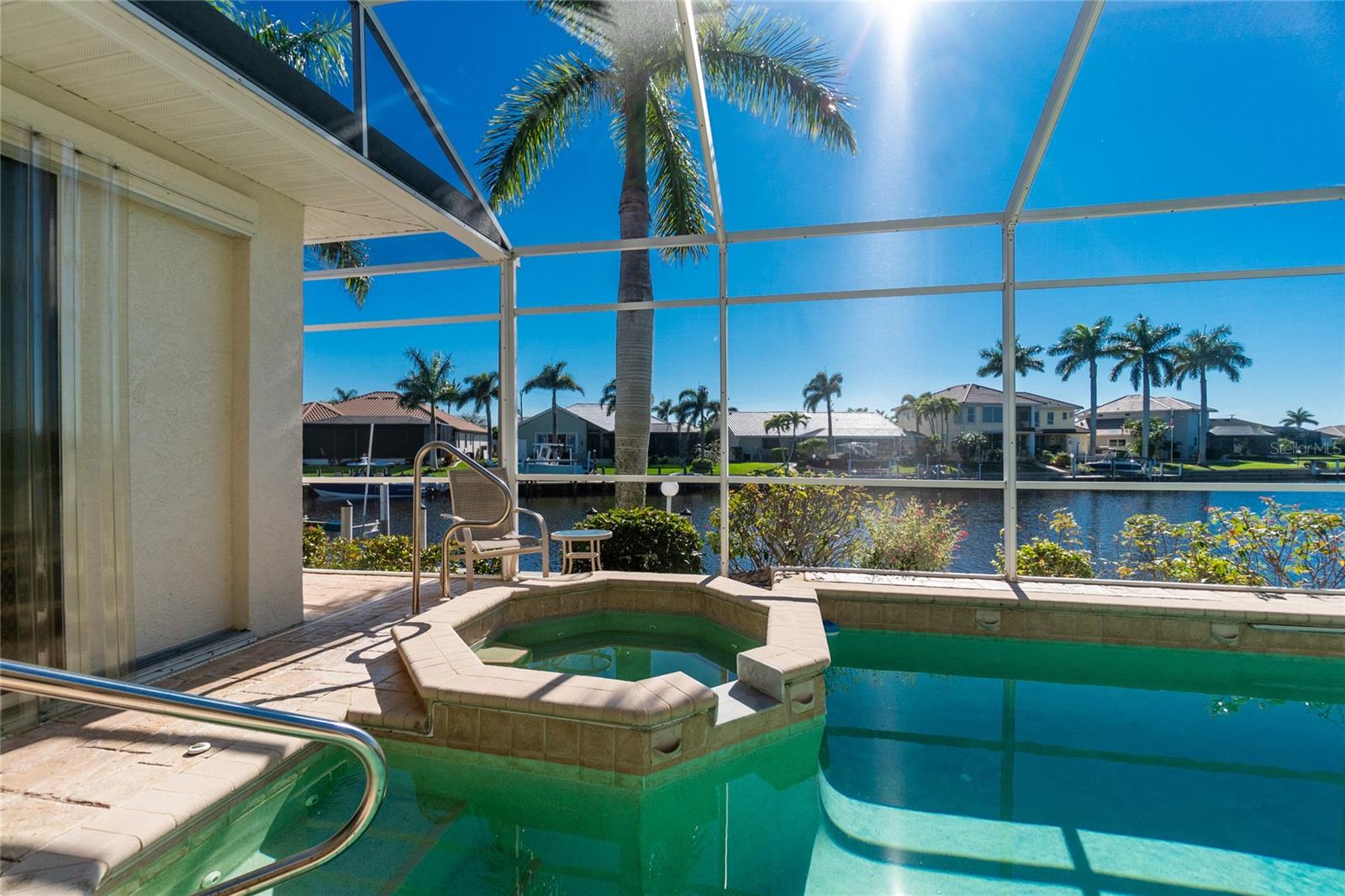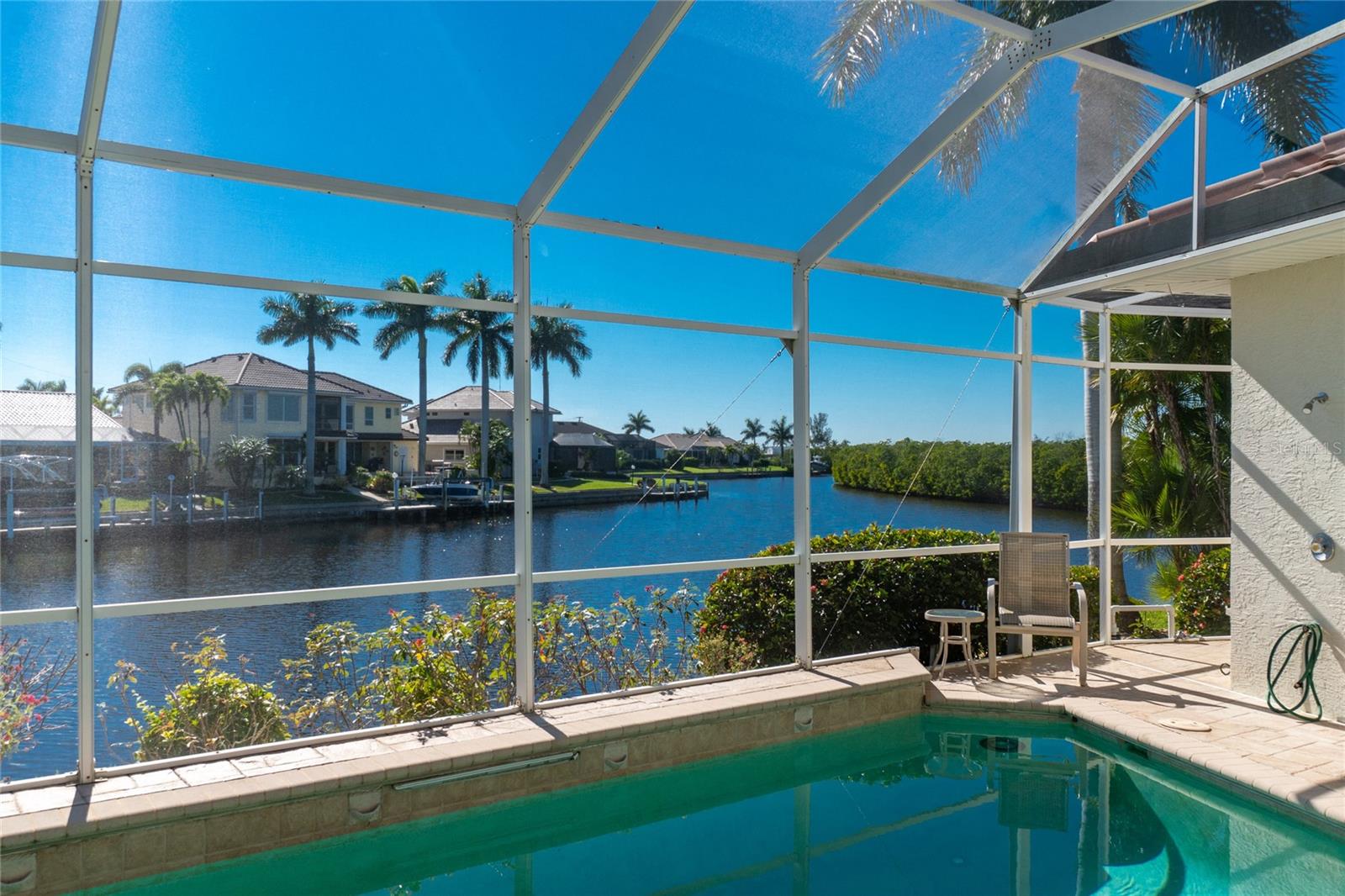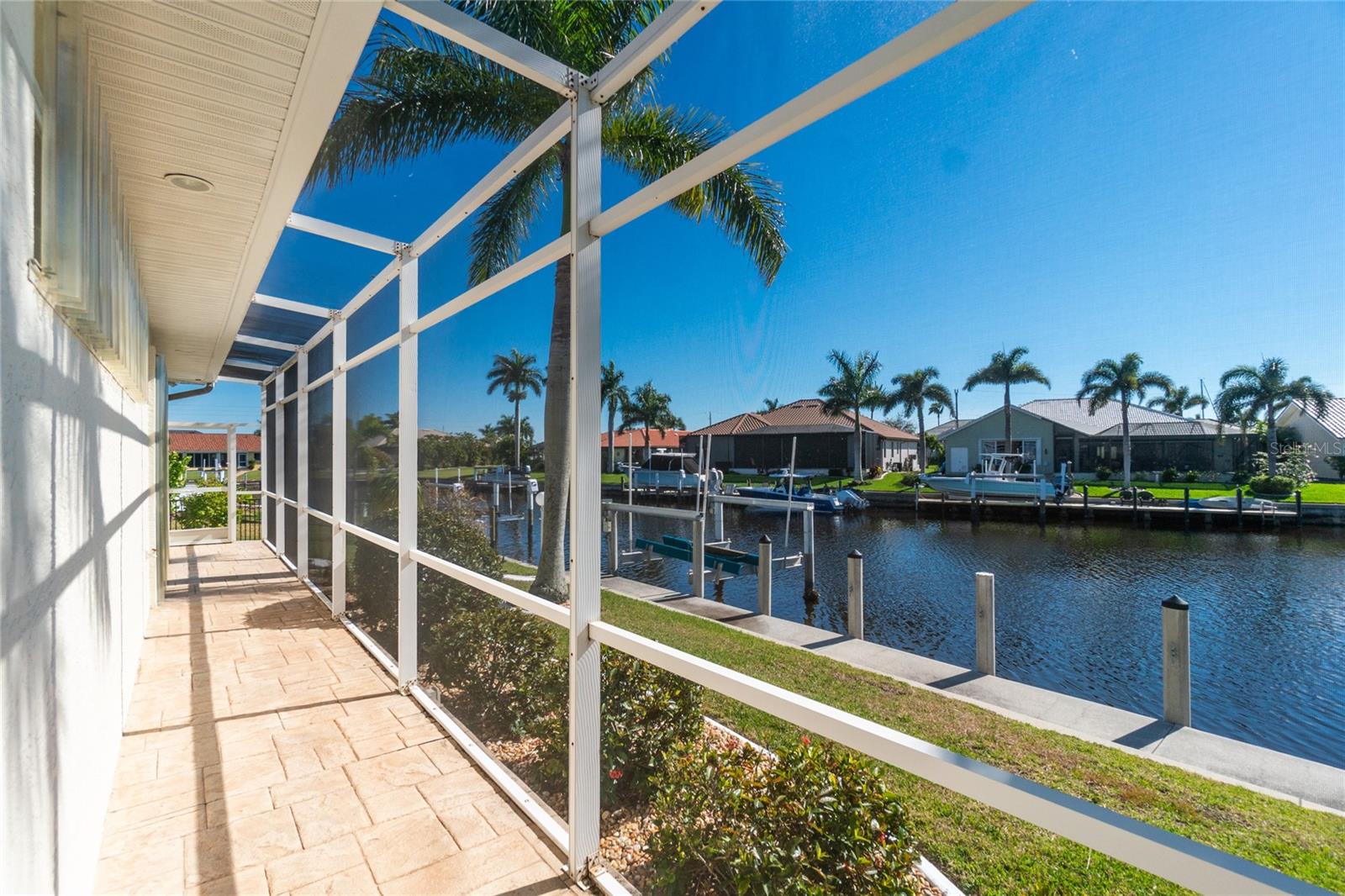Stunning WATERFRONT home on a KEY LOT in desirable deed restricted BURNT STORE ISLES. JUST MINUTES TO THE HARBOR! This light and bright home features beautiful design features throughout and offers an open and split bedroom floor plan. There are 3 Bedrooms, 2.5 Bathrooms, attached 2 Car Garage, Great Room, Family Room, separate formal Dining Room, Office, well appointed Kitchen and Inside Laundry Room. The Dining Room has built ins, additional space above the built -ins for your decorative items, large window with transom window, plantation shutters and wet bar. The spacious Great Room has built ins for your books or collectibles, lanai access and electric fireplace. The Family Room also has built ins and lanai access. Glass french doors lead to a large Office. The Kitchen features wood cabinets, granite counters, breakfast bar, closet pantry and island with additional storage and wine rack. There is also a dining area in the Kitchen with a great pool and water view through aquarium glass. The Inside Laundry has a washer, dryer, sink and great storage space with numerous cabinets. The Master Bedroom suite is your private oasis with lanai access, TWO walk in closets and private bathroom with jetted garden tub, walk in shower and dual sinks. There are two additional generous sized bedrooms with good closet space and the guest bathroom has a walk in shower. Your living space extends via pocket sliders to the screened lanai and pool area with large covered area, storage closet, summer kitchen with sink, Jenn Air grill and cabinets, heated inground pool, inground spa connected to the pool, outdoor shower and half bath. Fabulous water views! Continue to the waterfront with 140 FOOT concrete seawall (maintained by the city of Punta Gorda), 60 FOOT concrete dock and 18,000 lb boat lift. QUICK SAILBOAT ACCESS - just minutes to Charlotte Harbor and on to the Gulf of Mexico. Other features include: hurricane shutters, manabloc plumbing, double door entry with transom windows, plantation shutters and tile flooring throughout the home, tray ceilings with lighting, neutral colors throughout, rain gutters, paver driveway and walkway, NEW barrel tile ROOF 2023. This home is only 5 minutes from Golf and ten minutes from historic downtown Punta Gorda shopping, dining, medical care, waterfront parks, walking and biking paths, art galleries, boat ramps, fishing piers, weekend farmers markets, Fishermen's Village, events and more! This home is perfect for entertaining and enjoying the Florida lifestyle!