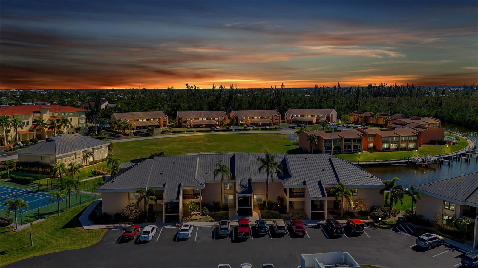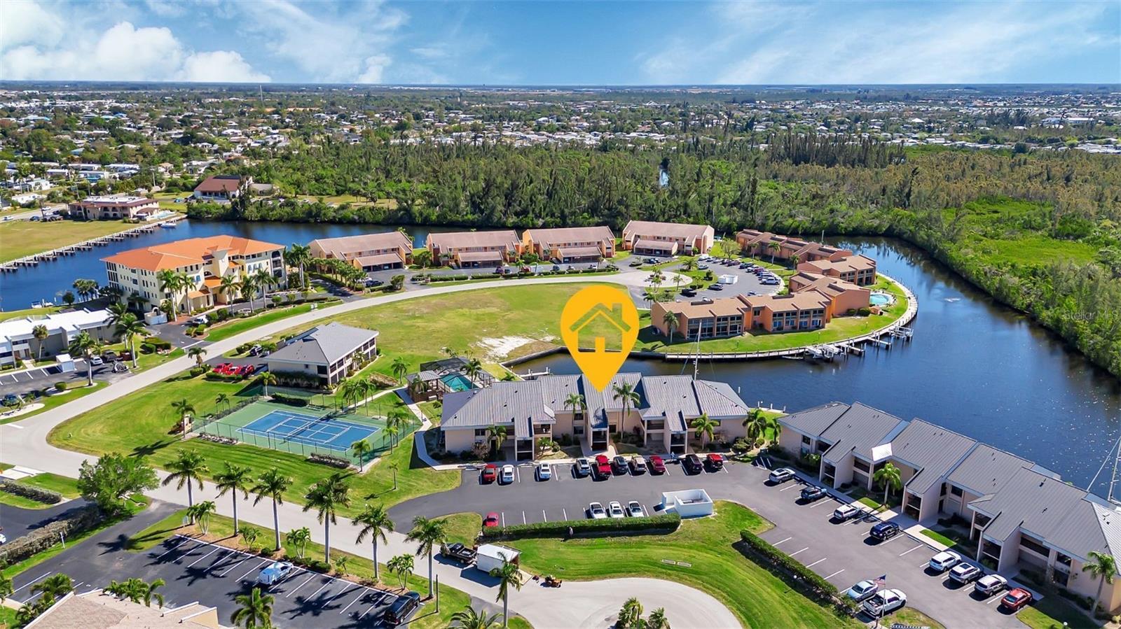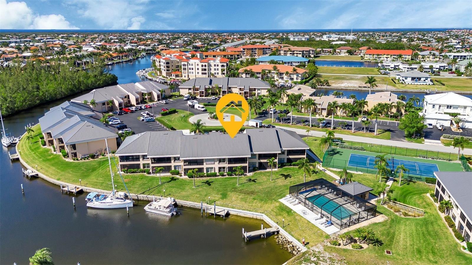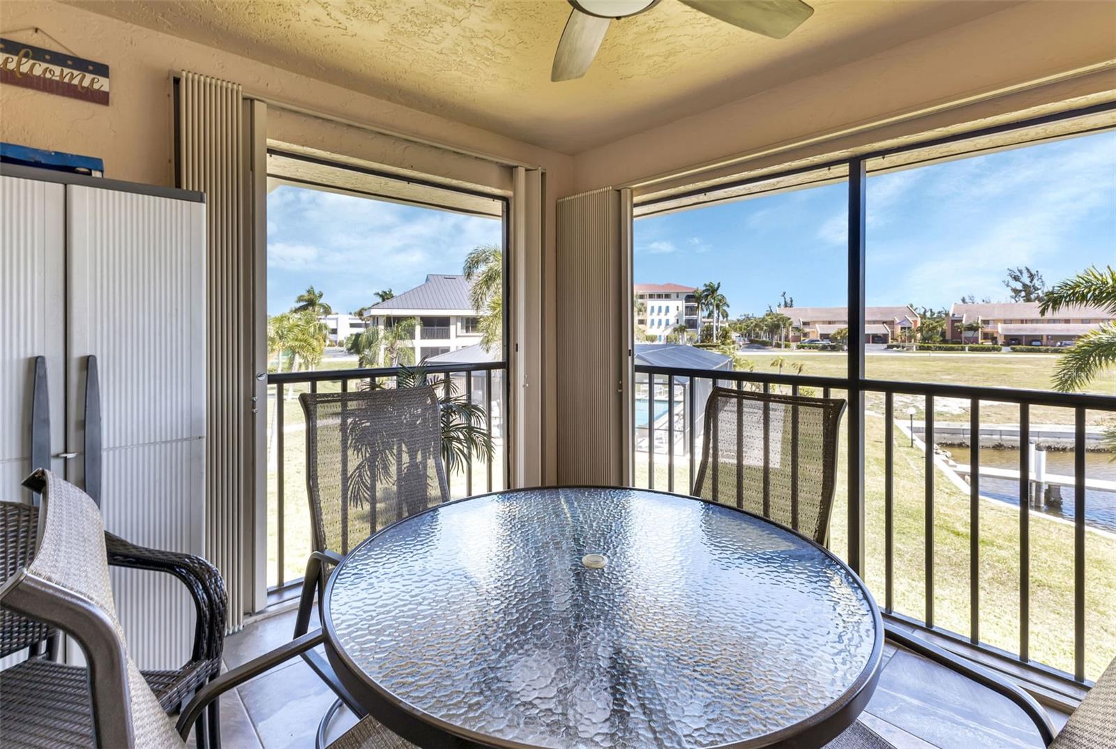 Welcome to your beautifully UPDATED, WATERFRONT condo in the popular Venetian Isles Community with COMPETITIVE & STABLE HOA FEES! THIS CONDO HAS HURRICANE PROTECTION FOR YOUR PEACE OF MIND & A BRAND NEW METAL ROOF! This second floor condo features a gorgeous kitchen with QUARTZ COUNTERTOPS, new shaker style cabinets, STAINLESS APPLIANCES (including a convection oven), PENDANT LIGHTING and plenty of cabinet space including additional cabinets on the island! There is ceramic tile & Luxury Vinyl throughout the home (no carpet)! Enjoy fabulous views of the waterfront and pool from your private, screened lanai! Open concept living with your living room connected to the dining area and kitchen with water views from living room window! The Primary Bedroom has a HUGE WALK IN CLOSET with ensuite bathroom inducing gorgeous GRANITE COUNTER TOPS on the vanity and TILED WALK IN SHOWER! There is also access to the lanai from the Master Suite! Full size guest bedroom with additional closet space and separate guest bathroom rounds out the rest of this perfect condo! LIGHTING AND FANS updated throughout. GREAT LOCATION WITHIN THE COMMUNITY JUST STEPS AWAY FROM THE POOL AND PICKLEBALL/TENNIS COURTS! The condos have HEATED POOL WITH POOL CAGE, ASSIGNABLE DOCK SPACES and are near the heart of Punta Gorda featuring the downtown area with weekly farmer's markets, festivals, waterfront dining including restaurants at Fisherman's Village Waterfront Mall! Also near all amenities such as Publix Grocery store, banks, medical facilities and so much more! Ask for the full feature sheet and call to schedule a private showing today! BE SURE TO CLICK THE FULL VIRTUAL TOUR LINKS FOR DETAILS