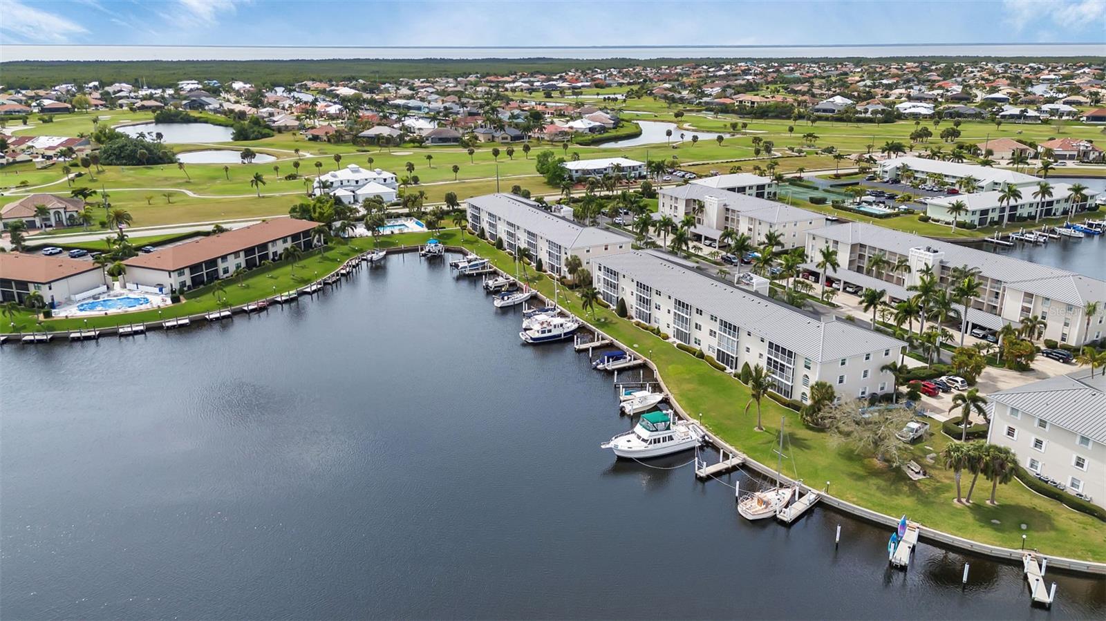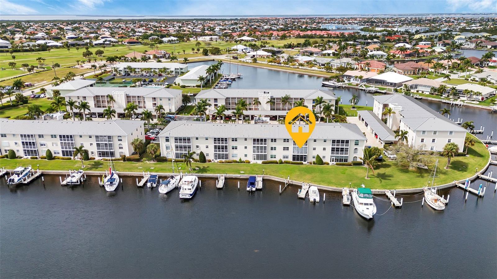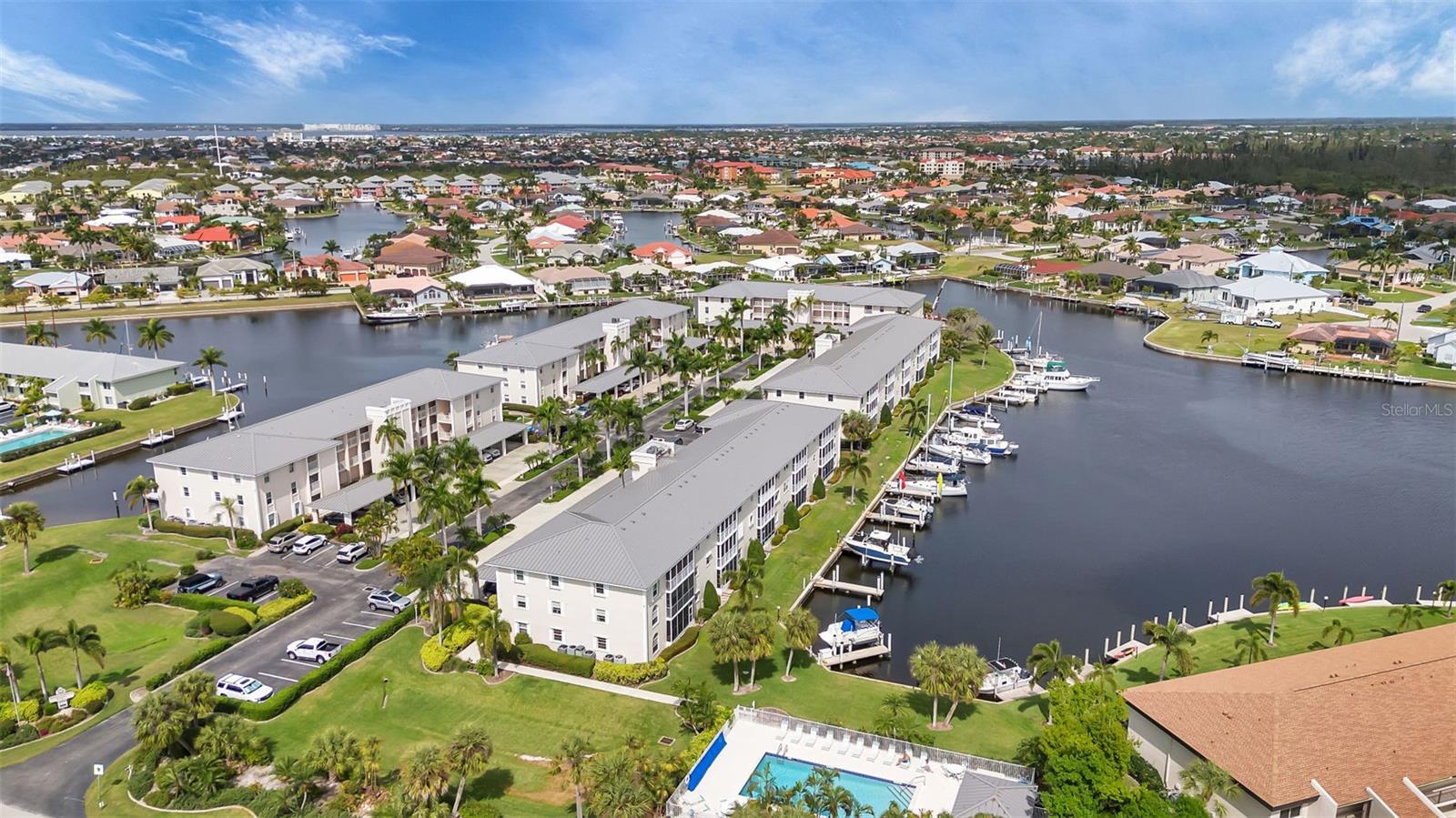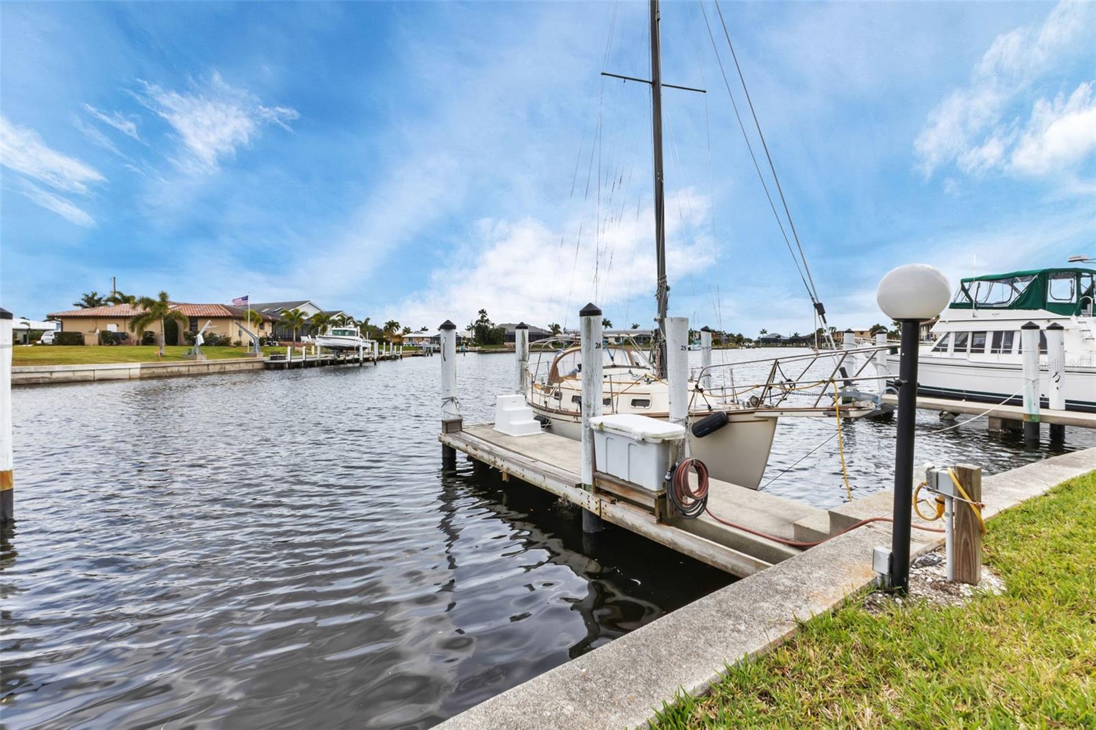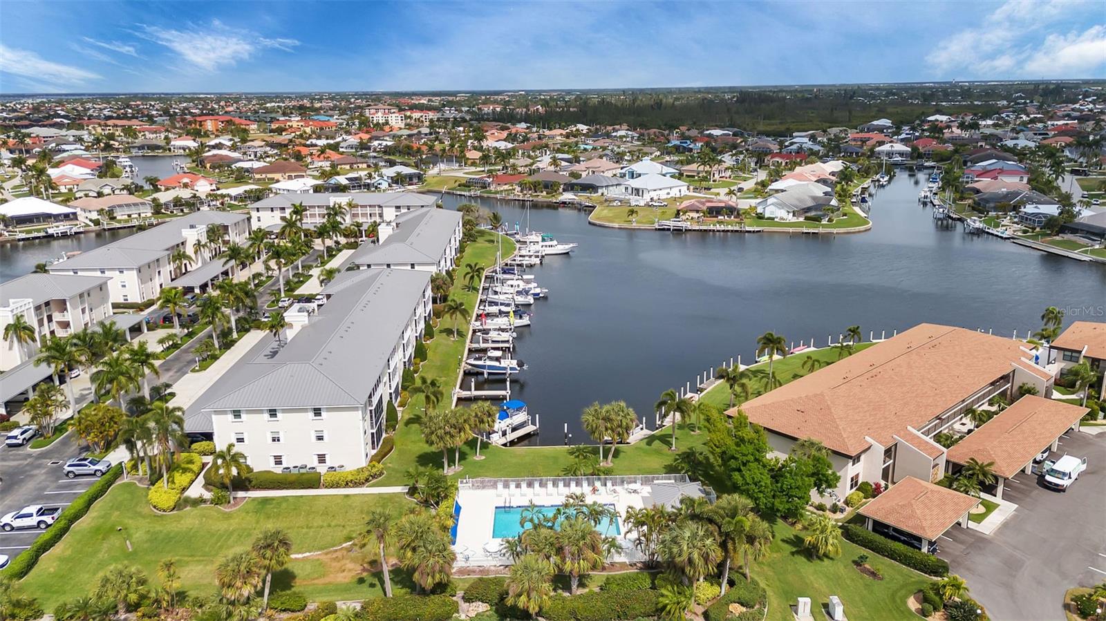 Welcome to your waterfront paradise! This lovely turnkey condo offers breathtaking views of the sailboat basin and comes complete with a deeded dock, making it a boater's dream. Step onto the enclosed balcony and immerse yourself in the tranquility of the morning sunrise over the expansive sailboat basin. This 2 bedroom, 2 bath split plan condo is designed for privacy and comfort, with a great room concept that provides the perfect gathering spot for family and friends. The primary suite is a true retreat, boasting a king size bed, matching end tables, dresser, and highboy, all perfectly complemented by stunning water views. Pamper yourself in the luxurious primary bath featuring a dual sink vanity, large walk-in closet, and a separate toilet and shower room. The second bedroom offers a cozy queen bed, end tables, dresser, and generous closet space, ensuring your guests feel right at home. Laundry day is a breeze with the spacious laundry room equipped with a front load washer/dryer set, utility sink, and folding counter. Additional storage space is readily available in the large in-unit storage room complete with cabinetry and a maple countertop. Entertain with ease on the lanai, equipped with a round glass table and rolling chairs, electric BBQ, and convenient pass-through from the kitchen. Granite countertops in the kitchen add a touch of elegance, seamlessly flowing into the pass-through. Your deeded dock, complete with water and electric hookups, is conveniently within view of the balcony, offering easy access to the water whenever the mood strikes. Plus, rest easy knowing your unit is protected by an electric hurricane shutter enclosing the lanai. This turnkey unit truly has it all – from the tasteful furnishings to the essential amenities, everything you see is included in the asking price. Don't miss out on the opportunity to experience waterfront living at its finest. Schedule your showing today and start making memories in this waterfront oasis! Building 4 - second floor.