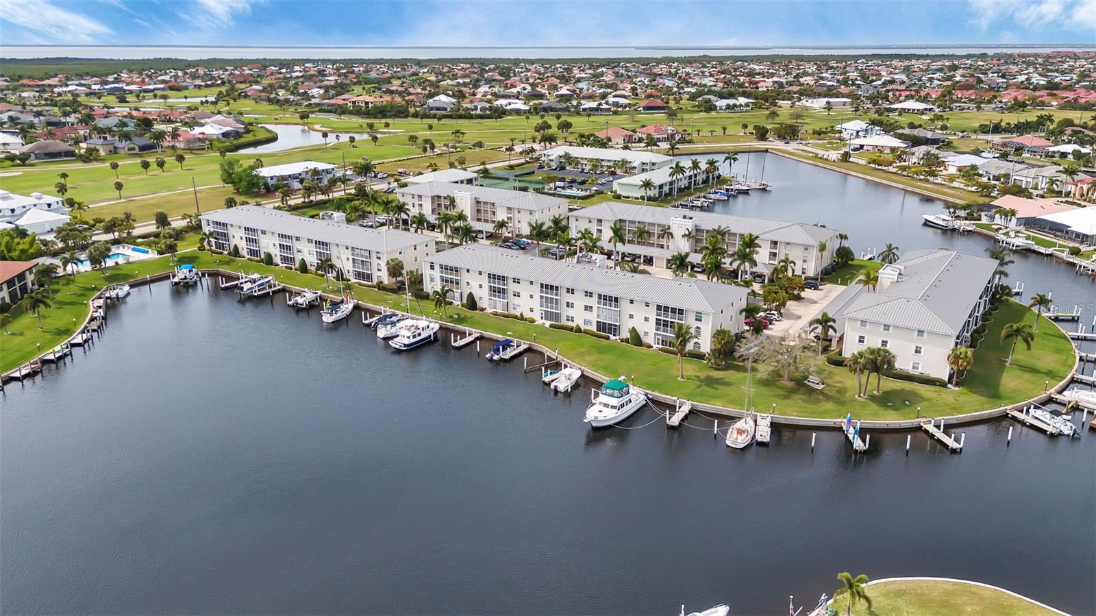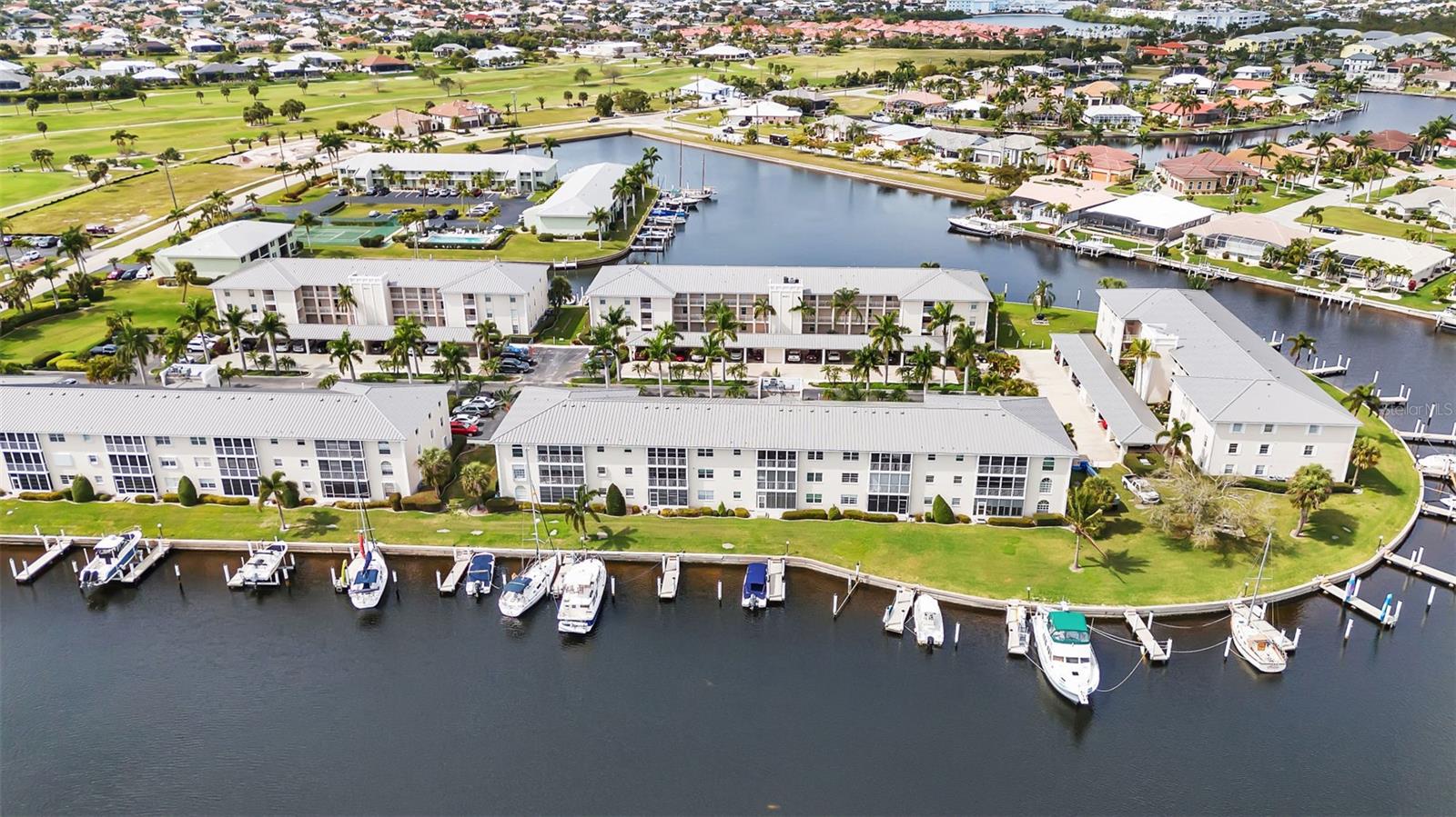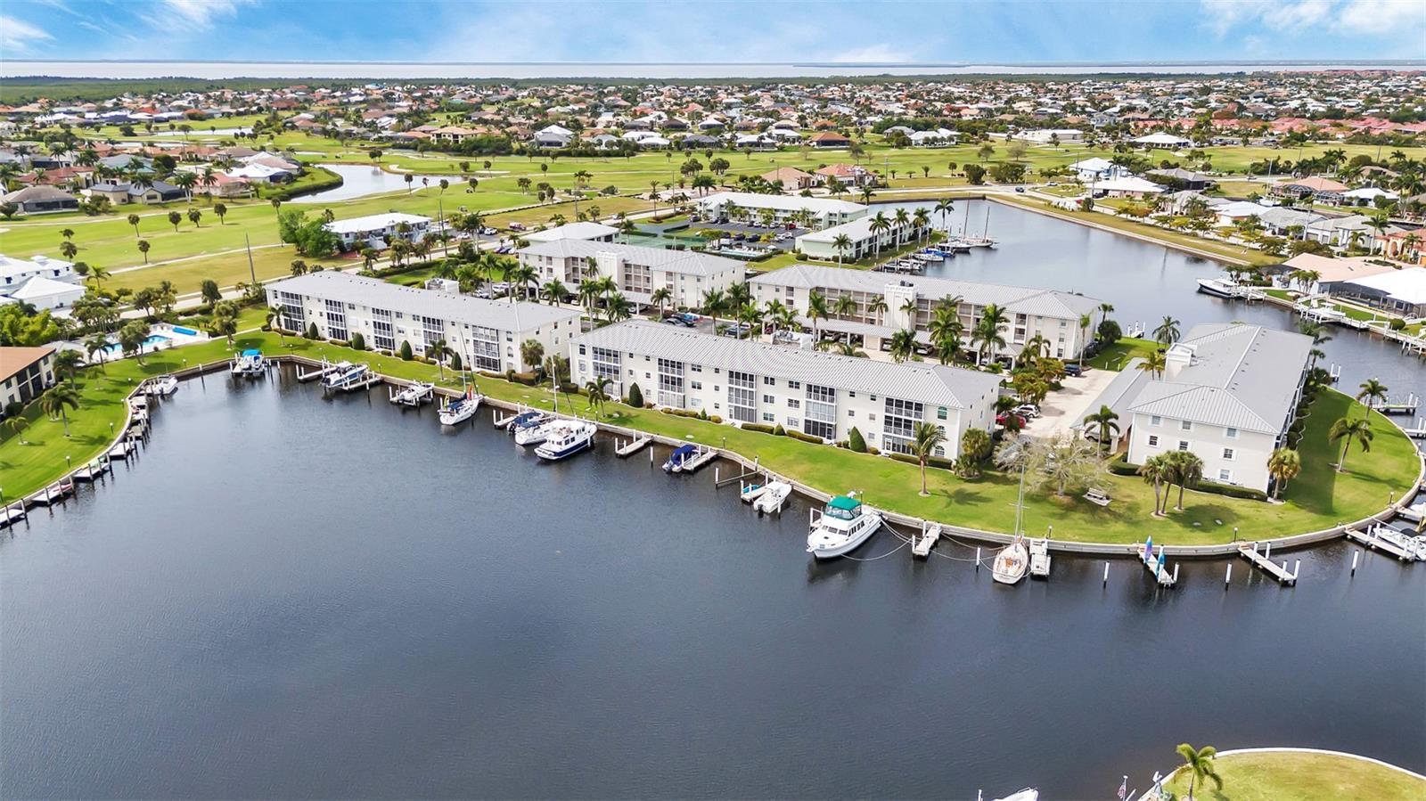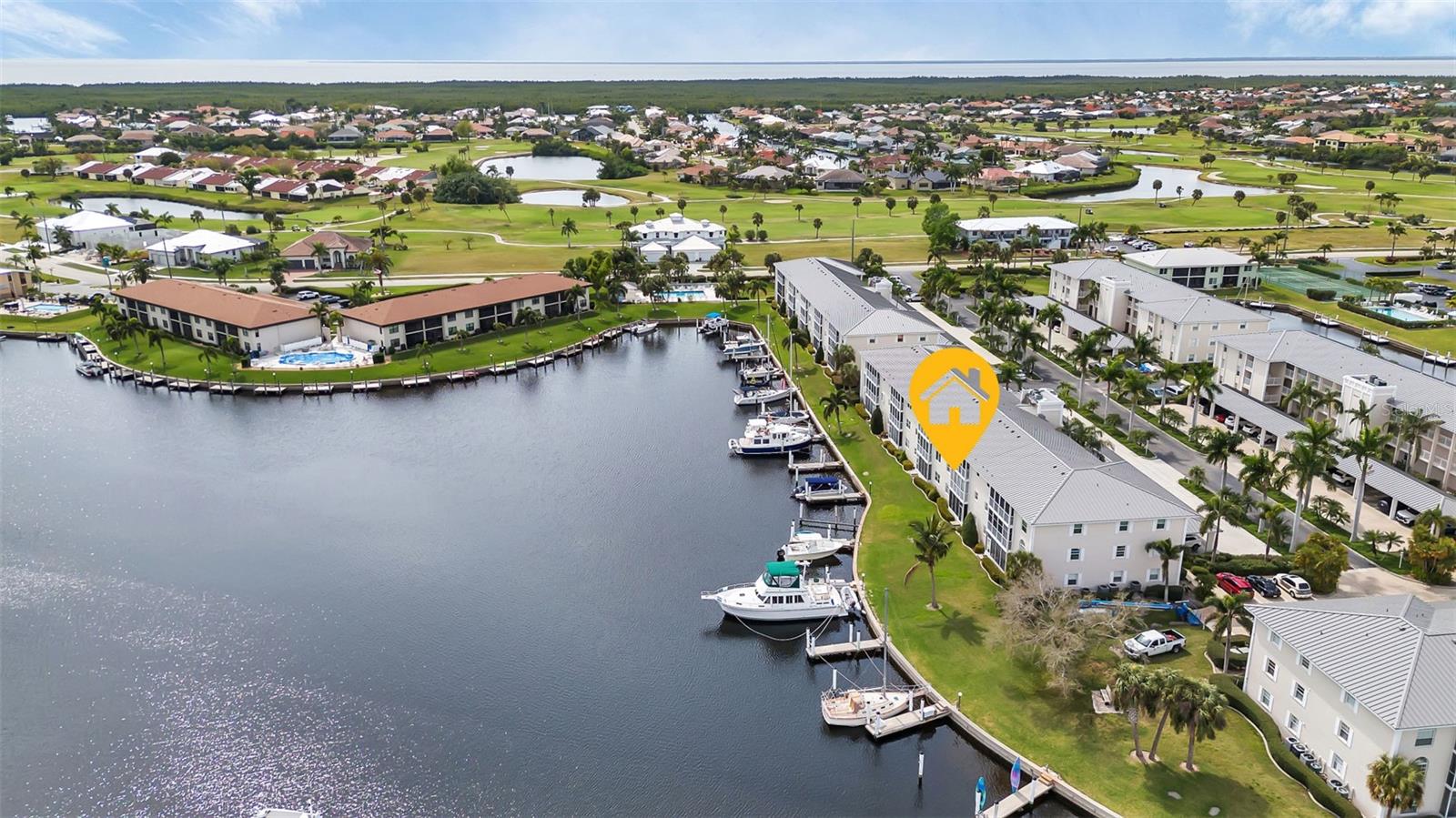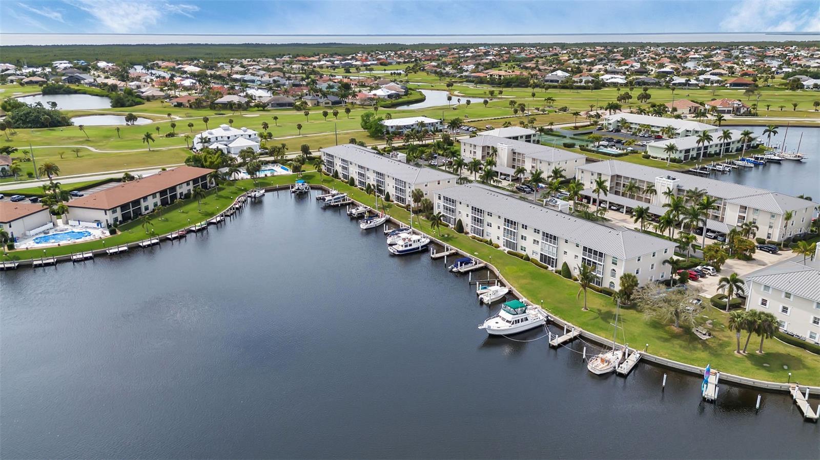 Welcome to your waterfront paradise! This lovely turnkey condo offers breathtaking views of the sailboat basin and comes complete with a deeded dock, making it a boater's dream. Step onto the enclosed balcony and immerse yourself in the tranquility of the morning sunrise over the expansive sailboat basin. This 2 bedroom, 2 bath split plan condo is designed for privacy and comfort, with a great room concept that provides the perfect gathering spot for family and friends. The primary suite is a true retreat, boasting a king size bed, matching end tables, dresser, and highboy, all perfectly complemented by stunning water views. Pamper yourself in the luxurious primary bath featuring a dual sink vanity, large walk-in closet, and a separate toilet and shower room. The second bedroom offers a cozy queen bed, end tables, dresser, and generous closet space, ensuring your guests feel right at home. Laundry day is a breeze with the spacious laundry room equipped with a front load washer/dryer set, utility sink, and folding counter. Additional storage space is readily available in the large in-unit storage room complete with cabinetry and a maple countertop. Entertain with ease on the lanai, equipped with a round glass table and rolling chairs, electric BBQ, and convenient pass-through from the kitchen. Granite countertops in the kitchen add a touch of elegance, seamlessly flowing into the pass-through. Your deeded dock, complete with water and electric hookups, is conveniently within view of the balcony, offering easy access to the water whenever the mood strikes. Plus, rest easy knowing your unit is protected by an electric hurricane shutter enclosing the lanai. This turnkey unit truly has it all – from the tasteful furnishings to the essential amenities, everything you see is included in the asking price. Don't miss out on the opportunity to experience waterfront living at its finest. Schedule your showing today and start making memories in this waterfront oasis! Building 4 - second floor.