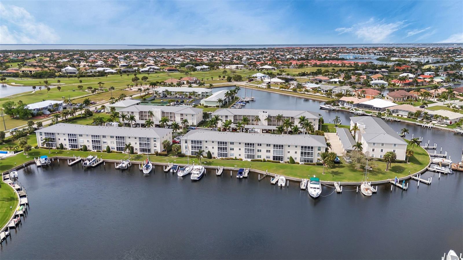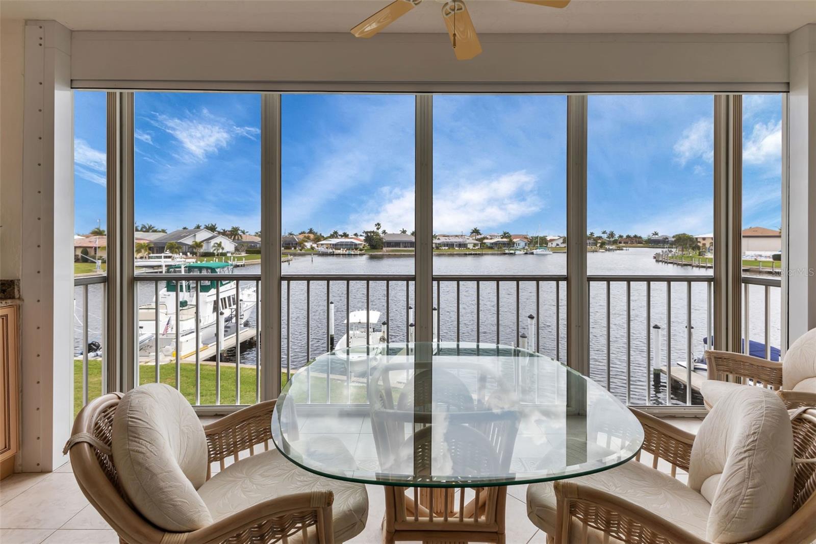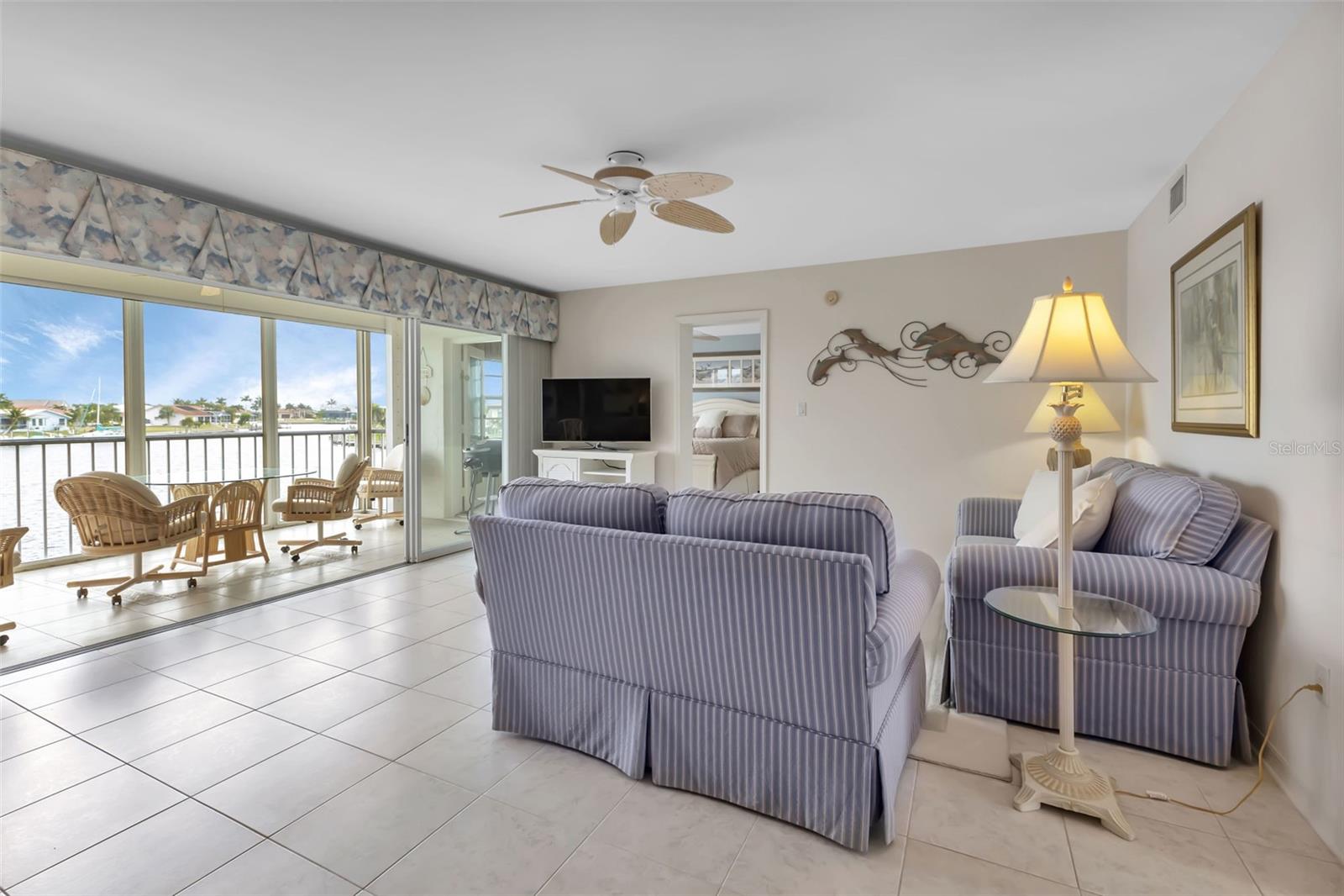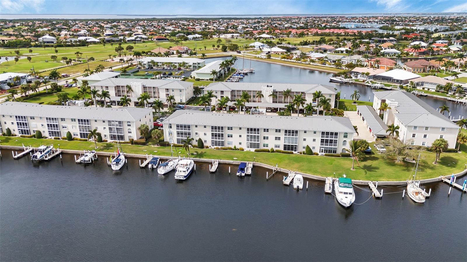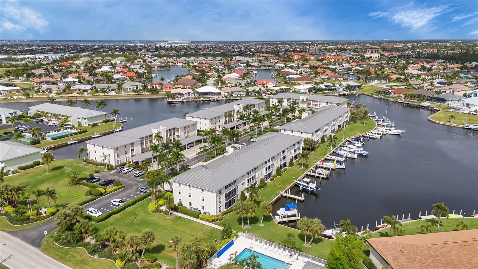 Welcome to your waterfront paradise! This lovely turnkey condo offers breathtaking views of the sailboat basin and comes complete with a deeded dock, making it a boater's dream. Step onto the enclosed balcony and immerse yourself in the tranquility of the morning sunrise over the expansive sailboat basin. This 2 bedroom, 2 bath split plan condo is designed for privacy and comfort, with a great room concept that provides the perfect gathering spot for family and friends. The primary suite is a true retreat, boasting a king size bed, matching end tables, dresser, and highboy, all perfectly complemented by stunning water views. Pamper yourself in the luxurious primary bath featuring a dual sink vanity, large walk-in closet, and a separate toilet and shower room. The second bedroom offers a cozy queen bed, end tables, dresser, and generous closet space, ensuring your guests feel right at home. Laundry day is a breeze with the spacious laundry room equipped with a front load washer/dryer set, utility sink, and folding counter. Additional storage space is readily available in the large in-unit storage room complete with cabinetry and a maple countertop. Entertain with ease on the lanai, equipped with a round glass table and rolling chairs, electric BBQ, and convenient pass-through from the kitchen. Granite countertops in the kitchen add a touch of elegance, seamlessly flowing into the pass-through. Your deeded dock, complete with water and electric hookups, is conveniently within view of the balcony, offering easy access to the water whenever the mood strikes. Plus, rest easy knowing your unit is protected by an electric hurricane shutter enclosing the lanai. This turnkey unit truly has it all – from the tasteful furnishings to the essential amenities, everything you see is included in the asking price. Don't miss out on the opportunity to experience waterfront living at its finest. Schedule your showing today and start making memories in this waterfront oasis! Building 4 - second floor.