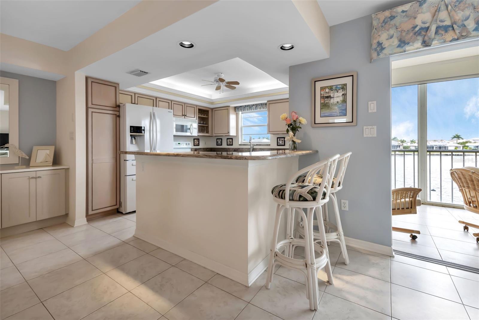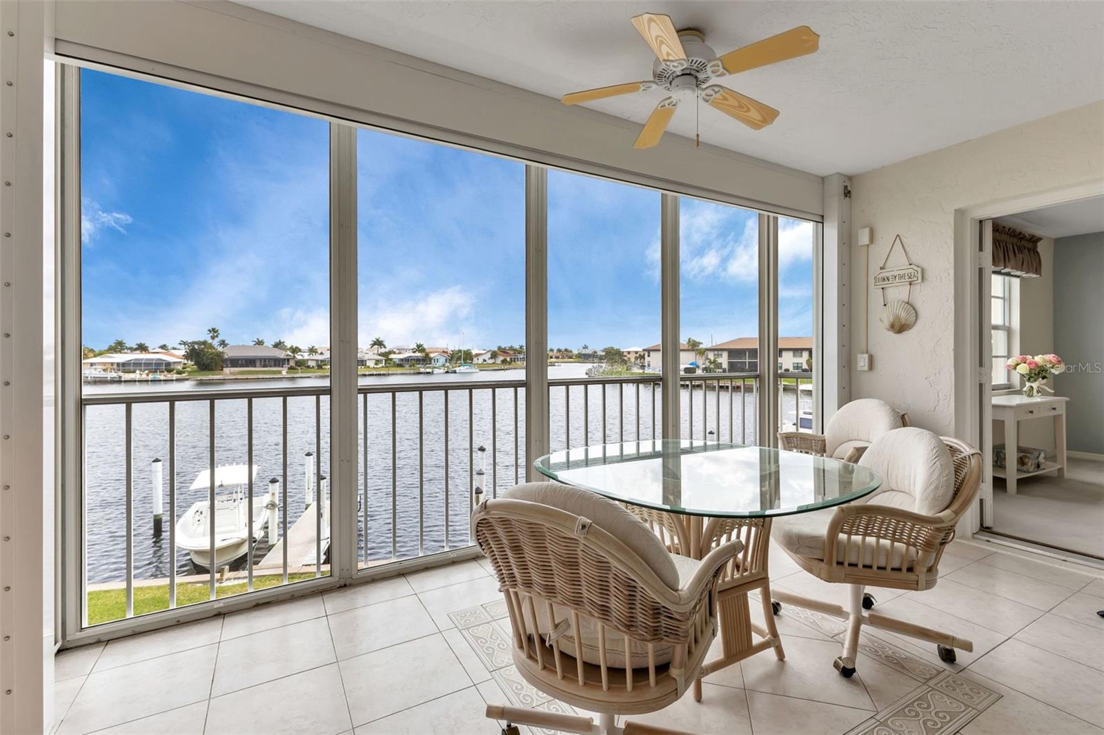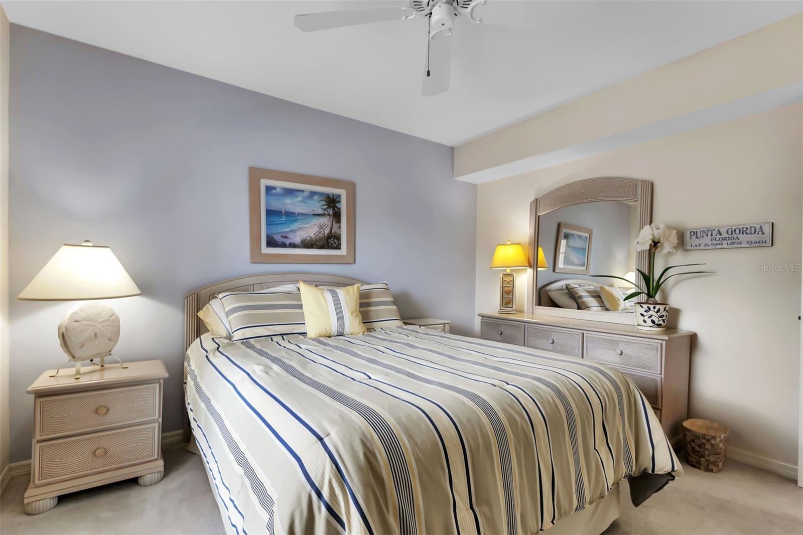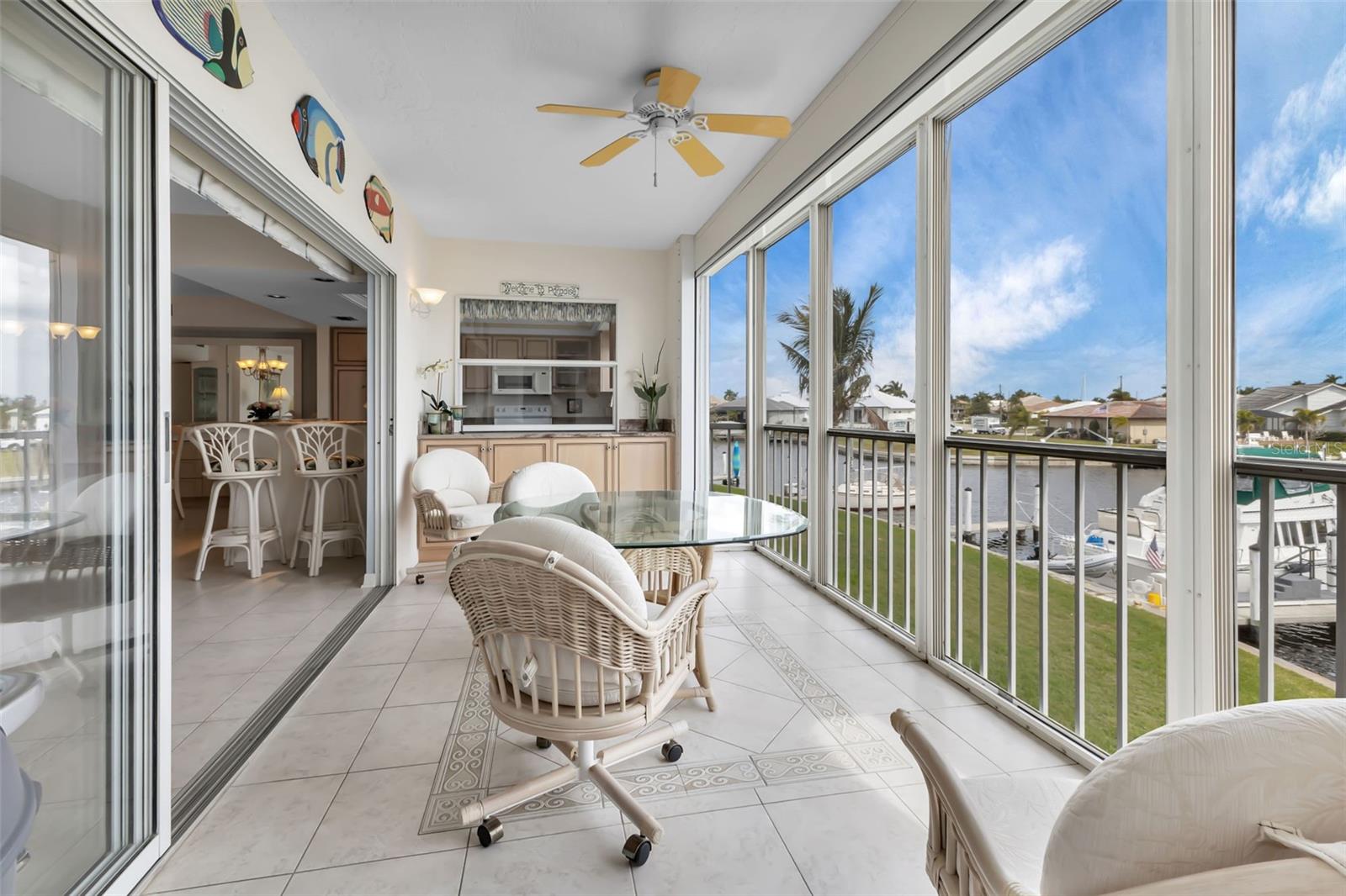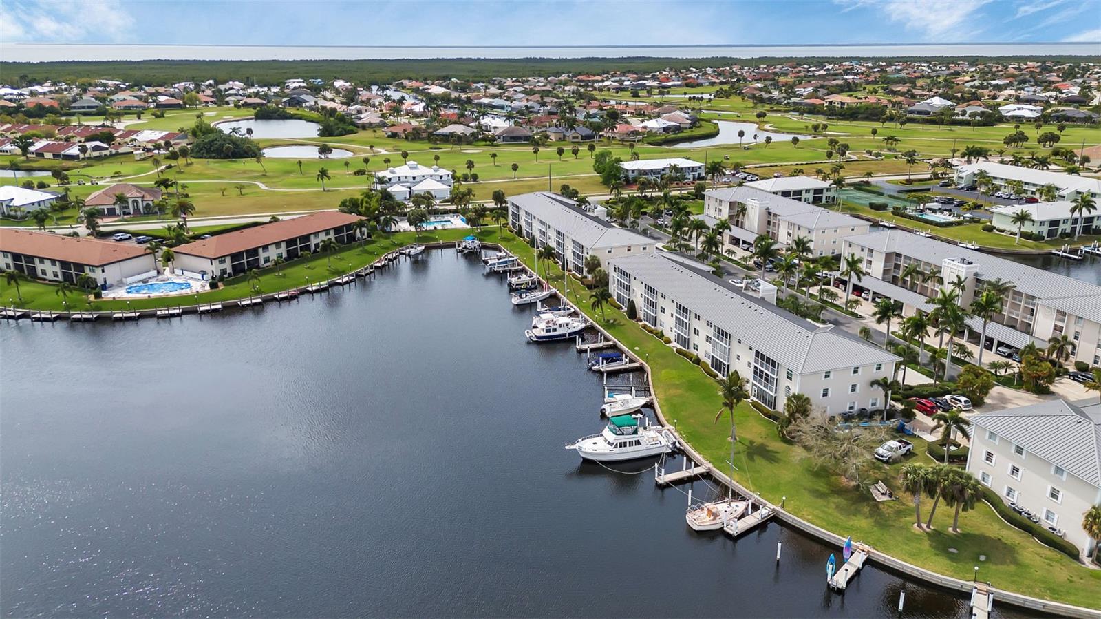 Welcome to your waterfront paradise! This lovely turnkey condo offers breathtaking views of the sailboat basin and comes complete with a deeded dock, making it a boater's dream. Step onto the enclosed balcony and immerse yourself in the tranquility of the morning sunrise over the expansive sailboat basin. This 2 bedroom, 2 bath split plan condo is designed for privacy and comfort, with a great room concept that provides the perfect gathering spot for family and friends. The primary suite is a true retreat, boasting a king size bed, matching end tables, dresser, and highboy, all perfectly complemented by stunning water views. Pamper yourself in the luxurious primary bath featuring a dual sink vanity, large walk-in closet, and a separate toilet and shower room. The second bedroom offers a cozy queen bed, end tables, dresser, and generous closet space, ensuring your guests feel right at home. Laundry day is a breeze with the spacious laundry room equipped with a front load washer/dryer set, utility sink, and folding counter. Additional storage space is readily available in the large in-unit storage room complete with cabinetry and a maple countertop. Entertain with ease on the lanai, equipped with a round glass table and rolling chairs, electric BBQ, and convenient pass-through from the kitchen. Granite countertops in the kitchen add a touch of elegance, seamlessly flowing into the pass-through. Your deeded dock, complete with water and electric hookups, is conveniently within view of the balcony, offering easy access to the water whenever the mood strikes. Plus, rest easy knowing your unit is protected by an electric hurricane shutter enclosing the lanai. This turnkey unit truly has it all – from the tasteful furnishings to the essential amenities, everything you see is included in the asking price. Don't miss out on the opportunity to experience waterfront living at its finest. Schedule your showing today and start making memories in this waterfront oasis! Building 4 - second floor.