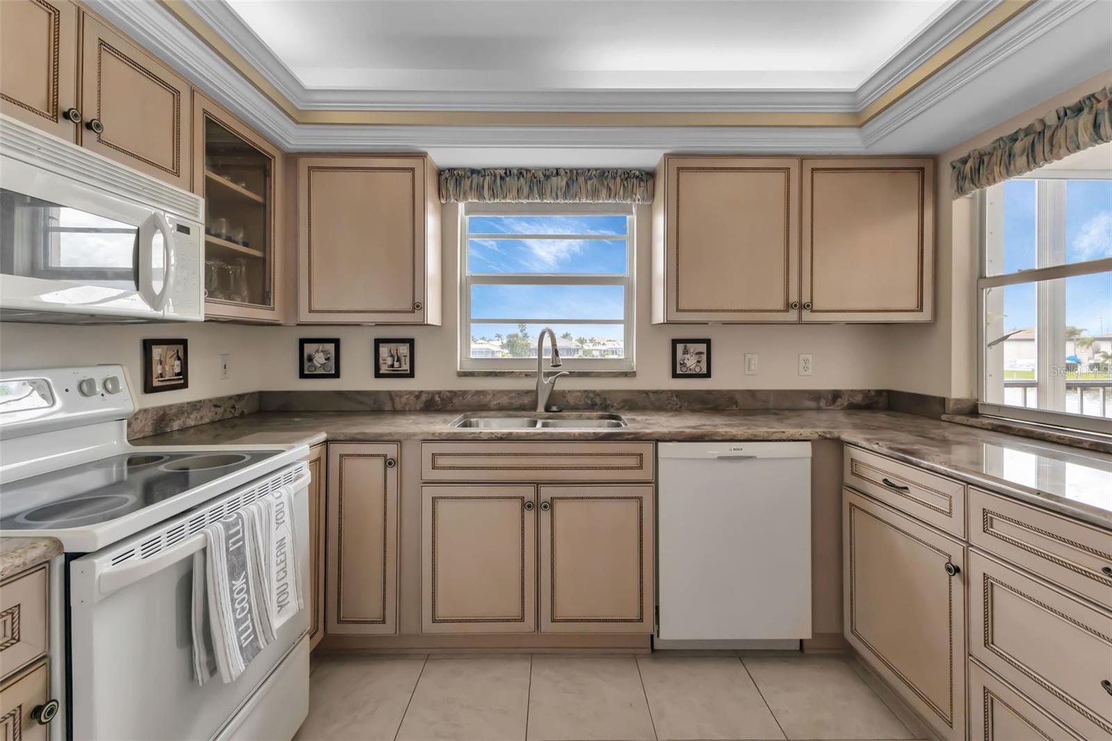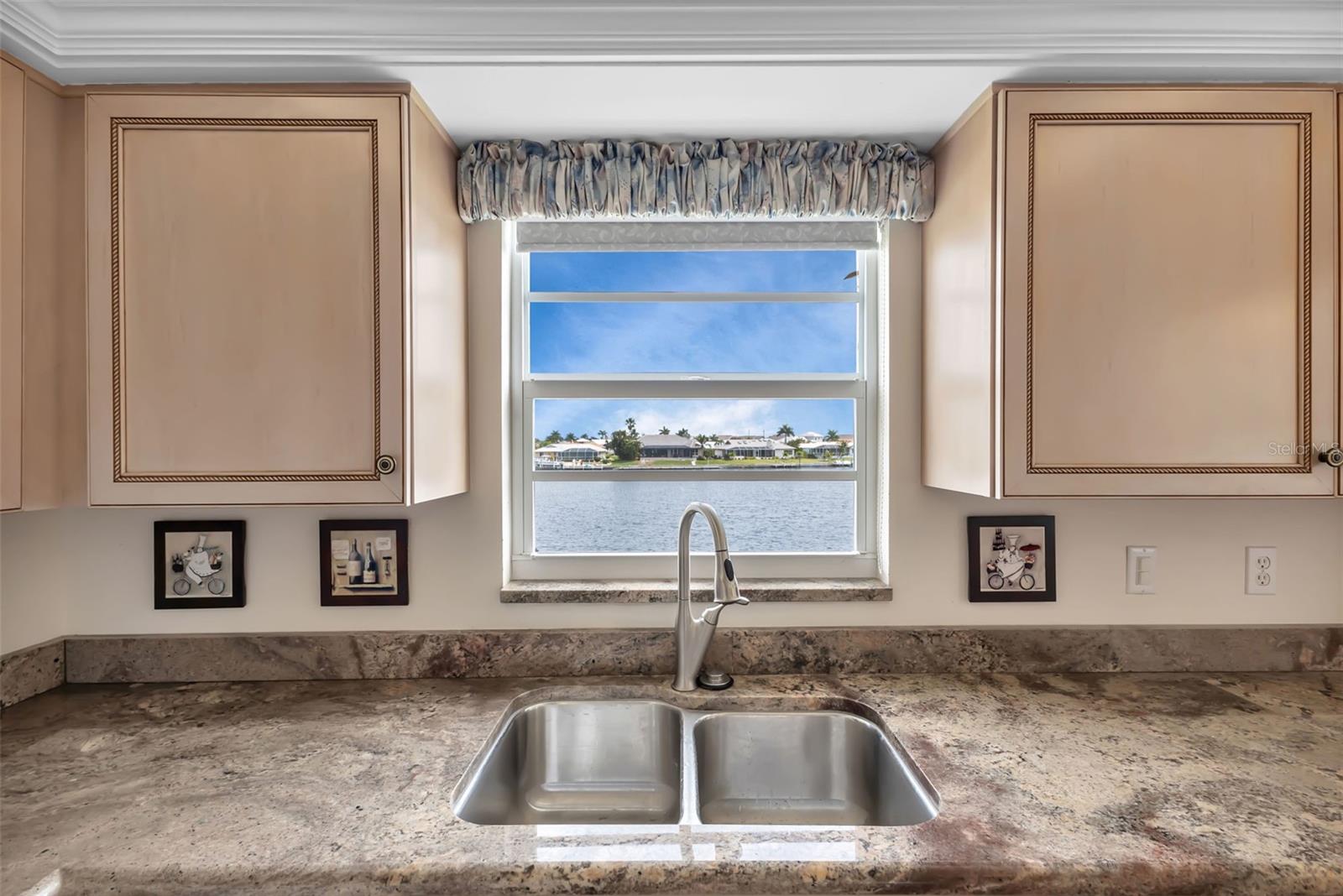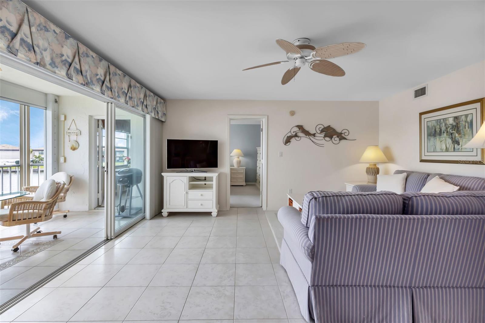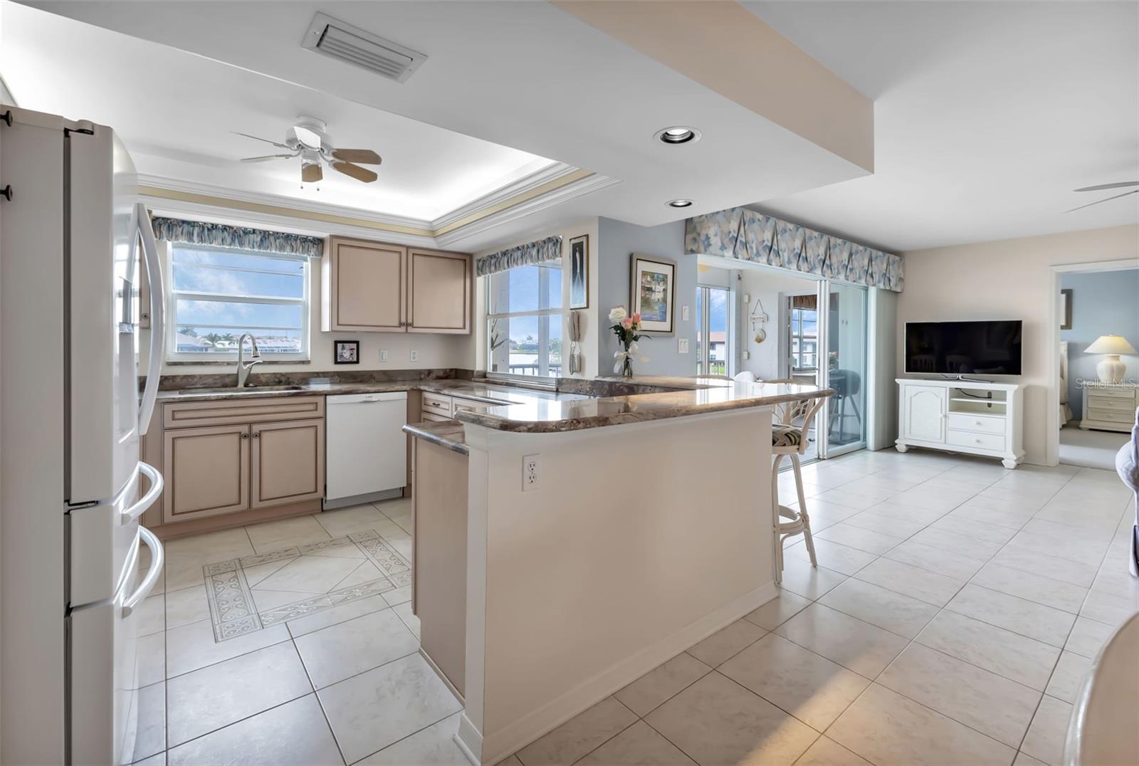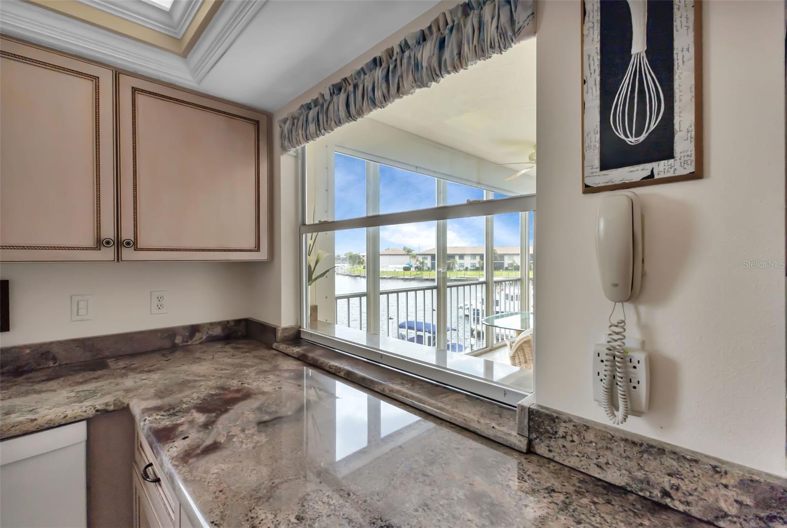 Welcome to your waterfront paradise! This lovely turnkey condo offers breathtaking views of the sailboat basin and comes complete with a deeded dock, making it a boater's dream. Step onto the enclosed balcony and immerse yourself in the tranquility of the morning sunrise over the expansive sailboat basin. This 2 bedroom, 2 bath split plan condo is designed for privacy and comfort, with a great room concept that provides the perfect gathering spot for family and friends. The primary suite is a true retreat, boasting a king size bed, matching end tables, dresser, and highboy, all perfectly complemented by stunning water views. Pamper yourself in the luxurious primary bath featuring a dual sink vanity, large walk-in closet, and a separate toilet and shower room. The second bedroom offers a cozy queen bed, end tables, dresser, and generous closet space, ensuring your guests feel right at home. Laundry day is a breeze with the spacious laundry room equipped with a front load washer/dryer set, utility sink, and folding counter. Additional storage space is readily available in the large in-unit storage room complete with cabinetry and a maple countertop. Entertain with ease on the lanai, equipped with a round glass table and rolling chairs, electric BBQ, and convenient pass-through from the kitchen. Granite countertops in the kitchen add a touch of elegance, seamlessly flowing into the pass-through. Your deeded dock, complete with water and electric hookups, is conveniently within view of the balcony, offering easy access to the water whenever the mood strikes. Plus, rest easy knowing your unit is protected by an electric hurricane shutter enclosing the lanai. This turnkey unit truly has it all – from the tasteful furnishings to the essential amenities, everything you see is included in the asking price. Don't miss out on the opportunity to experience waterfront living at its finest. Schedule your showing today and start making memories in this waterfront oasis! Building 4 - second floor.