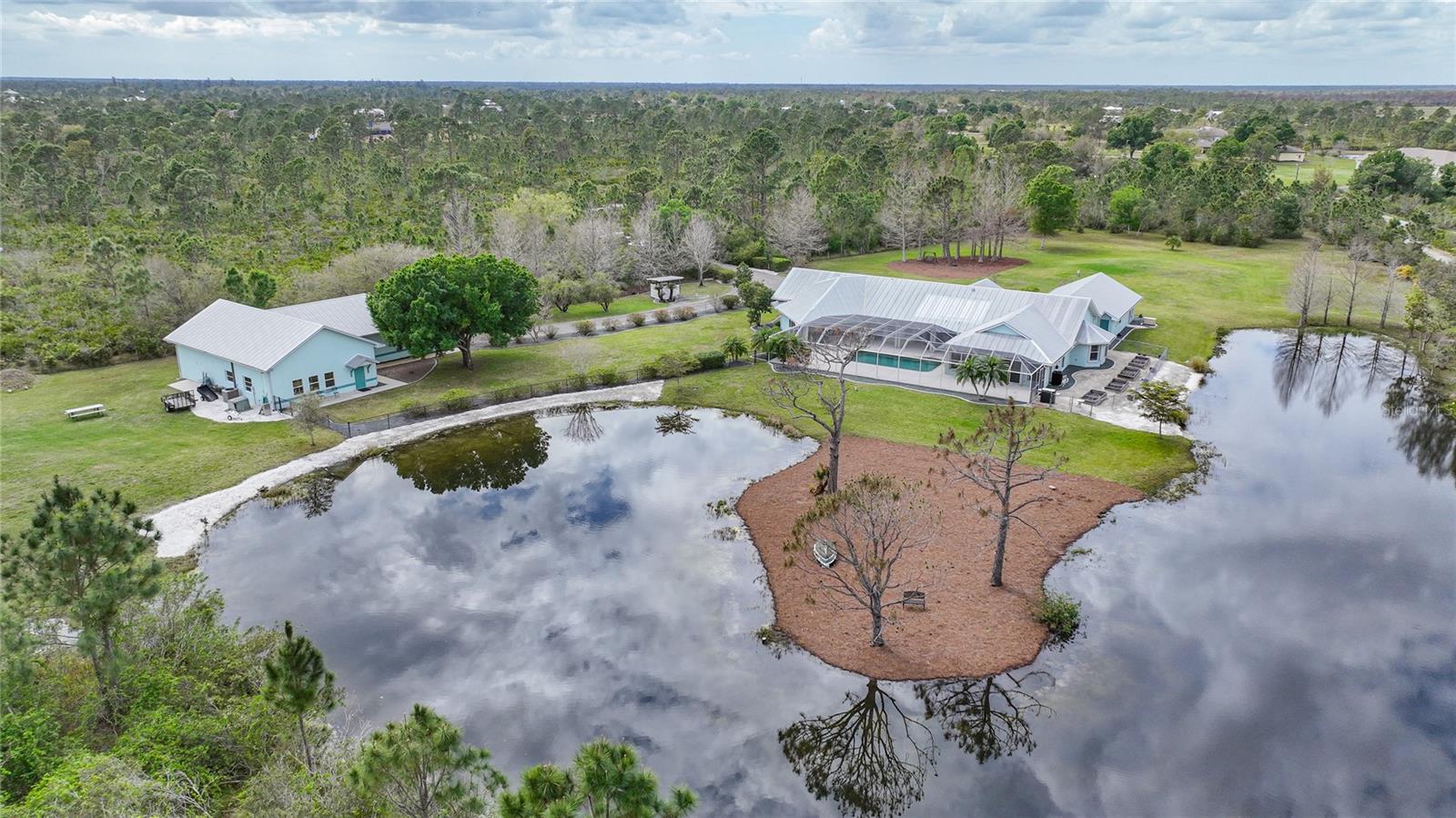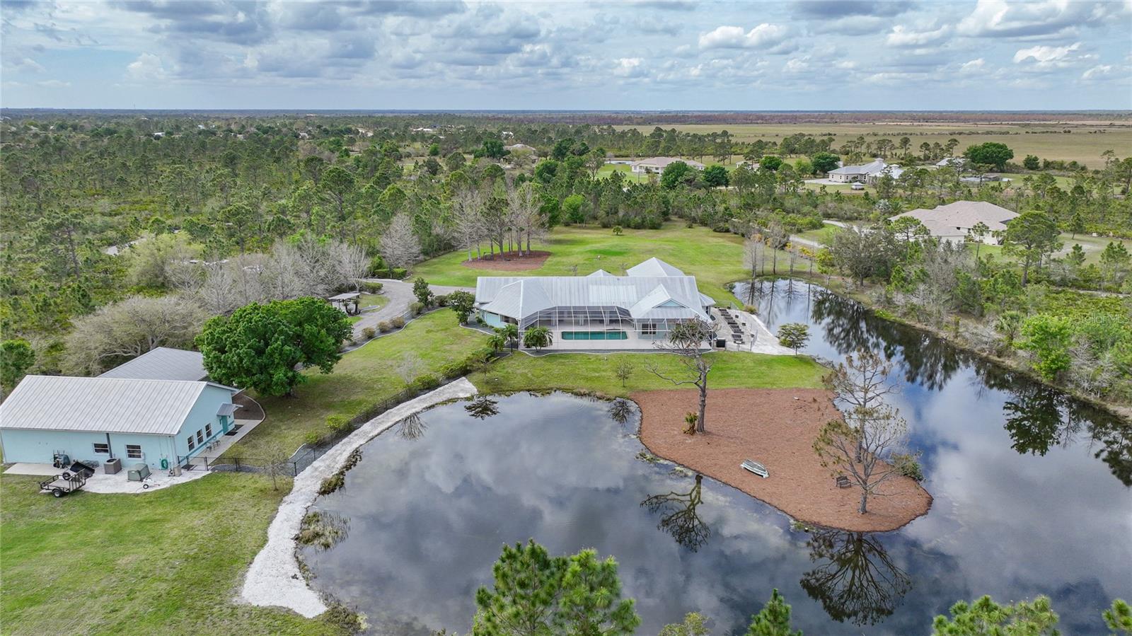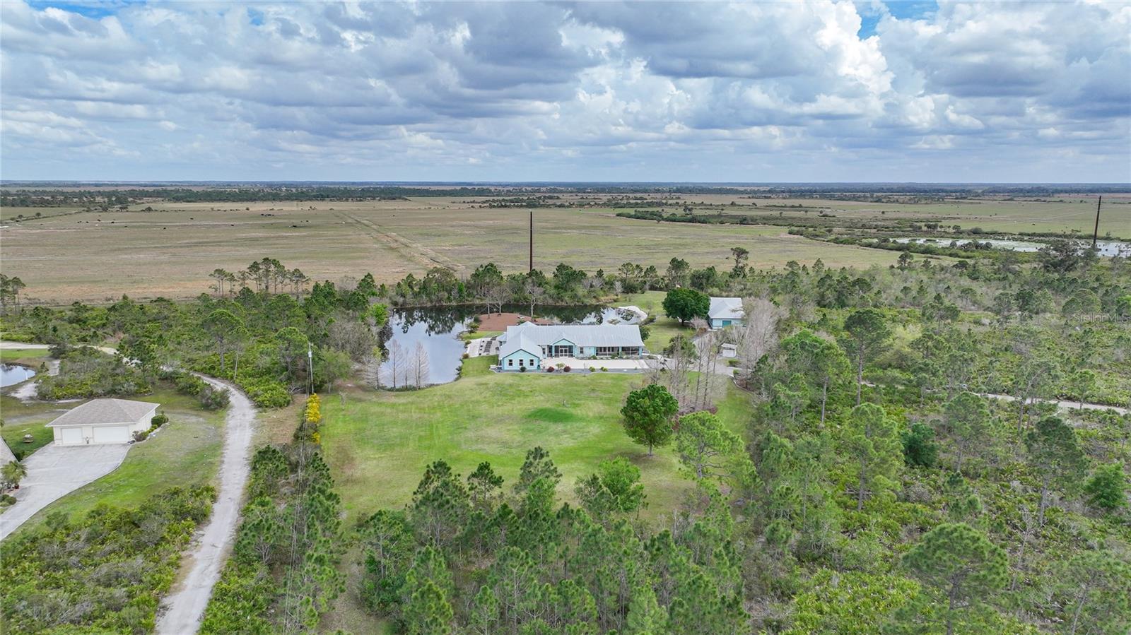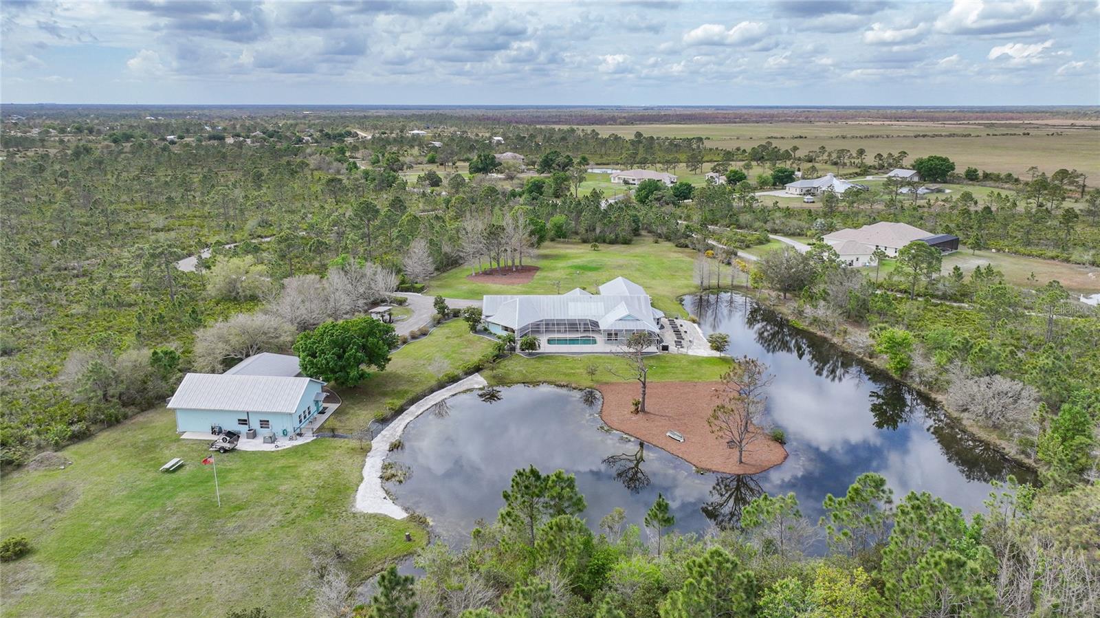 Captivating Estate at 17901 Wood Path: Where Elegance and Country Living Intertwine, Experience the epitome of sophistication and serene country living in this sprawling 12-acre estate nestled in the heart of the equestrian community of Prairie Creek Park. Just a short ride to the historic charm of Punta Gorda, 17901 Wood Path presents a masterfully updated retreat designed for comfort, convenience, and contemporary style. The soul of this home lies in its extensive remodel, boasting 4,428 square feet of thoughtfully appointed space. With five oversized bedrooms, three full bathrooms, and an additional powder room, this residence caters to both grand family living and an intimate repose. Central to the home's allure is a 1.5-acre pond, setting the stage for a serene atmosphere echoed throughout the estate. Entrance & Exterior: Imposing covered and screened entryway. Wraparound 33x13 porch with stamped concrete for extended relaxation and entertainment. Interior Highlights: The gourmet kitchen, accented with custom cherry cabinets, Granite countertops, Kitchen Aid appliances and a generous center island, opens to an ambiently lit great room. A Full home generator backed by an in-ground 1,000-gallon propane tank ensures uninterrupted comfort. State-of-the-art Wi-Fi connectivity and recessed stereo speakers set a seamless auditory experience across all rooms. The Homeowner's Suite emerges as a sanctuary within, featuring dual vanities and a bespoke multi-jetted walk-through shower. Outside, the estate affords a plethora of leisure possibilities, including private porches, an expansive lanai, a heated volleyball pool and hot tub. Ambiance is key with extensive special lighting and custom 6x8 French doors etched with elegant designs. Pet-friendly with an elevated pet bathtub within a fully equipped laundry room. Outdoor Living: Two separate fenced side yards, ample for recreational activities or pet freedom. A commercial-grade pump system services the estate, complete with trio fire hydrants. Outbuildings & Workshops: A multi-use Hobby Barn is appointed with air conditioning/heating, a separate 200-amp electrical panel, and a security system. A 28x16 Art Studio and 30x20 Shop offer dedicated spaces for creativity and craftsmanship. A Large windowless room presents a blank canvas for your individual use...all circumscribing a picturesque natural pond embraced by lush natural greenery. With a 3 A/C system, 2 for the home and one in the outbuilding, rain-capture system, and wired security, every detail ensures peace of mind in sustainable luxury. Make 17901 Wood Path your private country haven—a place where life's hustle fades into the tranquil embrace of nature's arms.