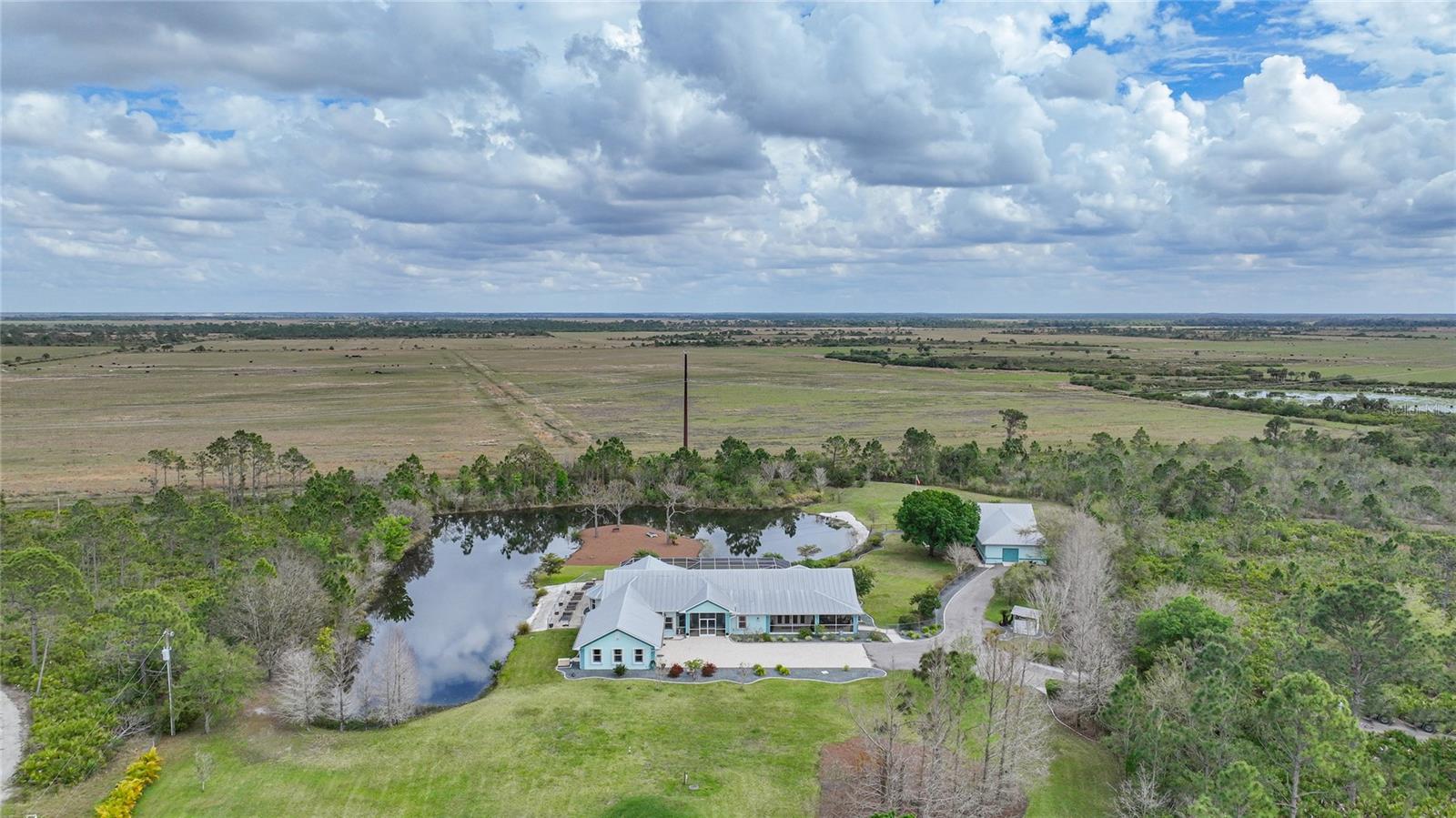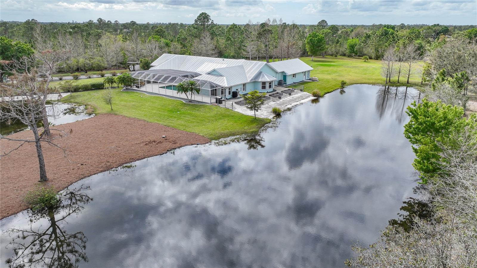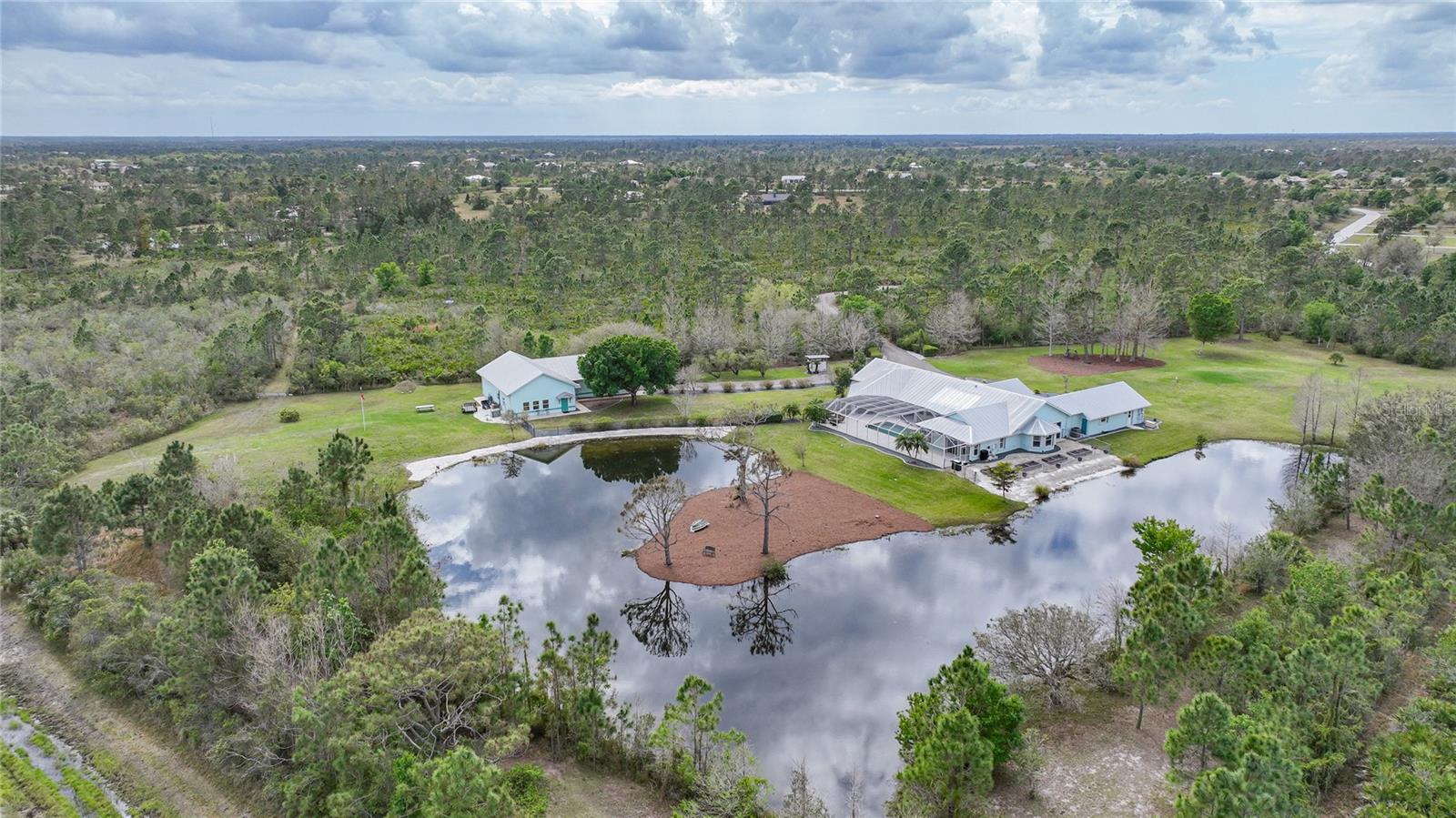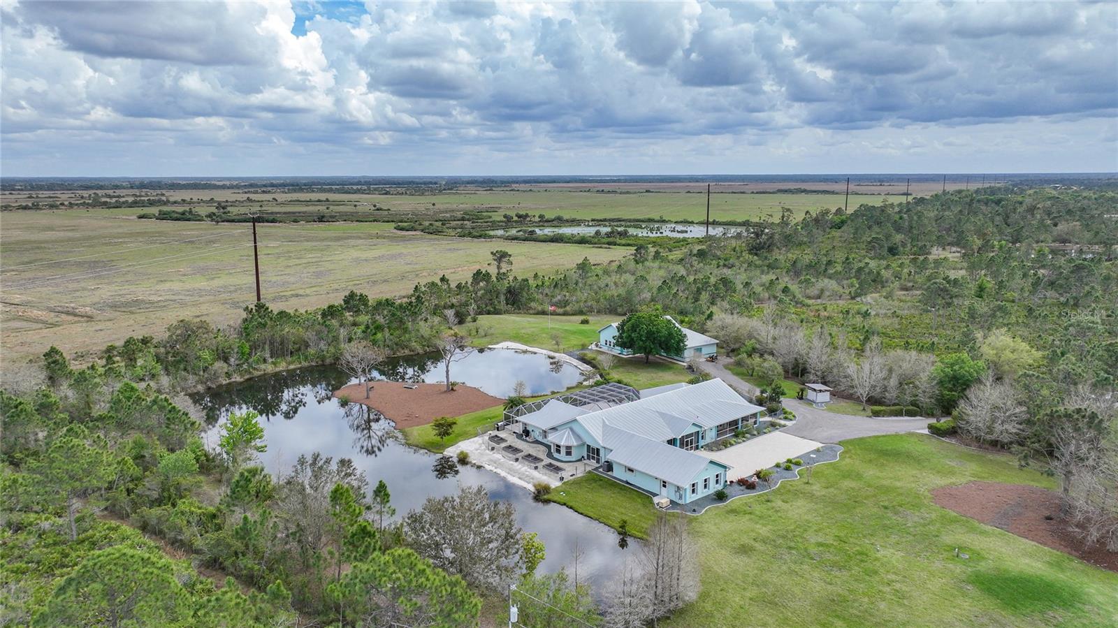 Captivating Estate at 17901 Wood Path: Where Elegance and Country Living Intertwine, Experience the epitome of sophistication and serene country living in this sprawling 12-acre estate nestled in the heart of the equestrian community of Prairie Creek Park. Just a short ride to the historic charm of Punta Gorda, 17901 Wood Path presents a masterfully updated retreat designed for comfort, convenience, and contemporary style. The soul of this home lies in its extensive remodel, boasting 4,428 square feet of thoughtfully appointed space. With five oversized bedrooms, three full bathrooms, and an additional powder room, this residence caters to both grand family living and an intimate repose. Central to the home's allure is a 1.5-acre pond, setting the stage for a serene atmosphere echoed throughout the estate. Entrance & Exterior: Imposing covered and screened entryway. Wraparound 33x13 porch with stamped concrete for extended relaxation and entertainment. Interior Highlights: The gourmet kitchen, accented with custom cherry cabinets, Granite countertops, Kitchen Aid appliances and a generous center island, opens to an ambiently lit great room. A Full home generator backed by an in-ground 1,000-gallon propane tank ensures uninterrupted comfort. State-of-the-art Wi-Fi connectivity and recessed stereo speakers set a seamless auditory experience across all rooms. The Homeowner's Suite emerges as a sanctuary within, featuring dual vanities and a bespoke multi-jetted walk-through shower. Outside, the estate affords a plethora of leisure possibilities, including private porches, an expansive lanai, a heated volleyball pool and hot tub. Ambiance is key with extensive special lighting and custom 6x8 French doors etched with elegant designs. Pet-friendly with an elevated pet bathtub within a fully equipped laundry room. Outdoor Living: Two separate fenced side yards, ample for recreational activities or pet freedom. A commercial-grade pump system services the estate, complete with trio fire hydrants. Outbuildings & Workshops: A multi-use Hobby Barn is appointed with air conditioning/heating, a separate 200-amp electrical panel, and a security system. A 28x16 Art Studio and 30x20 Shop offer dedicated spaces for creativity and craftsmanship. A Large windowless room presents a blank canvas for your individual use...all circumscribing a picturesque natural pond embraced by lush natural greenery. With a 3 A/C system, 2 for the home and one in the outbuilding, rain-capture system, and wired security, every detail ensures peace of mind in sustainable luxury. Make 17901 Wood Path your private country haven—a place where life's hustle fades into the tranquil embrace of nature's arms.