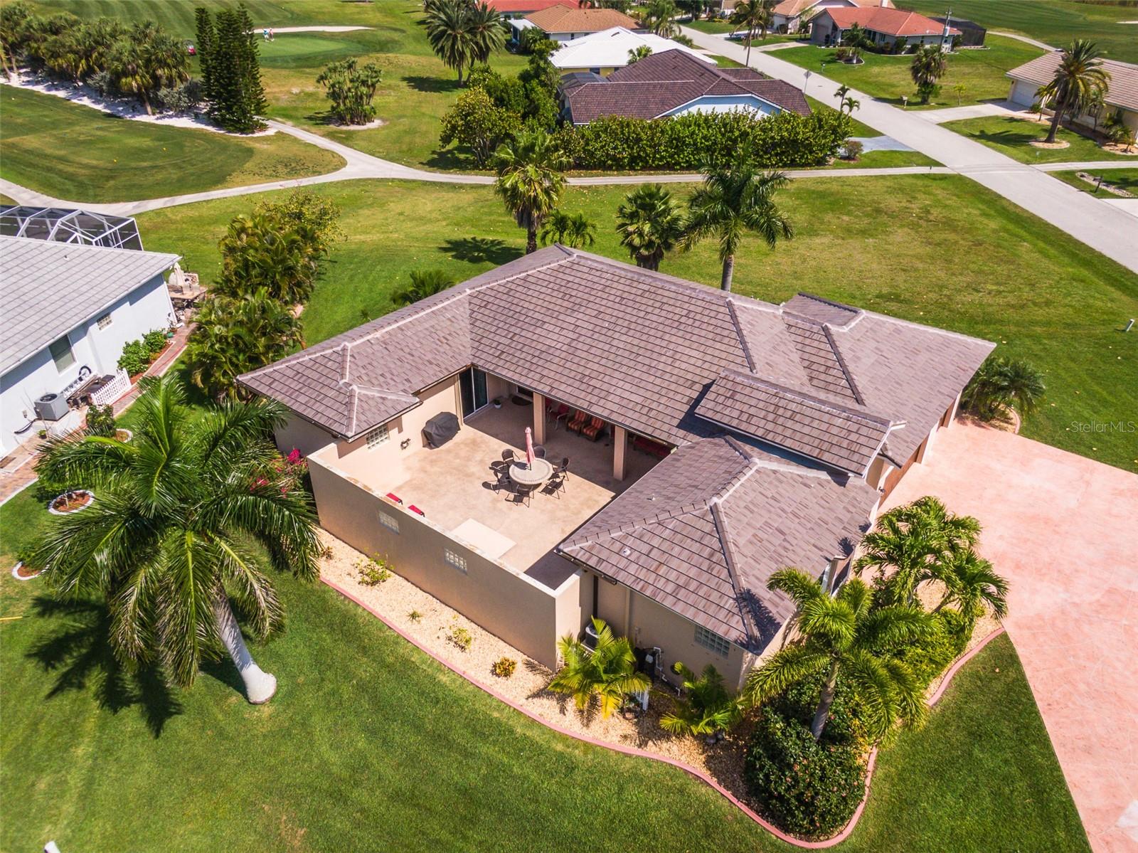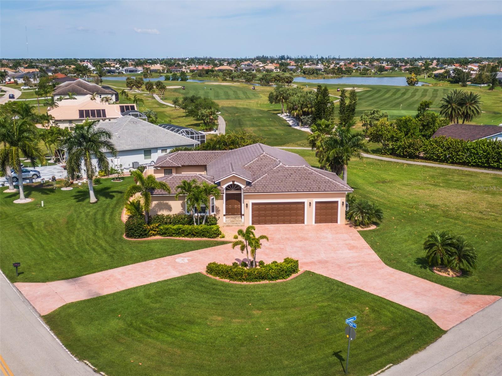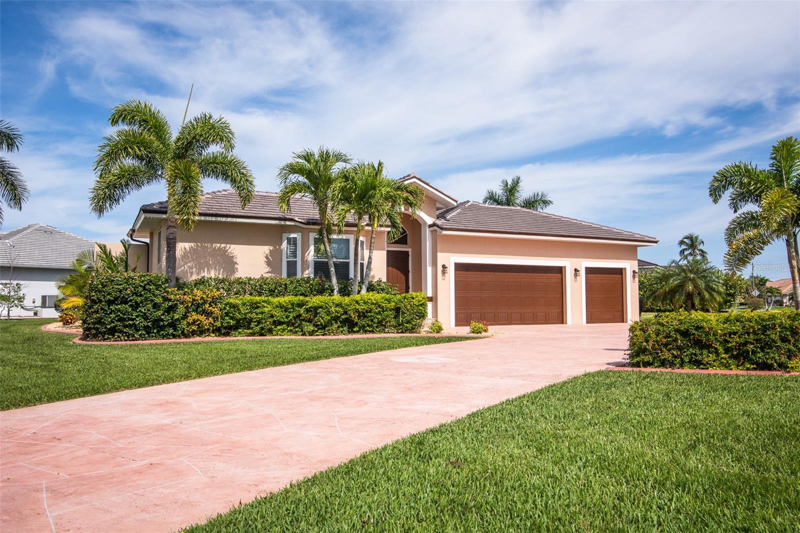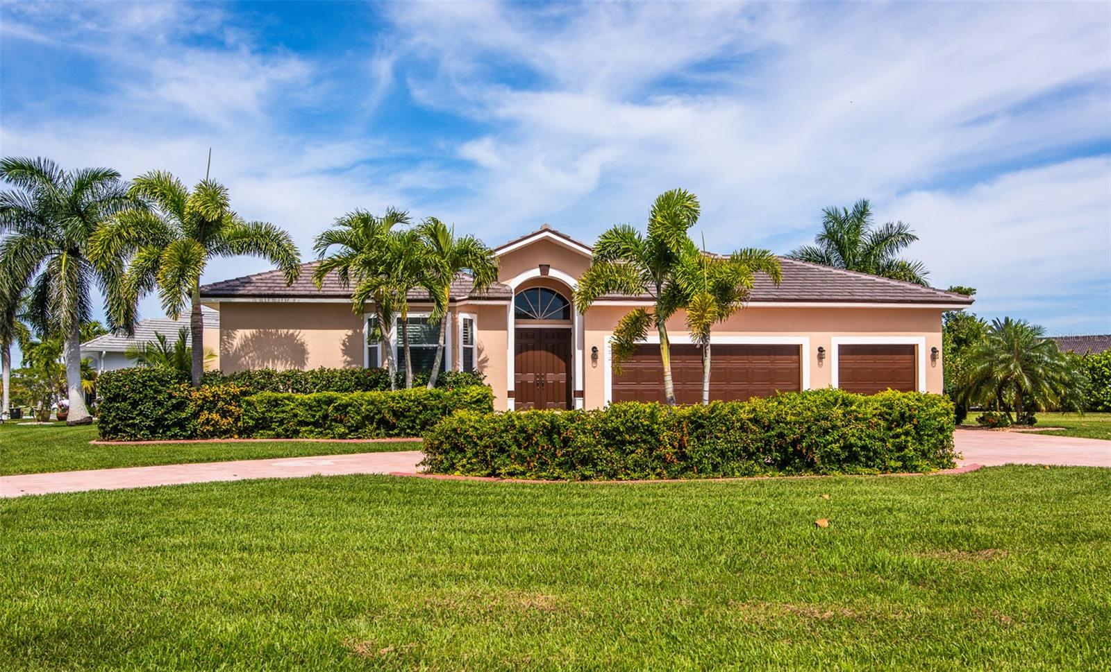THIS ONE'S SPECIAL. Be sure to check it out before you settle for less! This well-designed home offers many unique features to make it a premium choice. Two separate buildings, each with their own central HVAC, provide a 3/3/3 home with the main house featuring 2/2/3 plus the 1/1 "cabana" house, which can serve as a your 3rd bedroom, a handy home office OR a separate in-law apartment, with mini-kitchenette and your 3rd full bathroom. (It's also an opportunity for rental income!) ALL bedroom closets are walk-in. Double front entry doors provide a dramatic entrance to the large, sunny center courtyard, which is totally private with no sight-lines to the public. Not everybody wants a pool, but if you do this is the perfect spot to add one. A 14x28' private pool can fit in the courtyard without impacting property setbacks. Most BSI lots are under 0.25 acre, this double-sized corner lot delivers 0.45 acre with an expansive front yard and a long circular driveway, allowing generous extra off-street parking. Fantastic location features the Twin Isles Country Club (301 Madrid) with its swimming pool, tennis courts and fine restaurant as your neighbor across the street, with the TICC Golf Course virtually extending your back yard with a beautifully scenic, tranquil view from the enclosed back patio, looking out over the 10th tee. (Like having an extra 50 acres back there, with somebody else to mow the lawn!) It's all move-in ready and in excellent condition with a new roof, new paint, new landscaping and all upgraded stainless steel appliances. New energy-efficient hot water system just installed 7/17/2024. Roof features newest wind-resistant flat tiles. Custom-fitted Storm Smart hurricane shutters included. Huge 3 car garage with 12' high ceilings includes 220-240V Electric Vehicle charging station, along with a dedicated mini-split air conditioner & heater. Most interior furnishings are optionally available for purchase. Retail plazas within 1/2 mile provide a Publix supermarket, Home Depot, restaurants, medical/dental offices and more. Elevation certificate & survey provided. There are no mandatory HOA fees, membership in the Burnt Store Isles Association is optional at $45/year (it is a Neighborhood Association, not an HOA by Florida Statute 720). Deed restrictions are listed on the website at BSIA.net, enforced by the applicable City of Punta Gorda zoning district. Listing agent is owner. Come get a look!