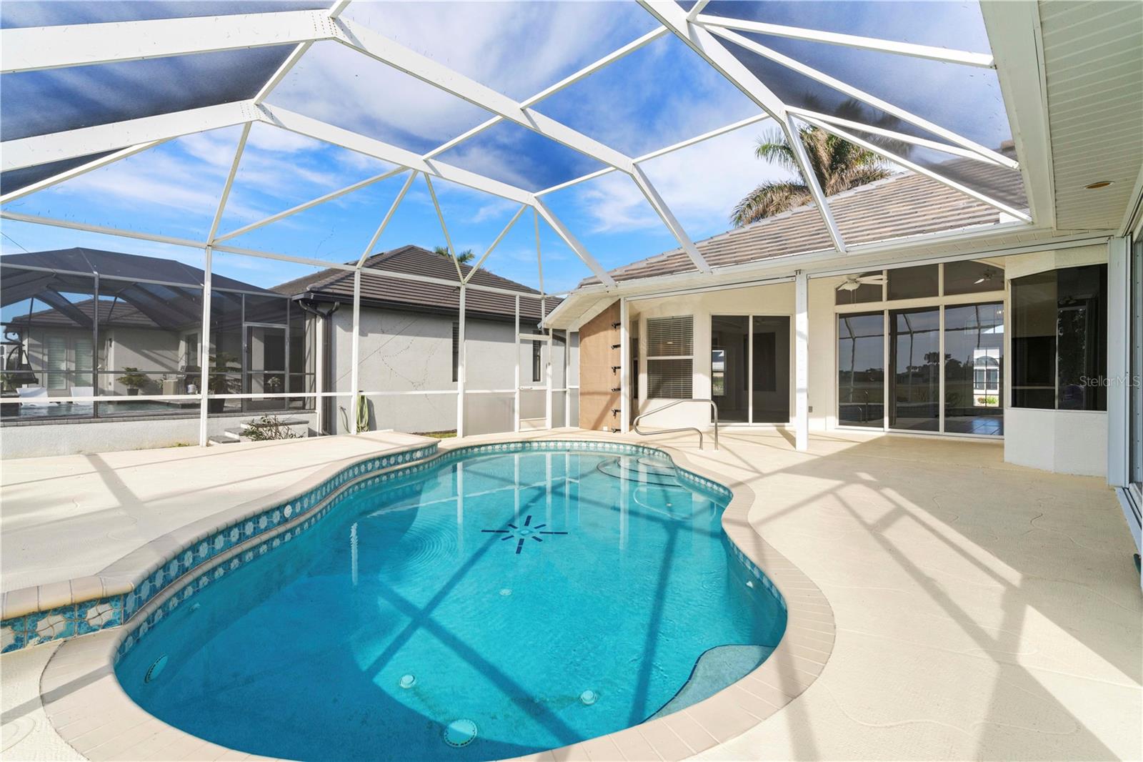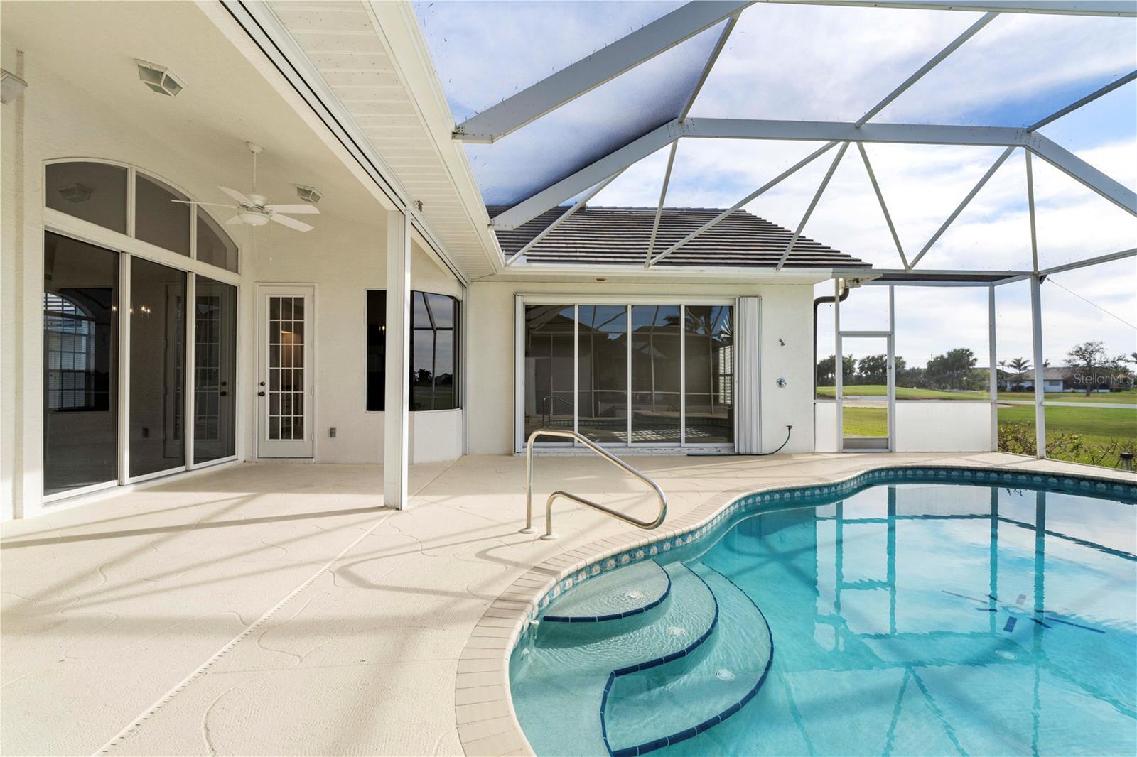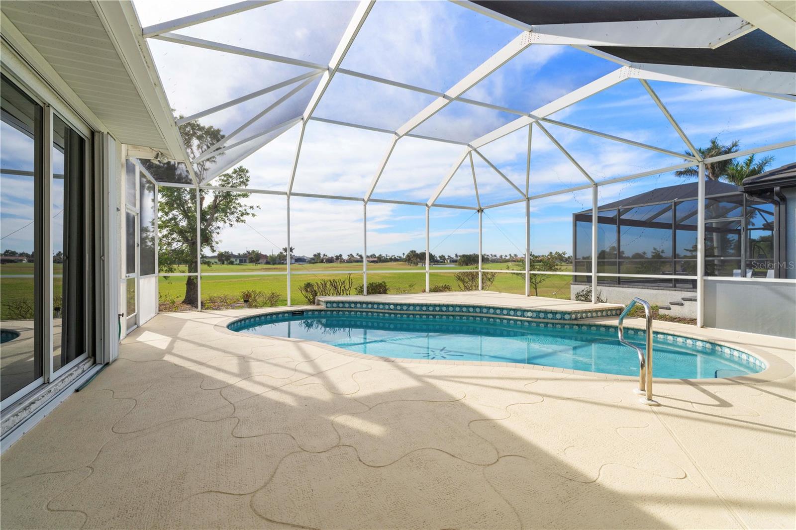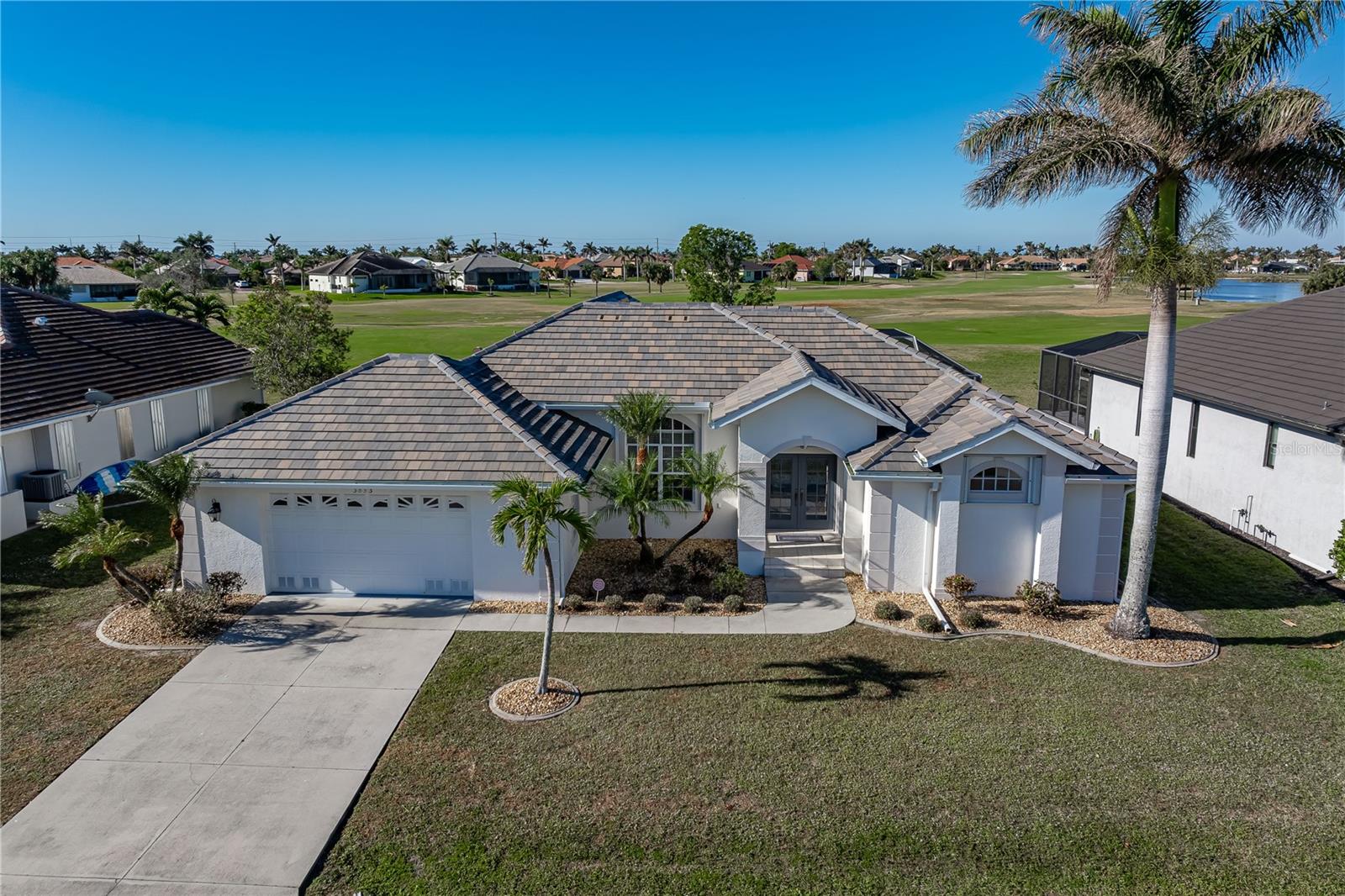 BURNT STORE ISLES POOL HOME W/**NEW ROOF** & AWESOME GOLF COURSE VIEWS Beautiful, 3 bed/2 bath home in BSI w/spectacular views of the 13th fairway & golf course lake beyond. Step through the double door entry into a spacious, open floor plan that includes a formal living & formal dining room plus a separate family room. Architectural details include tile flooring throughout living room, family room & kitchen, arched doorways, soaring cathedral ceilings, arched transom windows, decorative plant/display shelves, & columns in dining room. The living room boasts sliding glass doors that open to the lanai extending the living space outside. Large kitchen offers a breakfast bar, a built-in recipe desk & ample cabinet/counter space. Kitchen opens to a spacious family room w/sliders leading out to the lanai. The master suite features walk-out access to the lanai, two walk-in closets & a spa-like master bath w/dual sinks, garden tub & separate tiled shower. The split bedroom floor plan offers large guest rooms that share a guest bath. Each guest room boasts a large, walk-in closet. Step onto the lanai & enjoy the added outdoor living space complete w/in-ground, heated pool plus an outdoor shower. Sit back & enjoy watching the golfers pass by behind the home throughout the day. Other amenities include oversized attached, 2-car garage, security system & Kevlar screens + a mix of roll down, panels & accordion shutters for hurricane protection. Well-maintained, tropical landscaping surrounds the home. Burnt Store Isles is a deed-restricted, waterfront & golf community. Twin Isles Country Club is located in the center of the community. Practice your short & long game, brush up on your tennis strokes or simply enjoy the social setting. Burnt Store Marketplace anchors BSI offering a Publix, Home Depot & several other shops & restaurants. Get all our shopping done without leaving the neighborhood! Easy access to US41, I-75 & Burnt Store Rd allow you to reach Ft Myers, Cape Coral & Sarasota effortlessly. Take advantage of the active lifestyle available here in Punta Gorda by enjoying the numerous walking & biking trails as well as the many waterfront parks offering everything from playgrounds to pickle ball courts. Claim your spot in paradise.