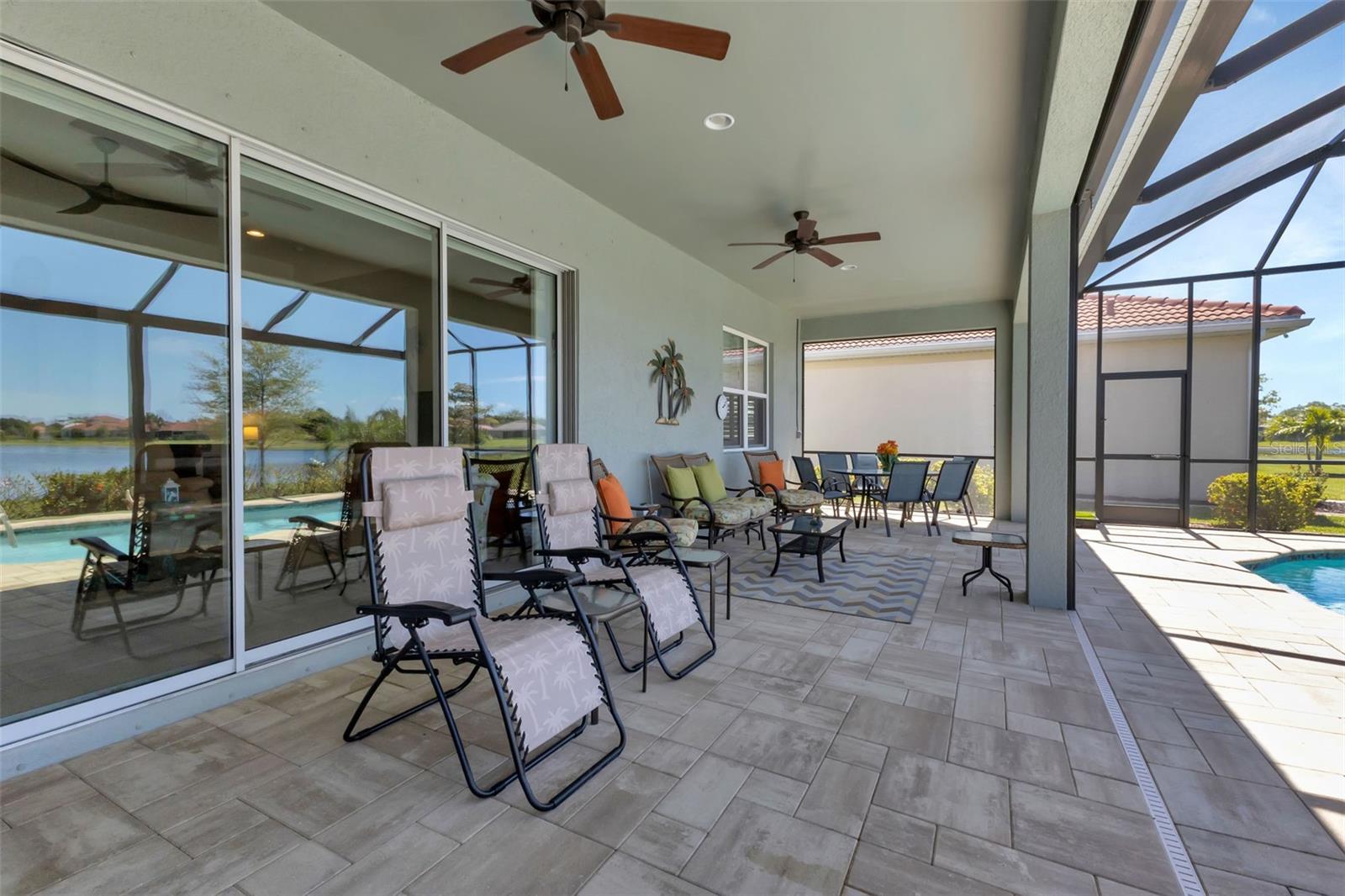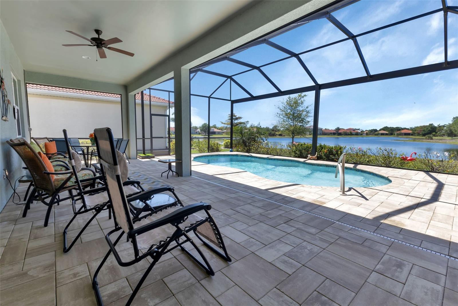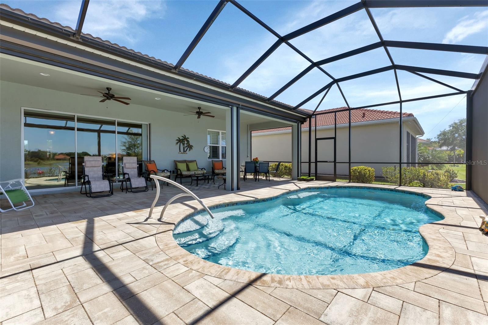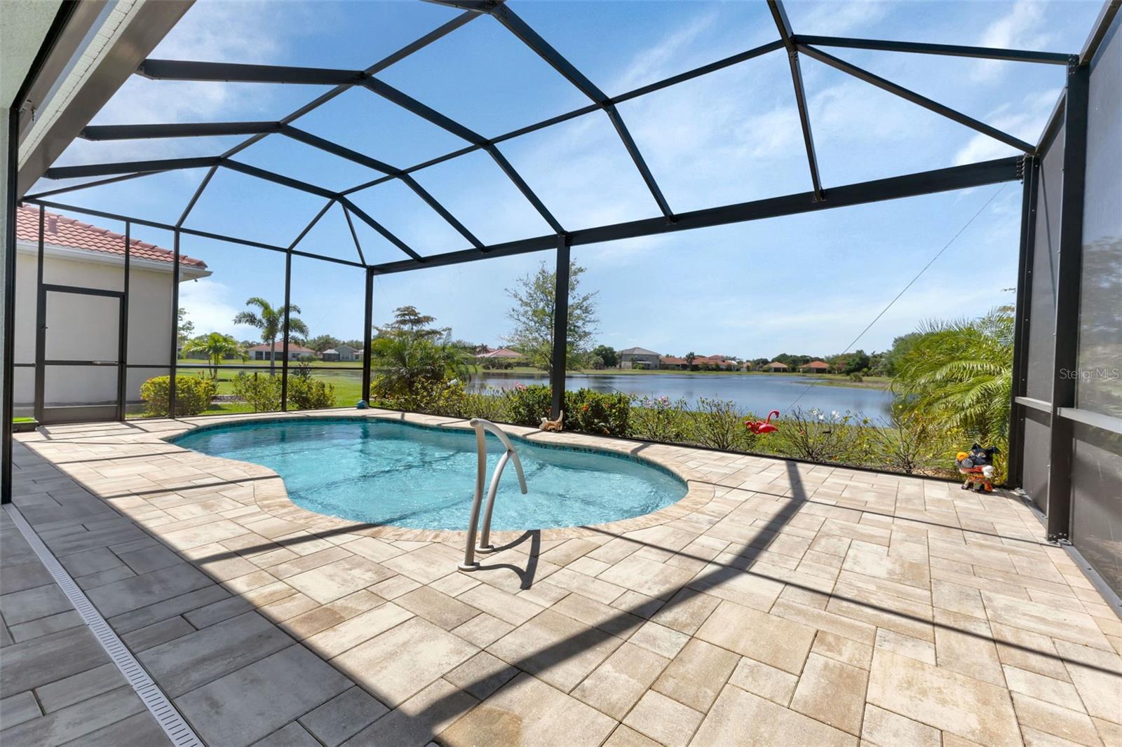 PICTURE PERFECT, adorable spacious 3BR, 2 full bath ranch home with POOL. AMAZING sunsets directly overlooking pool and wide lake, gorgeous views of birds, wildfowl, cranes, flamingo, heron, and more in the desirable gated community of RIVER CLUB SOUTH! MASSIVE lanai pool cage envelopes crystal clear saltwater kidney shape pool and surrounded by concrete pavers and that lake view. Three remote controlled Storm Smart remote hurricane shades in rear and side of home is for sun shade, hurricane/storm protection & added security. With Storm Smart shades all the way down - the lanai is separated into two sections - the covered part of the lanai and the pool part of the lanai. House is being sold TURNKEY with a few exceptions. Front entrance is remote Storm Smart Hurricane shade for added storm protection with hurricane shutters for the other windows. Open Floor Plan in LR, DR, Kitchen with high ceilings and unobstructed pool and lake views. Photo's don't do the view justice - come and see and experience it for yourself. Granite countertops in Large Kitchen with plenty of cabinets, stainless steel appliances. Two oversized pantries off the kitchen hallway and large laundry room with heavy duty washer & dryer and laundry tub lead you in to the garage. Additional overhead storage in large 2 car garage with pull down privacy screen Primary bedroom with plantation shutters, is adjacent to living room, high ceilings, & ceiling fan will lead you in to the primary bath with stand up shower, private toilet, and two separate granite top sinks and cabinets; large linen closet plus generous size walk-in closet. Secondary bedrooms are located at front door entry way, with ceiling fans, closets, plantation shutters. Bathroom is separate but adjacent to hallway for access to both bedrooms. HOA fee includes internet and basic TV service, sprinkler system watering, mulching, weekly grass cutting/pruning for landscaping in front and sides of this never rented home. River Club South, separate from the north section has a community pool, playground, meeting room, and workout room. Seller is licensed REALTOR in MD and DE. In 5 minutes visit SUNSEEKER RESORT for fine dining, bars, shops and extravagant Peace River waterfront hotel that opened in 2024. Drive over Peace River Bridge on Rt 41 into Punta Gorda for great shopping, restaurants, bistros, community walkways, waterfront Tiki Bar, and the Convention Center . Discover Fisherman's Village festively decorated for holidays with fine shops, restaurants a lovely beach Tiki Bar with entertainment. Catch the glorious sunsets and relax.