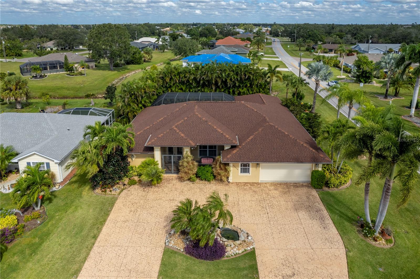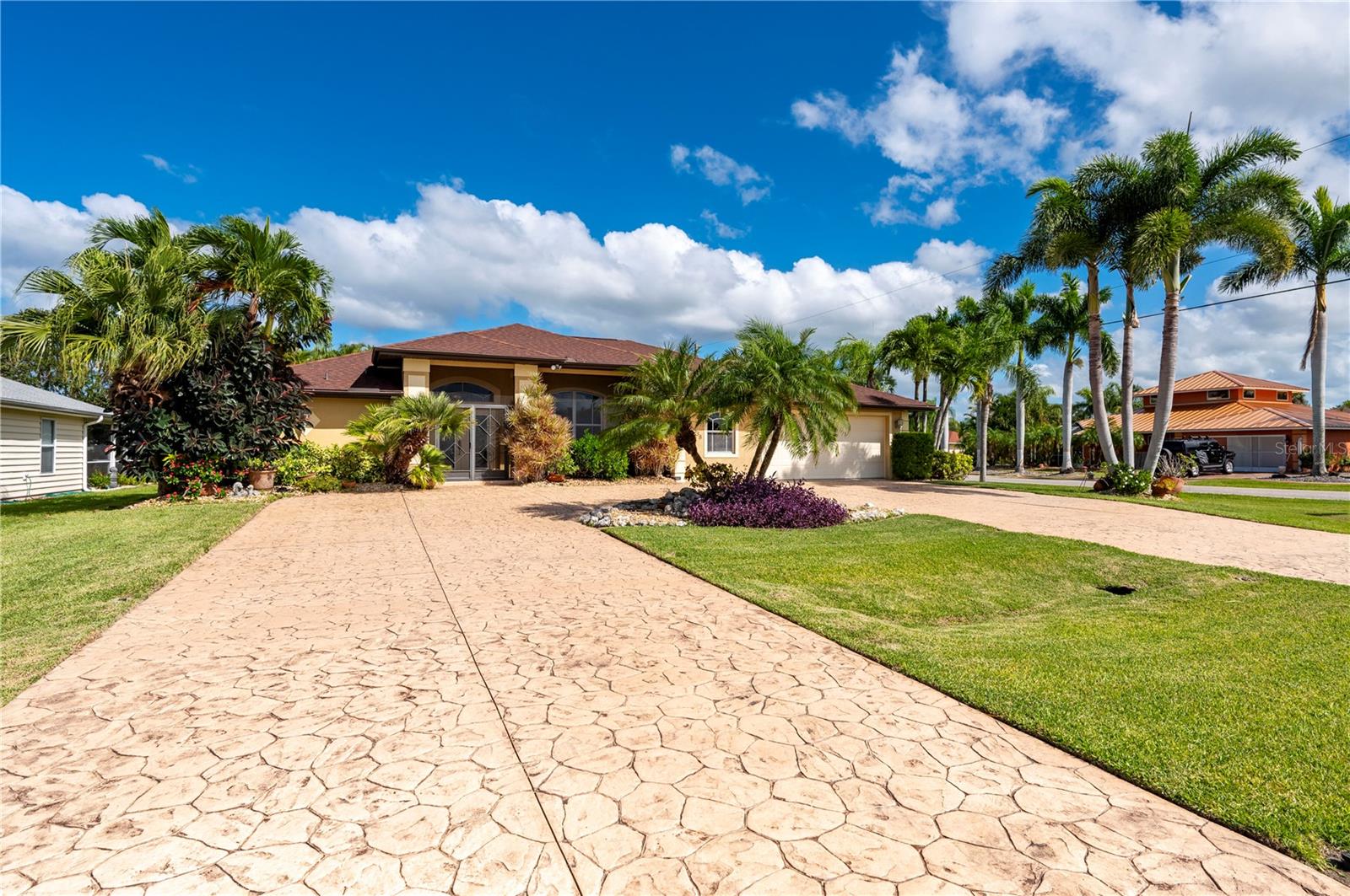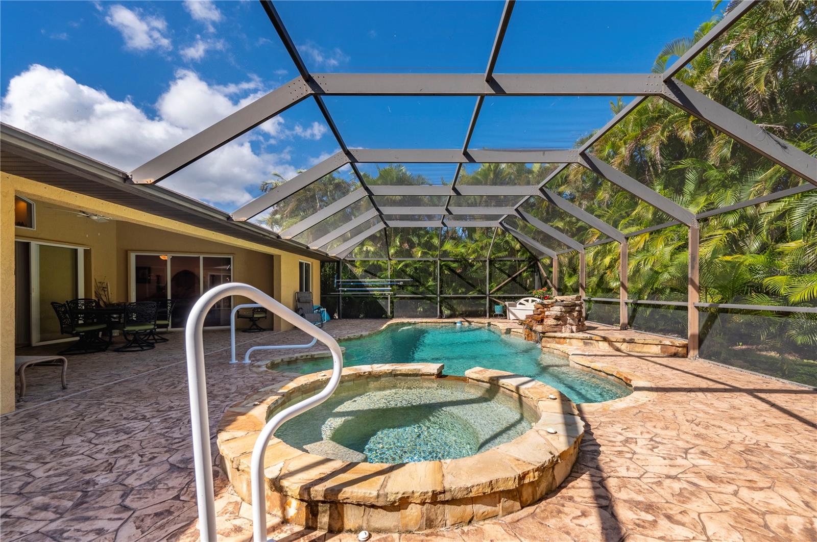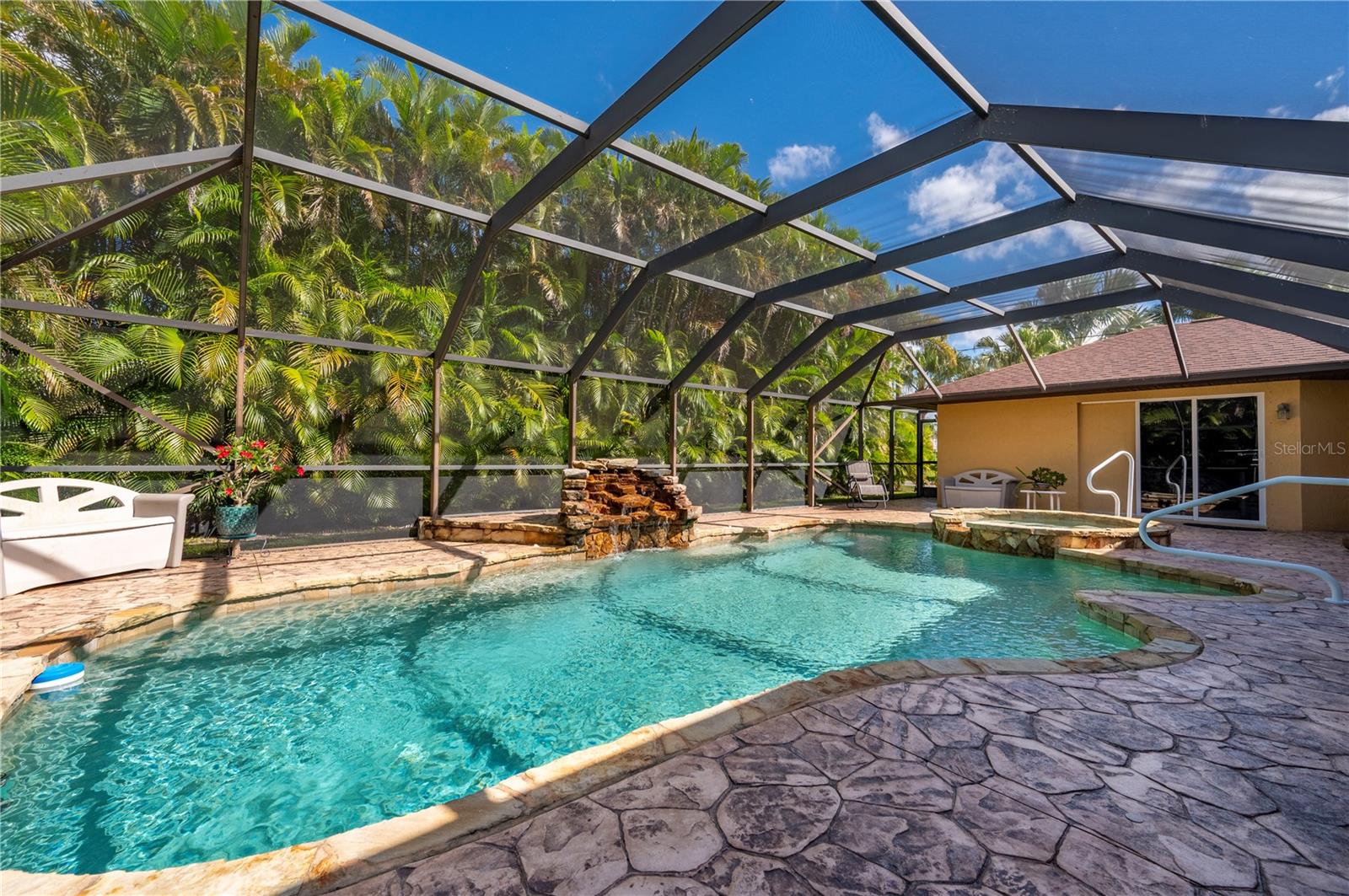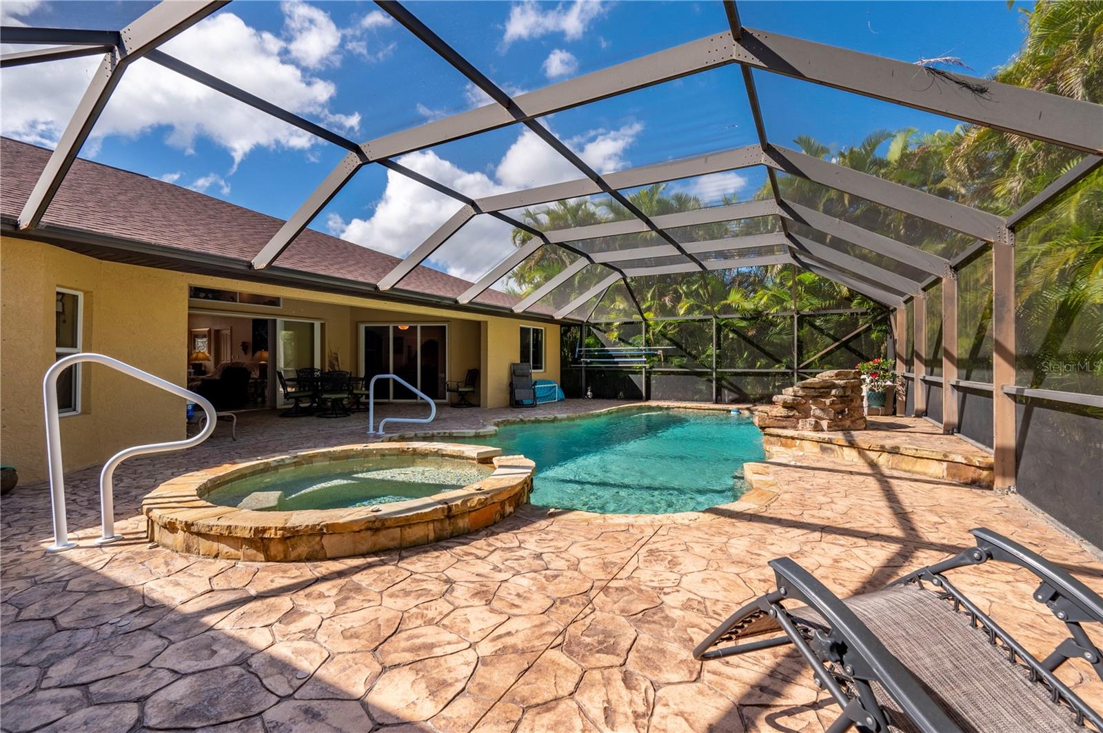 Impressive custom POOL HOME located in the desirable deed restricted golf community of DEEP CREEK. This home is situated on an oversized corner lot with greenbelt in the rear. NOT in a flood zone. This light and bright home offers an open and split bedroom floor plan with 3 spacious bedrooms, 2 full bathrooms, attached 2 Car Garage, 24x7 screened Front Porch, Foyer, Great Room with Dining Area, well appointed Kitchen, Inside Laundry. The Great Room has a high ceiling, plant shelves, tile flooring, pocket sliding glass doors with transom window to the lanai, and a column separates the Great Room from the Dining Area. The Kitchen features wood cabinets, granite counters, tile floor, stainless appliances (French door refrigerator, dishwasher, oven/range, microwave) and dining area overlooking the pool and greenbelt. The Inside Laundry offers front loading washer and front loading dryer, cabinets and sink. The Master Bedroom suite is quite large and offers a seating area, two walk in closets, raised ceiling, sliding glass doors to the lanai, and private bathroom with Roman shower, garden tub, dual sinks with vanity area between the sinks to apply your makeup. The second bedroom is also quite spacious- master bedroom size - and has two double closets and plant shelves. The third bedroom with double closet, vaulted ceiling, sliding glass doors to the lanai and tile floor is 20x18 and could easily function as a Family Room if that is your preference. The guest bathroom has a walk in shower and large vanity. Your living space extends via sliding glass doors to the screened Lanai with 25x12 heated inground saltwater pool (6 feet in the deep end) with stunning stone waterfall and attached heated inground spa. There is a large covered area on the lanai with vaulted ceiling as well as plenty of deck for sunbathing. Other features include large circular driveway, fountain in the front yard, double door entry with transom window, Foyer with tile flooring and mosaic design, well for lawn irrigation, mature tropical landscaping, Hurricane Shutters, workshop in garage. **NEW ROOF July 2022 (2 months before Hurricane Ian)** Most furnishings will convey if the buyer wants them (such as the sound system, two bedroom sets, breakfront in the Dining Room, Patio furniture and more). Art work does not convey. This home is minutes from Golf, shopping, dining, entertainment, I-75 and is a short drive to medical care and waterfront parks. This home is perfect for a family or those expecting lots of winter visitors!