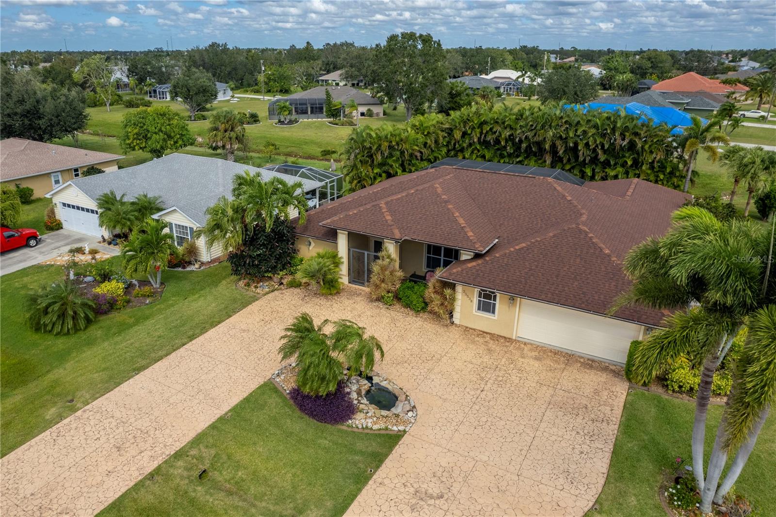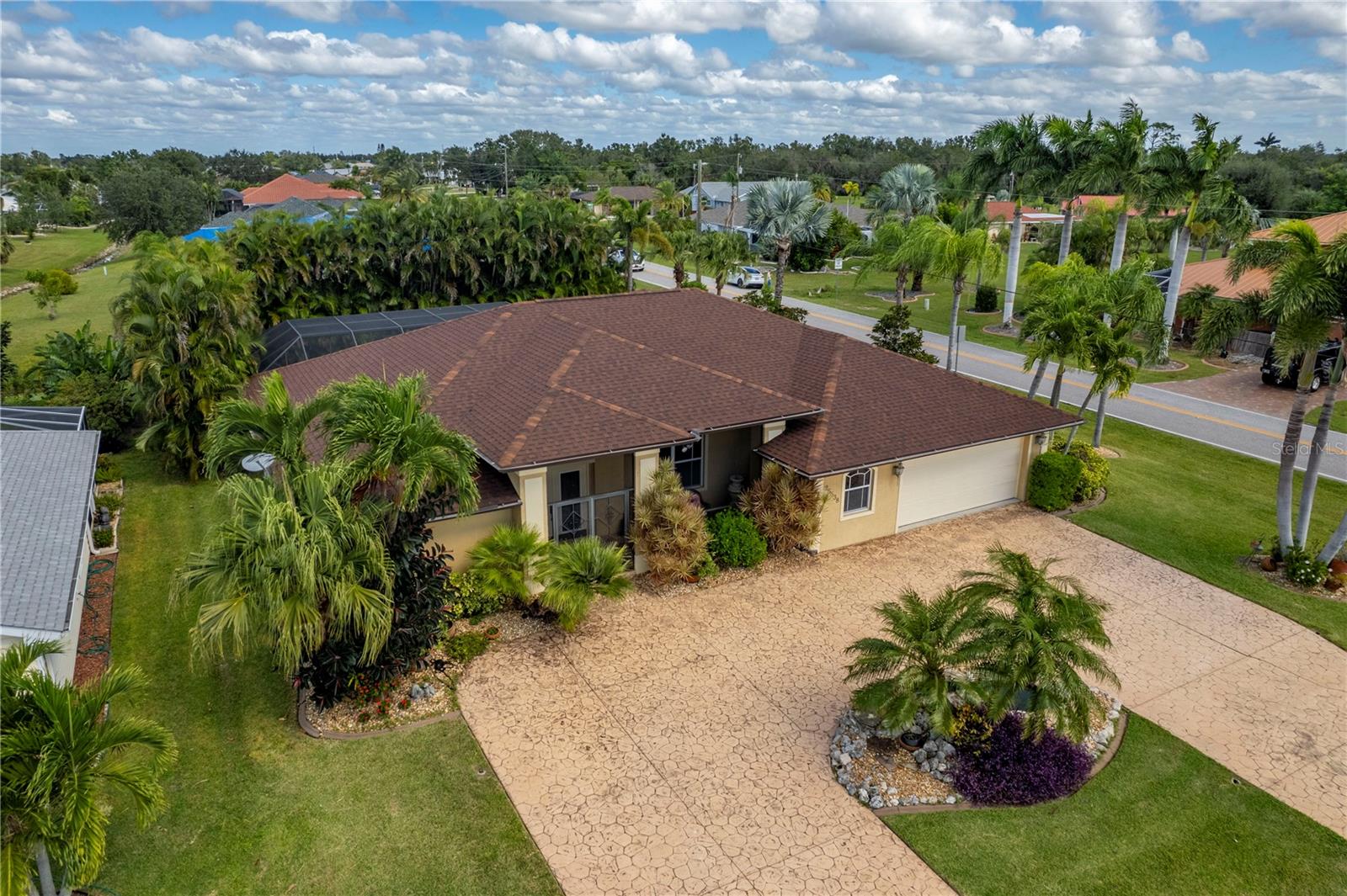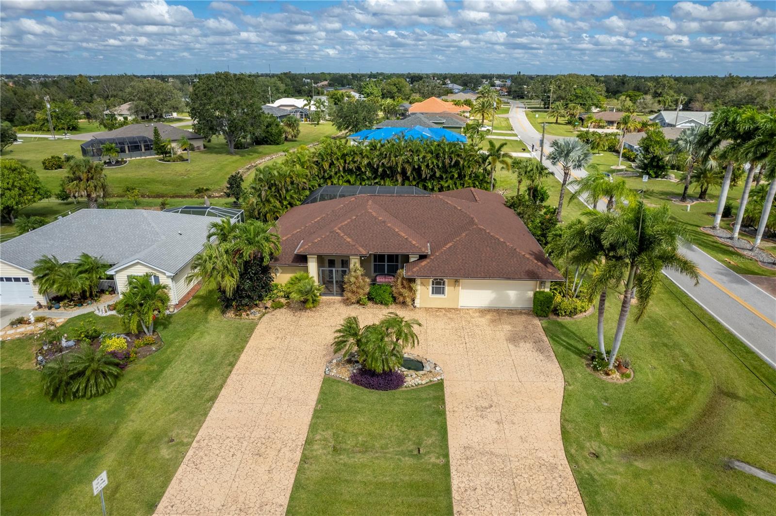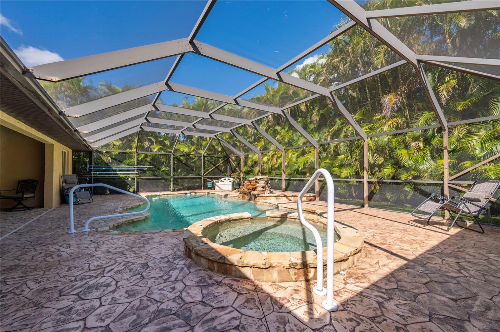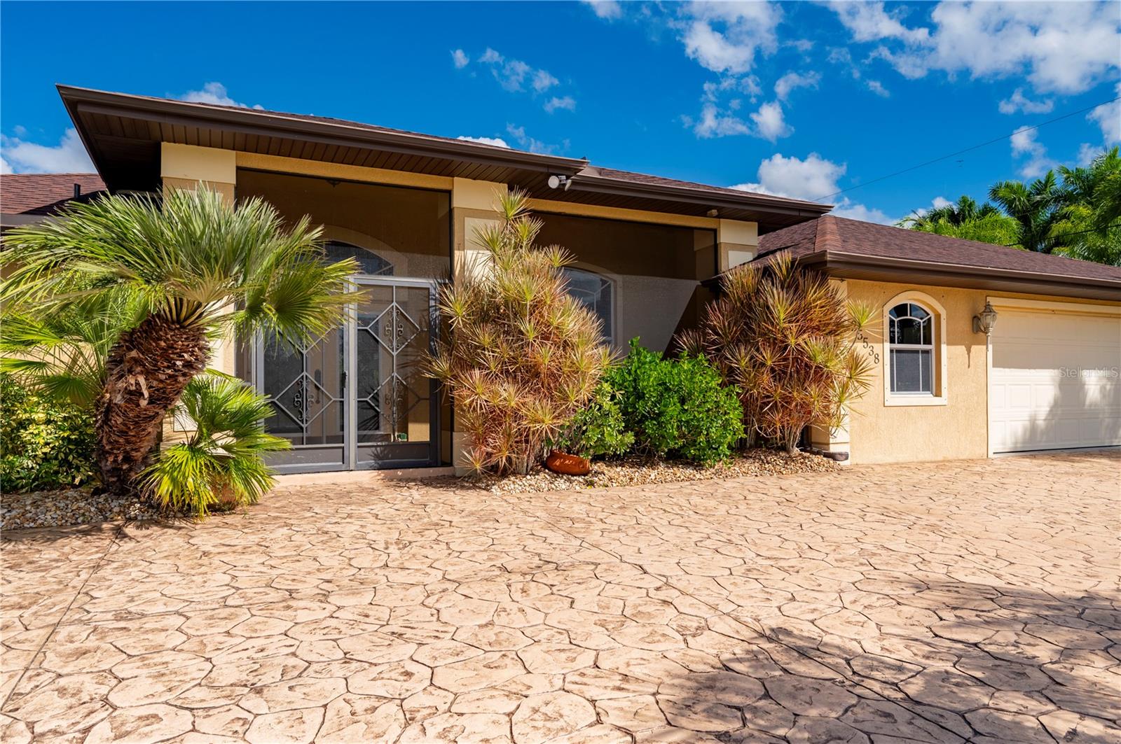 Impressive custom POOL HOME located in the desirable deed restricted golf community of DEEP CREEK. This home is situated on an oversized corner lot with greenbelt in the rear. NOT in a flood zone. This light and bright home offers an open and split bedroom floor plan with 3 spacious bedrooms, 2 full bathrooms, attached 2 Car Garage, 24x7 screened Front Porch, Foyer, Great Room with Dining Area, well appointed Kitchen, Inside Laundry. The Great Room has a high ceiling, plant shelves, tile flooring, pocket sliding glass doors with transom window to the lanai, and a column separates the Great Room from the Dining Area. The Kitchen features wood cabinets, granite counters, tile floor, stainless appliances (French door refrigerator, dishwasher, oven/range, microwave) and dining area overlooking the pool and greenbelt. The Inside Laundry offers front loading washer and front loading dryer, cabinets and sink. The Master Bedroom suite is quite large and offers a seating area, two walk in closets, raised ceiling, sliding glass doors to the lanai, and private bathroom with Roman shower, garden tub, dual sinks with vanity area between the sinks to apply your makeup. The second bedroom is also quite spacious- master bedroom size - and has two double closets and plant shelves. The third bedroom with double closet, vaulted ceiling, sliding glass doors to the lanai and tile floor is 20x18 and could easily function as a Family Room if that is your preference. The guest bathroom has a walk in shower and large vanity. Your living space extends via sliding glass doors to the screened Lanai with 25x12 heated inground saltwater pool (6 feet in the deep end) with stunning stone waterfall and attached heated inground spa. There is a large covered area on the lanai with vaulted ceiling as well as plenty of deck for sunbathing. Other features include large circular driveway, fountain in the front yard, double door entry with transom window, Foyer with tile flooring and mosaic design, well for lawn irrigation, mature tropical landscaping, Hurricane Shutters, workshop in garage. **NEW ROOF July 2022 (2 months before Hurricane Ian)** Most furnishings will convey if the buyer wants them (such as the sound system, two bedroom sets, breakfront in the Dining Room, Patio furniture and more). Art work does not convey. This home is minutes from Golf, shopping, dining, entertainment, I-75 and is a short drive to medical care and waterfront parks. This home is perfect for a family or those expecting lots of winter visitors!