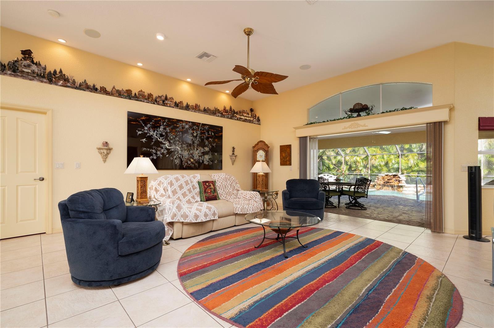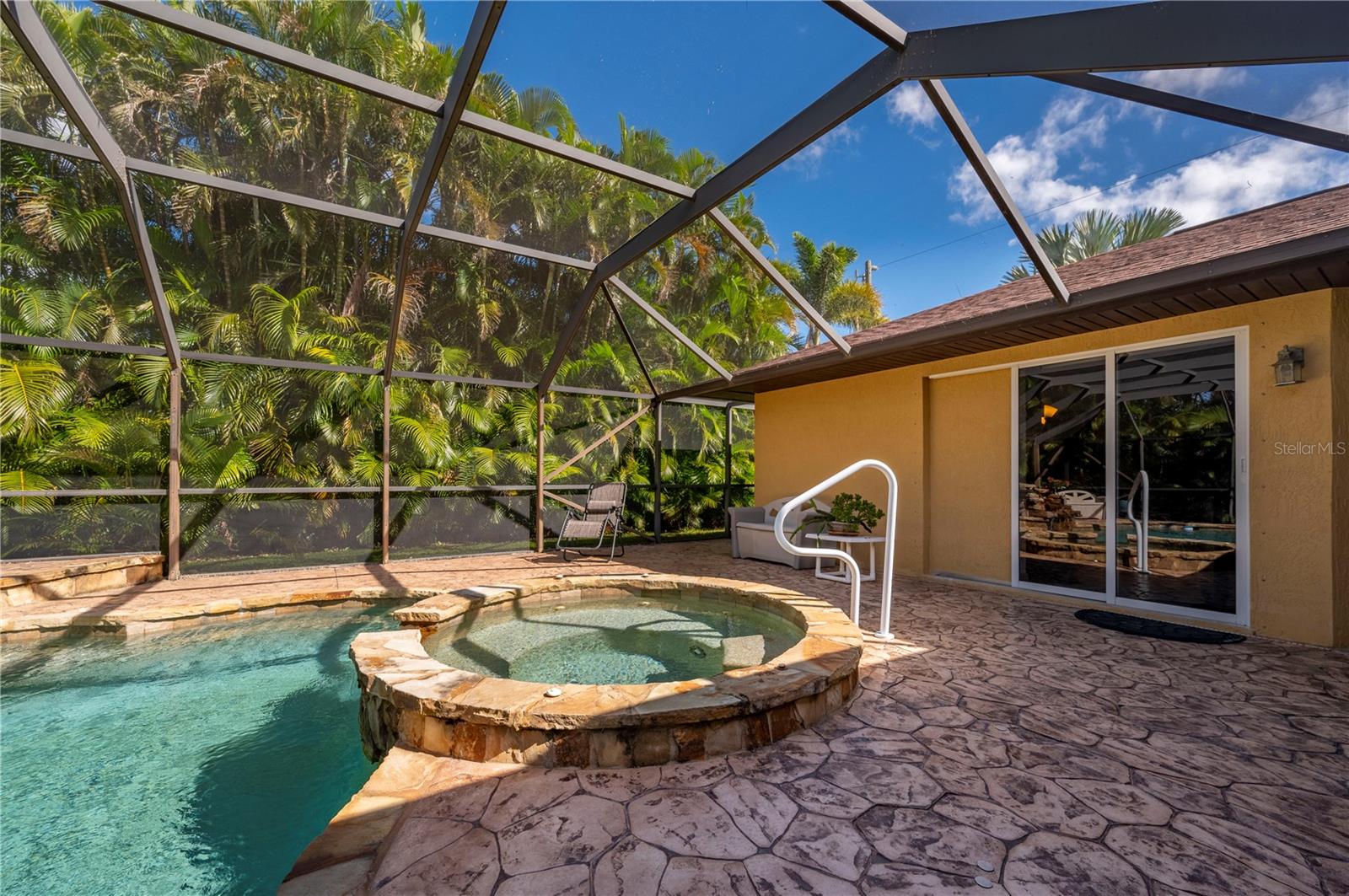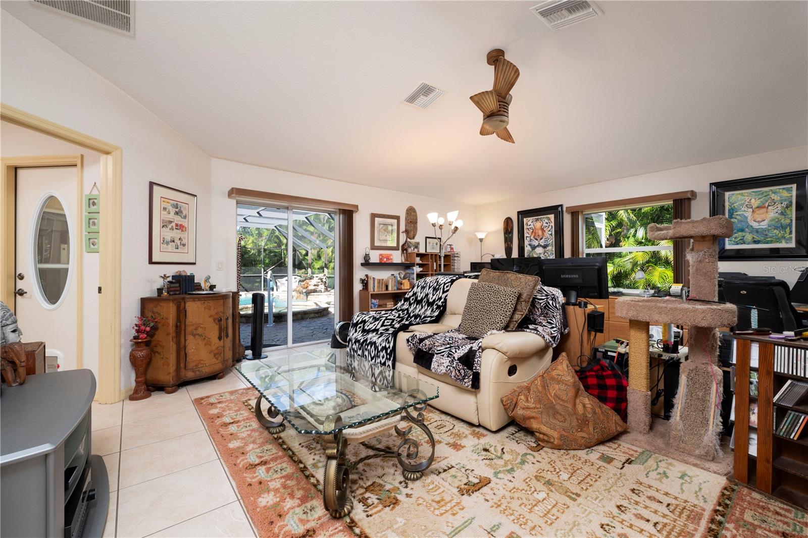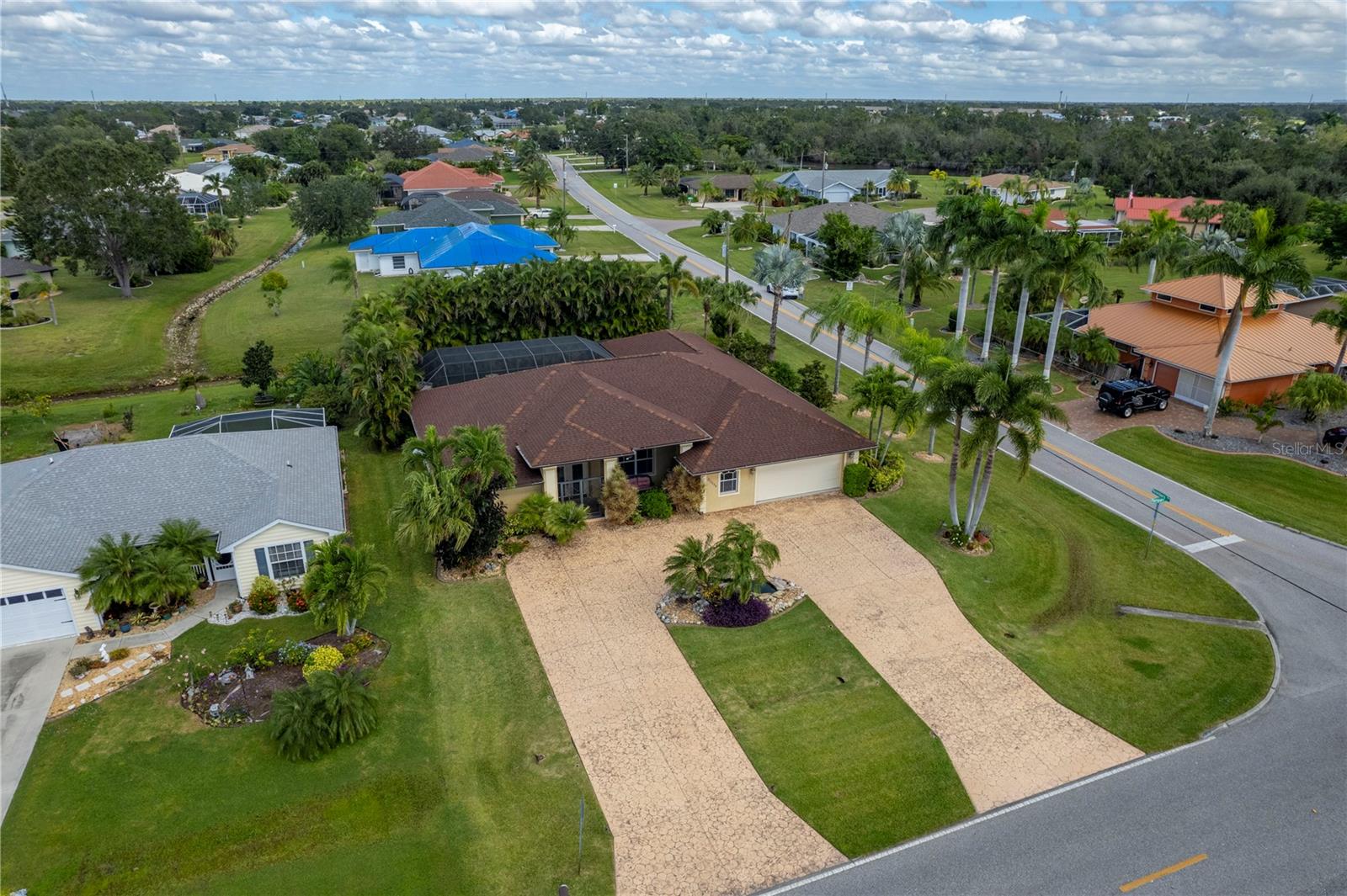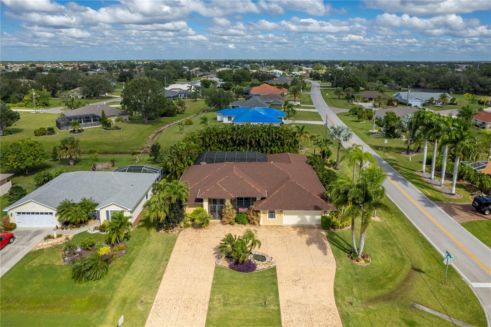 Impressive custom POOL HOME located in the desirable deed restricted golf community of DEEP CREEK. This home is situated on an oversized corner lot with greenbelt in the rear. NOT in a flood zone. This light and bright home offers an open and split bedroom floor plan with 3 spacious bedrooms, 2 full bathrooms, attached 2 Car Garage, 24x7 screened Front Porch, Foyer, Great Room with Dining Area, well appointed Kitchen, Inside Laundry. The Great Room has a high ceiling, plant shelves, tile flooring, pocket sliding glass doors with transom window to the lanai, and a column separates the Great Room from the Dining Area. The Kitchen features wood cabinets, granite counters, tile floor, stainless appliances (French door refrigerator, dishwasher, oven/range, microwave) and dining area overlooking the pool and greenbelt. The Inside Laundry offers front loading washer and front loading dryer, cabinets and sink. The Master Bedroom suite is quite large and offers a seating area, two walk in closets, raised ceiling, sliding glass doors to the lanai, and private bathroom with Roman shower, garden tub, dual sinks with vanity area between the sinks to apply your makeup. The second bedroom is also quite spacious- master bedroom size - and has two double closets and plant shelves. The third bedroom with double closet, vaulted ceiling, sliding glass doors to the lanai and tile floor is 20x18 and could easily function as a Family Room if that is your preference. The guest bathroom has a walk in shower and large vanity. Your living space extends via sliding glass doors to the screened Lanai with 25x12 heated inground saltwater pool (6 feet in the deep end) with stunning stone waterfall and attached heated inground spa. There is a large covered area on the lanai with vaulted ceiling as well as plenty of deck for sunbathing. Other features include large circular driveway, fountain in the front yard, double door entry with transom window, Foyer with tile flooring and mosaic design, well for lawn irrigation, mature tropical landscaping, Hurricane Shutters, workshop in garage. **NEW ROOF July 2022 (2 months before Hurricane Ian)** Most furnishings will convey if the buyer wants them (such as the sound system, two bedroom sets, breakfront in the Dining Room, Patio furniture and more). Art work does not convey. This home is minutes from Golf, shopping, dining, entertainment, I-75 and is a short drive to medical care and waterfront parks. This home is perfect for a family or those expecting lots of winter visitors!