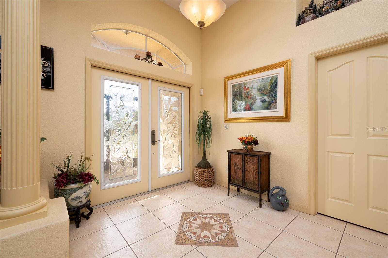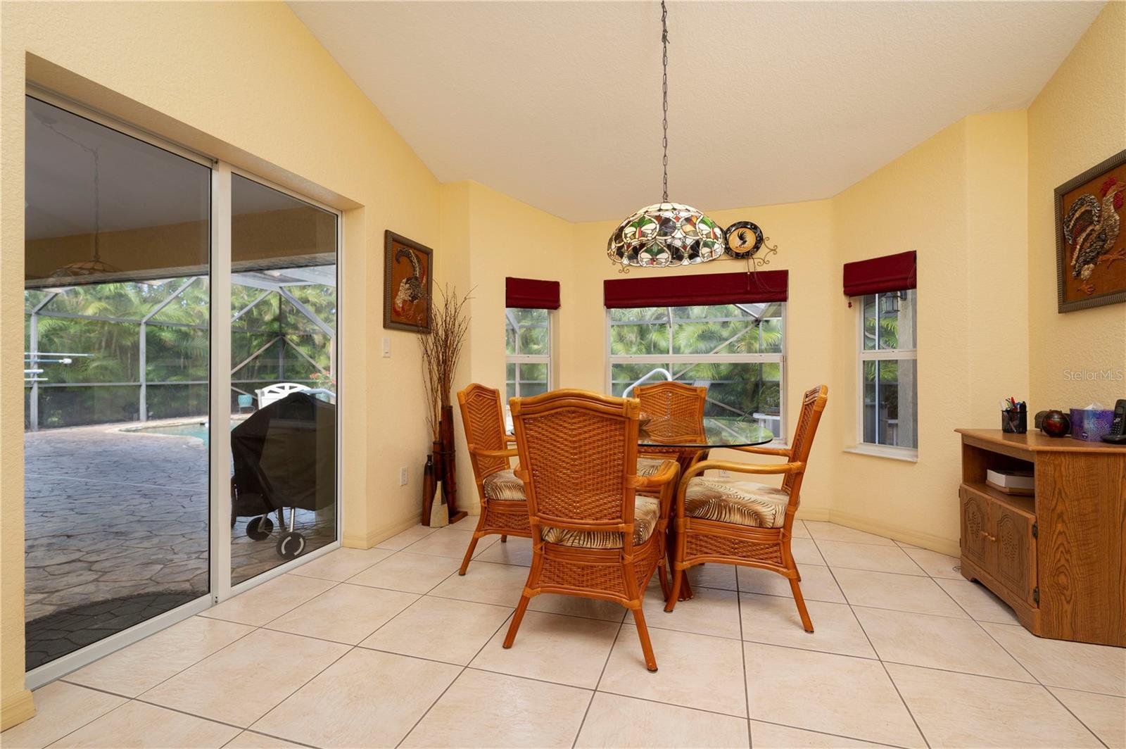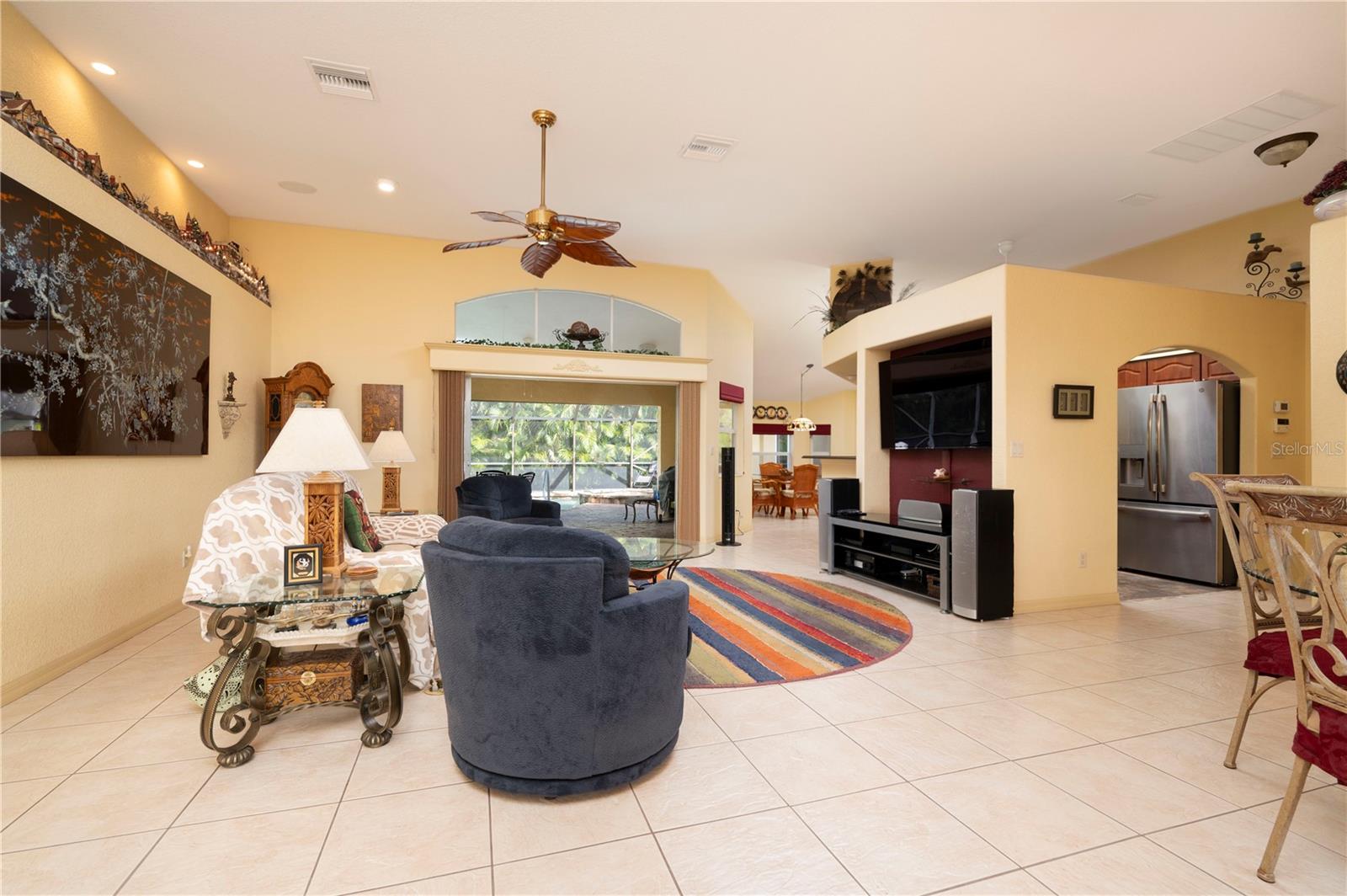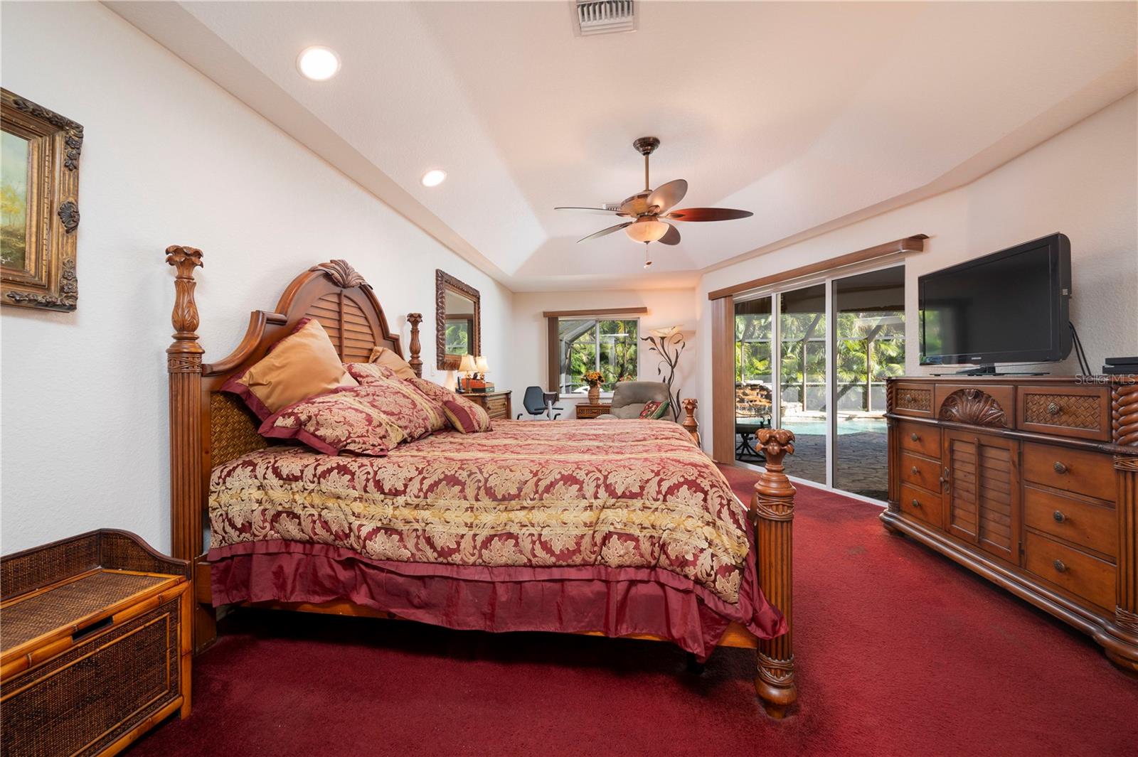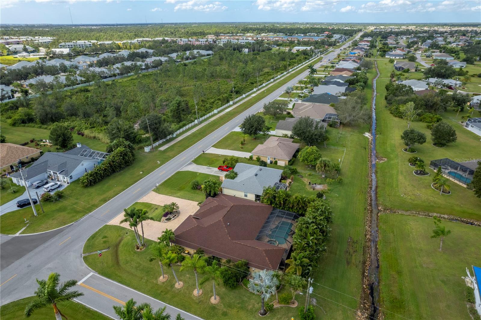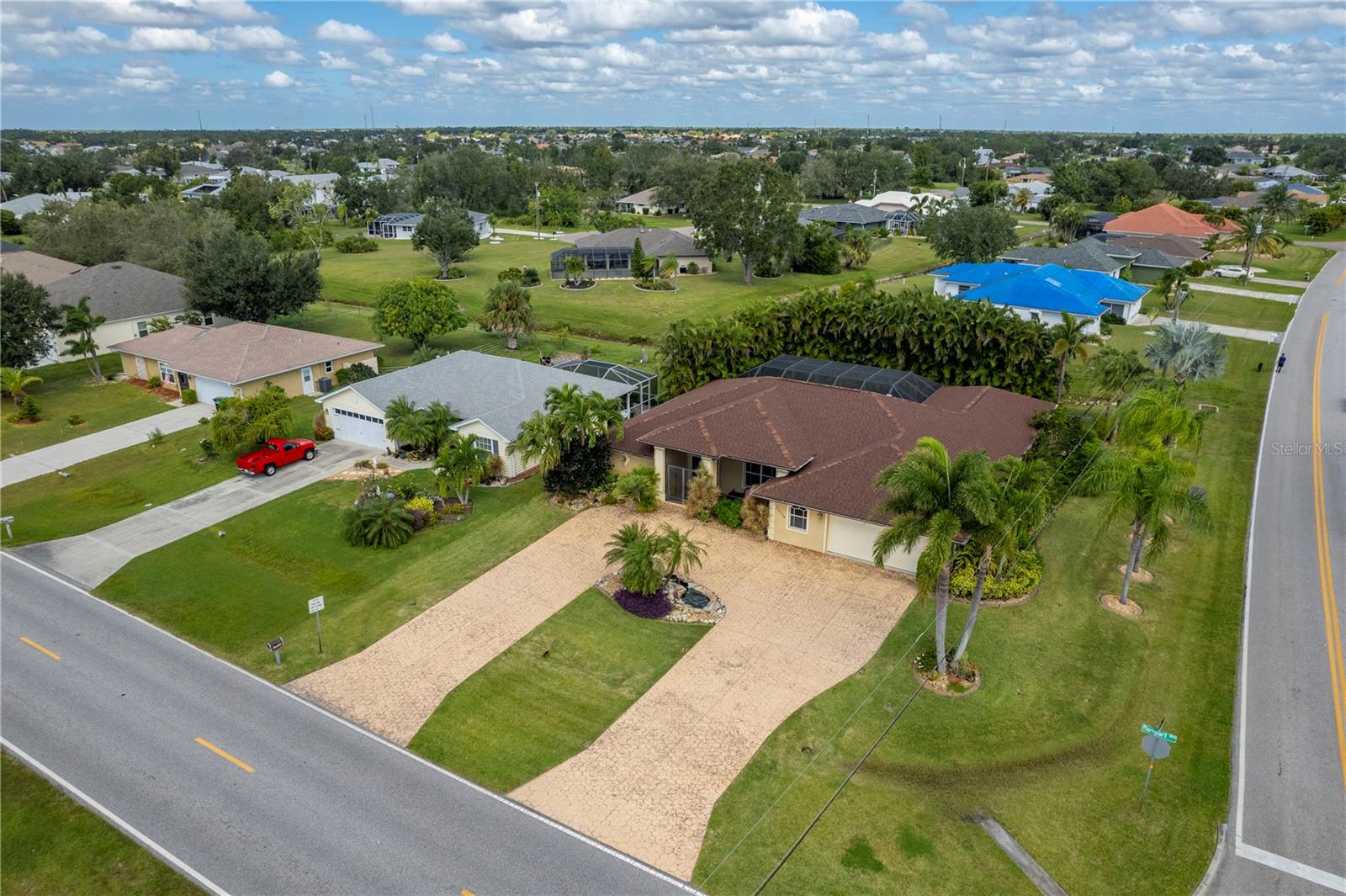 Impressive custom POOL HOME located in the desirable deed restricted golf community of DEEP CREEK. This home is situated on an oversized corner lot with greenbelt in the rear. NOT in a flood zone. This light and bright home offers an open and split bedroom floor plan with 3 spacious bedrooms, 2 full bathrooms, attached 2 Car Garage, 24x7 screened Front Porch, Foyer, Great Room with Dining Area, well appointed Kitchen, Inside Laundry. The Great Room has a high ceiling, plant shelves, tile flooring, pocket sliding glass doors with transom window to the lanai, and a column separates the Great Room from the Dining Area. The Kitchen features wood cabinets, granite counters, tile floor, stainless appliances (French door refrigerator, dishwasher, oven/range, microwave) and dining area overlooking the pool and greenbelt. The Inside Laundry offers front loading washer and front loading dryer, cabinets and sink. The Master Bedroom suite is quite large and offers a seating area, two walk in closets, raised ceiling, sliding glass doors to the lanai, and private bathroom with Roman shower, garden tub, dual sinks with vanity area between the sinks to apply your makeup. The second bedroom is also quite spacious- master bedroom size - and has two double closets and plant shelves. The third bedroom with double closet, vaulted ceiling, sliding glass doors to the lanai and tile floor is 20x18 and could easily function as a Family Room if that is your preference. The guest bathroom has a walk in shower and large vanity. Your living space extends via sliding glass doors to the screened Lanai with 25x12 heated inground saltwater pool (6 feet in the deep end) with stunning stone waterfall and attached heated inground spa. There is a large covered area on the lanai with vaulted ceiling as well as plenty of deck for sunbathing. Other features include large circular driveway, fountain in the front yard, double door entry with transom window, Foyer with tile flooring and mosaic design, well for lawn irrigation, mature tropical landscaping, Hurricane Shutters, workshop in garage. **NEW ROOF July 2022 (2 months before Hurricane Ian)** Most furnishings will convey if the buyer wants them (such as the sound system, two bedroom sets, breakfront in the Dining Room, Patio furniture and more). Art work does not convey. This home is minutes from Golf, shopping, dining, entertainment, I-75 and is a short drive to medical care and waterfront parks. This home is perfect for a family or those expecting lots of winter visitors!