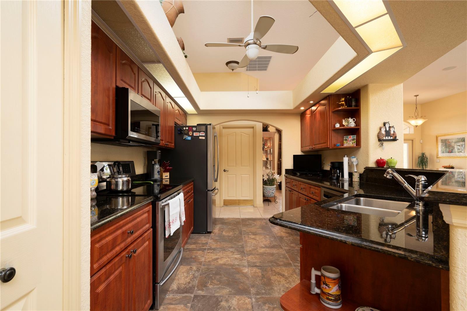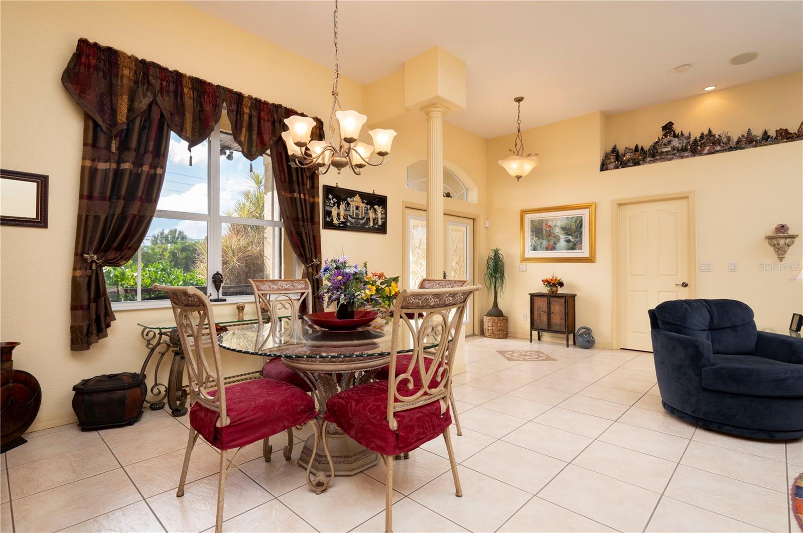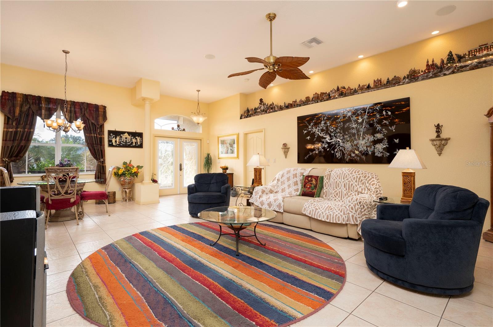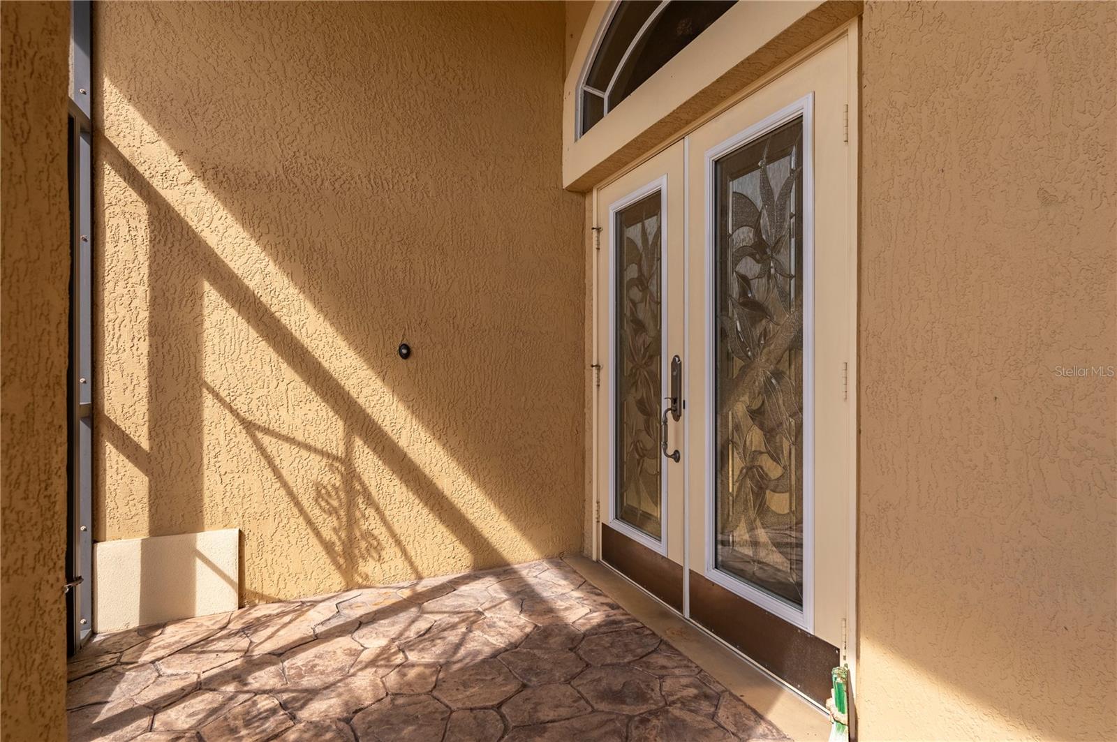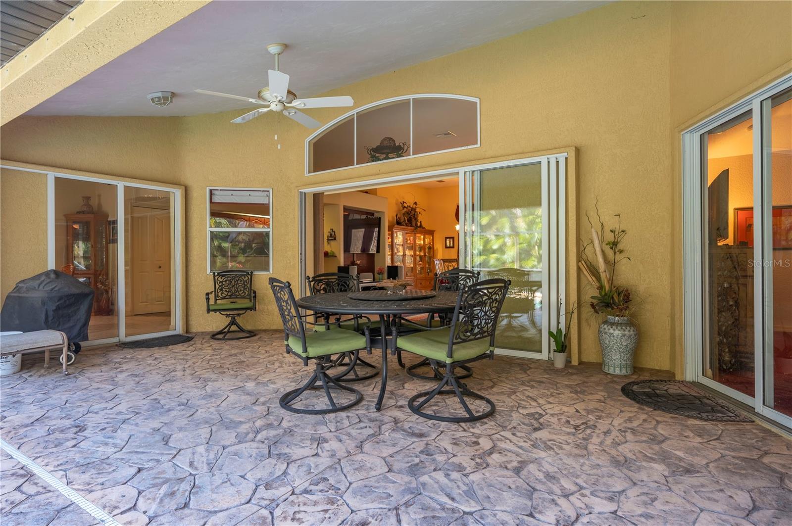 Impressive custom POOL HOME located in the desirable deed restricted golf community of DEEP CREEK. This home is situated on an oversized corner lot with greenbelt in the rear. NOT in a flood zone. This light and bright home offers an open and split bedroom floor plan with 3 spacious bedrooms, 2 full bathrooms, attached 2 Car Garage, 24x7 screened Front Porch, Foyer, Great Room with Dining Area, well appointed Kitchen, Inside Laundry. The Great Room has a high ceiling, plant shelves, tile flooring, pocket sliding glass doors with transom window to the lanai, and a column separates the Great Room from the Dining Area. The Kitchen features wood cabinets, granite counters, tile floor, stainless appliances (French door refrigerator, dishwasher, oven/range, microwave) and dining area overlooking the pool and greenbelt. The Inside Laundry offers front loading washer and front loading dryer, cabinets and sink. The Master Bedroom suite is quite large and offers a seating area, two walk in closets, raised ceiling, sliding glass doors to the lanai, and private bathroom with Roman shower, garden tub, dual sinks with vanity area between the sinks to apply your makeup. The second bedroom is also quite spacious- master bedroom size - and has two double closets and plant shelves. The third bedroom with double closet, vaulted ceiling, sliding glass doors to the lanai and tile floor is 20x18 and could easily function as a Family Room if that is your preference. The guest bathroom has a walk in shower and large vanity. Your living space extends via sliding glass doors to the screened Lanai with 25x12 heated inground saltwater pool (6 feet in the deep end) with stunning stone waterfall and attached heated inground spa. There is a large covered area on the lanai with vaulted ceiling as well as plenty of deck for sunbathing. Other features include large circular driveway, fountain in the front yard, double door entry with transom window, Foyer with tile flooring and mosaic design, well for lawn irrigation, mature tropical landscaping, Hurricane Shutters, workshop in garage. **NEW ROOF July 2022 (2 months before Hurricane Ian)** Most furnishings will convey if the buyer wants them (such as the sound system, two bedroom sets, breakfront in the Dining Room, Patio furniture and more). Art work does not convey. This home is minutes from Golf, shopping, dining, entertainment, I-75 and is a short drive to medical care and waterfront parks. This home is perfect for a family or those expecting lots of winter visitors!