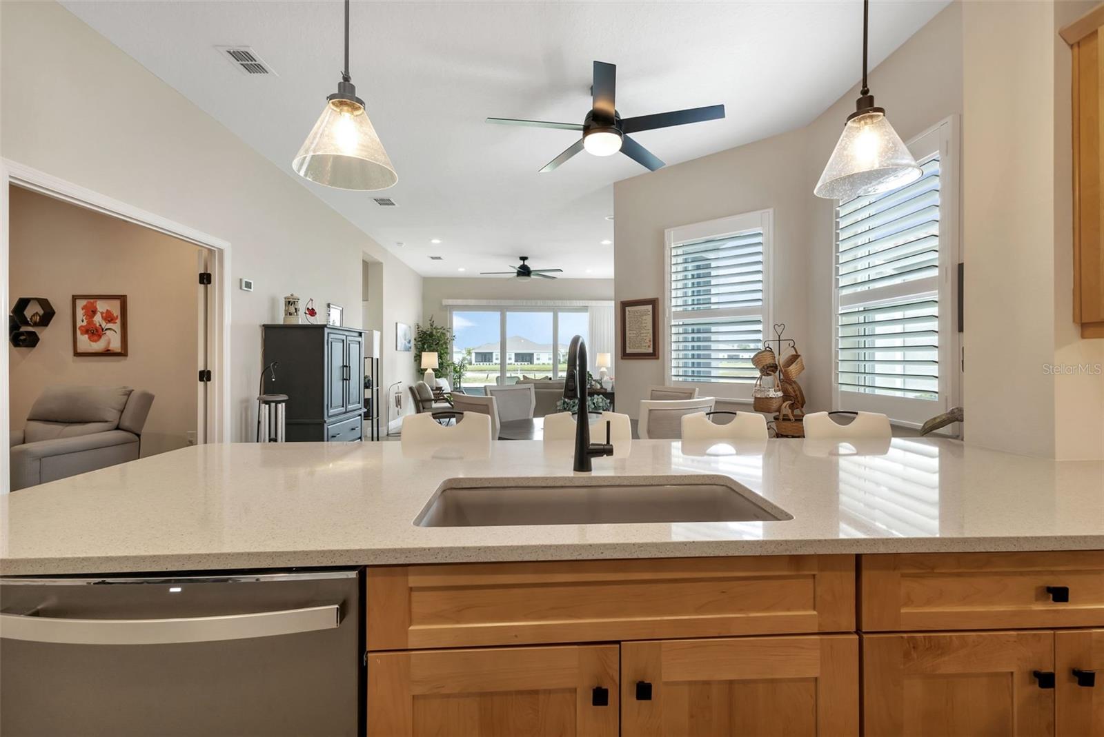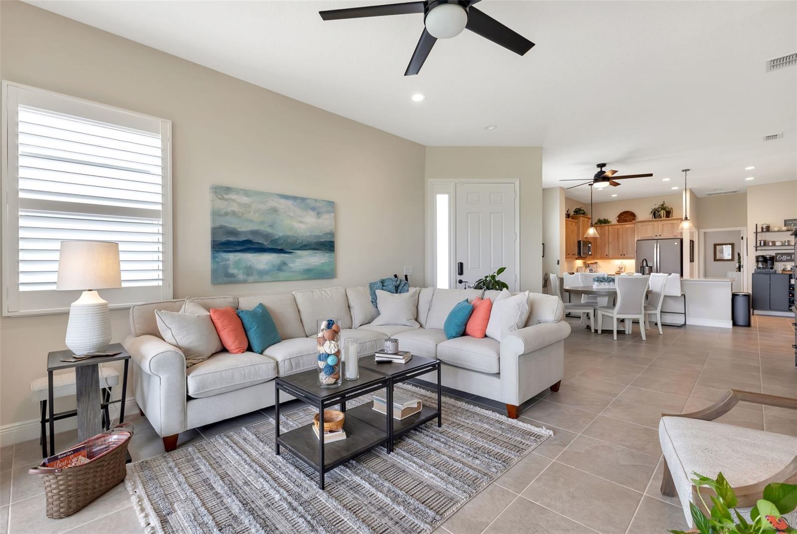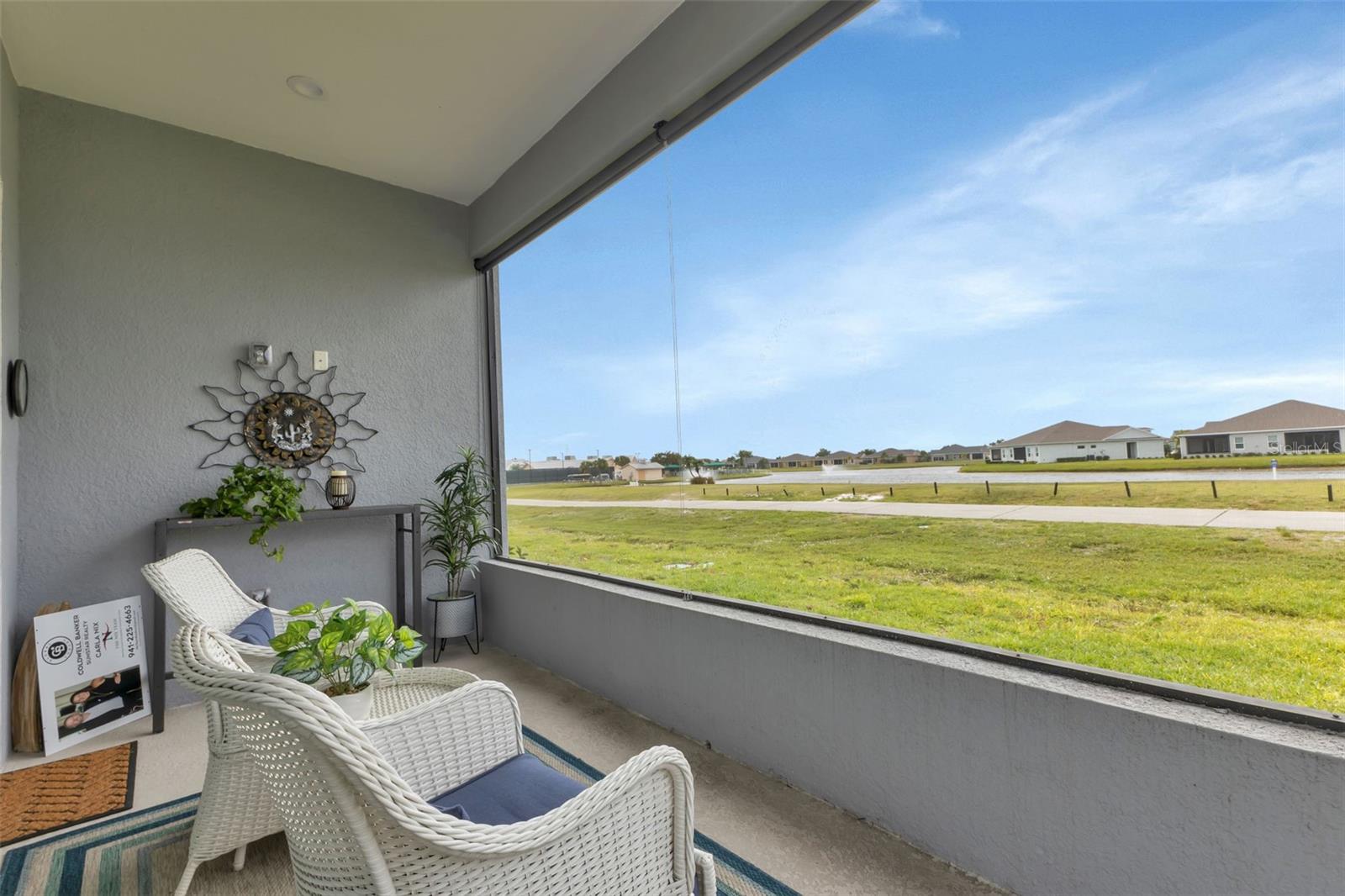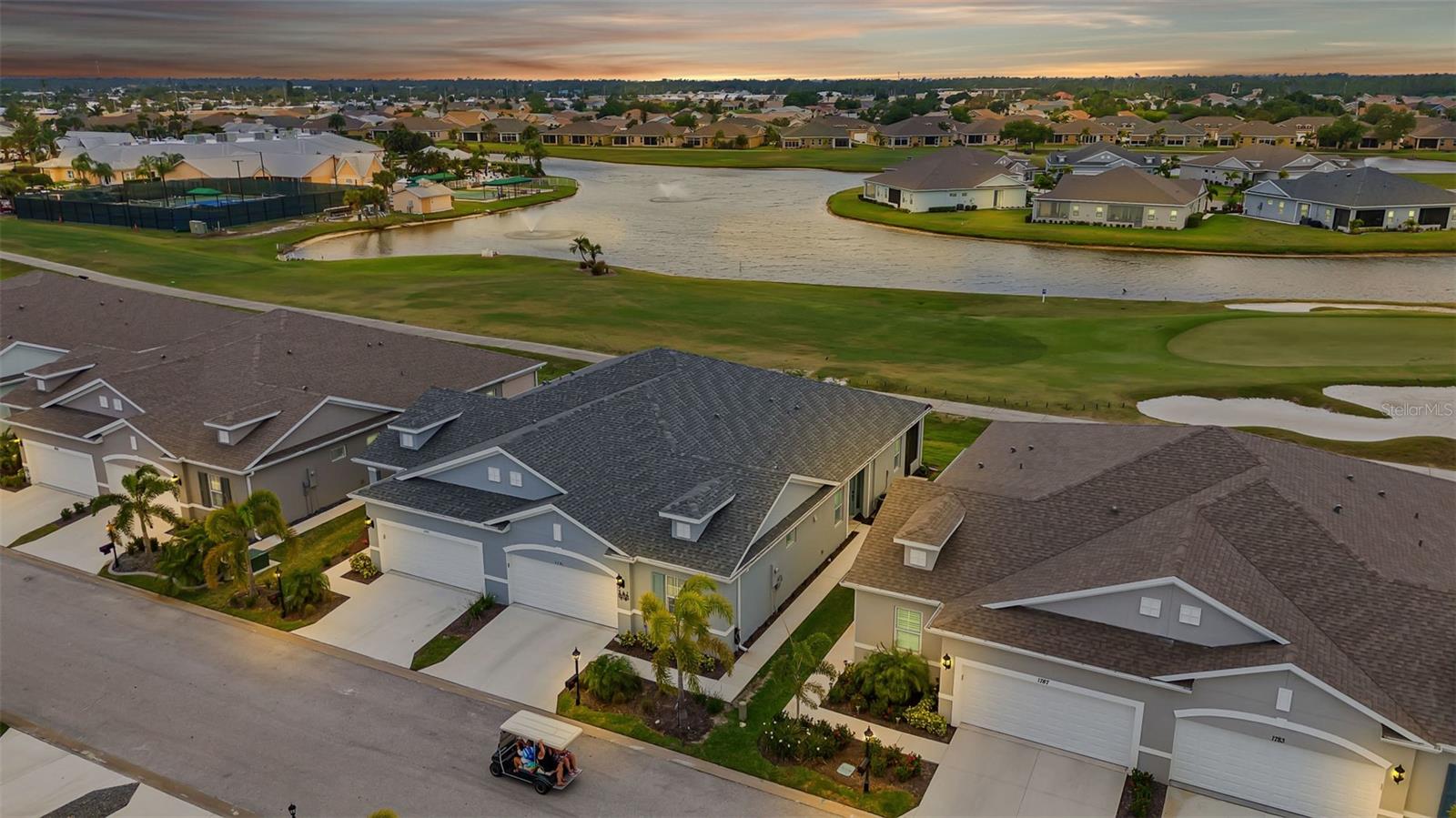 NO DAMAGE OR FLOODING IN UNIT FROM HURRICANE MILTON OR HELENE. BEAUTIFUL 10th Hole Golf Course & Water Views AWAIT from this 2023 Built NEW VILLA with tons of upgrades at 55+ Kings Gate Community! Inside, find large format tile throughout, plantation shutters, quartz countertops, real wood cabinets, upgraded light fixtures, upgraded pulls, a screened lanai, and more! This VENETIAN FLOOR PLAN boasts 1660 square feet, the largest floor plan by Neal Communities, and is thoughtfully arranged with great spaces and natural light. Inside the front door, enjoy a spacious living room with sliding glass doors to the lanai to watch the golfers or the ducks in the pond. This room is open to the dinette and large eat-in kitchen with beautiful finishes! Off the back side of the kitchen, find a conveniently located guest bathroom with lovely appointments, also nearby to the guest bedroom with great storage and natural light. Also off the kitchen enjoy a MASSIVE laundry room with sink/extra cabinets and also access to the 2 car garage with extra storage. Back off the living room, find the primary suite tucked away privately, with a large bedroom, walk in closets, and an en-suite bathroom with stone counters, dual vanities, a private toilet room and a large walk-in shower with glass surround. This villa is close to all things Kings Gate, including the amenities center, restaurant, golf, billiards, exercise rooms, pool, spa, all with a full-time activities director and more! With 24-hour gated security and the ability to ride your golf cart in the neighborhood and to nearby shops and restaurants, it is an ideal location! Additionally, this community is convenient to all things Port Charlotte and Punta Gorda for fishing, shopping, hospitals, golf, and more. It is nearby to I-75 and the PGD airport for easy travel access. Schedule your showing today! BE SURE TO CLICK THE FULL VIRTUAL TOUR LINKS FOR DETAILS