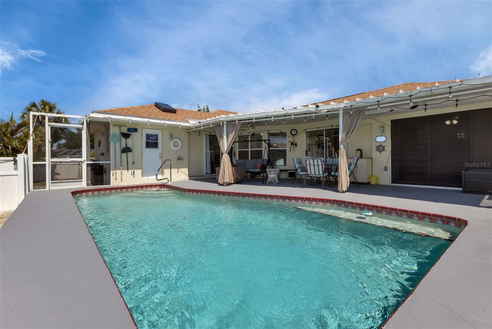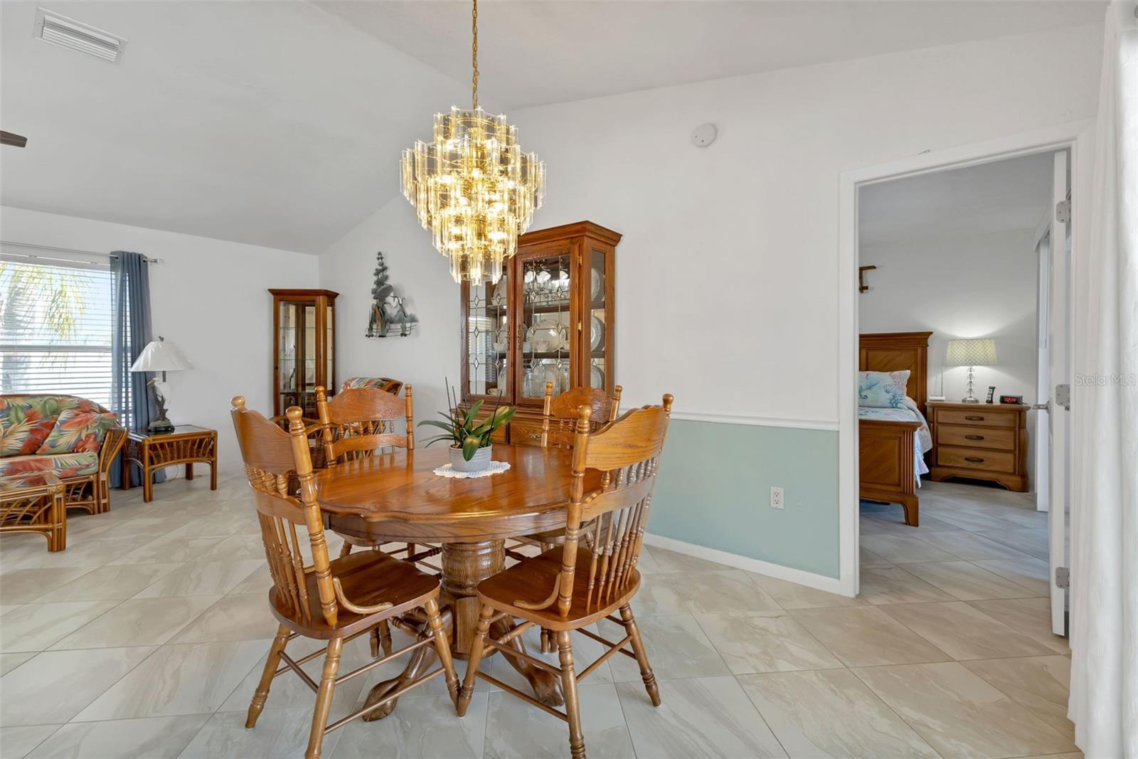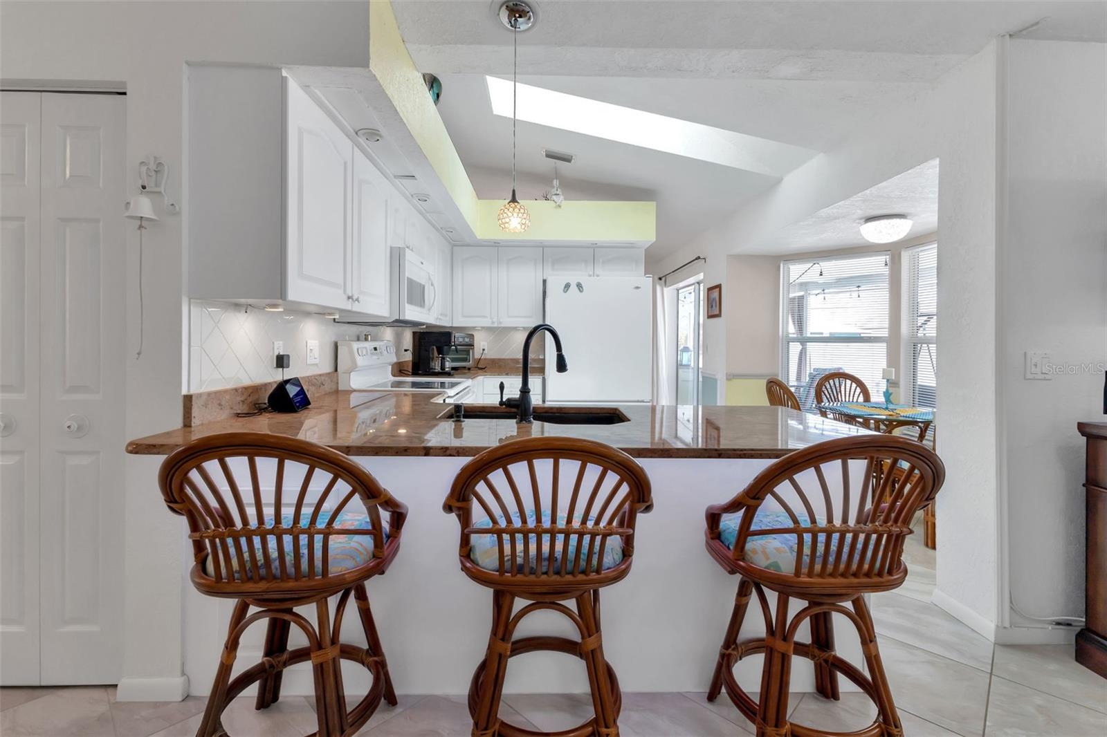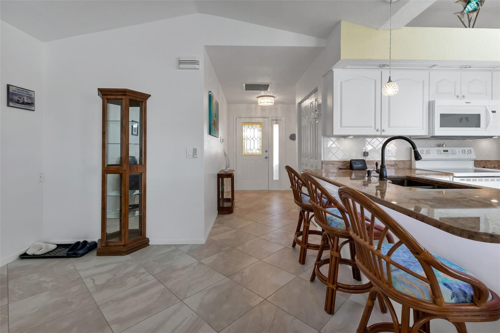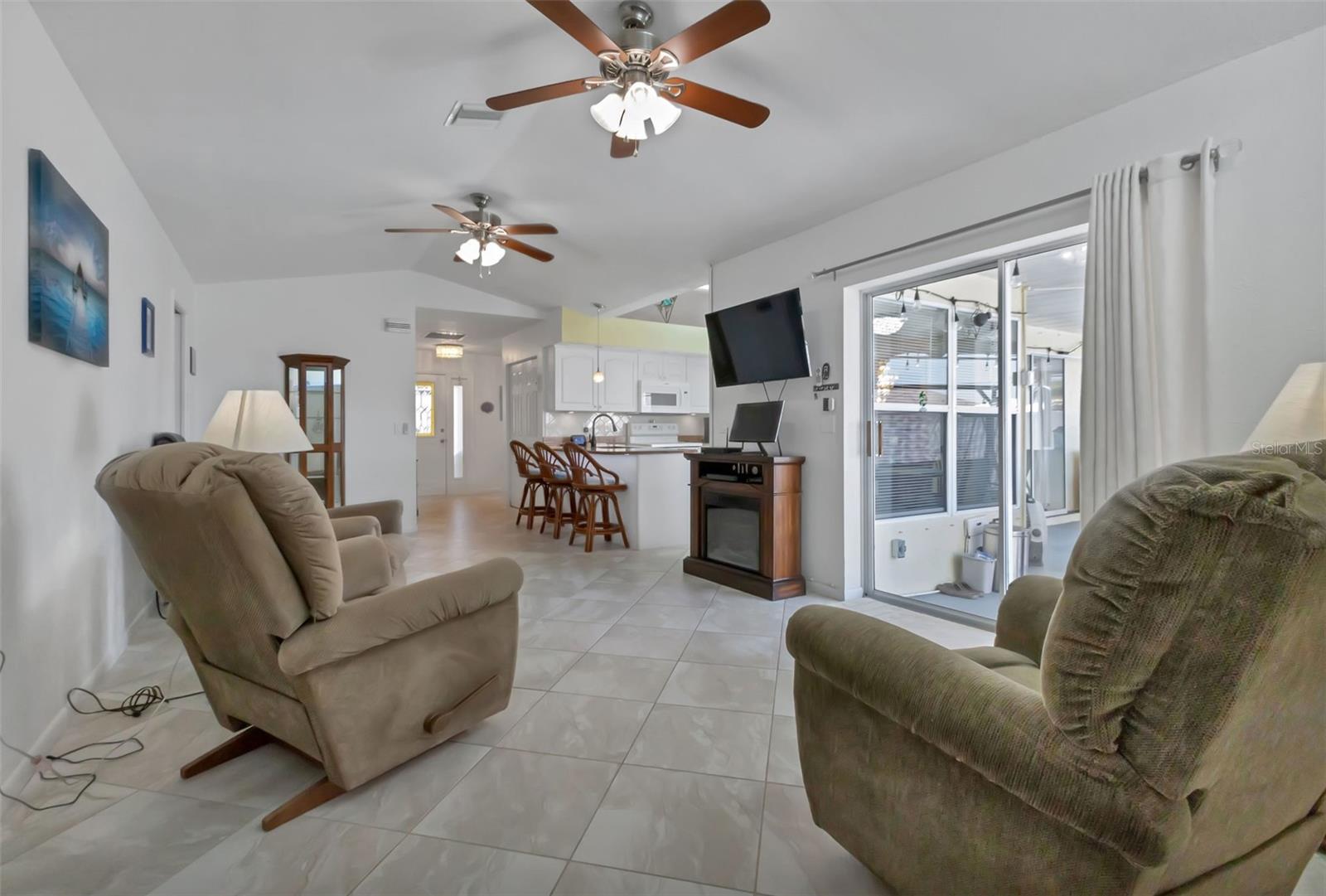 Introducing this remarkable two-bedroom, two-bathroom home nestled in the charming Harbour Heights community, just a stone's throw away from the tranquil Peace River. Upon stepping through the front door, you'll be captivated by the exquisite diagonal tile flooring that spans throughout the living spaces. Boasting both a spacious living room and a cozy family room, this home offers the perfect blend of comfort and functionality. The well-appointed kitchen features elegant granite countertops and ample cabinet space with under cabinet lighting that's remote controlled and changes colors. The convenient indoor laundry room is equipped with a full-size washer and dryer. The guest bedroom offers generous proportions, accompanied by a guest bathroom complete with a tub-shower combo and direct access to the inviting pool area. The primary bedroom is a true retreat, boasting an expansive layout with two separate walk-in closets and an en suite primary bathroom featuring a walk-in shower, a linen closet, and a skylight that bathes the space in natural light. Entertain with ease in the spacious lanai accessed through three sliders, two of which conveniently pocket away, seamlessly blending indoor and outdoor living. A fenced area provides a safe haven for pets to play, while a two-car garage and additional shed for ample storage space and RV parking with 30 AMP, completing this exceptional offering in Harbour Heights. Must see to appreciate, make an appointment today!
