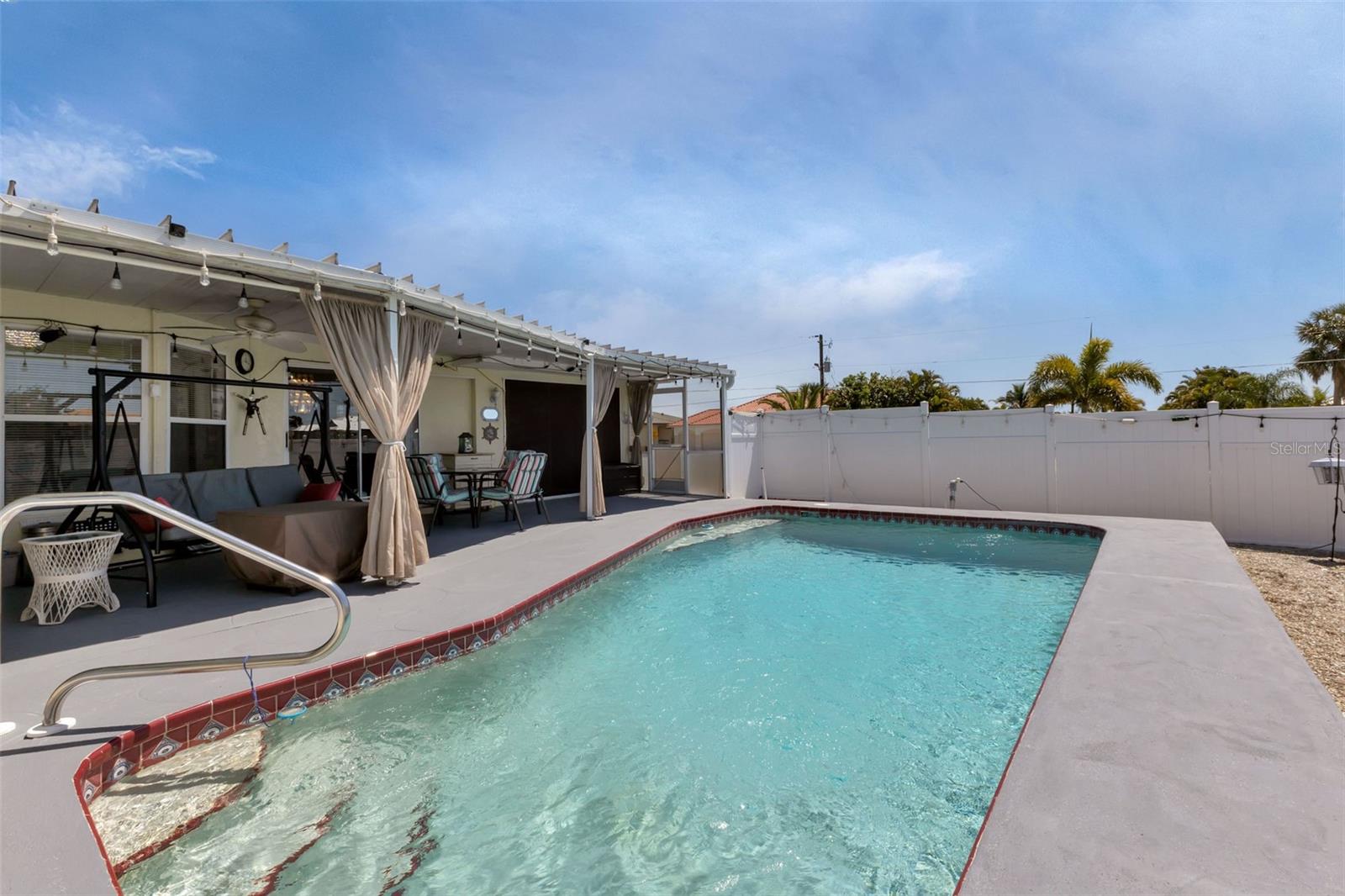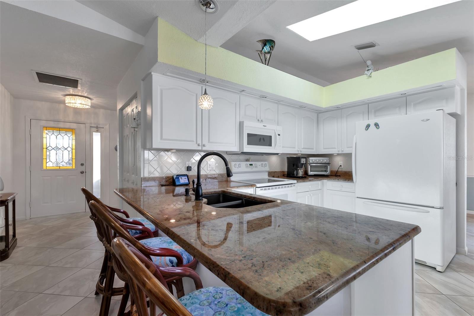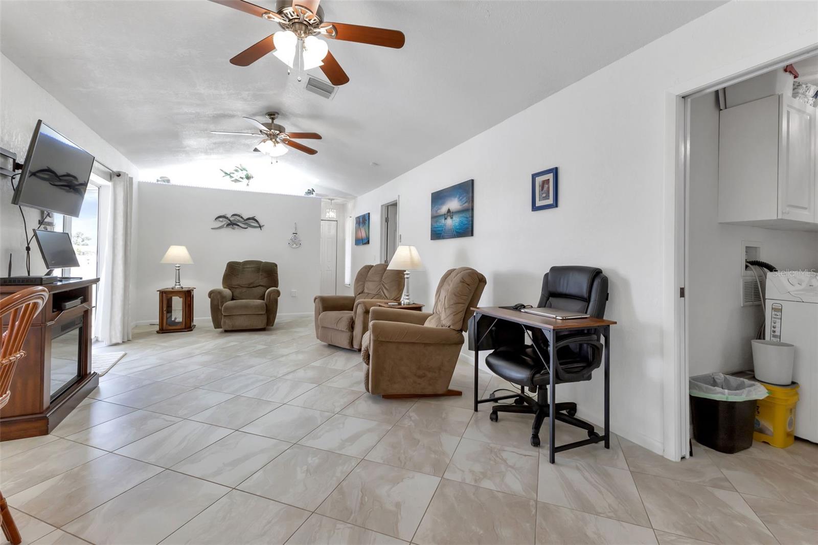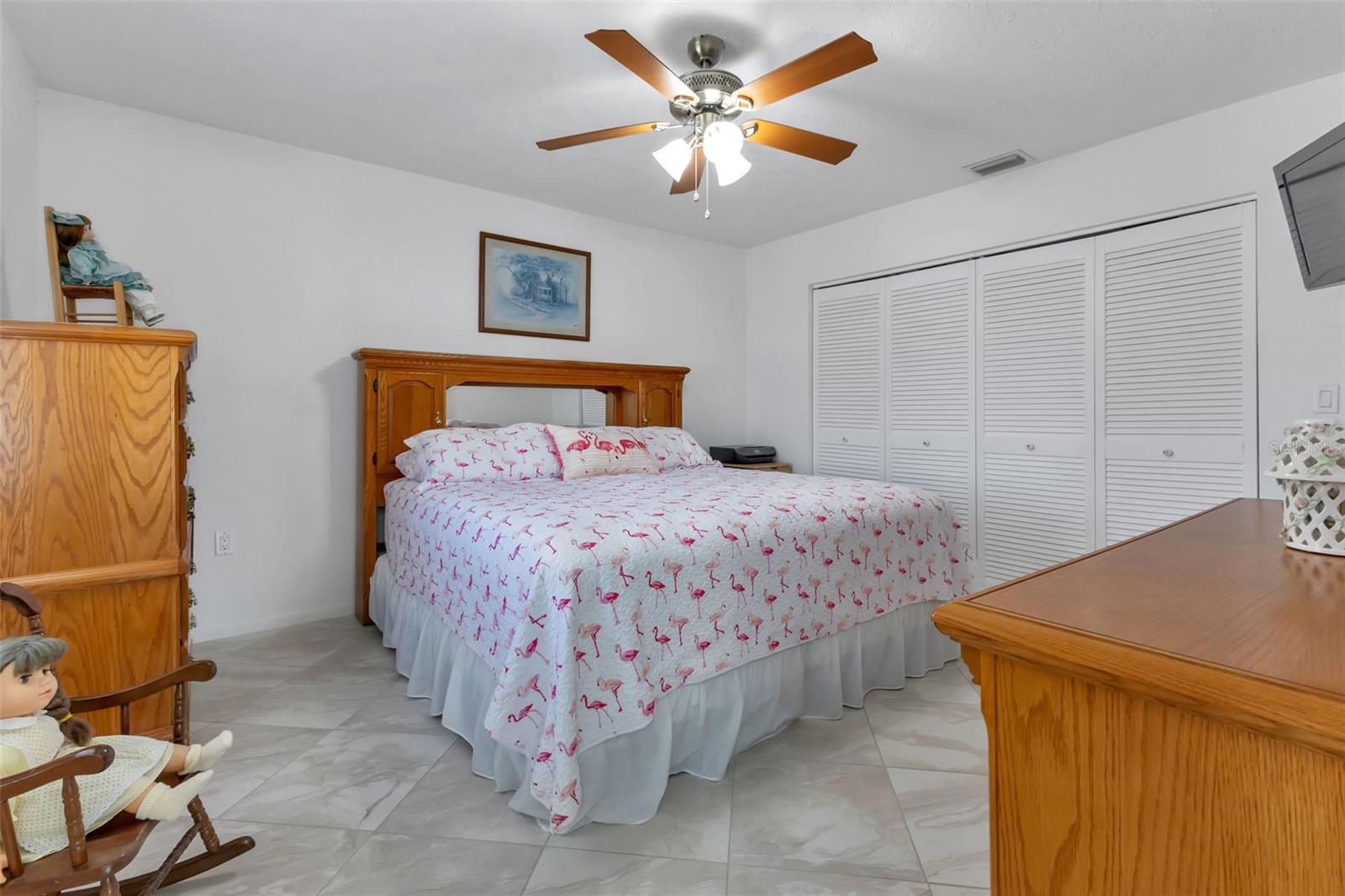 Introducing this remarkable two-bedroom, two-bathroom home nestled in the charming Harbour Heights community, just a stone's throw away from the tranquil Peace River. Upon stepping through the front door, you'll be captivated by the exquisite diagonal tile flooring that spans throughout the living spaces. Boasting both a spacious living room and a cozy family room, this home offers the perfect blend of comfort and functionality. The well-appointed kitchen features elegant granite countertops and ample cabinet space with under cabinet lighting that's remote controlled and changes colors. The convenient indoor laundry room is equipped with a full-size washer and dryer. The guest bedroom offers generous proportions, accompanied by a guest bathroom complete with a tub-shower combo and direct access to the inviting pool area. The primary bedroom is a true retreat, boasting an expansive layout with two separate walk-in closets and an en suite primary bathroom featuring a walk-in shower, a linen closet, and a skylight that bathes the space in natural light. Entertain with ease in the spacious lanai accessed through three sliders, two of which conveniently pocket away, seamlessly blending indoor and outdoor living. A fenced area provides a safe haven for pets to play, while a two-car garage and additional shed for ample storage space and RV parking with 30 AMP, completing this exceptional offering in Harbour Heights. Must see to appreciate, make an appointment today!
