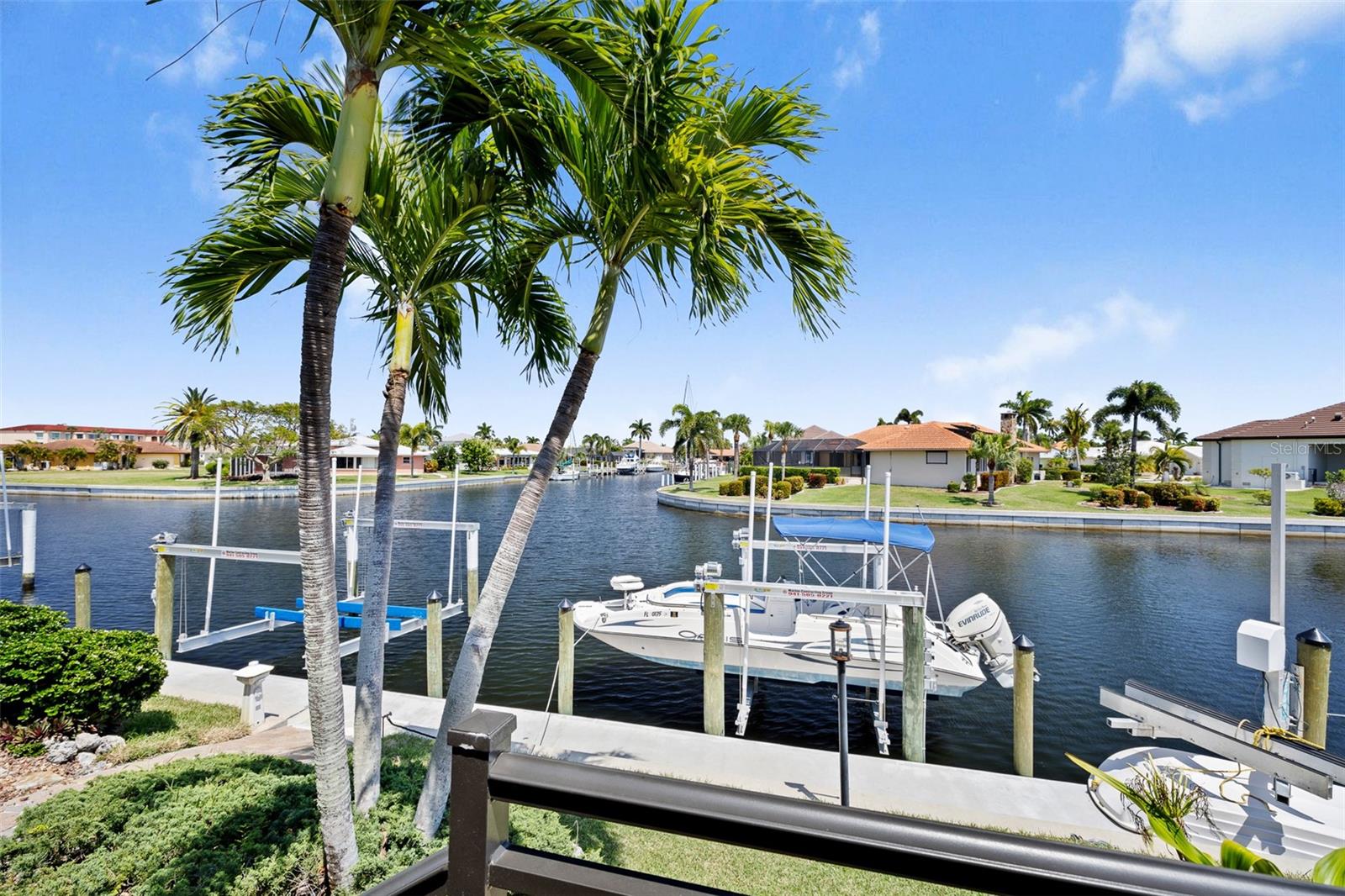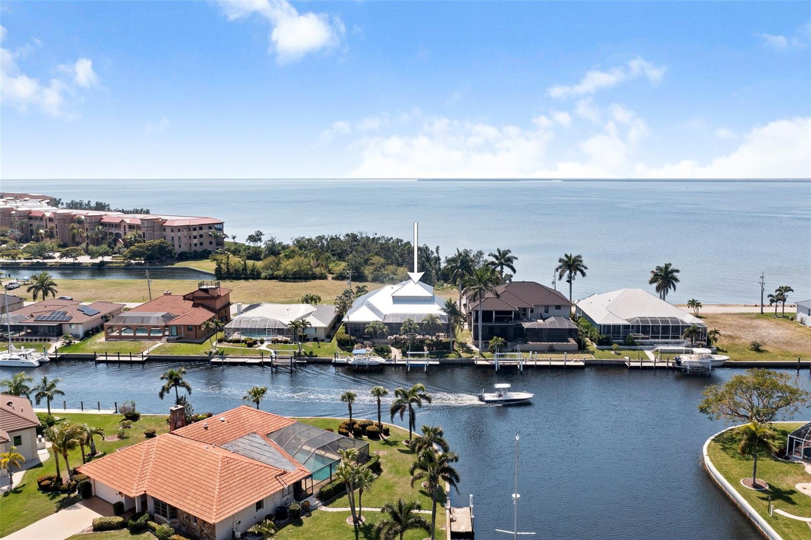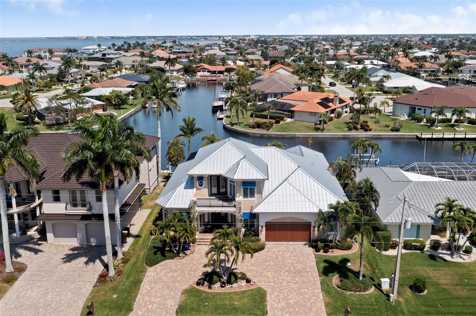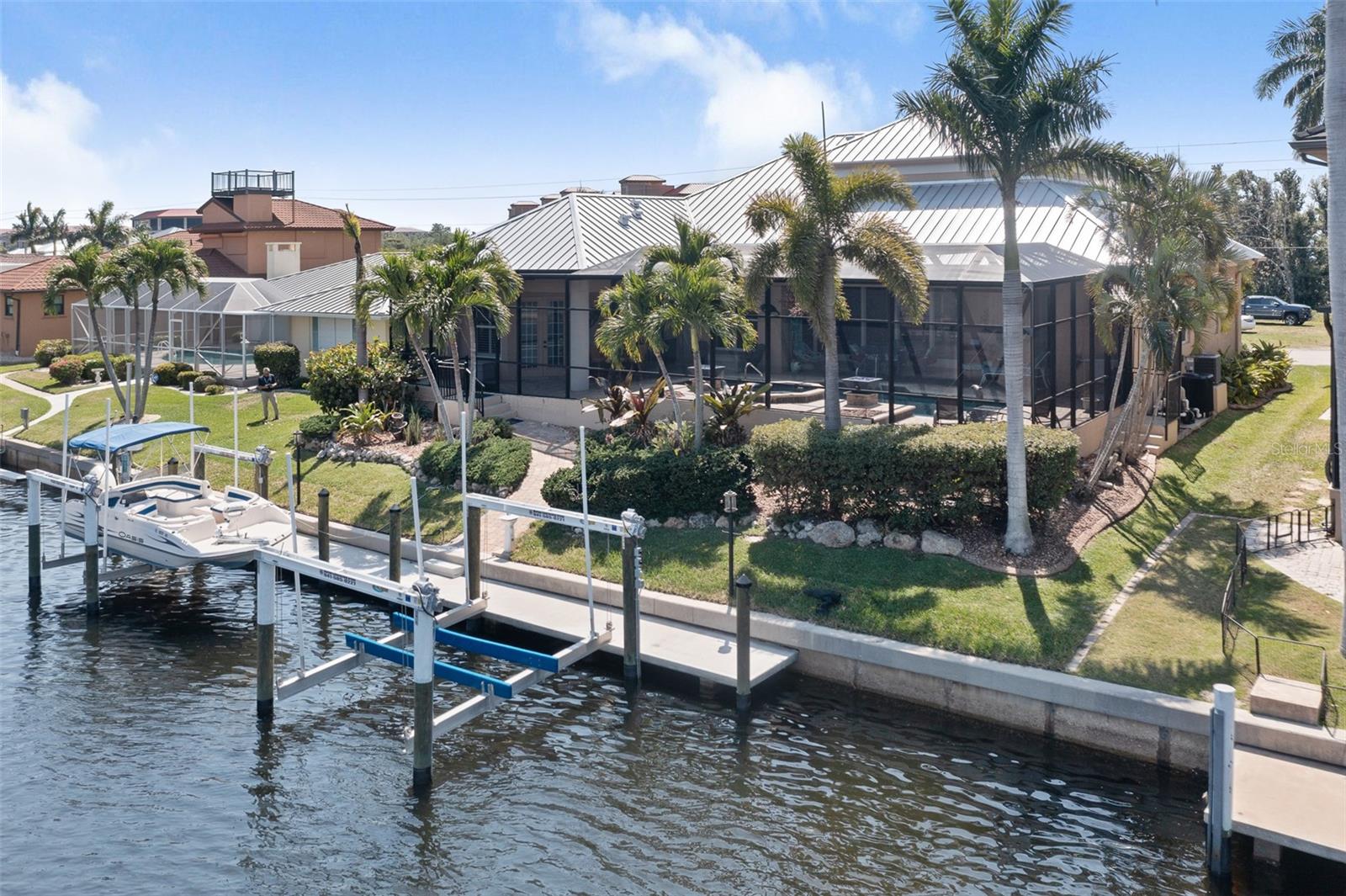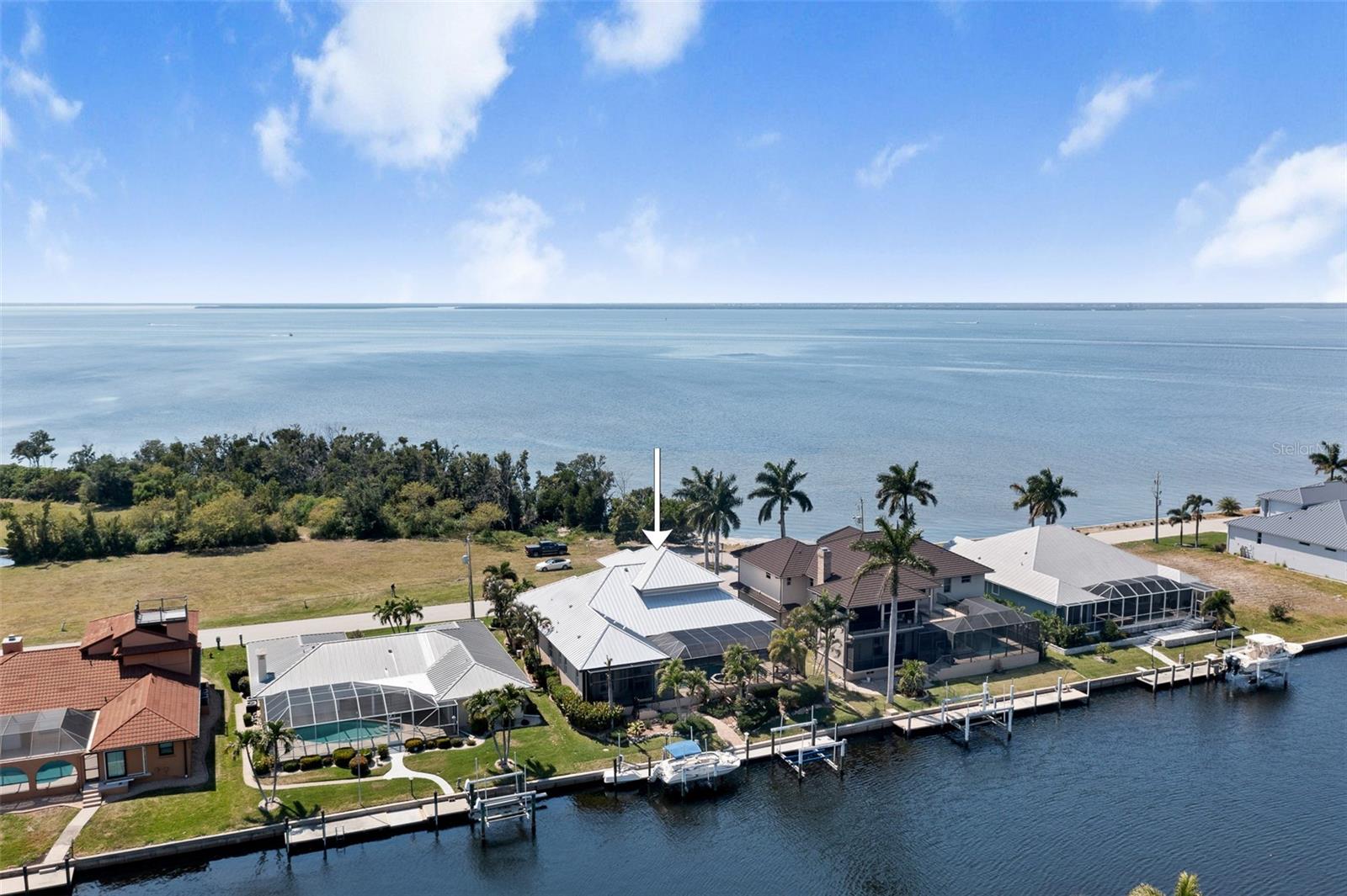 NO FLOODING FROM HURRICANE! HIGHER ELEVATION! HOME IS READY TO SHOW! ONE OF THE BEST SAILBOAT LOCATIONS IN PUNTA GORDA ISLES BOASTING 2-MINUTE ACCESS TO CHARLOTTE HARBOR LEADING TO THE GULF OF MEXICO! This exquisite home provides stunning views of the bay and mesmerizing sunsets from the front porch plus intersecting canal views and great sunrises while enjoying your morning coffee on the lanai. Boating enthusiasts will appreciate the 80'of waterfrontage, concrete seawall with dock, 12,000 lb. and 6,000 lb. boat lifts, and additional lift for a kayak, along with shore power connection and water at the dock. Experience luxury waterfront living at its finest in this custom-built home by Tim Towles featuring 3 bedrooms plus loft/bonus room, 3.5 bathrooms, and a 2-car oversized garage. This elegant residence offers a total of 2,846 sf of living area and the interior is adorned with upgraded design features, soaring ceilings, zero-corner slider and a gas fireplace, creating a warm and inviting ambiance. The open floor plan seamlessly connects the living room with a separate dining room, while the kitchen is a chef's delight, featuring a 5-burner gas cooktop, built-in double oven, stainless appliances, granite, wood cabinetry with pull-out drawers, breakfast bar, and a wine chiller. The primary suite offers lanai access, a California closet, and a luxurious ensuite with dual Decolav semi-recessed sinks, soaking tub, and large walk-in shower. The guest suite also provides lanai access and a private bath with a walk-in shower, which conveniently serves as a pool bath. The second floor presents a large loft room that can be utilized as an office, den or media room and offers full harbor views and access to a balcony. Step outside to discover an expansive covered lanai, screened heated pool and spa with propane fireballs and a Dolphin fountain plus a fully equipped summer kitchen. The property also features a new metal roof, impact windows and sliders, 2-zone A/C, convenient circular driveway and lush tropical landscaping. Nestled in a popular golf and boating community, this home is just minutes from the Yacht Club, Fishermen's Village, and the historic downtown area of Punta Gorda, offering access to arts, community events, entertainment, world-class fishing, boating, fine dining, and beautiful parks, as well as easy access to the SWFL gulf beaches. Don't miss the opportunity to indulge in the ultimate waterfront lifestyle.