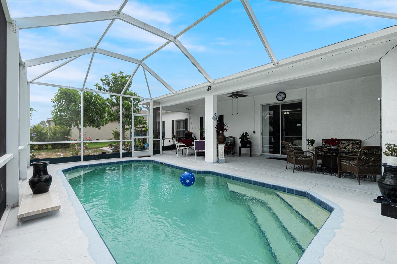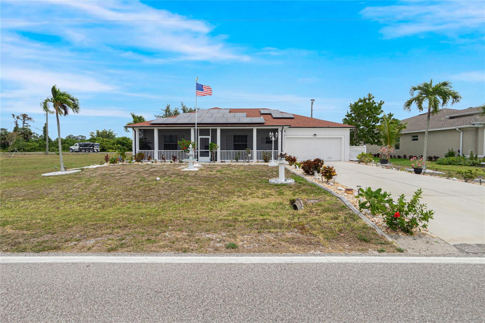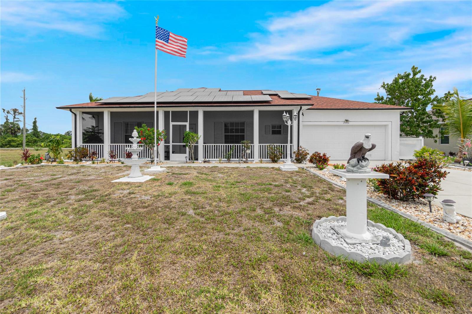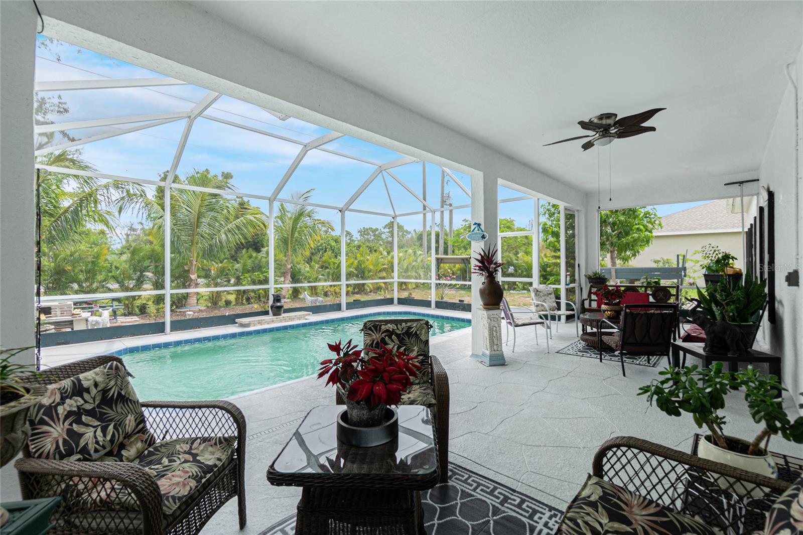 impressive 3 Bedroom, 2 Bathroom POOL HOME with attached 2 car Garage located in the desirable deed restricted community of BURNT STORE VILLAGE. This light and bright home offers an open and split bedroom floor plan with 40x6 screened Front Porch, Foyer, Den/Office, Bonus Room, Great Room, well equipped Kitchen and Inside Laundry. When you enter the Foyer on the right French doors with glass panels open to the large Den/Office. On the left French doors with glass panels open to the Bonus Room. This room is currently used as a Living Room. Either room could be used as a Dining Room or 4th Bedroom. The spacious Great Room with sliding glass doors to the Lanai opens to the large Kitchen- true open concept. The Kitchen features beautiful wood cabinetry, granite counters, tile backsplash, double door refrigerator, dishwasher, built in microwave, oven/range, dining space, huge closet pantry. The Master Bedroom suite has a walk in closet and private bathroom with walk in shower and tub. There are two additional generous sized bedrooms and the guest bathroom has a tub/shower combination. Your living space extends to the screened Lanai with 22x10 swimming pool, large covered area and covered patio and covered grilling area outside of the pool cage. Flooring is tile and diagonal lay tile in the living areas, carpet in the bedrooms. Other features include ***NEW ROOF 2023***, hurricane shutters, 10 foot ceilings. Utilities are county water and sewer. Burnt Store Village has 13 miles of quiet, county-maintained streets that are great for bike riding, and the Burnt Store Village Community Park has a walking path around a picturesque lake, picnic tables and a playground. Only 10 minutes to Burnt Store Marina to the south and 10-15 minutes to historic Punta Gorda to the north with shopping, dining, medical care, waterfront parks, boat ramps, fishing piers, walking and biking paths, Fishermen's Village, Charlotte Harbor Event Center, art galleries, weekend farmers markets, events and more. This is a beautiful home in a great community!
