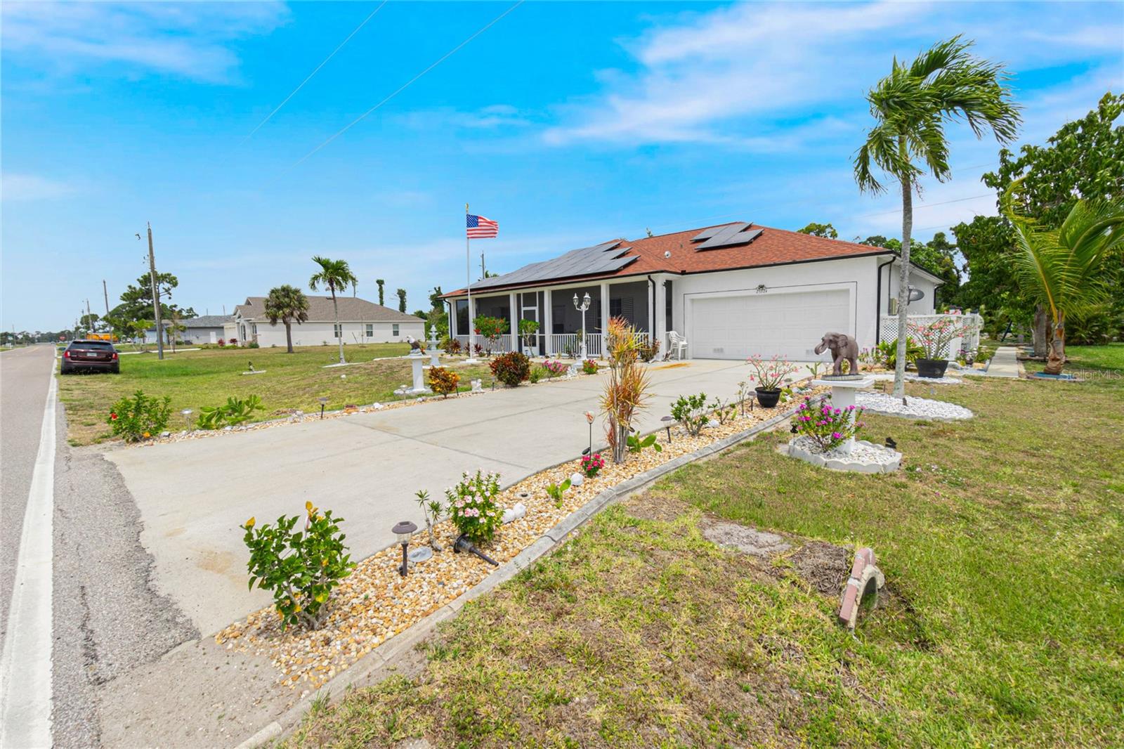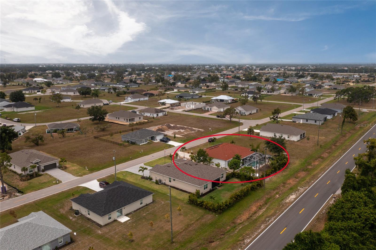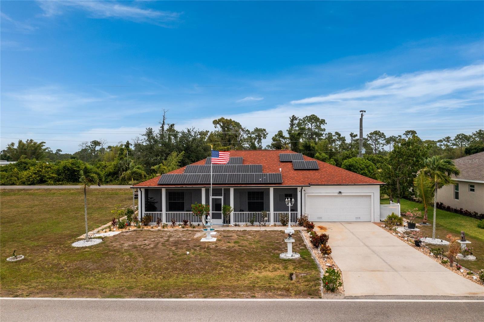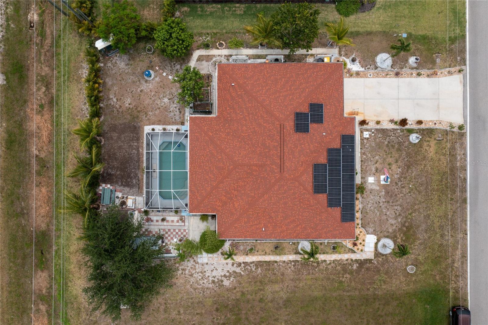 impressive 3 Bedroom, 2 Bathroom POOL HOME with attached 2 car Garage located in the desirable deed restricted community of BURNT STORE VILLAGE. This light and bright home offers an open and split bedroom floor plan with 40x6 screened Front Porch, Foyer, Den/Office, Bonus Room, Great Room, well equipped Kitchen and Inside Laundry. When you enter the Foyer on the right French doors with glass panels open to the large Den/Office. On the left French doors with glass panels open to the Bonus Room. This room is currently used as a Living Room. Either room could be used as a Dining Room or 4th Bedroom. The spacious Great Room with sliding glass doors to the Lanai opens to the large Kitchen- true open concept. The Kitchen features beautiful wood cabinetry, granite counters, tile backsplash, double door refrigerator, dishwasher, built in microwave, oven/range, dining space, huge closet pantry. The Master Bedroom suite has a walk in closet and private bathroom with walk in shower and tub. There are two additional generous sized bedrooms and the guest bathroom has a tub/shower combination. Your living space extends to the screened Lanai with 22x10 swimming pool, large covered area and covered patio and covered grilling area outside of the pool cage. Flooring is tile and diagonal lay tile in the living areas, carpet in the bedrooms. Other features include ***NEW ROOF 2023***, hurricane shutters, 10 foot ceilings. Utilities are county water and sewer. Burnt Store Village has 13 miles of quiet, county-maintained streets that are great for bike riding, and the Burnt Store Village Community Park has a walking path around a picturesque lake, picnic tables and a playground. Only 10 minutes to Burnt Store Marina to the south and 10-15 minutes to historic Punta Gorda to the north with shopping, dining, medical care, waterfront parks, boat ramps, fishing piers, walking and biking paths, Fishermen's Village, Charlotte Harbor Event Center, art galleries, weekend farmers markets, events and more. This is a beautiful home in a great community!