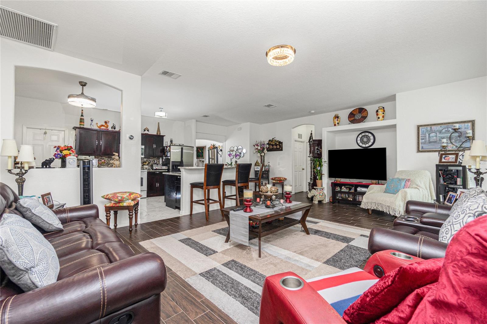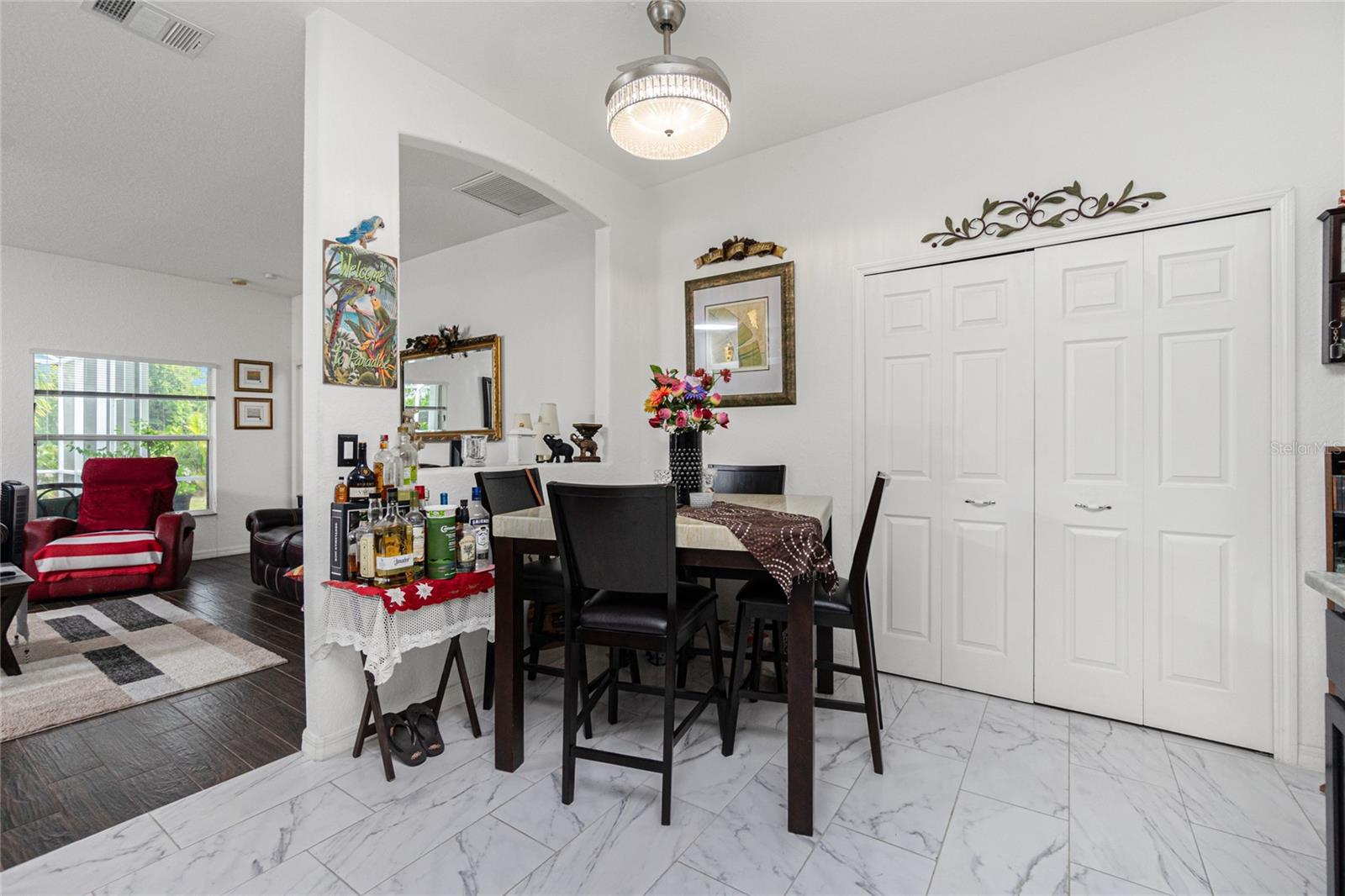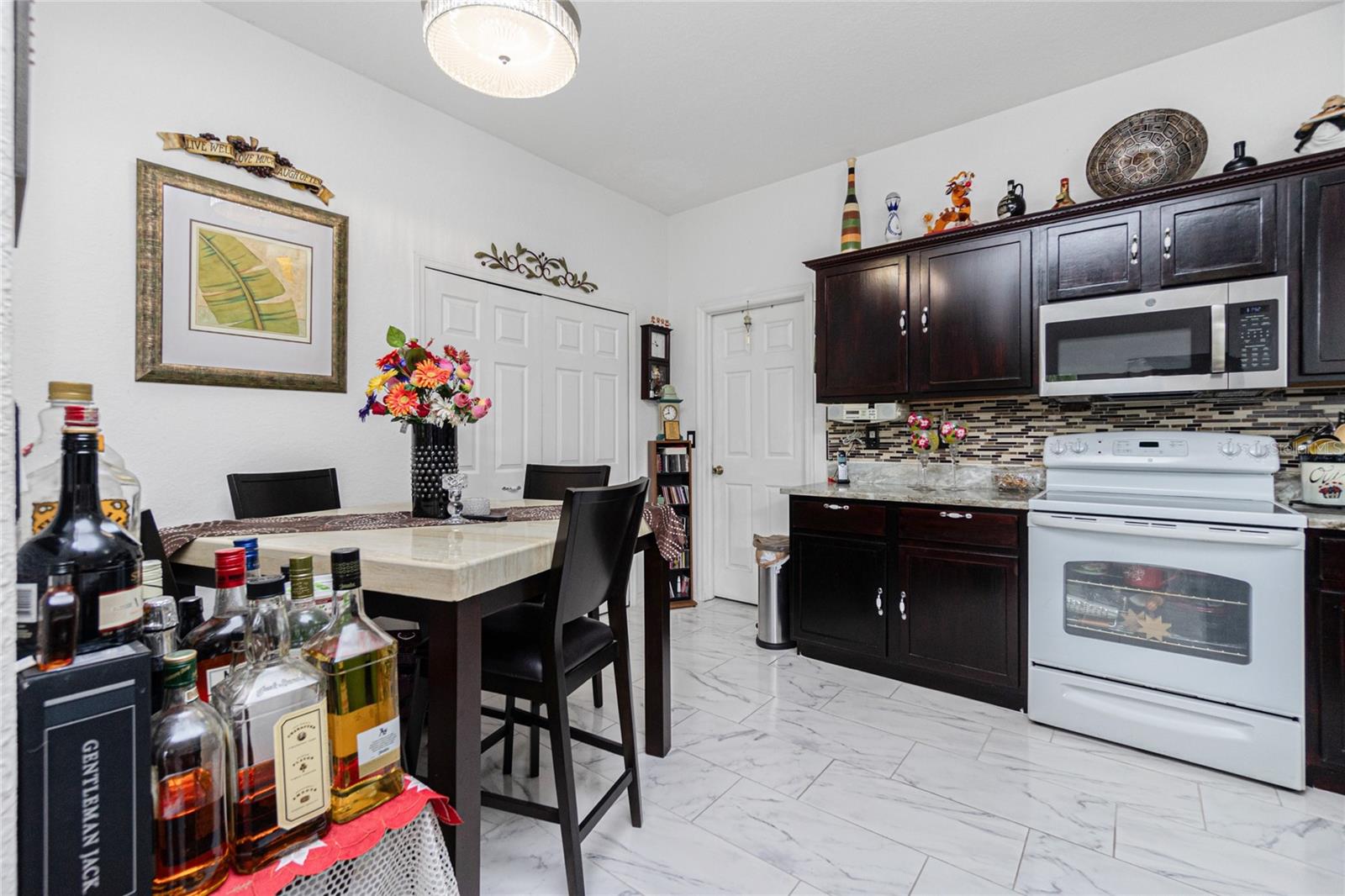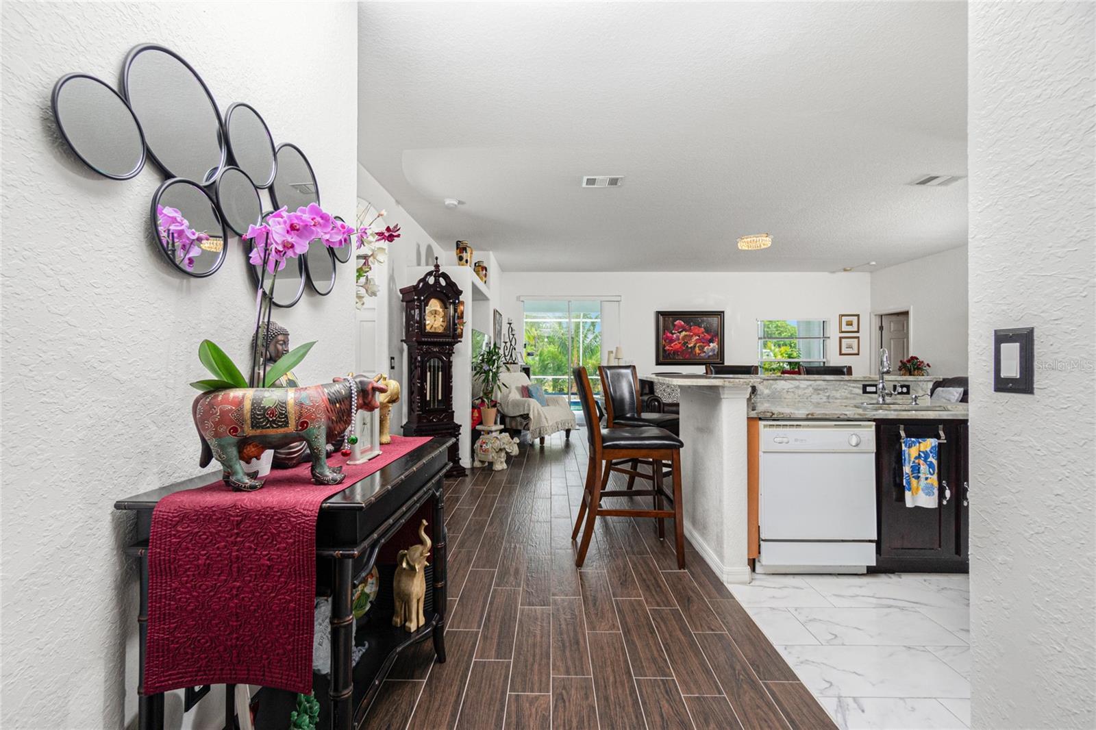 impressive 3 Bedroom, 2 Bathroom POOL HOME with attached 2 car Garage located in the desirable deed restricted community of BURNT STORE VILLAGE. This light and bright home offers an open and split bedroom floor plan with 40x6 screened Front Porch, Foyer, Den/Office, Bonus Room, Great Room, well equipped Kitchen and Inside Laundry. When you enter the Foyer on the right French doors with glass panels open to the large Den/Office. On the left French doors with glass panels open to the Bonus Room. This room is currently used as a Living Room. Either room could be used as a Dining Room or 4th Bedroom. The spacious Great Room with sliding glass doors to the Lanai opens to the large Kitchen- true open concept. The Kitchen features beautiful wood cabinetry, granite counters, tile backsplash, double door refrigerator, dishwasher, built in microwave, oven/range, dining space, huge closet pantry. The Master Bedroom suite has a walk in closet and private bathroom with walk in shower and tub. There are two additional generous sized bedrooms and the guest bathroom has a tub/shower combination. Your living space extends to the screened Lanai with 22x10 swimming pool, large covered area and covered patio and covered grilling area outside of the pool cage. Flooring is tile and diagonal lay tile in the living areas, carpet in the bedrooms. Other features include ***NEW ROOF 2023***, hurricane shutters, 10 foot ceilings. Utilities are county water and sewer. Burnt Store Village has 13 miles of quiet, county-maintained streets that are great for bike riding, and the Burnt Store Village Community Park has a walking path around a picturesque lake, picnic tables and a playground. Only 10 minutes to Burnt Store Marina to the south and 10-15 minutes to historic Punta Gorda to the north with shopping, dining, medical care, waterfront parks, boat ramps, fishing piers, walking and biking paths, Fishermen's Village, Charlotte Harbor Event Center, art galleries, weekend farmers markets, events and more. This is a beautiful home in a great community!