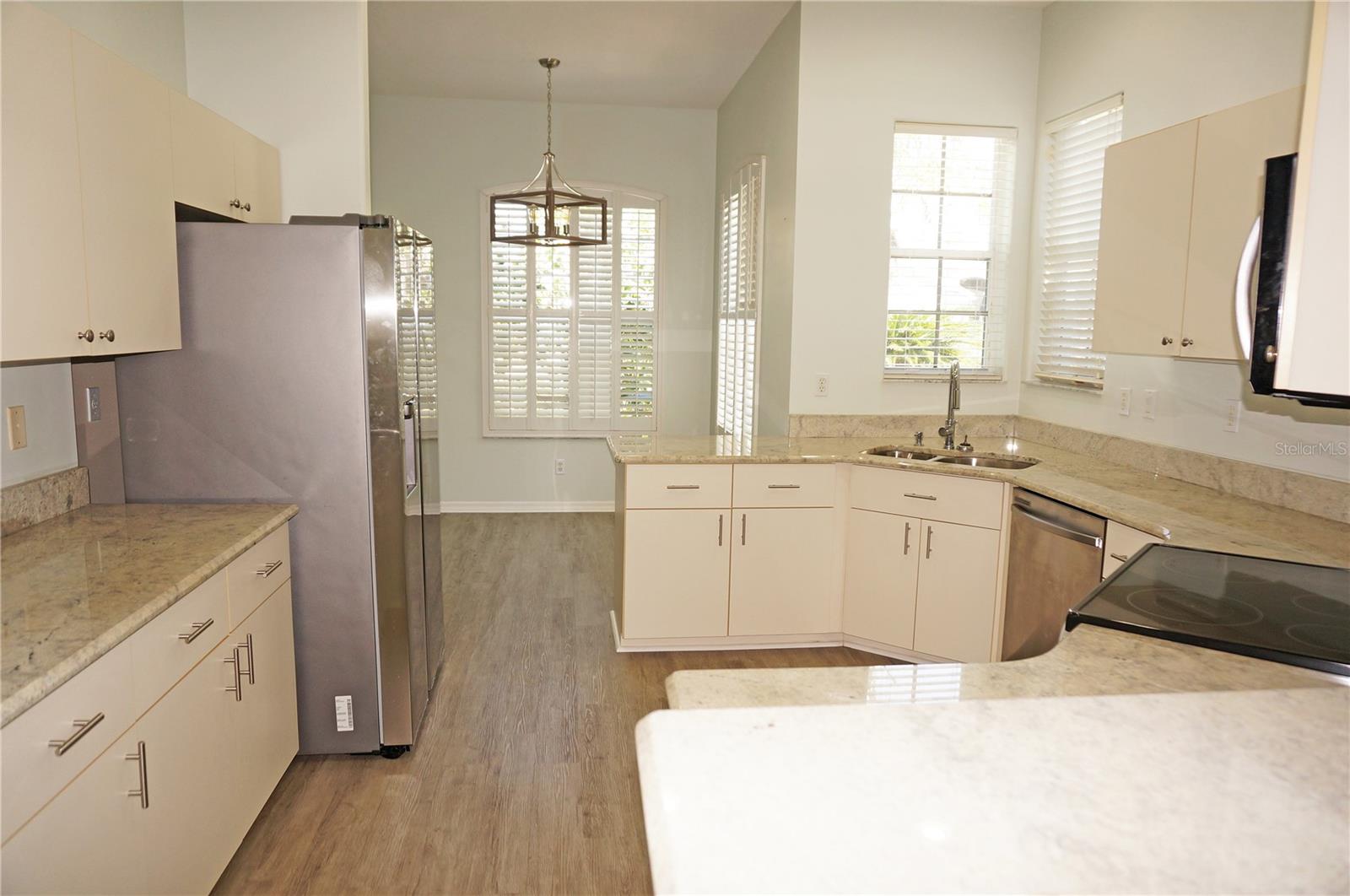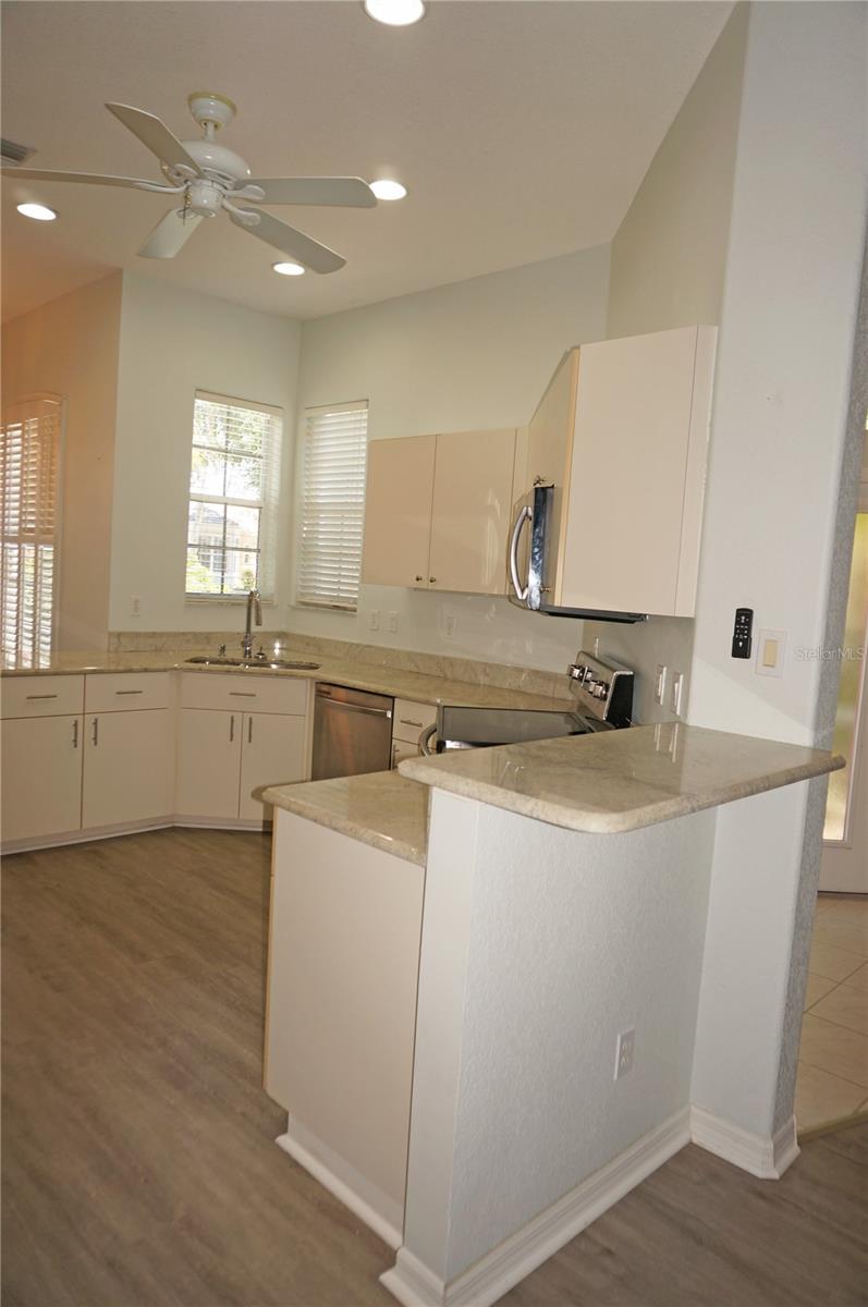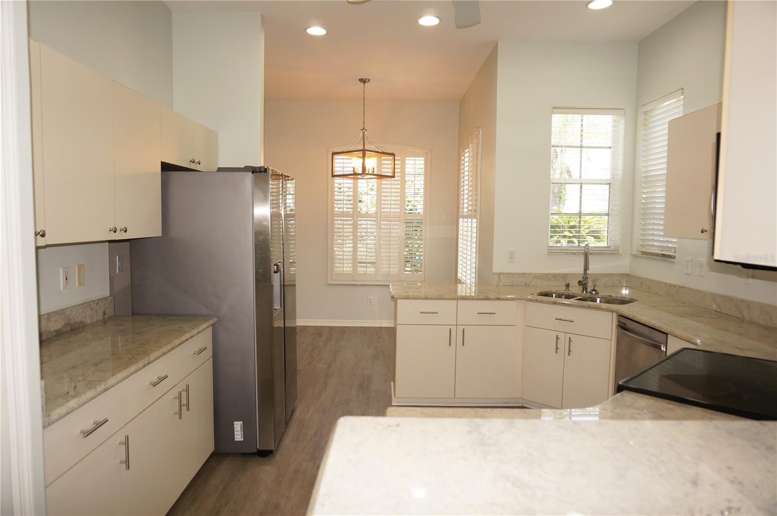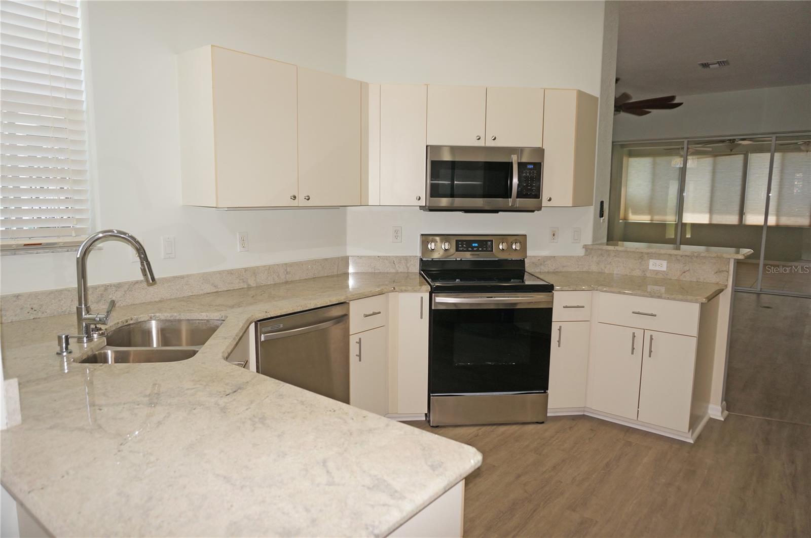 Impressive MOVE IN READY 3 Bedroom, 2 Bathroom home with attached 2 Car Garage located in the desirable gated golf community of SEMINOLE LAKES. This home has been completely updated: *NEW ROOF 2023*, NEW exterior paint 2023, new granite counters in the Kitchen and bathrooms, lighting has been replaced, appliances are 3 years old and there is luxury vinyl flooring throughout the home. This light and bright home offers an open floor plan with Great Room, Dining Room, 19x18 Florida Room, well appointed Kitchen and Inside Laundry Room. The Foyer has diagonal lay tile, a transom window over the front door and a coat closet. Sliding glass doors lead from the Great Room to the Florida Room (custom enclosed lanai) that has two walls of windows and a dry bar, perfect for entertaining. A side door takes you to the backyard with greenbelt view of lush tropical landscaping. The Kitchen has new granite counters, stainless refrigerator, dishwasher, microwave and oven/range, double sink, dining area with plantation shutters and pantry closet. Great counter and cabinet space. The Inside Laundry has a washer, dryer, sink and cabinets. The Master Bedroom suite features a walk in closet and private bathroom with dual sinks, granite counters, garden tub and walk in shower. There are two additional generous sized bedrooms and the guest bathroom has granite counters and a tub/shower combination. Other features include: hurricane shutters, security system, ceiling fans, 10 foot ceilings, screened front entry, security system, window treatments. SEMINOLE LAKES features an 18 hole par 62 Ron Garl executive Golf Course, tennis, access to pickleball courts, bocce courts, heated community pool, clubhouse, fitness room, library, underground utilities. This challenging golf course has eight lakes and a spectacular view of natures wildlife. Only 10 minutes to historic downtown Punta Gorda shopping, dining, medical care, waterfront parks, fishing piers, boat ramps, art galleries, walking and biking paths, weekend farmers markets, Fishermens Village, events and more!