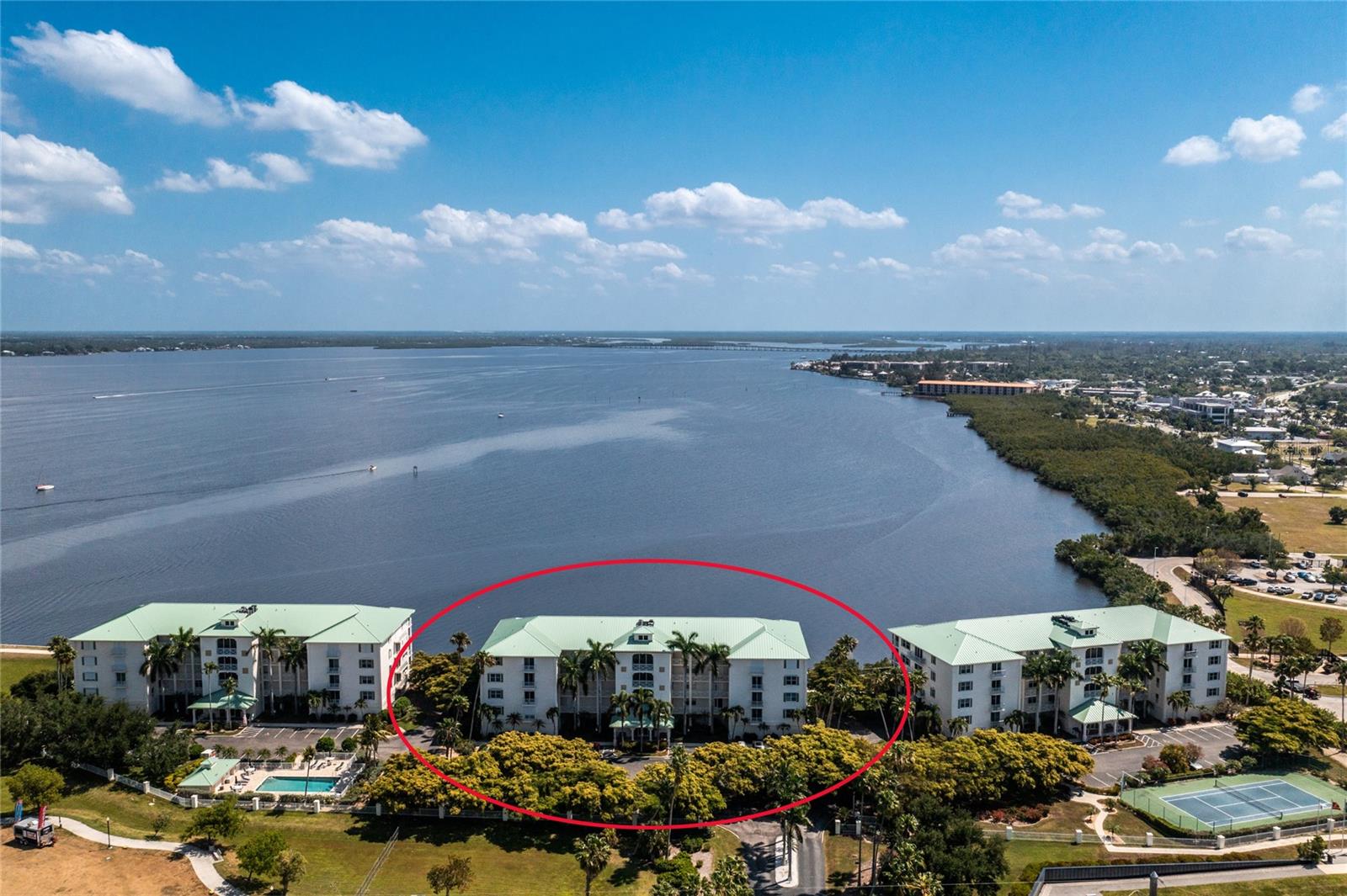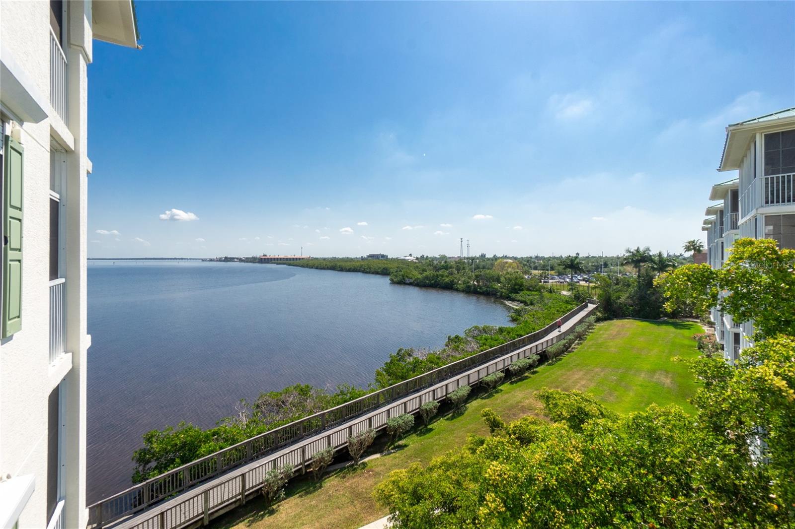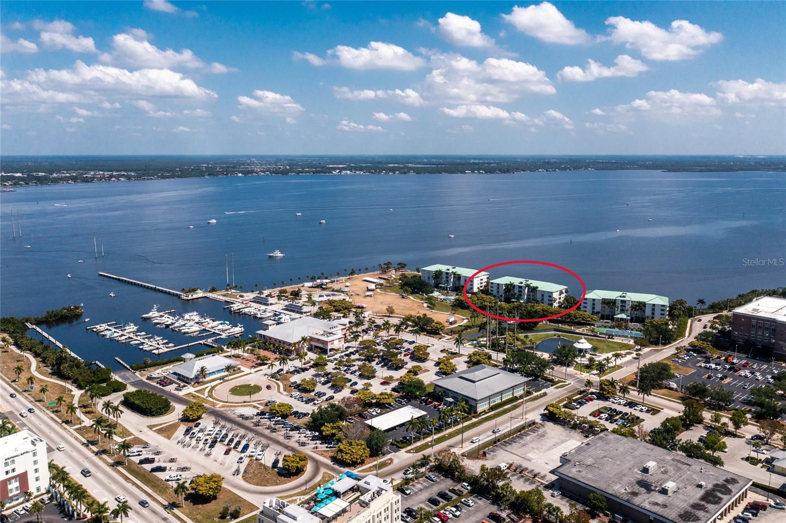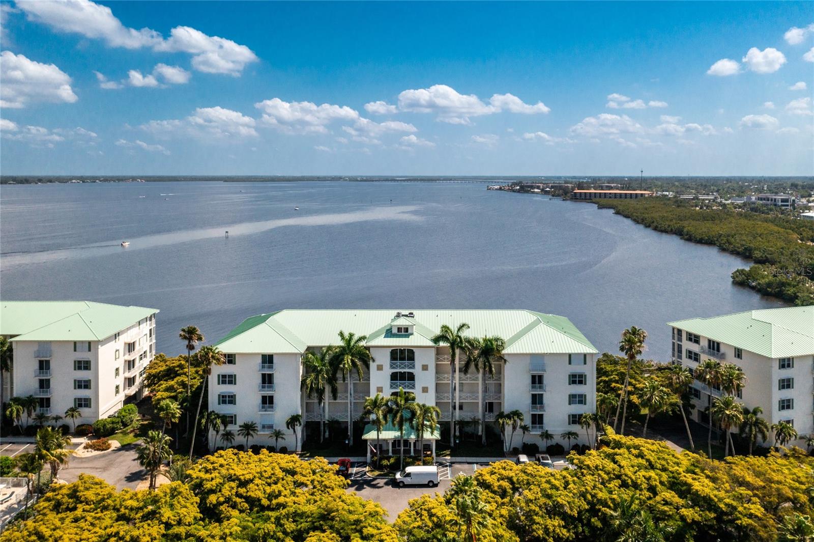 WATERFRONT 3 Bedroom, 2.5 Bathroom end unit condo at HARBOR WALK in downtown Punta Gorda. **Breathtaking panoramic views of CHARLOTTE HARBOR** Located on the fourth floor of a five story building with elevator. This light and bright condo offers an open and split bedroom floor plan with large Foyer with storage closets, Great Room with spectacular water views, Dining Room, well appointed Kitchen, rear 20x9 ft Lanai and Inside Laundry. The Kitchen features white cabinetry, granite counters, breakfast bar, stainless appliances (French door refrigerator, dishwasher, oven/range, microwave) and dining area with water view. The Inside Laundry offers a front loading washer, front loading dryer, white cabinets, granite counter and sink. The Master Bedroom suite has a private balcony, large California style walk in closet and private bathroom with dual sinks, granite counters, white cabinets, tub and walk in shower. There are two additional generous sized bedrooms and the guest bathroom has a walk in shower, granite counter, white cabinetry. There is a formal Dining Room and a half bath with a pedestal sink. Your living space extends via sliding glass doors to the spacious lanai with stunning water views through vinyl windows. Other features include: tile flooring throughout the unit, electric hurricane shutters, custom Hunter Douglas blinds. Utilities are city water and sewer. This unit has under building parking space # 1 and storage unit # 15. HARBOR WALK has a heated inground community pool, tennis court and a secured building entry. This condo is just steps away from Laishley Park and a 5 minute walk to downtown shopping, dining, waterfront parks, fishing piers, boat ramps, art galleries, walking and biking paths, Charlotte Harbor Events Center, weekend farmers markets, events and more. This is a spectacular condo in a great location!